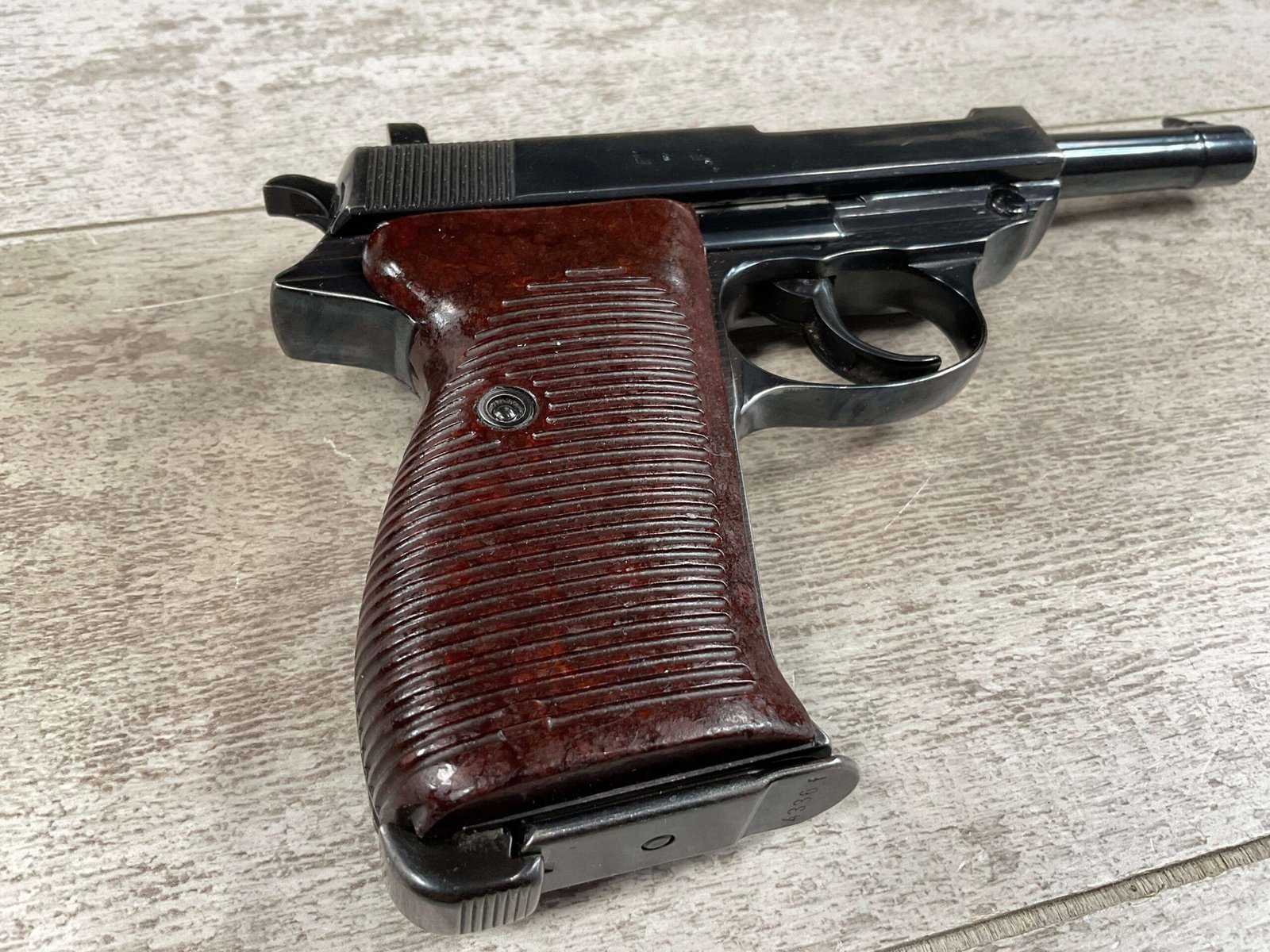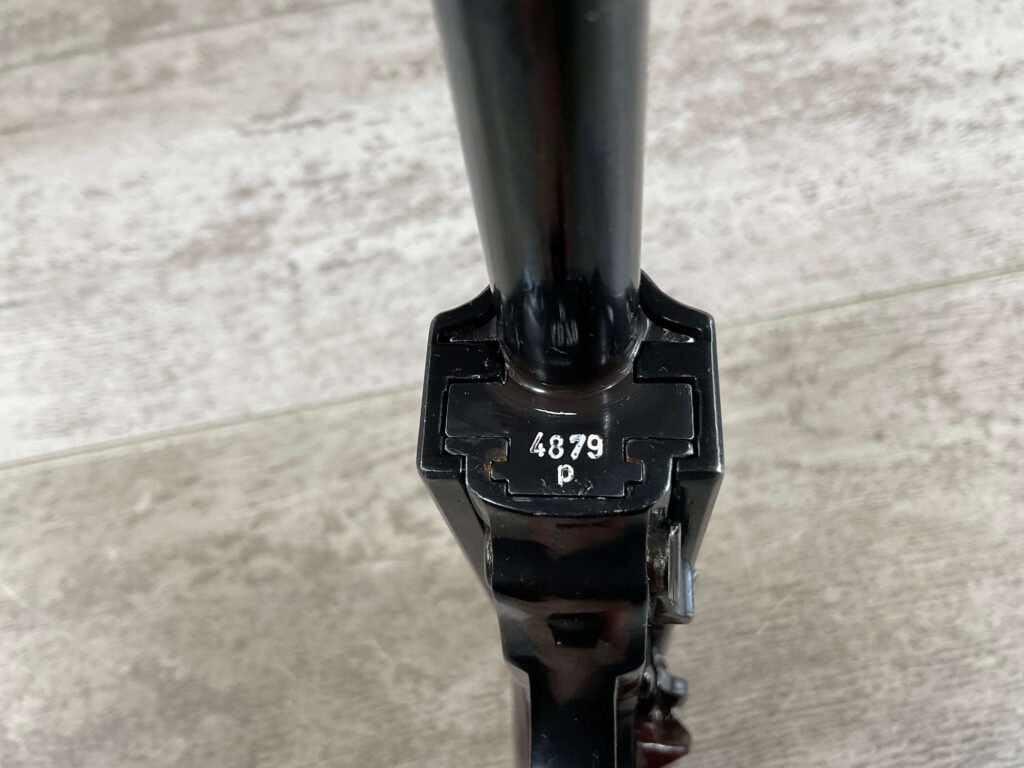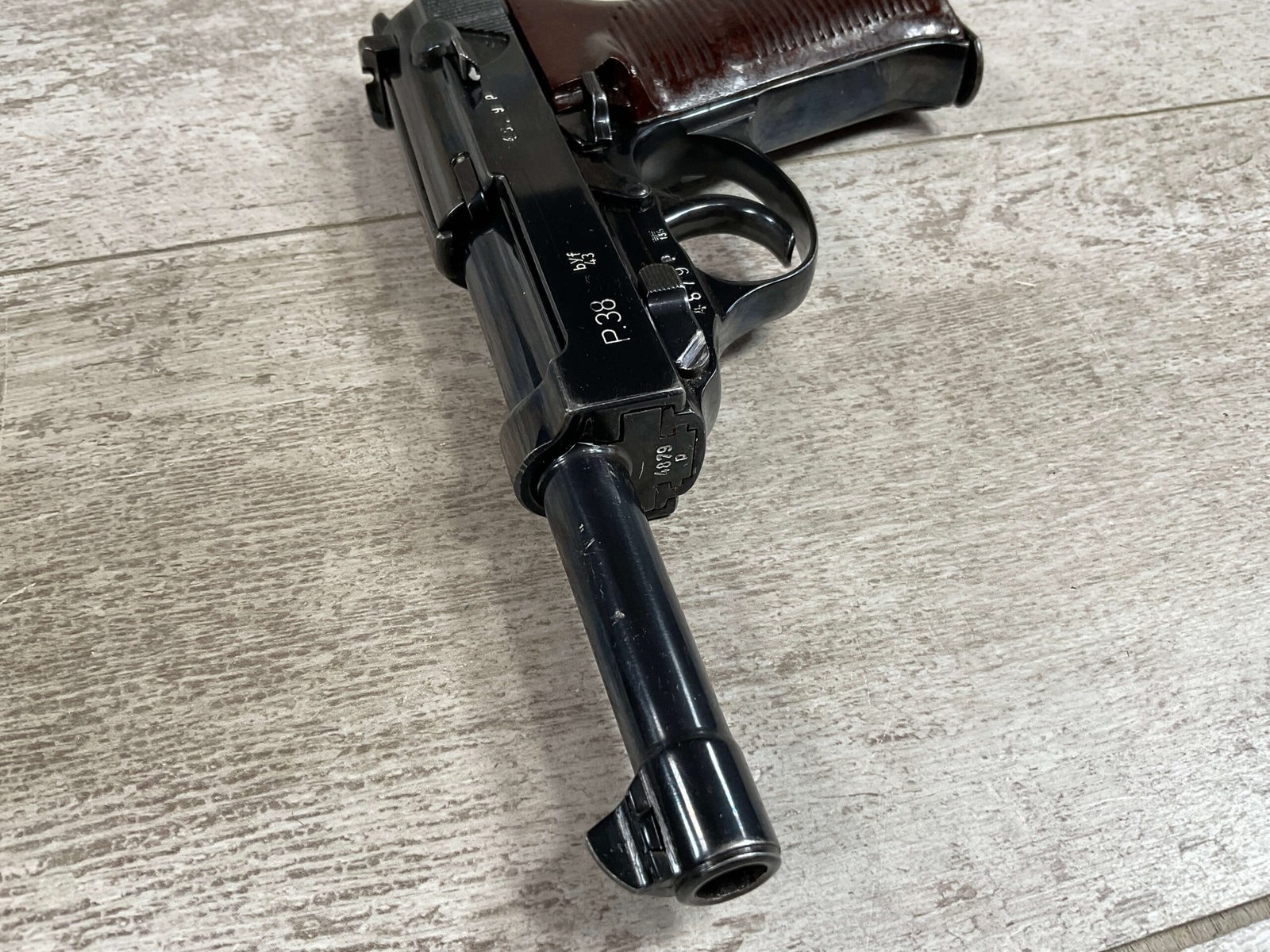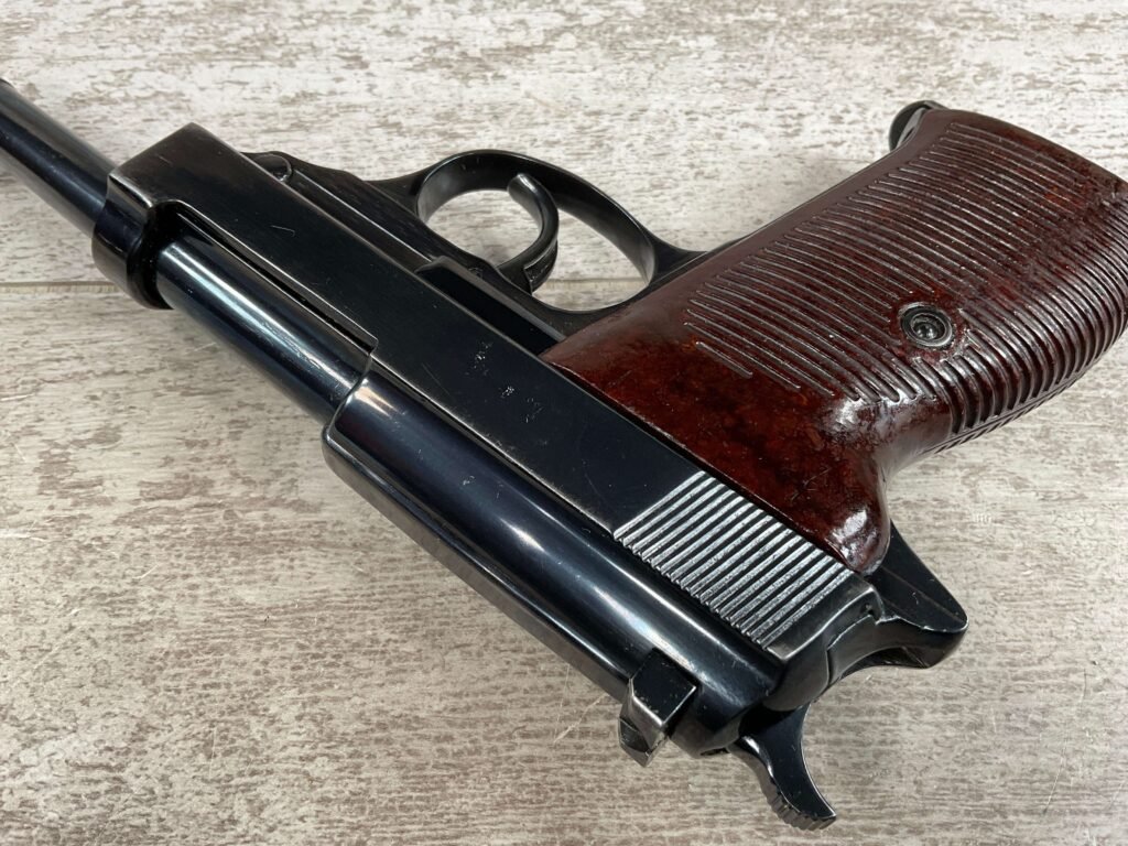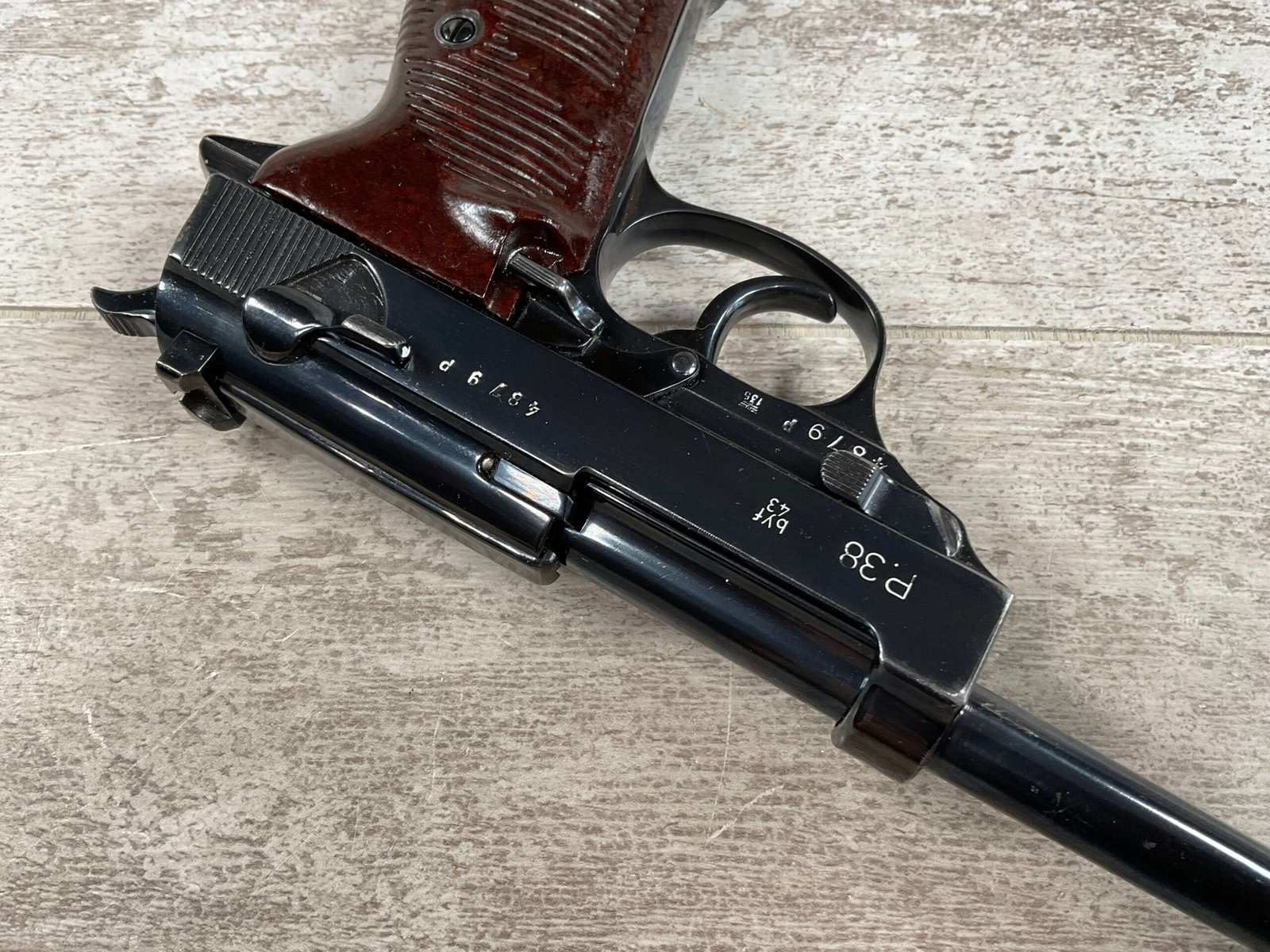 MAUSER byf43 P38 PISTOL MATCHING #4879p, 9mm, 5″ BBL, 98+% REBLUE, LEFT FRAME HAS “4679P E/135”, EXC BROWN BAKELITE GRIPS, VG BRIGHT BORE W/LIGHT FROSTING THROUGHOUT, NO IMPORT MARKS, NON MATCHING WALTHER P38 MARKED MAG, 95+% OVERALL