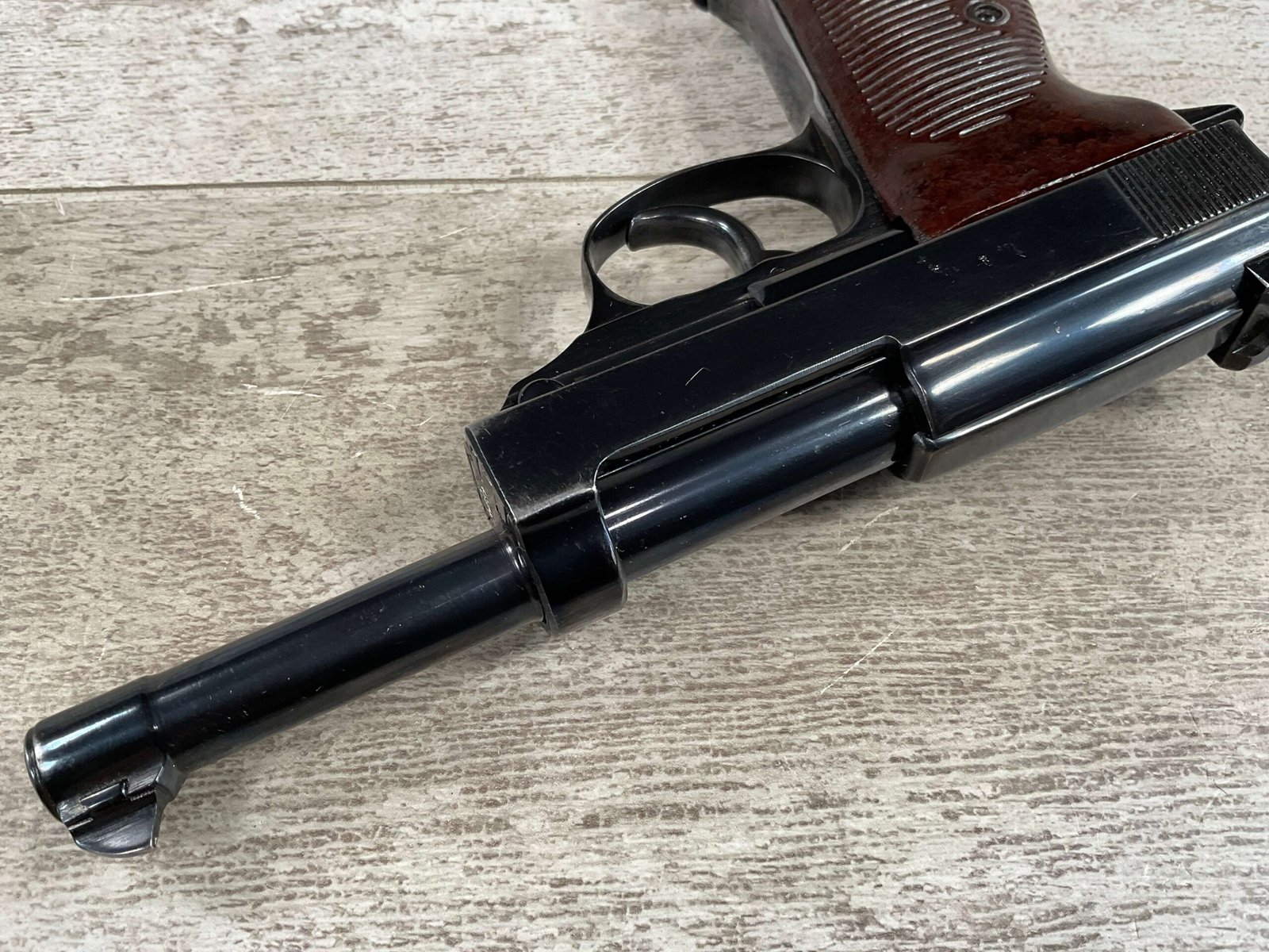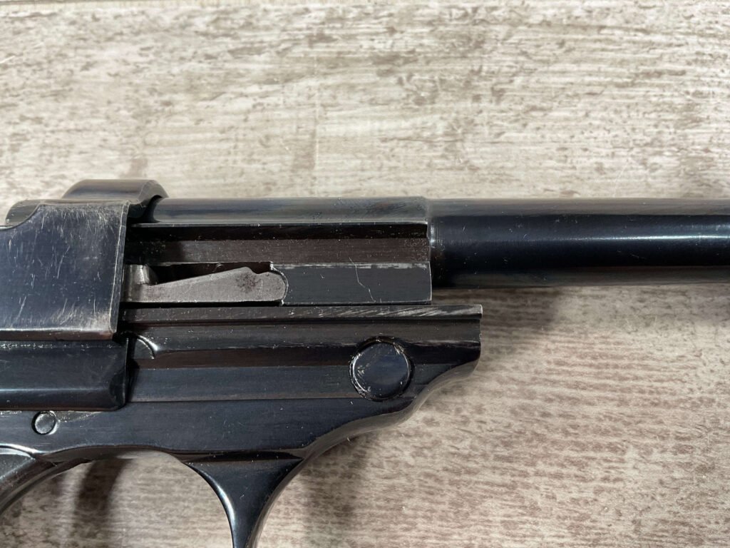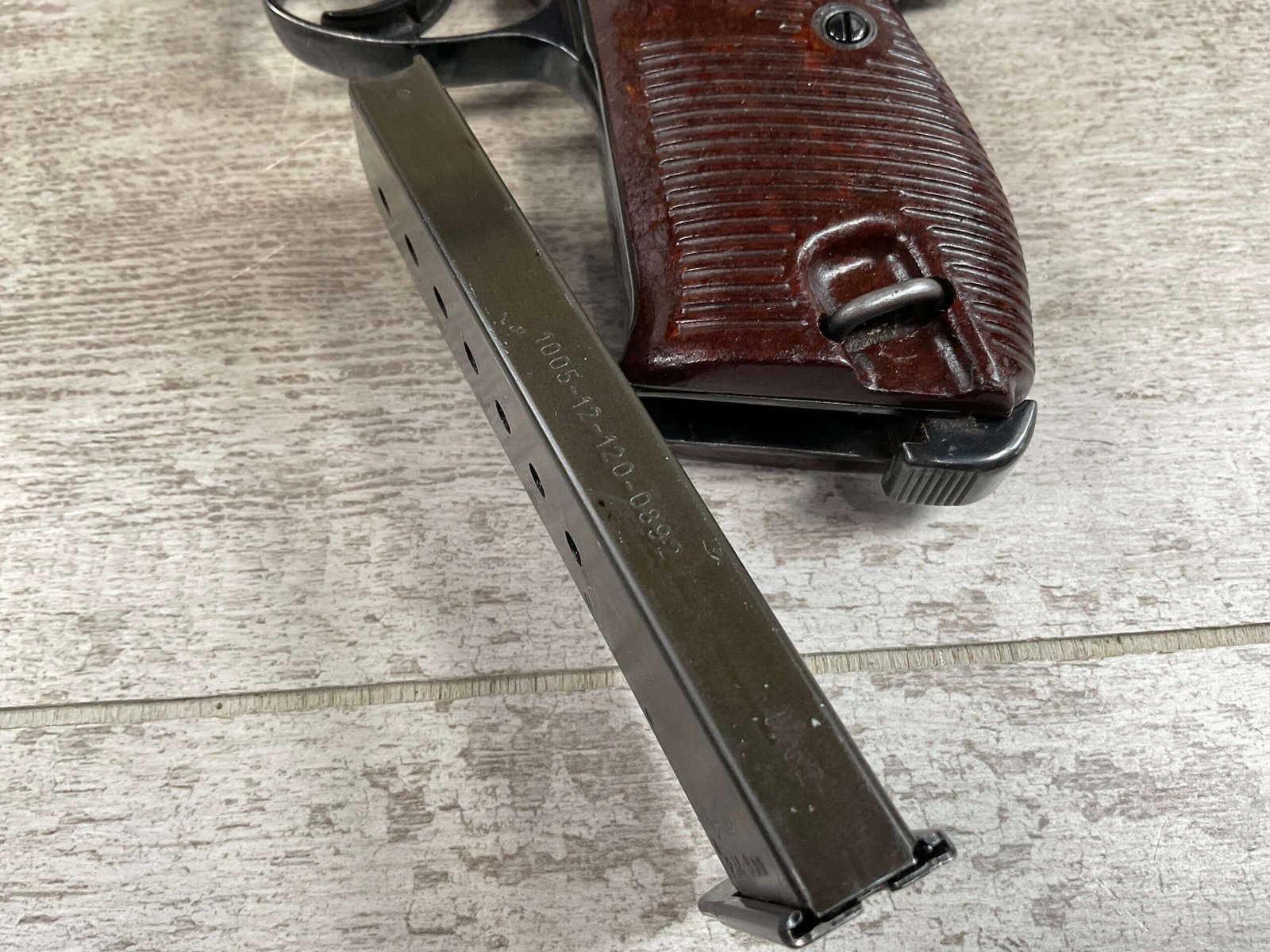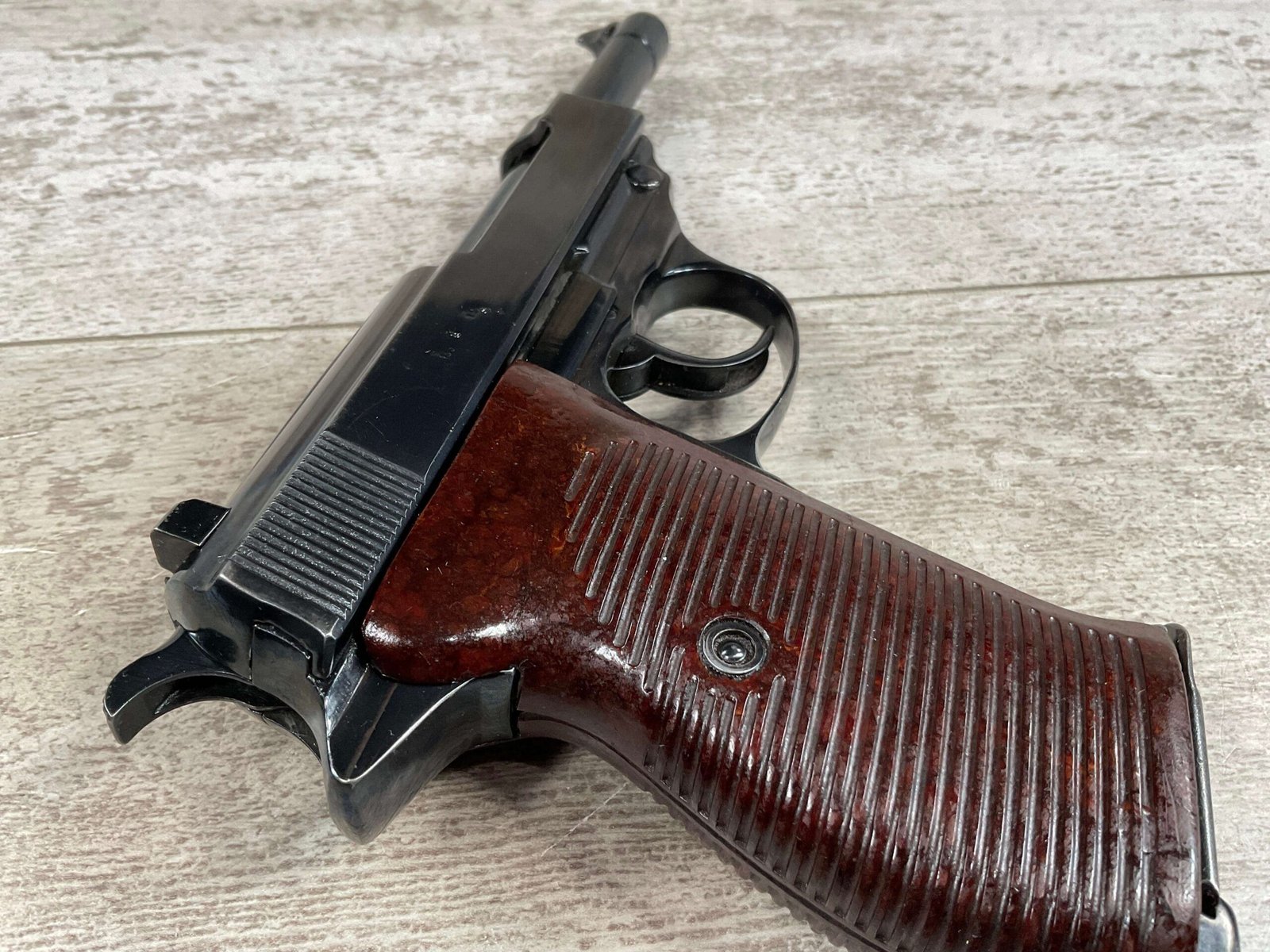 MAUSER byf43 P38 PISTOL MATCHING #4879p, 9mm, 5″ BBL, 98+% REBLUE, LEFT FRAME HAS “4679P E/135”, EXC BROWN BAKELITE GRIPS, VG BRIGHT BORE W/LIGHT FROSTING THROUGHOUT, NO IMPORT MARKS, NON MATCHING WALTHER P38 MARKED MAG, 95+% OVERALL