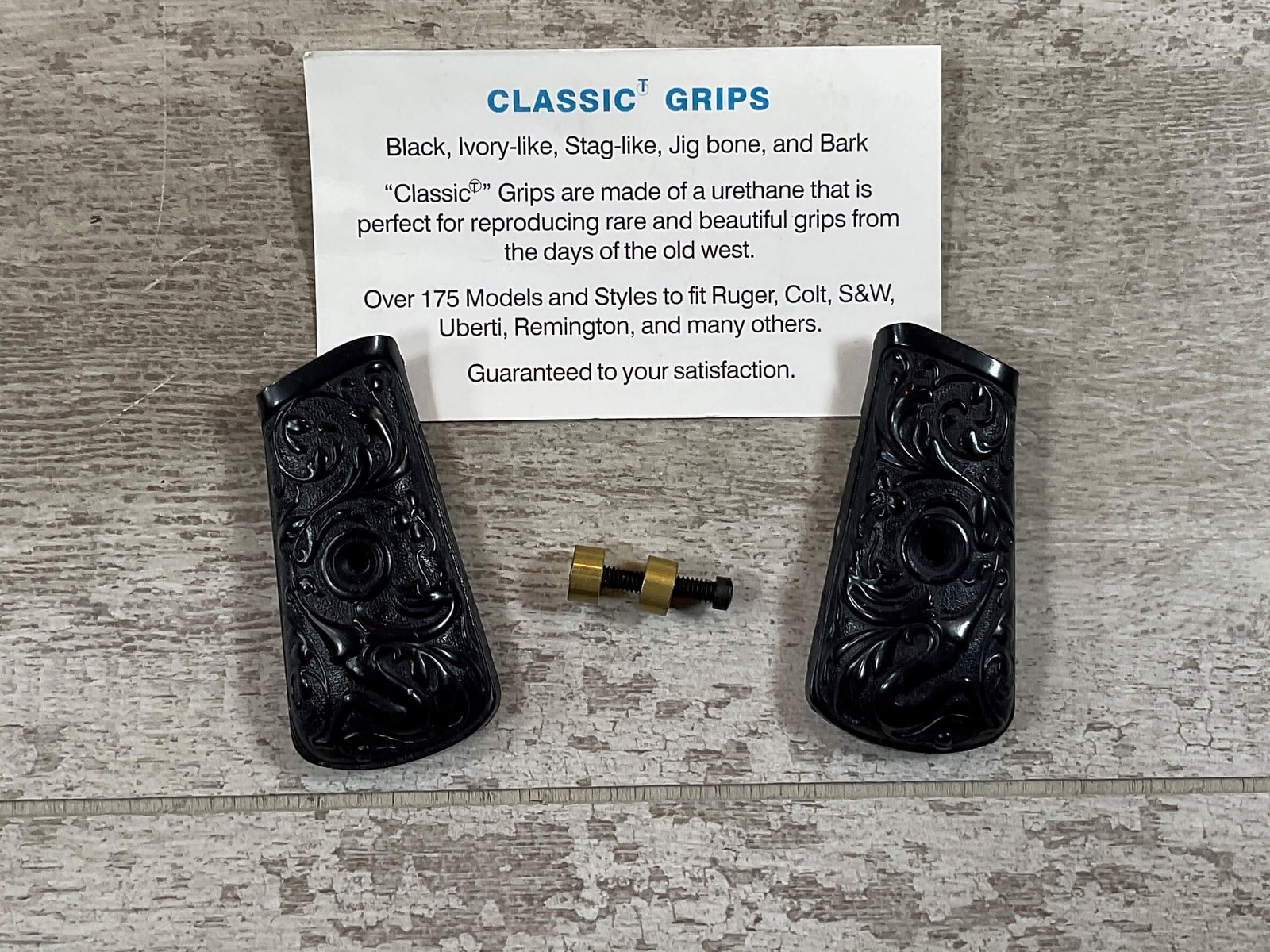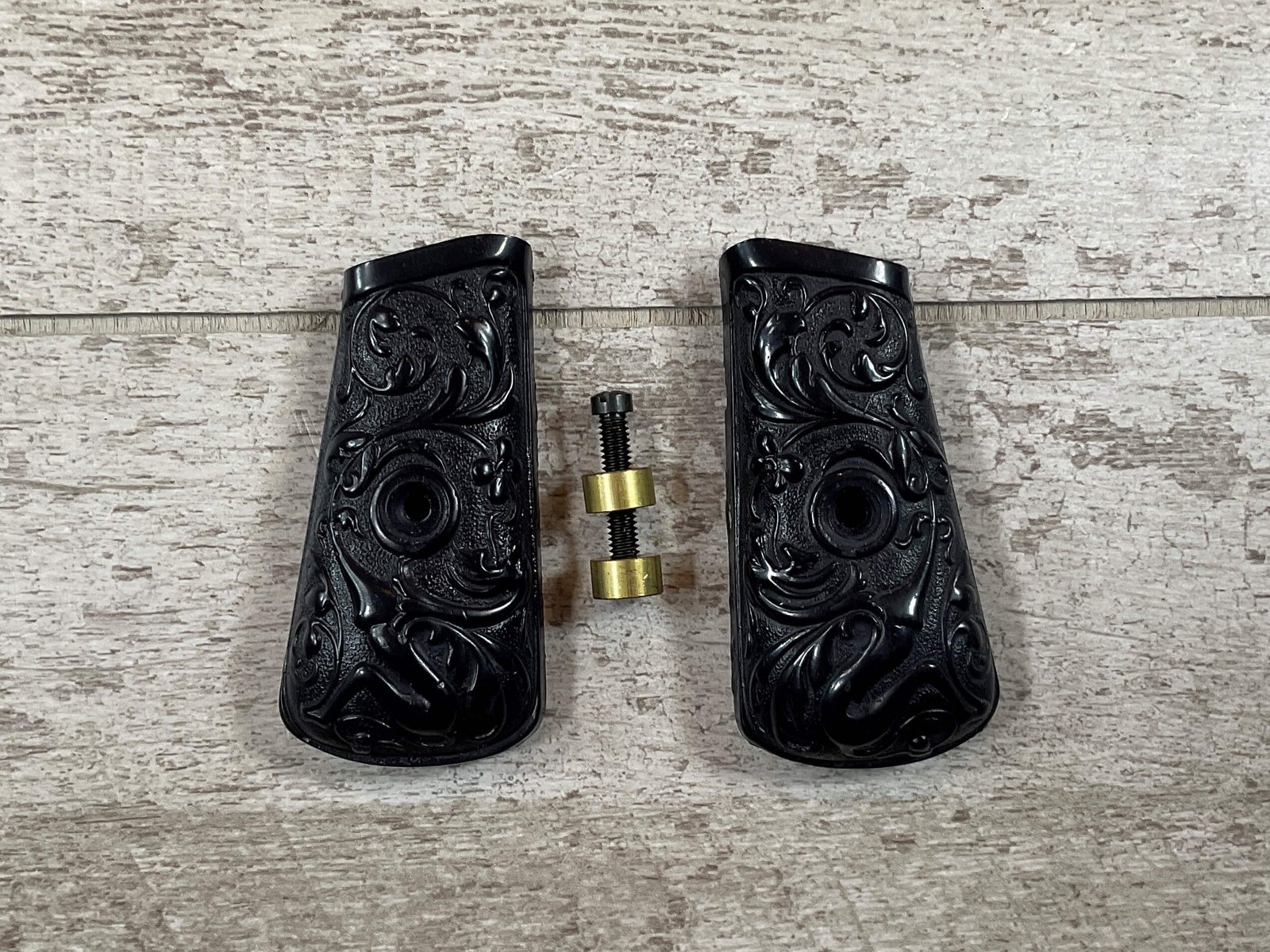 SKU#770 MAUSER C96 BOLO EXC. HARD BLACK PLASTIC FLORAL DESIGN REPRO GRIPS W/SCREW