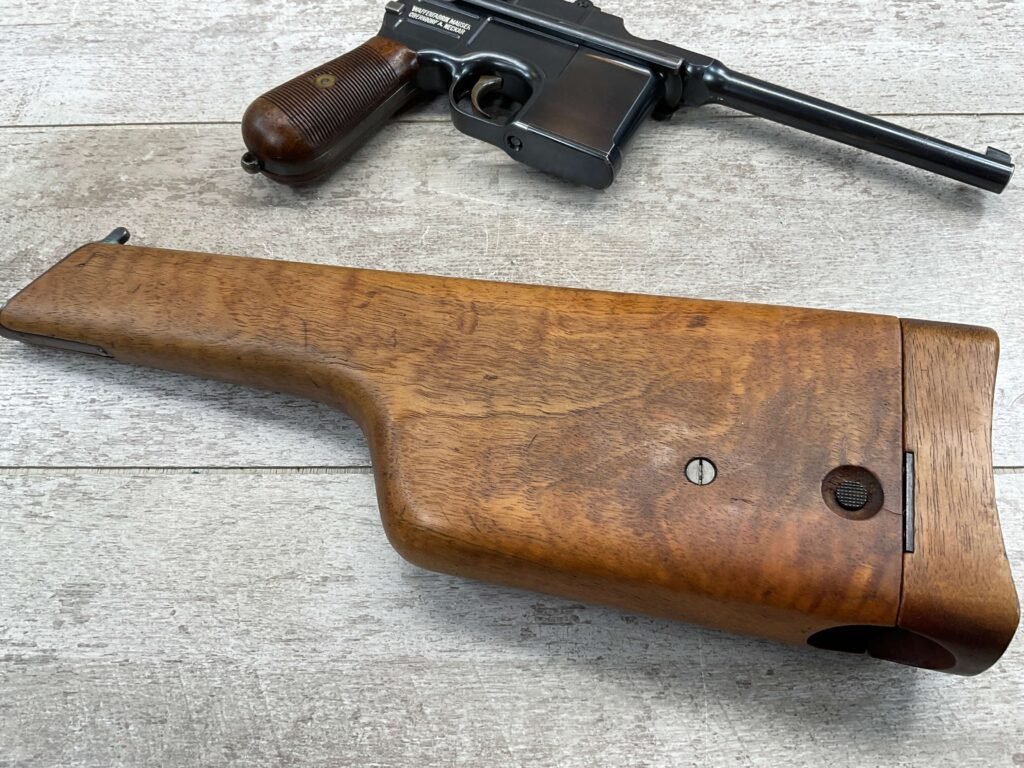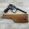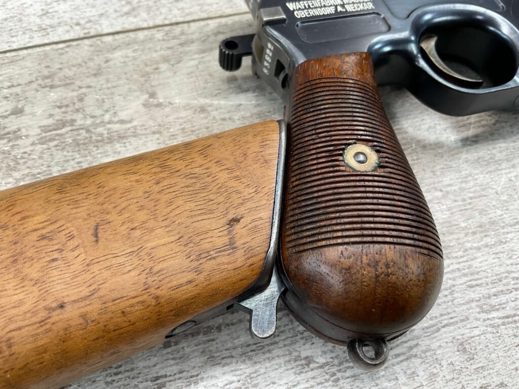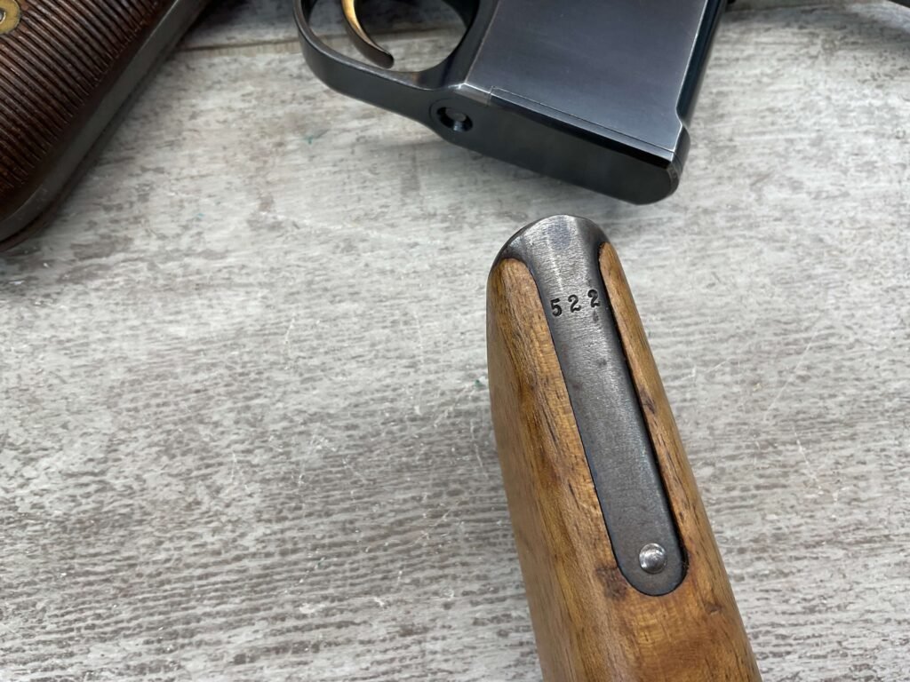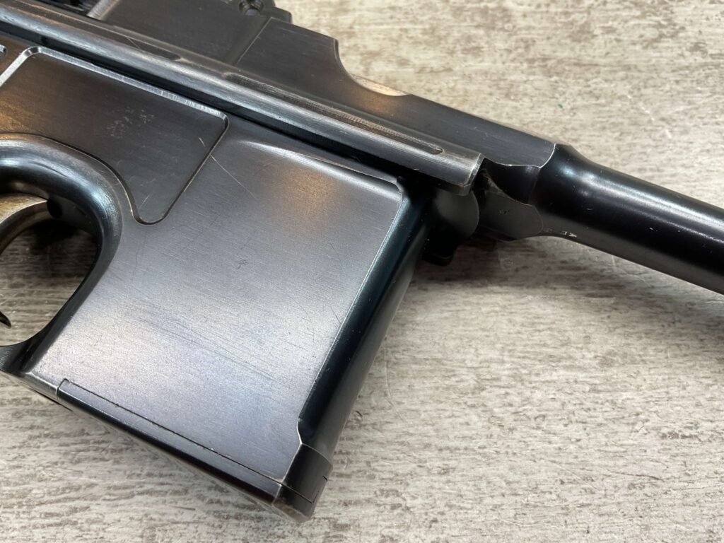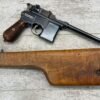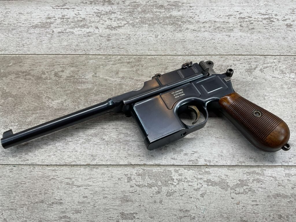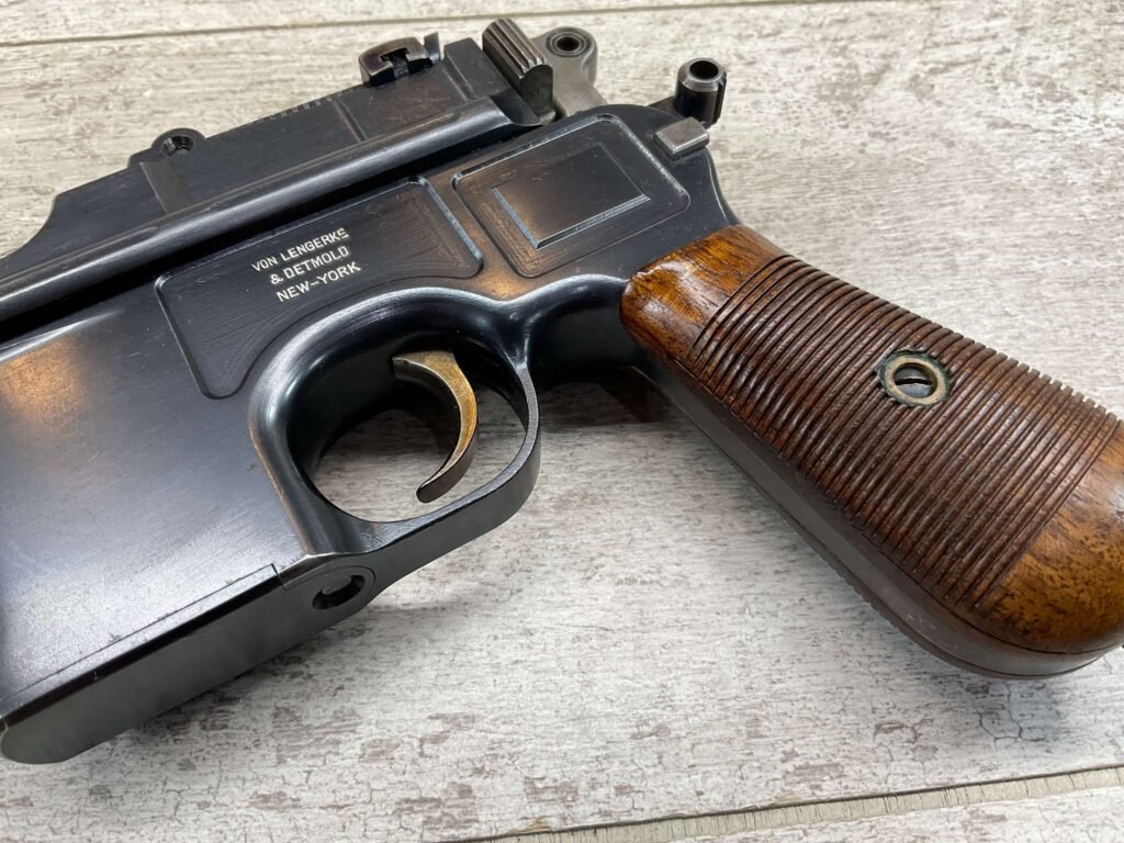 MAUSER C96 BROOMHANDLE #83522, 7.63MM, 98+% FIRE BLUE, 5.5″ BARREL, 1000 METER TANGENT REAR SIGHT, “VON LENGENRKE/ & DETMOLD/ NEW YORK” ON LEFT SIDE OF RECEIVER, “WAFFENFABRIK MAUSER/OBERNDOFT A. NECKAR” ON RIGHT SIDE OF RECEIVER, NO LANYARD RING, EVERYTHING MATCHES, VERY LIGHT HANDLING AND HOLSTER WEAR (IF ANY), 98+% ORIGINAL CONDITION, EXC BRIGHT BORE (POSSIBLY UNFIRED), EXC NUMBERED 32 GROOVE GRIPS, AMAZING OVER CONDITION!! MATCHING WOODEN STOCK/HOLSTER, MARKED “522”, EXC OVERALL, DOES HAVE SLIGHT CRACK (SEE PICTURES), STILL EXCELLENT CONDITION, PAPERWORK FROM GRIFFIN & HOWE INCLUDED, VERY RARE!!!