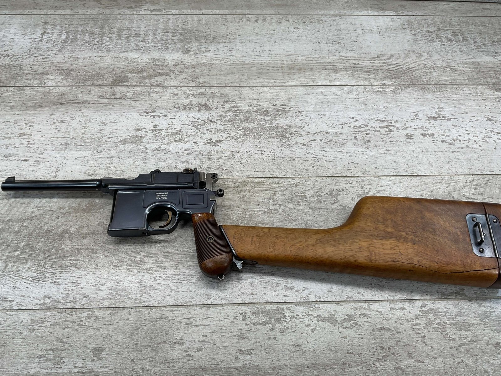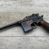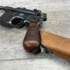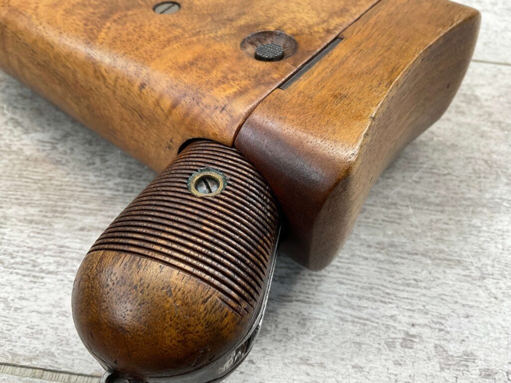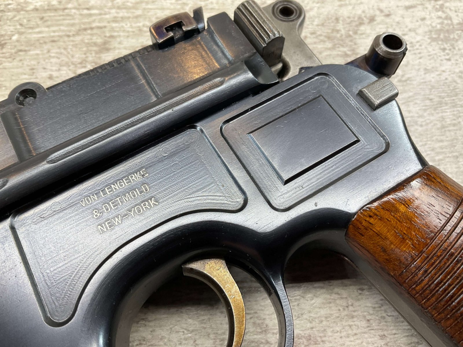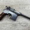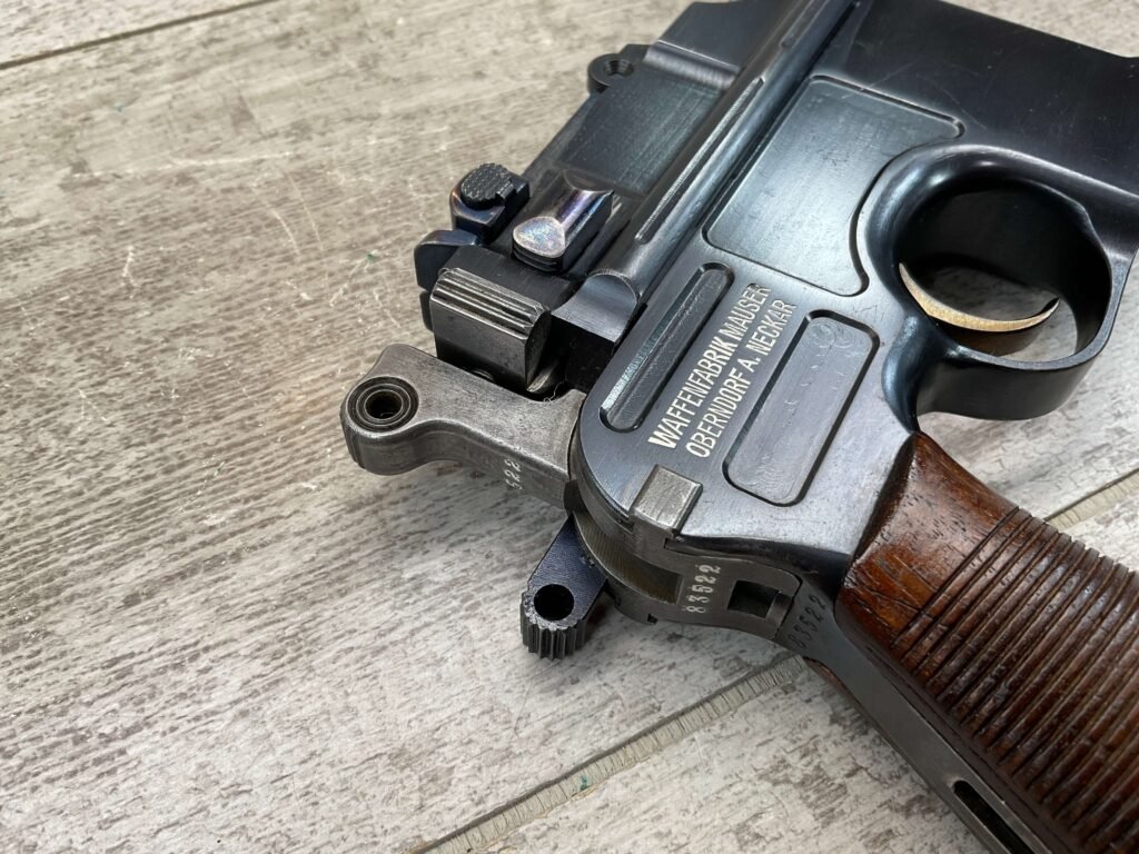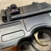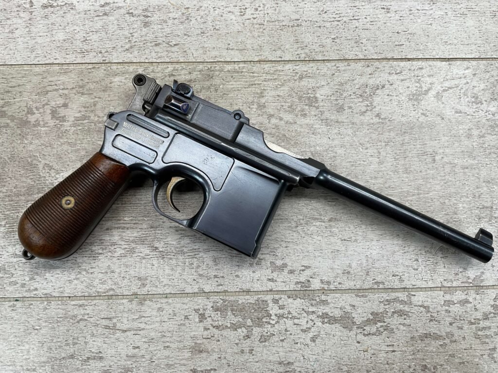 MAUSER C96 BROOMHANDLE #83522, 7.63MM, 98+% FIRE BLUE, 5.5″ BARREL, 1000 METER TANGENT REAR SIGHT, “VON LENGENRKE/ & DETMOLD/ NEW YORK” ON LEFT SIDE OF RECEIVER, “WAFFENFABRIK MAUSER/OBERNDOFT A. NECKAR” ON RIGHT SIDE OF RECEIVER, NO LANYARD RING, EVERYTHING MATCHES, VERY LIGHT HANDLING AND HOLSTER WEAR (IF ANY), 98+% ORIGINAL CONDITION, EXC BRIGHT BORE (POSSIBLY UNFIRED), EXC NUMBERED 32 GROOVE GRIPS, AMAZING OVER CONDITION!! MATCHING WOODEN STOCK/HOLSTER, MARKED “522”, EXC OVERALL, DOES HAVE SLIGHT CRACK (SEE PICTURES), STILL EXCELLENT CONDITION, PAPERWORK FROM GRIFFIN & HOWE INCLUDED, VERY RARE!!!