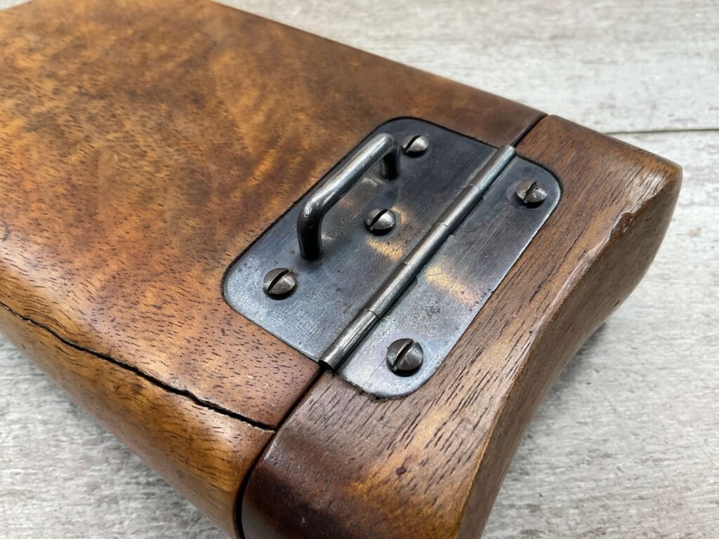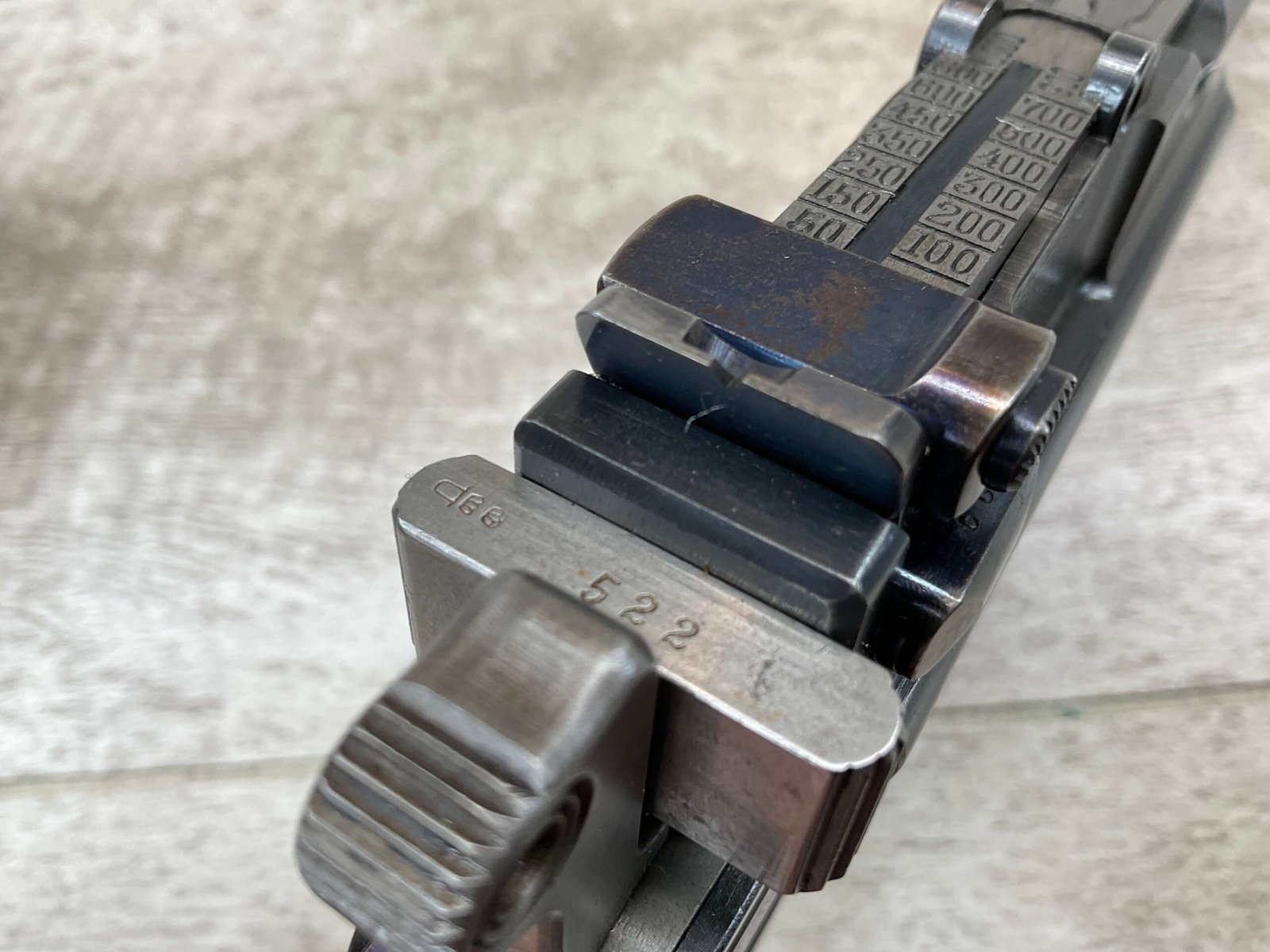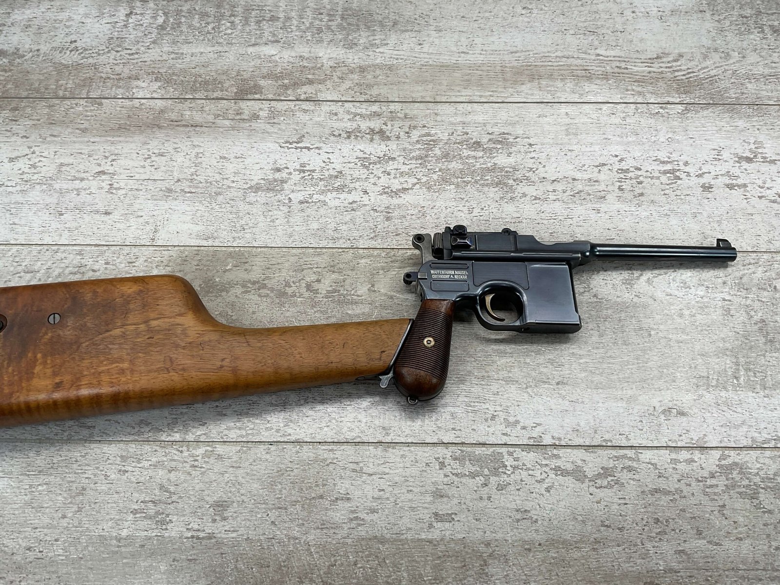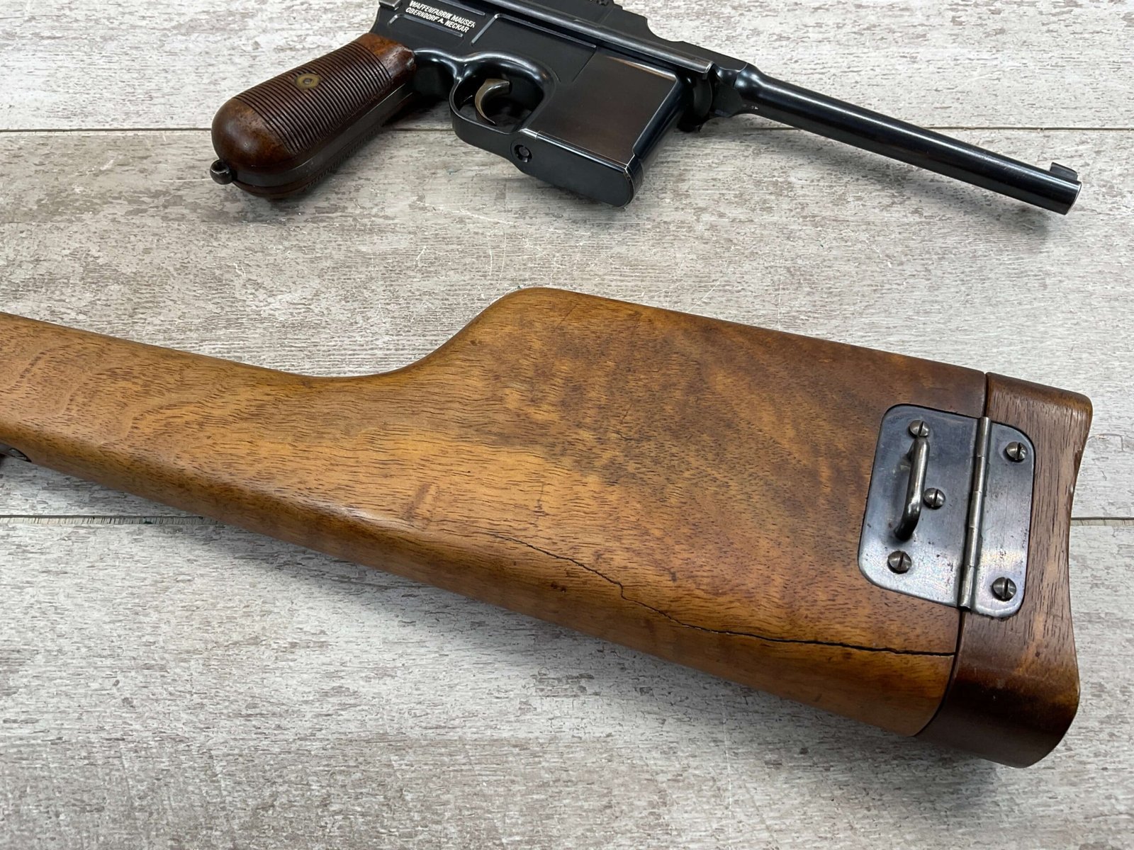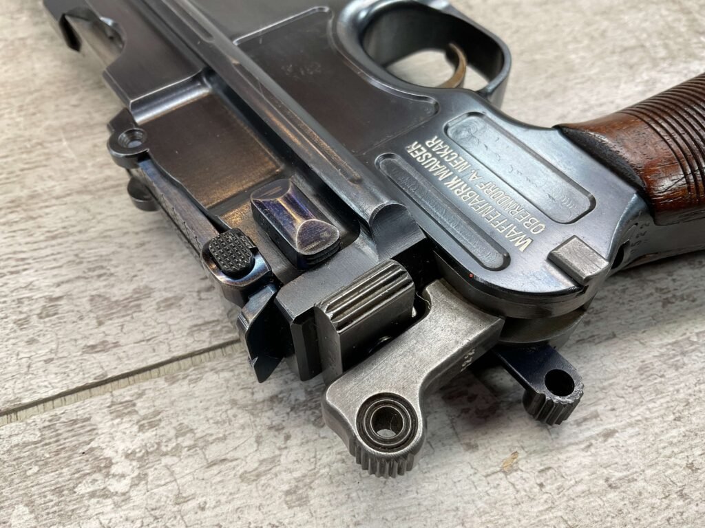 MAUSER C96 BROOMHANDLE #83522, 7.63MM, 98+% FIRE BLUE, 5.5″ BARREL, 1000 METER TANGENT REAR SIGHT, “VON LENGENRKE/ & DETMOLD/ NEW YORK” ON LEFT SIDE OF RECEIVER, “WAFFENFABRIK MAUSER/OBERNDOFT A. NECKAR” ON RIGHT SIDE OF RECEIVER, NO LANYARD RING, EVERYTHING MATCHES, VERY LIGHT HANDLING AND HOLSTER WEAR (IF ANY), 98+% ORIGINAL CONDITION, EXC BRIGHT BORE (POSSIBLY UNFIRED), EXC NUMBERED 32 GROOVE GRIPS, AMAZING OVER CONDITION!! MATCHING WOODEN STOCK/HOLSTER, MARKED “522”, EXC OVERALL, DOES HAVE SLIGHT CRACK (SEE PICTURES), STILL EXCELLENT CONDITION, PAPERWORK FROM GRIFFIN & HOWE INCLUDED, VERY RARE!!!