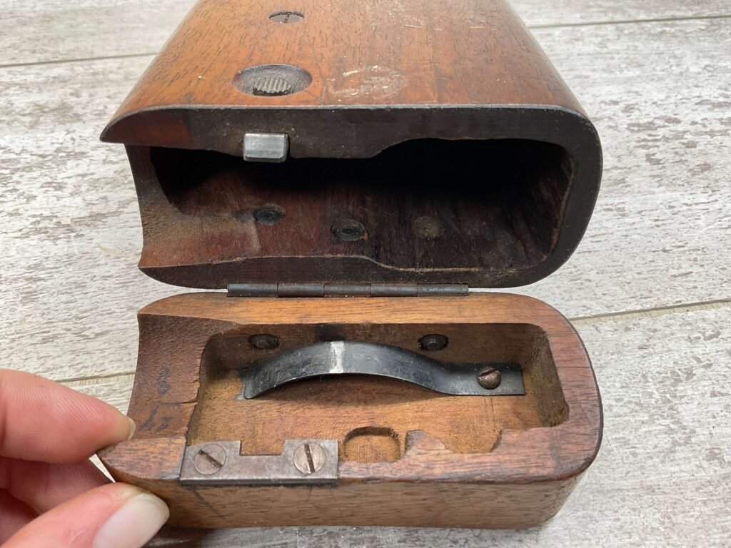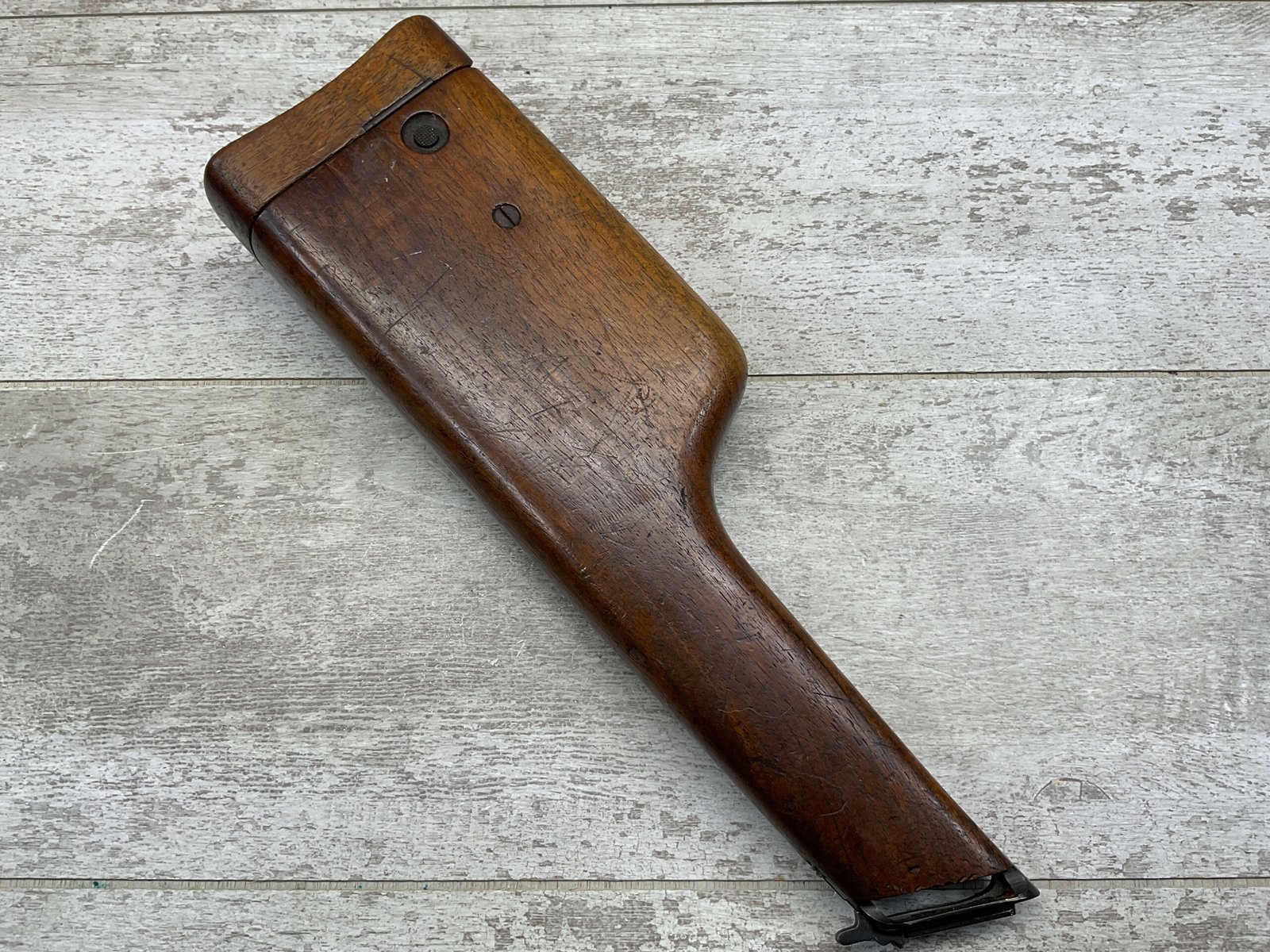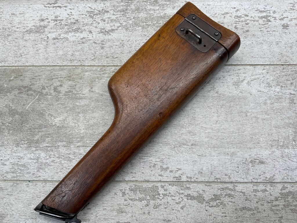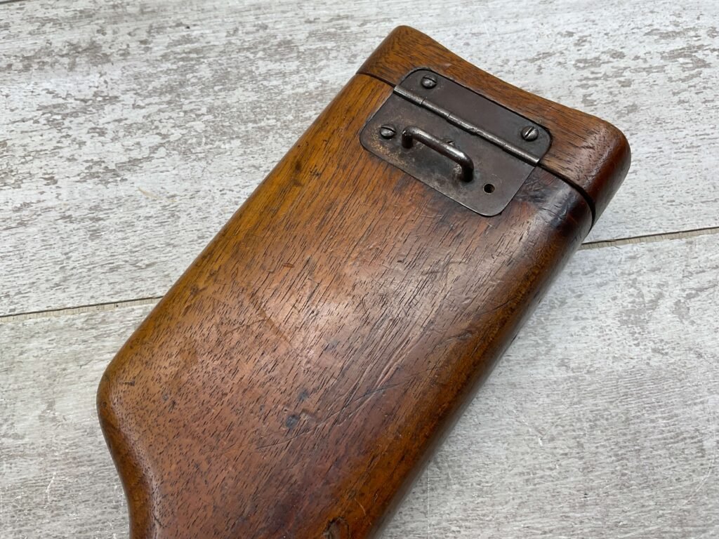 MAUSER C96 BROOMHANDLE WOODEN HOLSTER / STOCK, LUG IS NOT NUMBERED & DOESN’T FIT PROPERLY (SEE PHOTOS), EXC HINGE W/ NO ISSUES CLOSING BUT MISSING ONE SCREW, LIGHT SCRATCHES & DENTS FROM USE, VG OVERALL