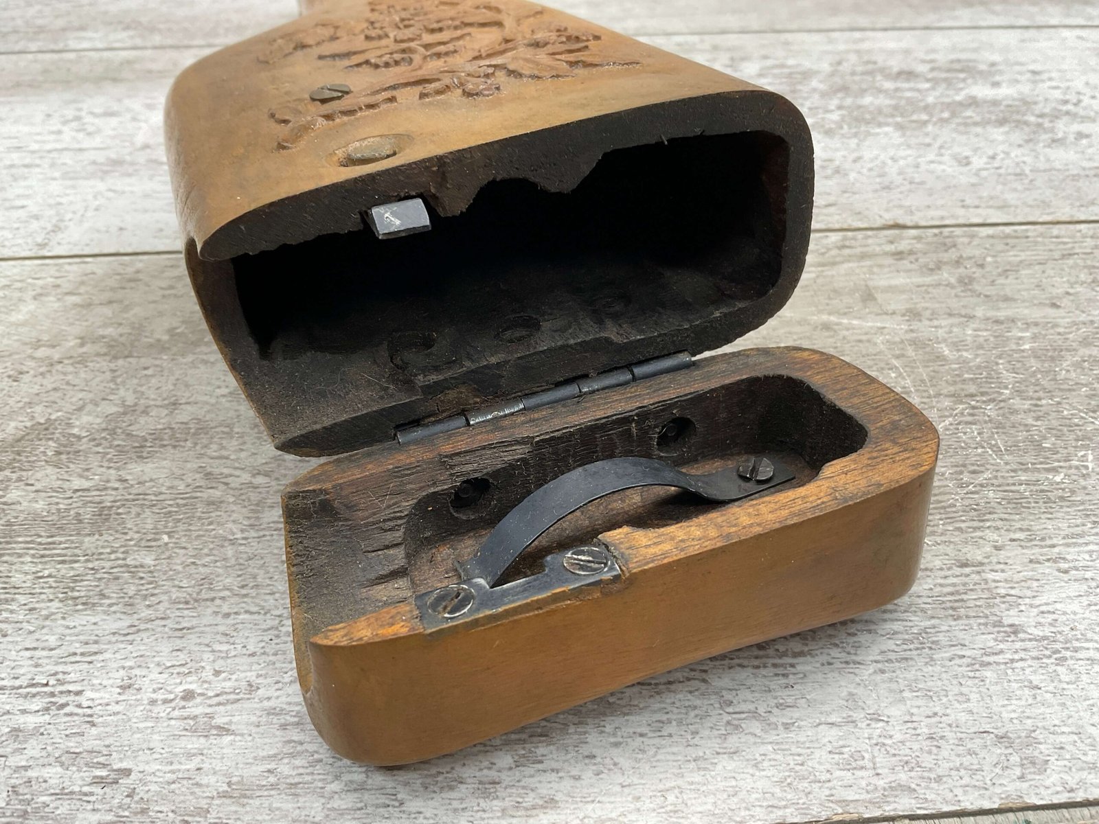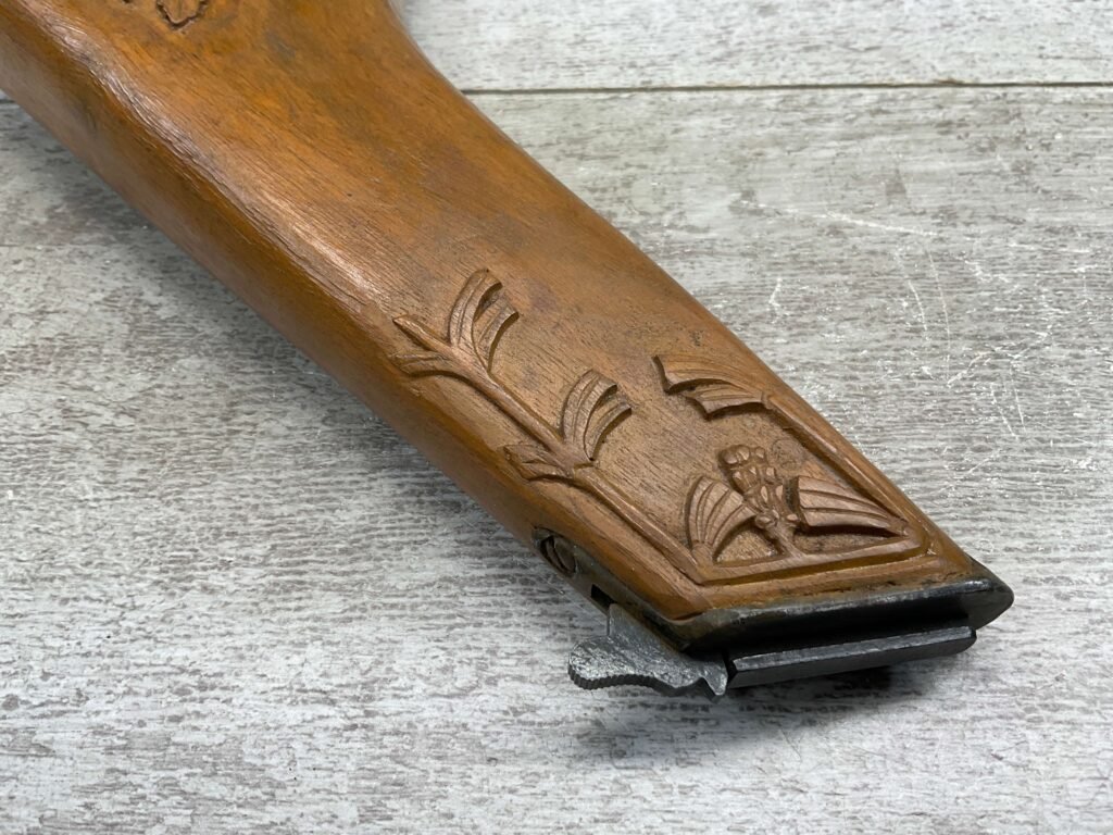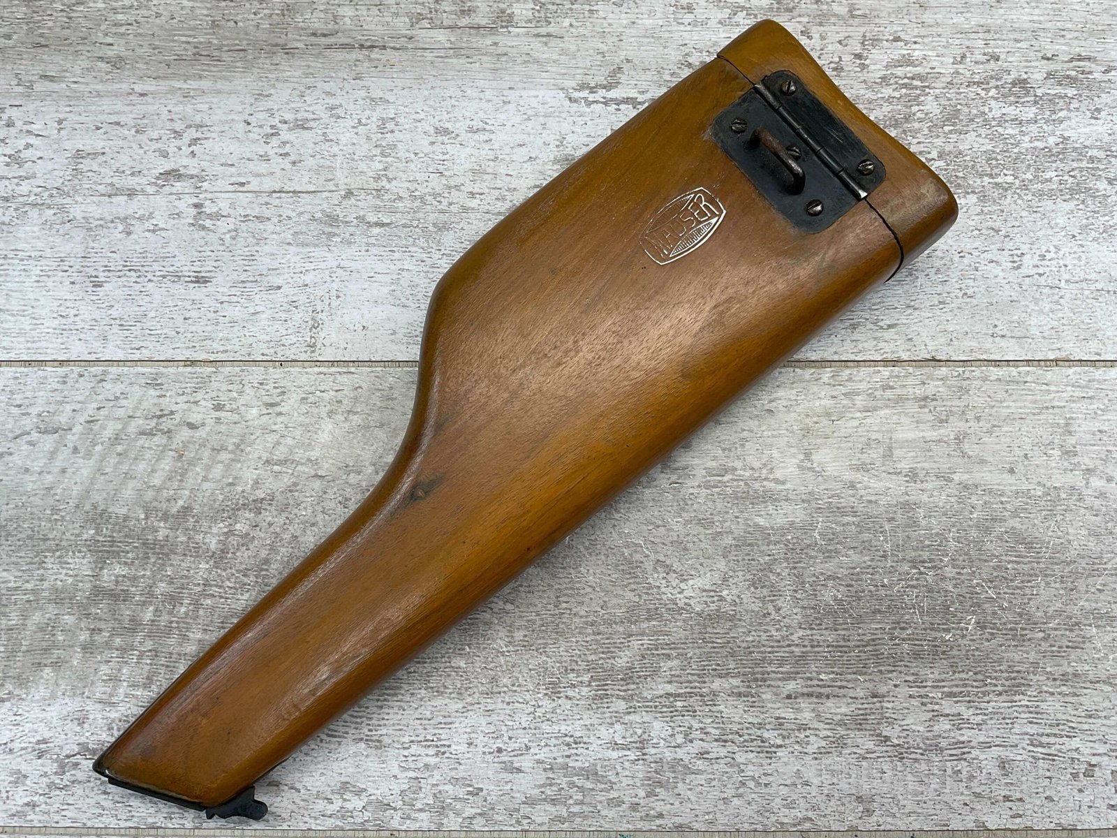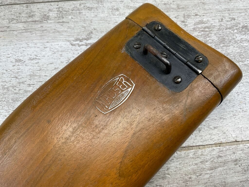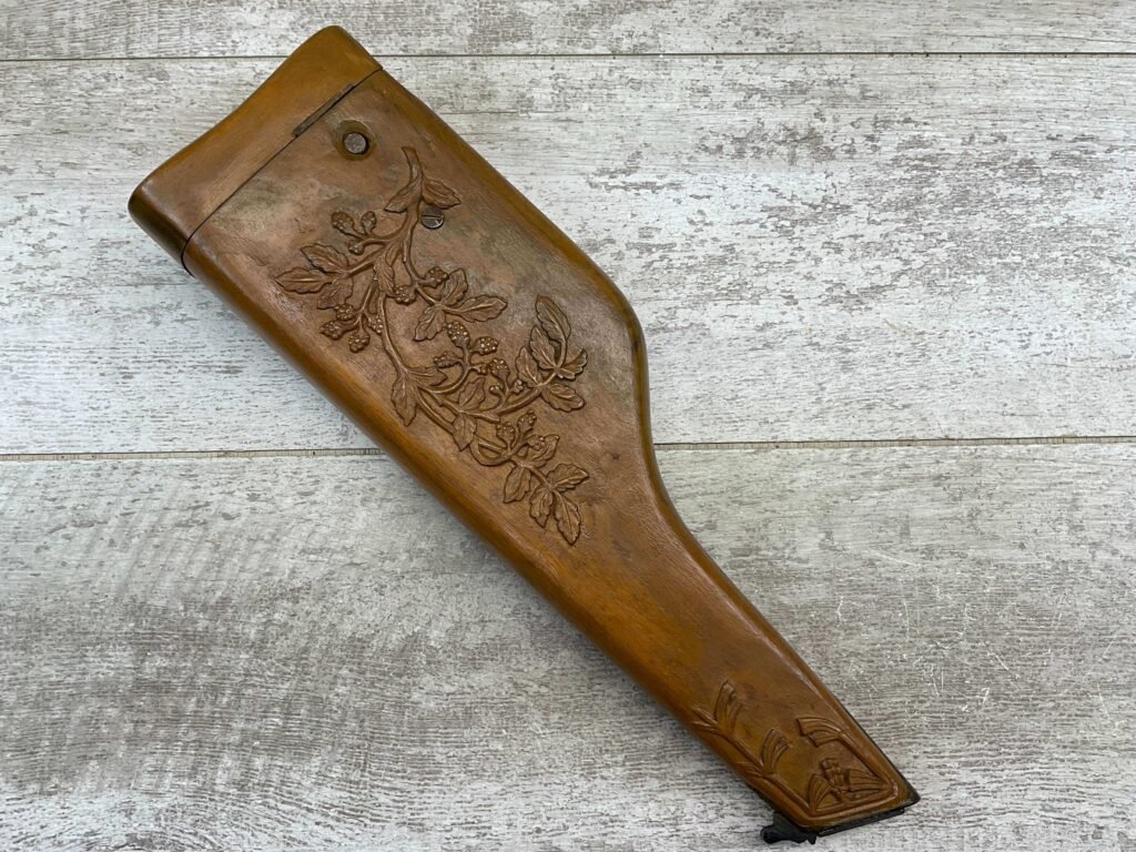 MAUSER C96 BROOMHANDLE WOODEN HOLSTER / STOCK, BEAUTIFUL FLORAL DESIGN ON FRONT, MAUSER MARK ON BACK OF HOLSTER, FUNCTIONS & OPENS WELL, EXC OVERALL CONDITION!