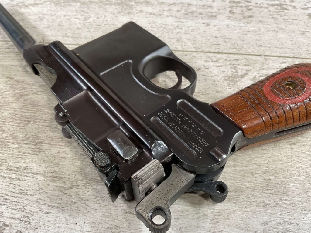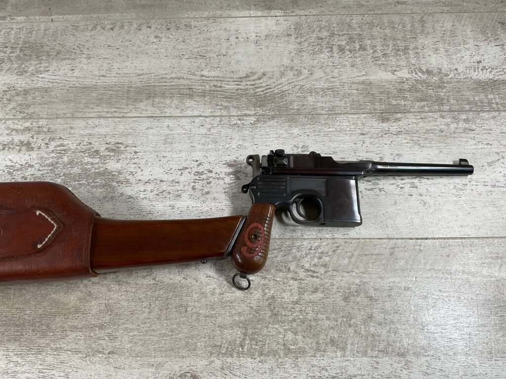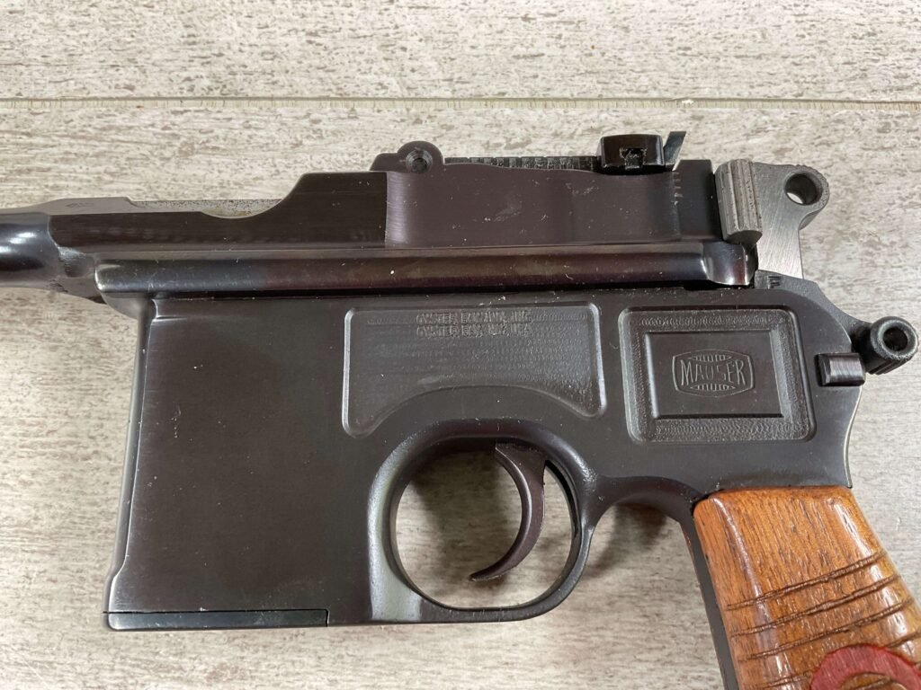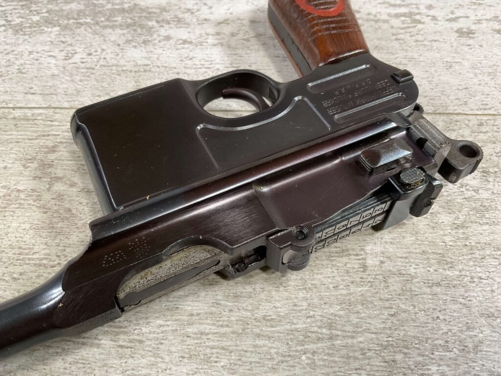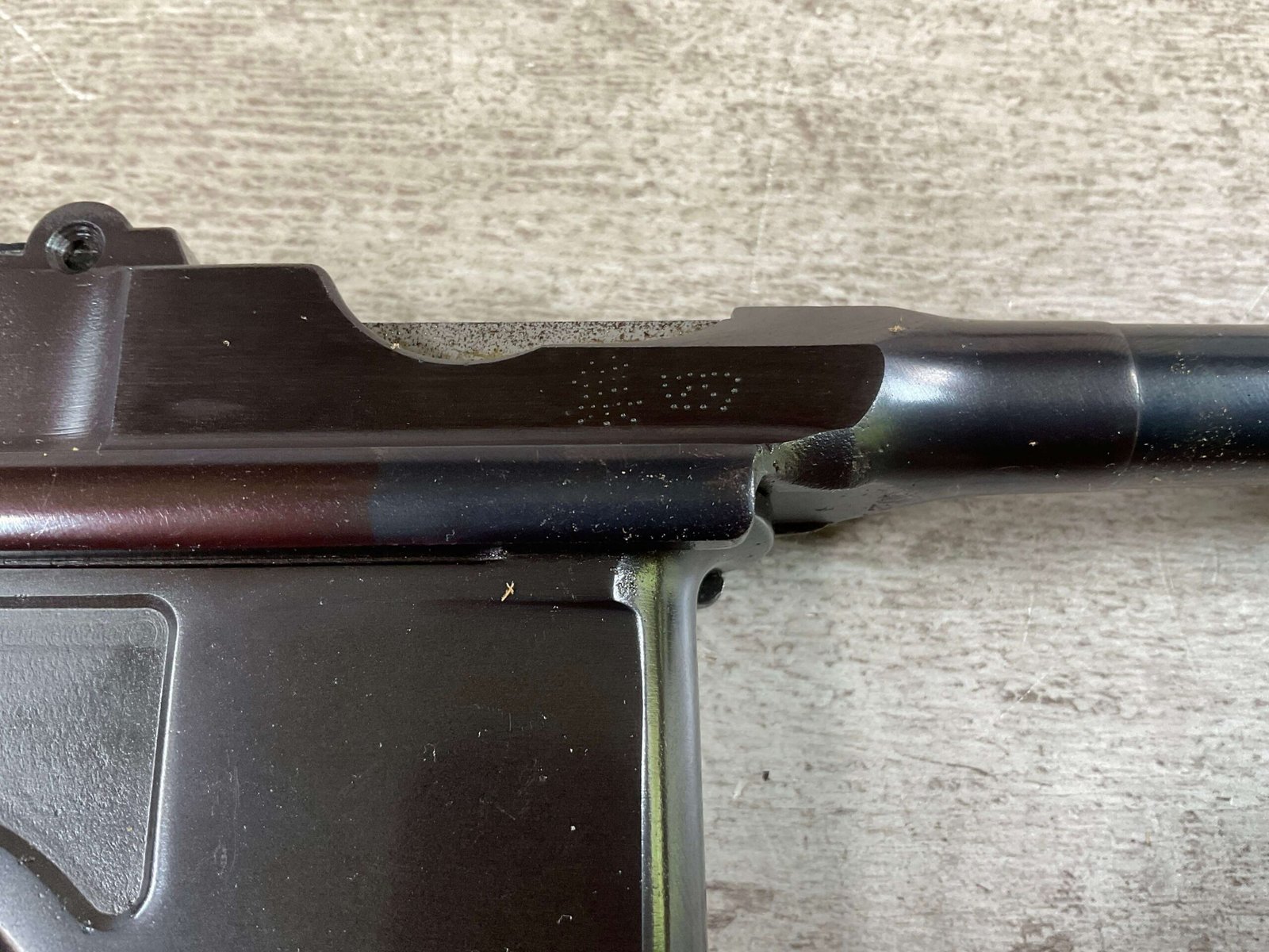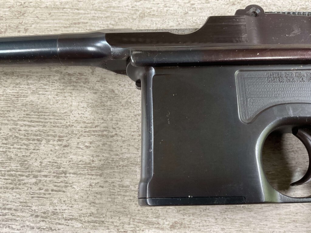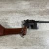 MAUSER C96 RED NINE OYSTER BAY REWORK PISTOL RIG #883019, 9MM, 98+% BLUE, OYSTER BAY REWORK, EXC REPRO GRIPS, MISMATCHED, EXC MIRROR BRIGHT BORE AND RIFLING, LANYARD RING, 5.5″ BARREL, EXC REPRO STOCK W/LEATHER SLING, MISSING LATCH, REALLY NICE REFINISHED CONDITION & 9MM!! 98% OVERALL
