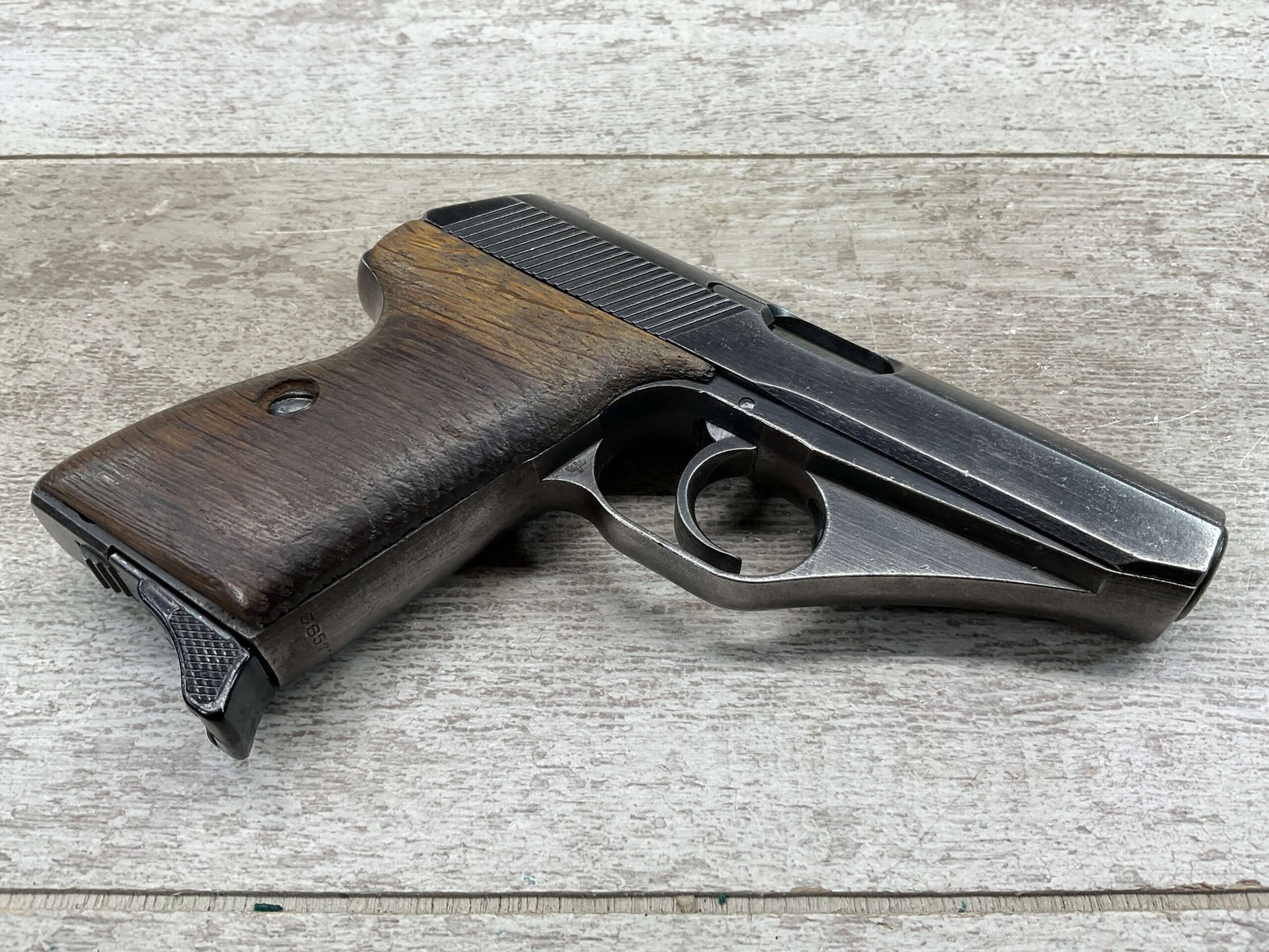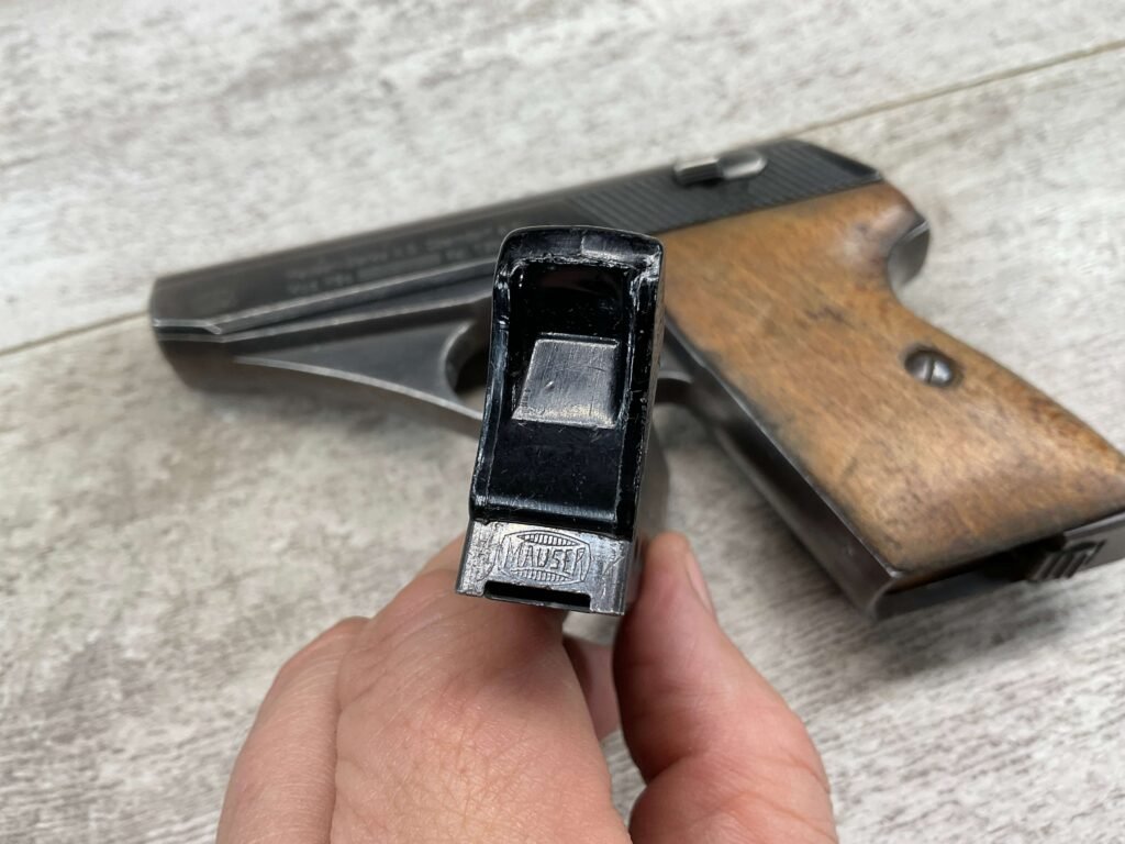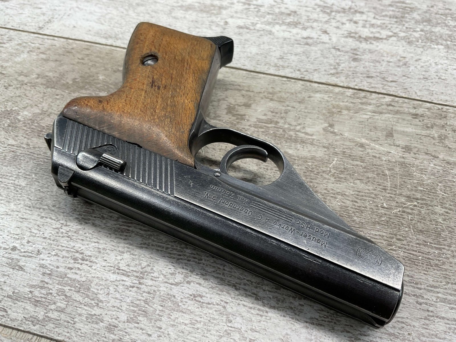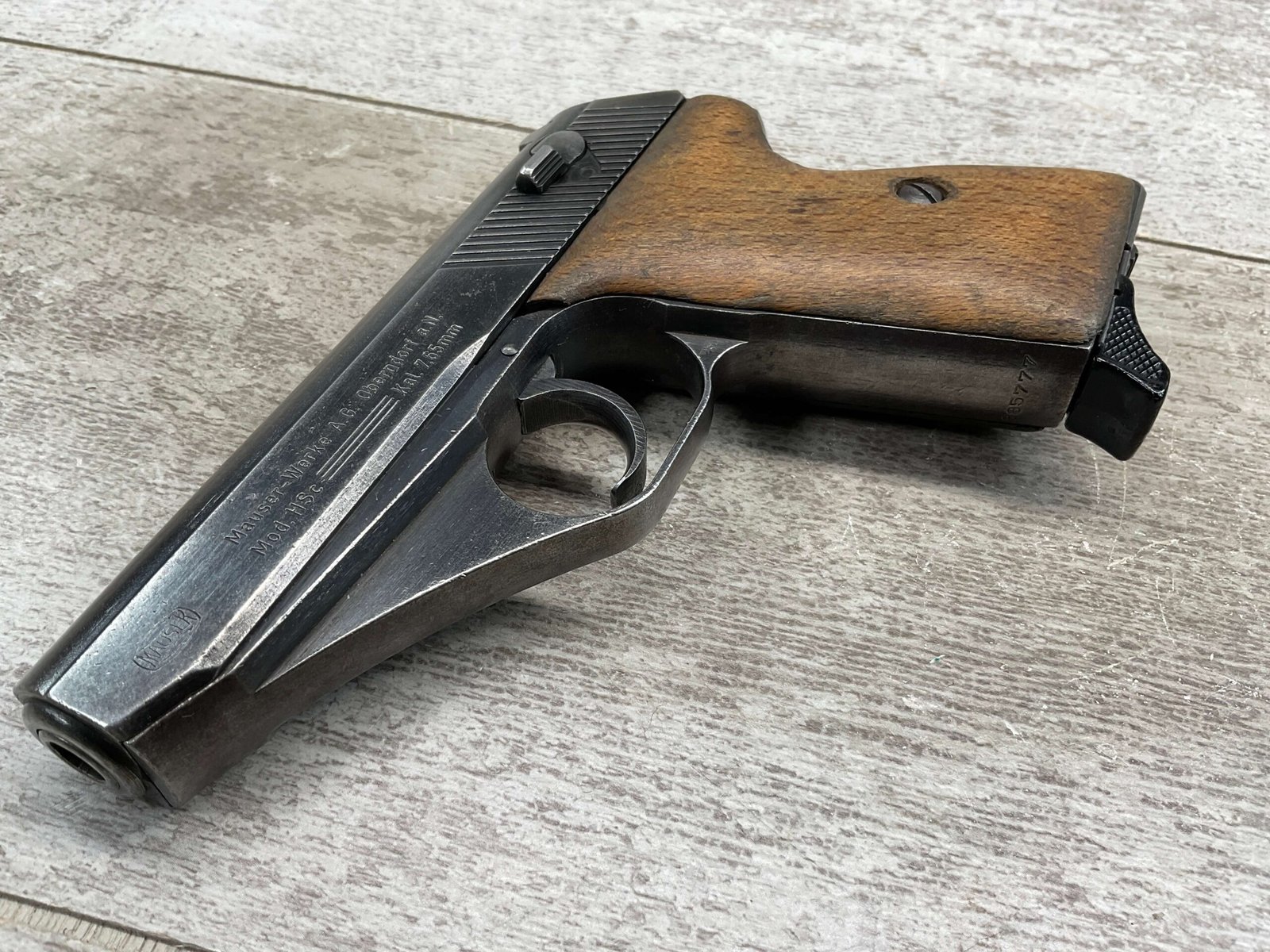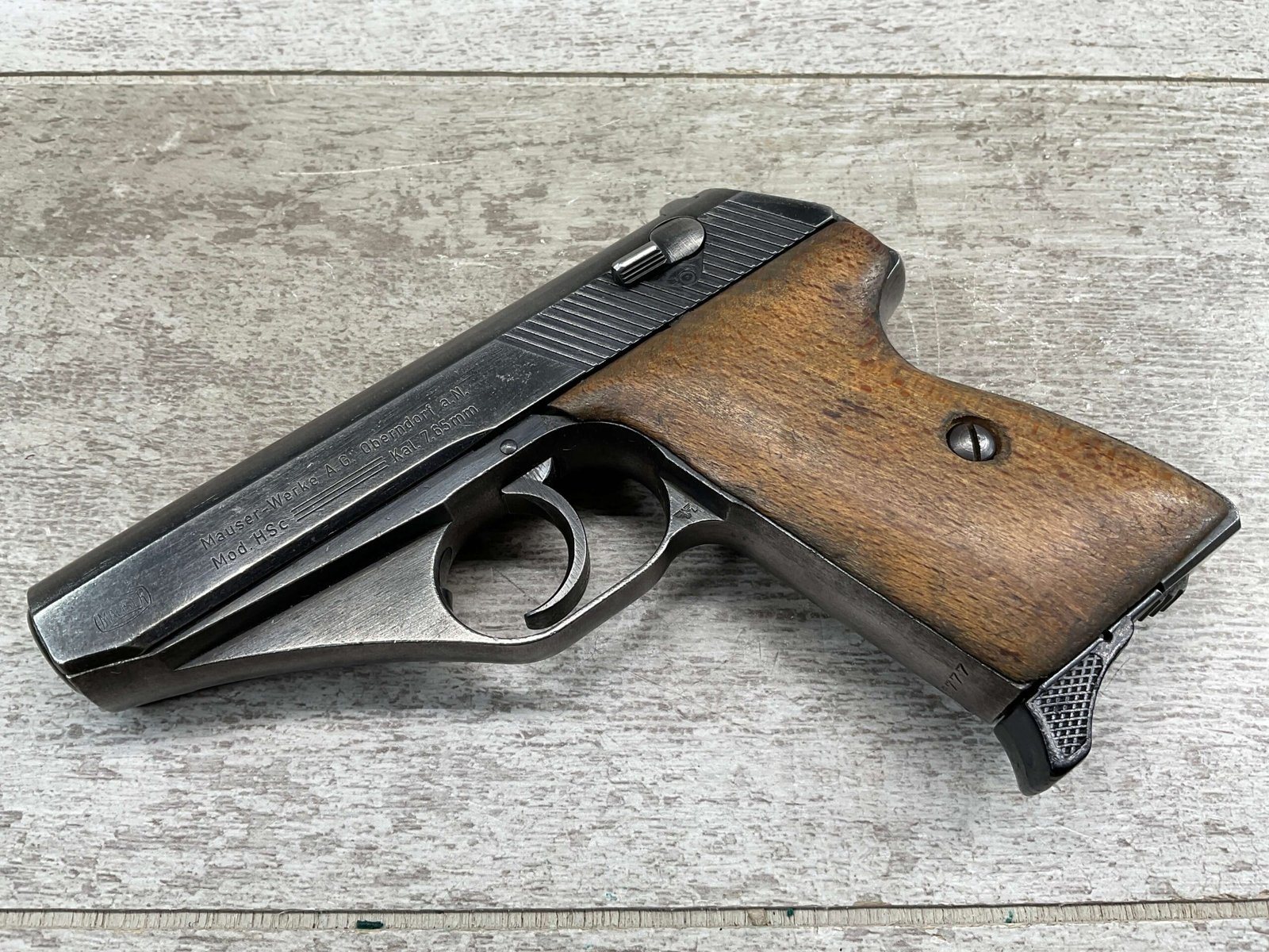 MAUSER HSc 7.65MM NAZI POLICE MARKED SEMI AUTO PISTOL #885777, 2ND VARIATION, NAZI POLICE MARKED “EAGLE/L”, ORIGINAL BLUE THAT HAS TURNED GREY PATINA, GOOD SMOOTH WOOD GRIPS, EXC BORE & RIFLING, POST WAR PARKERIZED PLASTIC BASE MAGAZINE, NICE NAZI POLICE MARKED MAUSER!