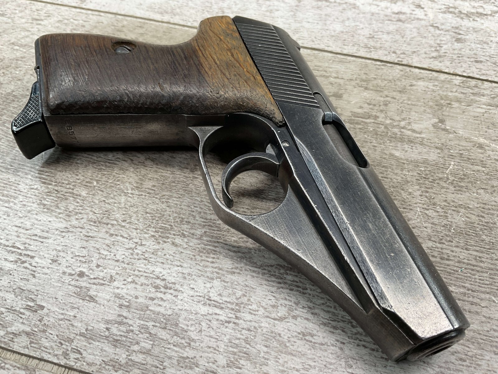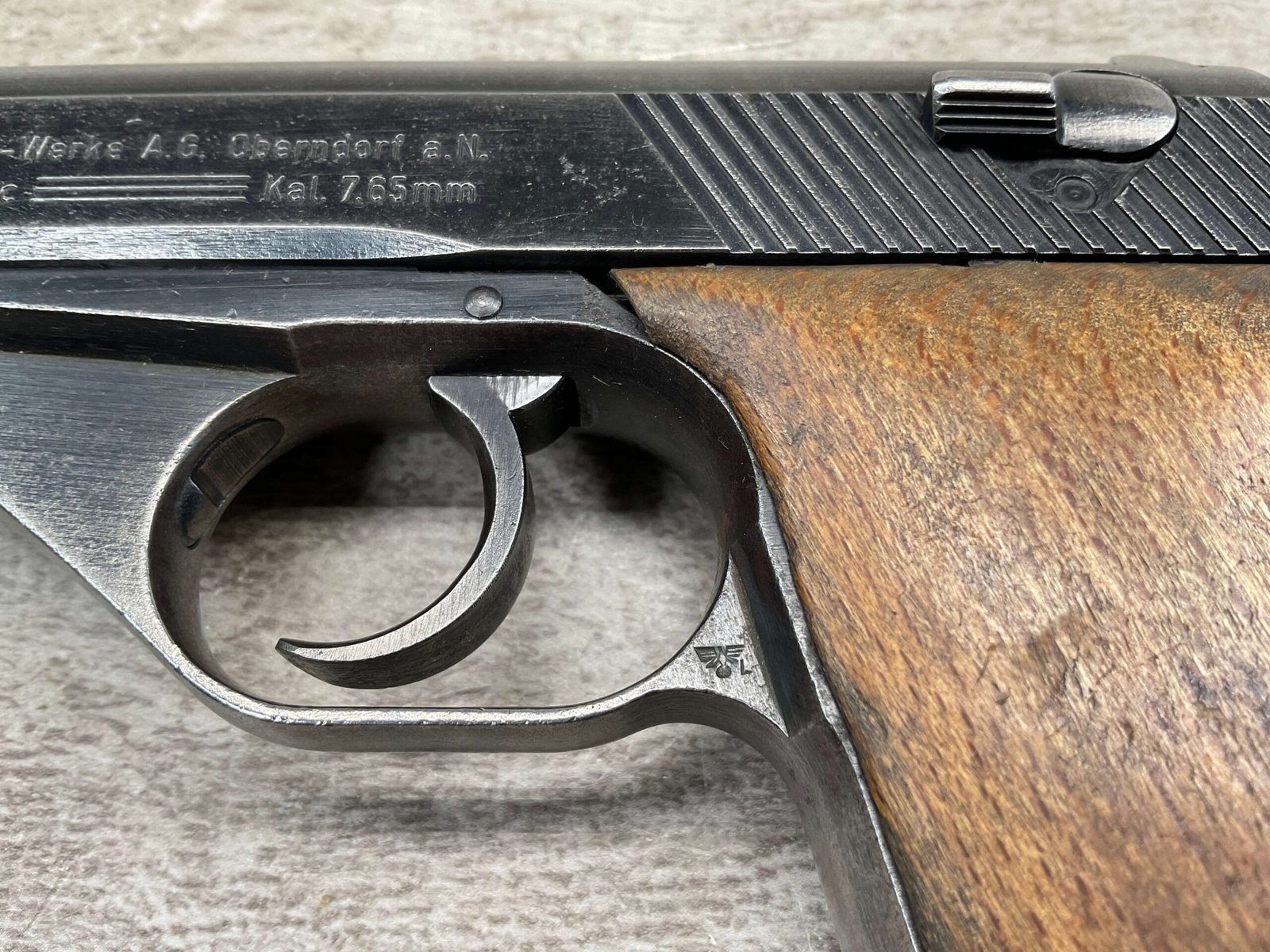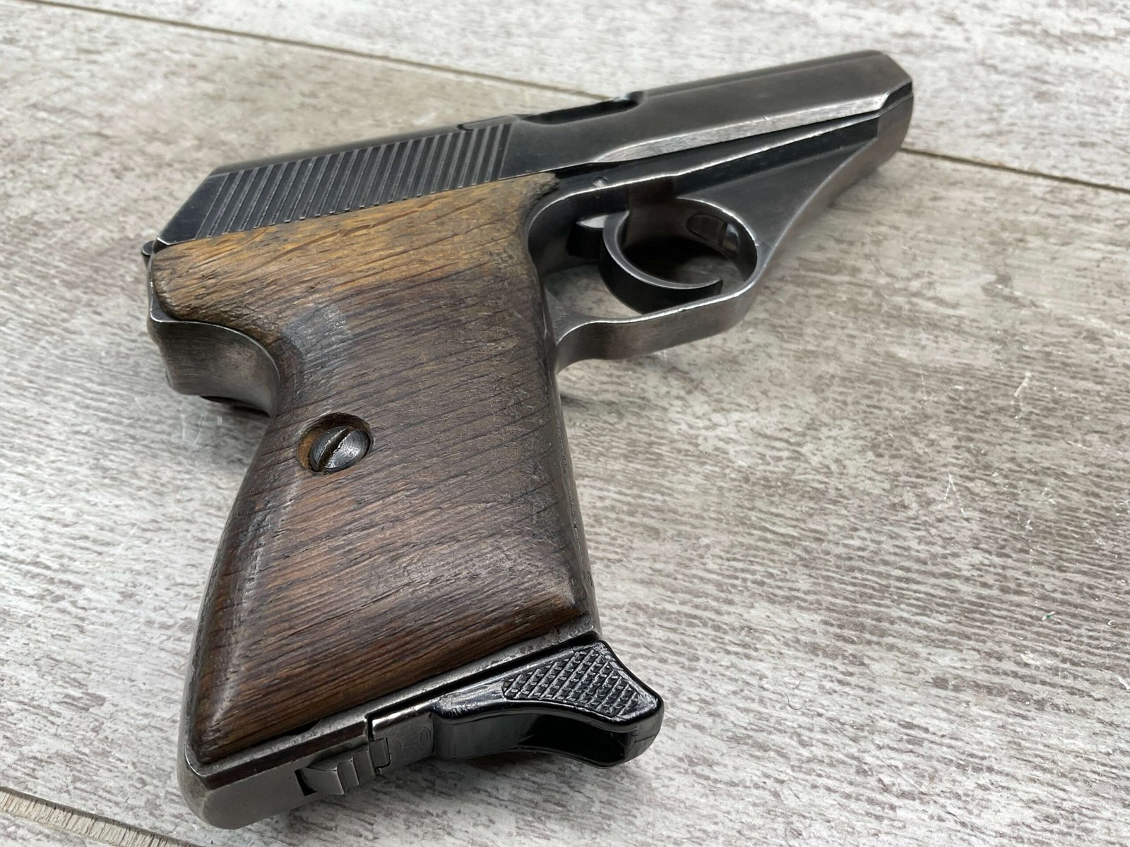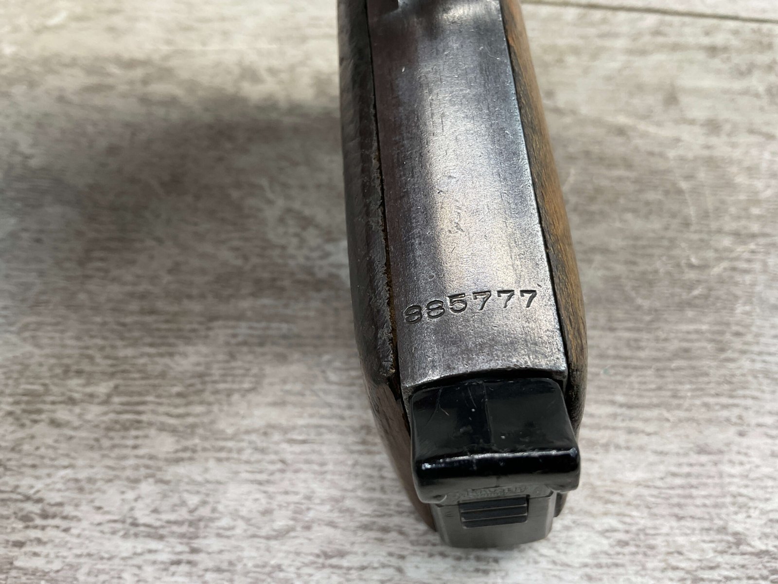 MAUSER HSc 7.65MM NAZI POLICE MARKED SEMI AUTO PISTOL #885777, 2ND VARIATION, NAZI POLICE MARKED “EAGLE/L”, ORIGINAL BLUE THAT HAS TURNED GREY PATINA, GOOD SMOOTH WOOD GRIPS, EXC BORE & RIFLING, POST WAR PARKERIZED PLASTIC BASE MAGAZINE, NICE NAZI POLICE MARKED MAUSER!