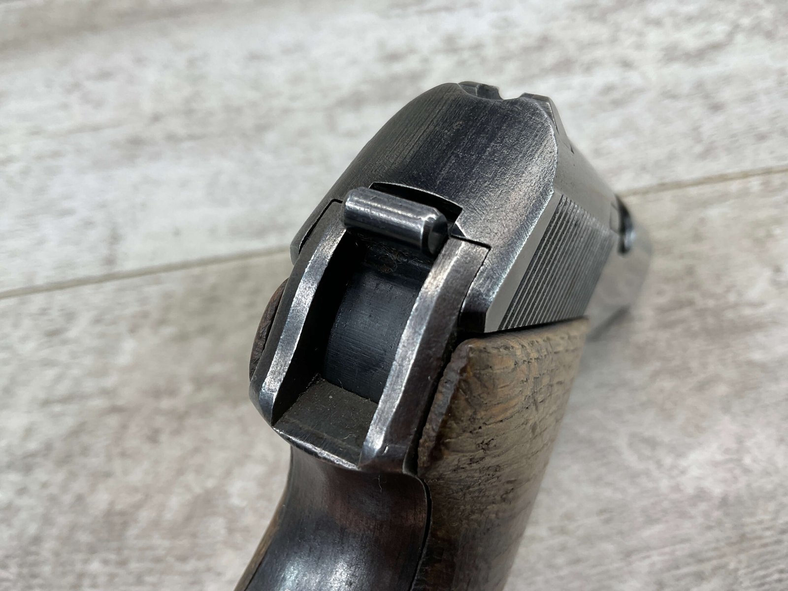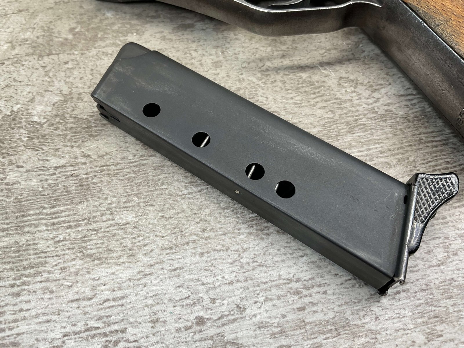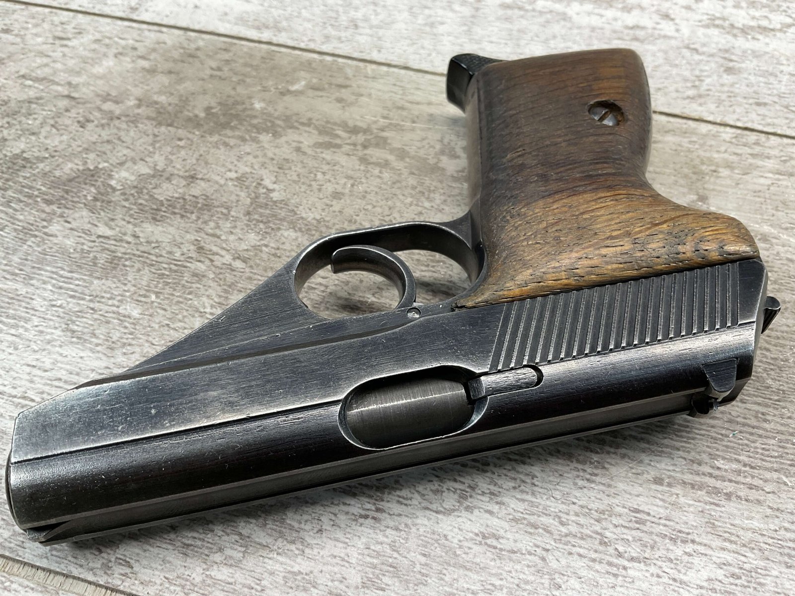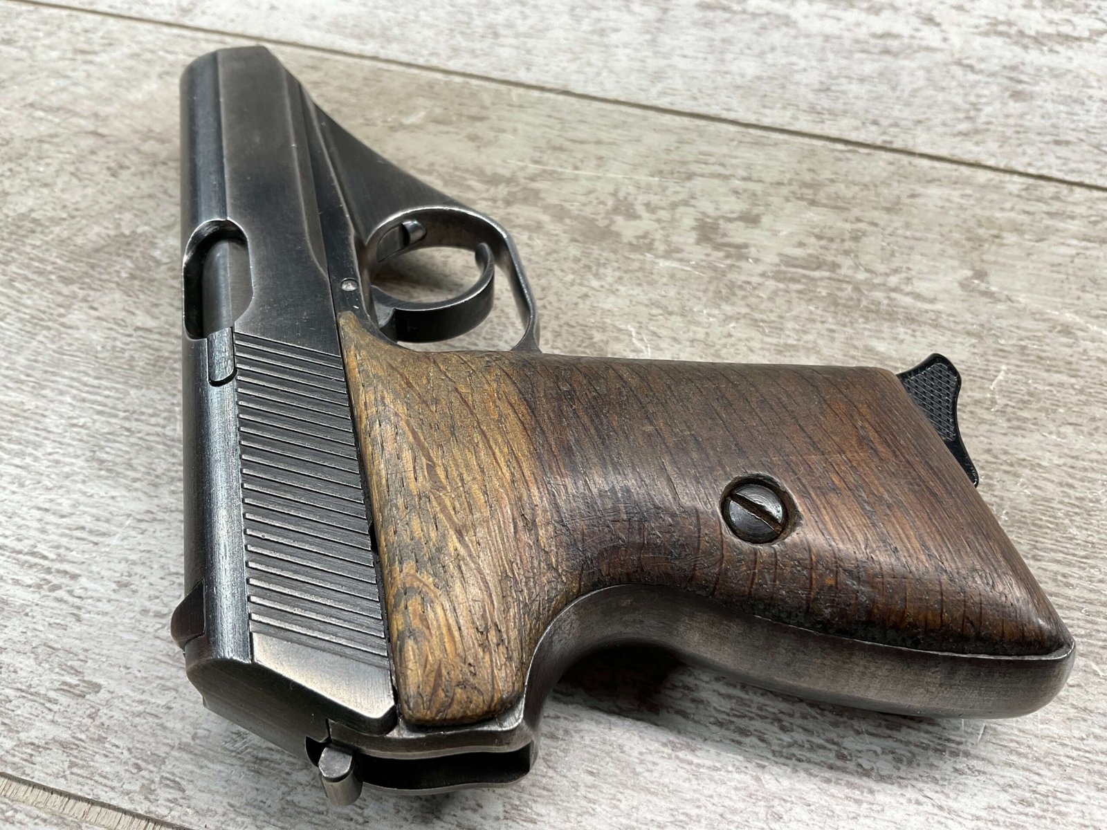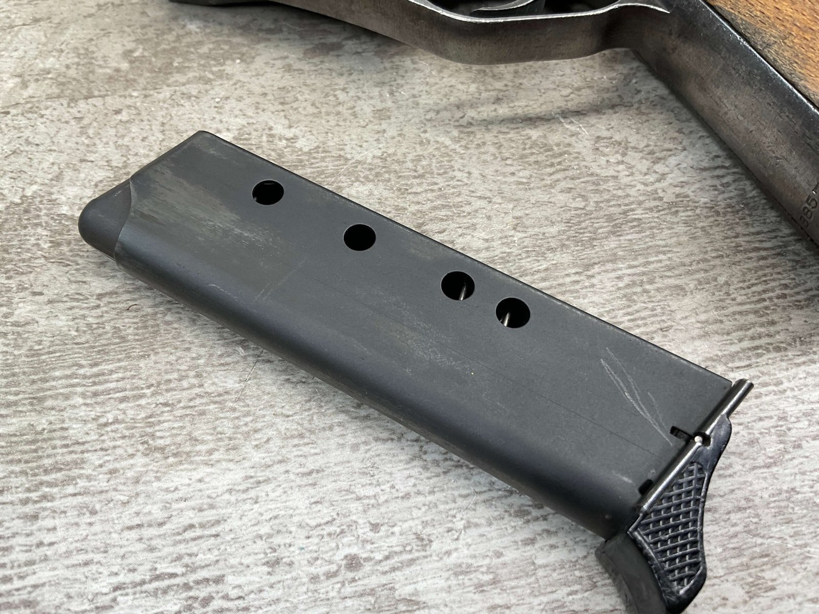 MAUSER HSc 7.65MM NAZI POLICE MARKED SEMI AUTO PISTOL #885777, 2ND VARIATION, NAZI POLICE MARKED “EAGLE/L”, ORIGINAL BLUE THAT HAS TURNED GREY PATINA, GOOD SMOOTH WOOD GRIPS, EXC BORE & RIFLING, POST WAR PARKERIZED PLASTIC BASE MAGAZINE, NICE NAZI POLICE MARKED MAUSER!