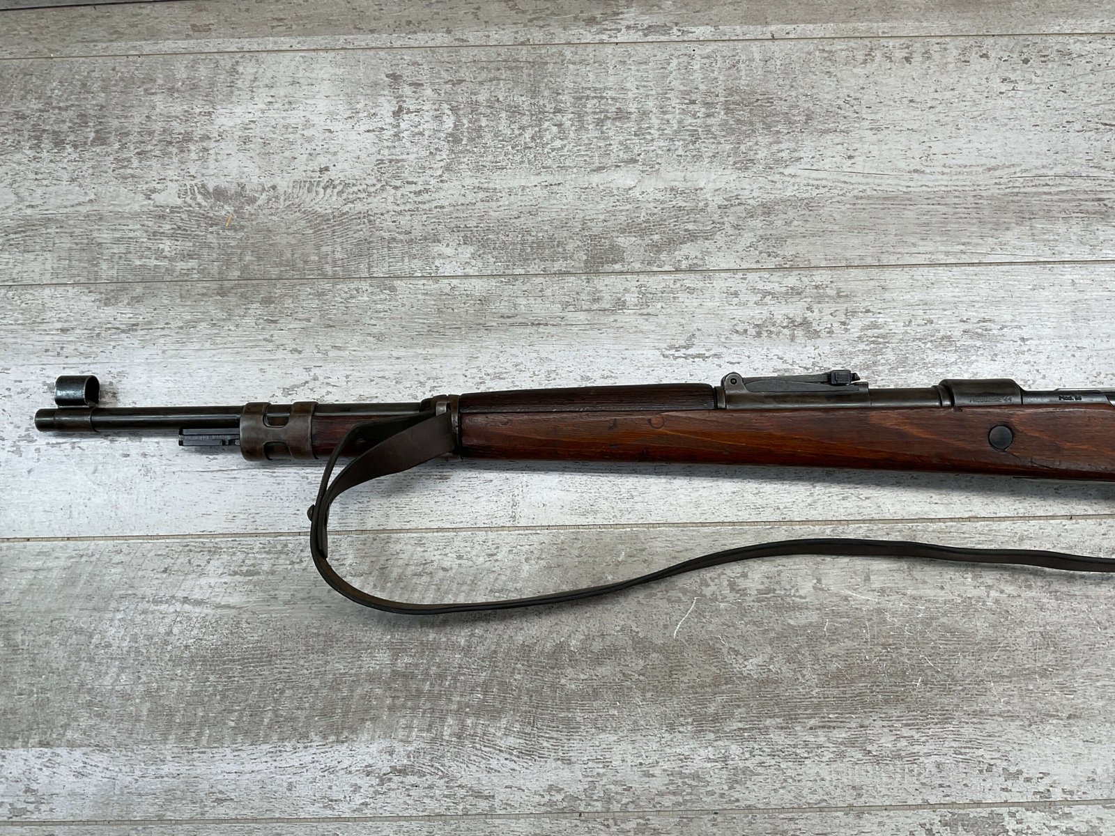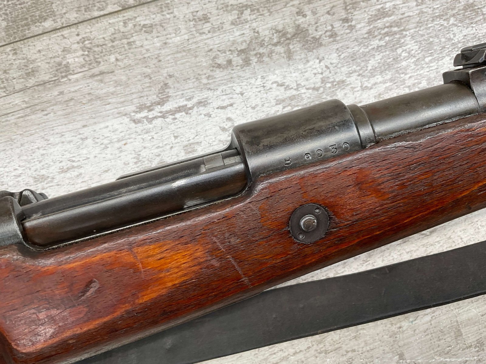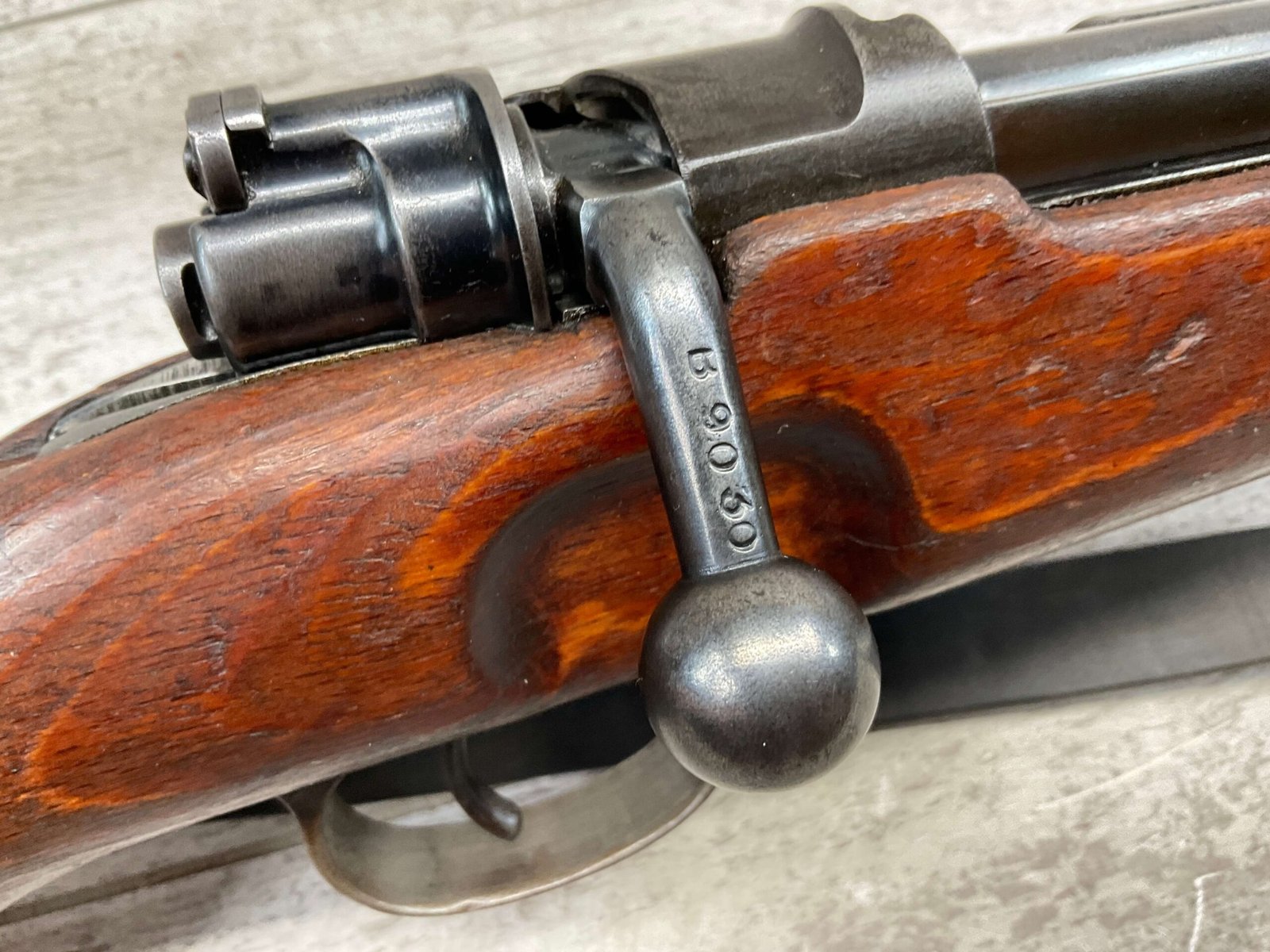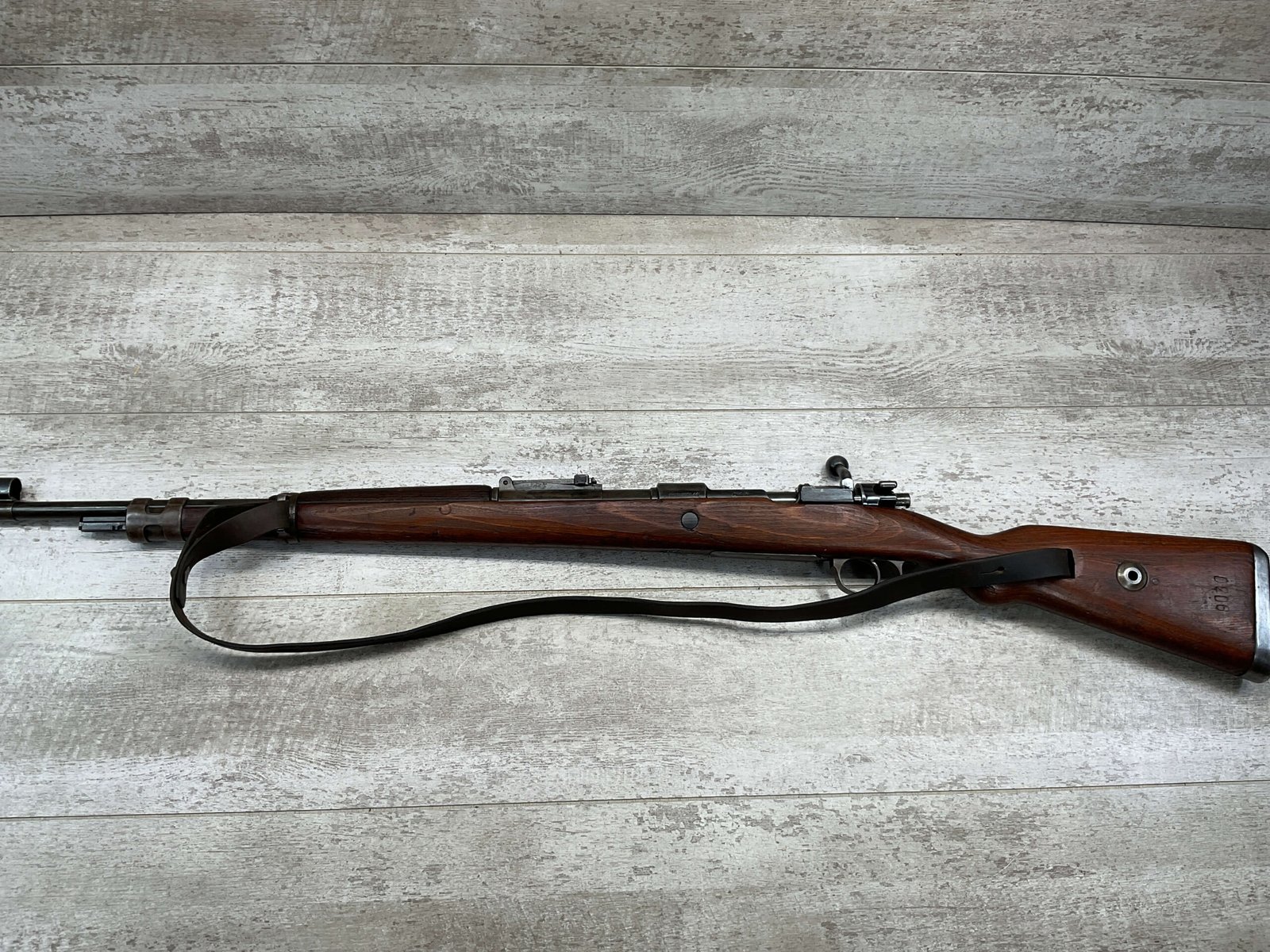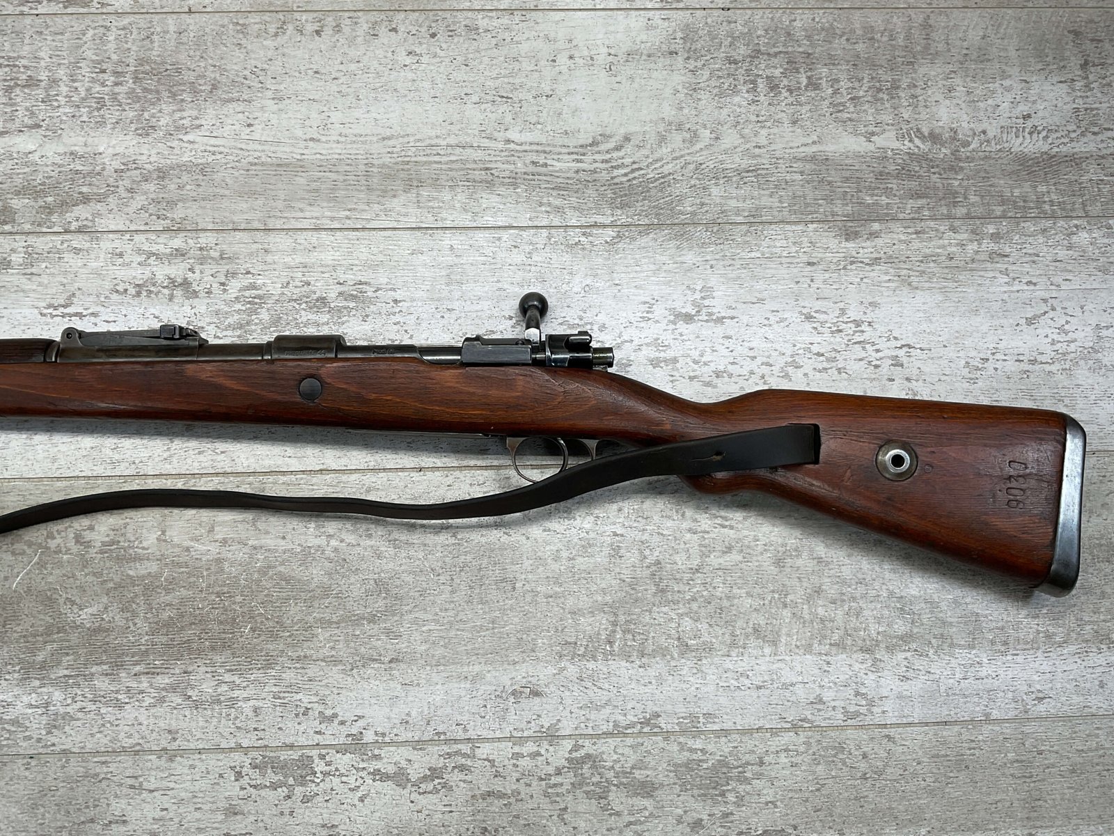 MAUSER K98 PREDUZECE 44 BOLT ACTION RIFLE #B9030, ALL MATCHING, BLUE TURNING BROWN PATINA, SMOOTH ACTION, 24″ STEPPED BARREL, VG BRIGHT BORE & RIFLING W/LIGHT FROSTING IN GROOVES, 8X57MM, NO IMPORT MARKS, NAZI E/359 ON SIGHT, WaA856 ON BARREL, EXC LAMINATED STOCK W/CUP BUTTPLATE & LEATHER SLING, FIRING PIN TAKE DOWN HOLE IN STOCK, NO CREST ON RECEIVER, SMOOTH ACTION!!