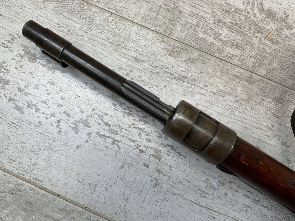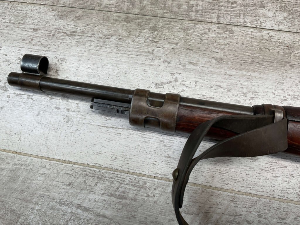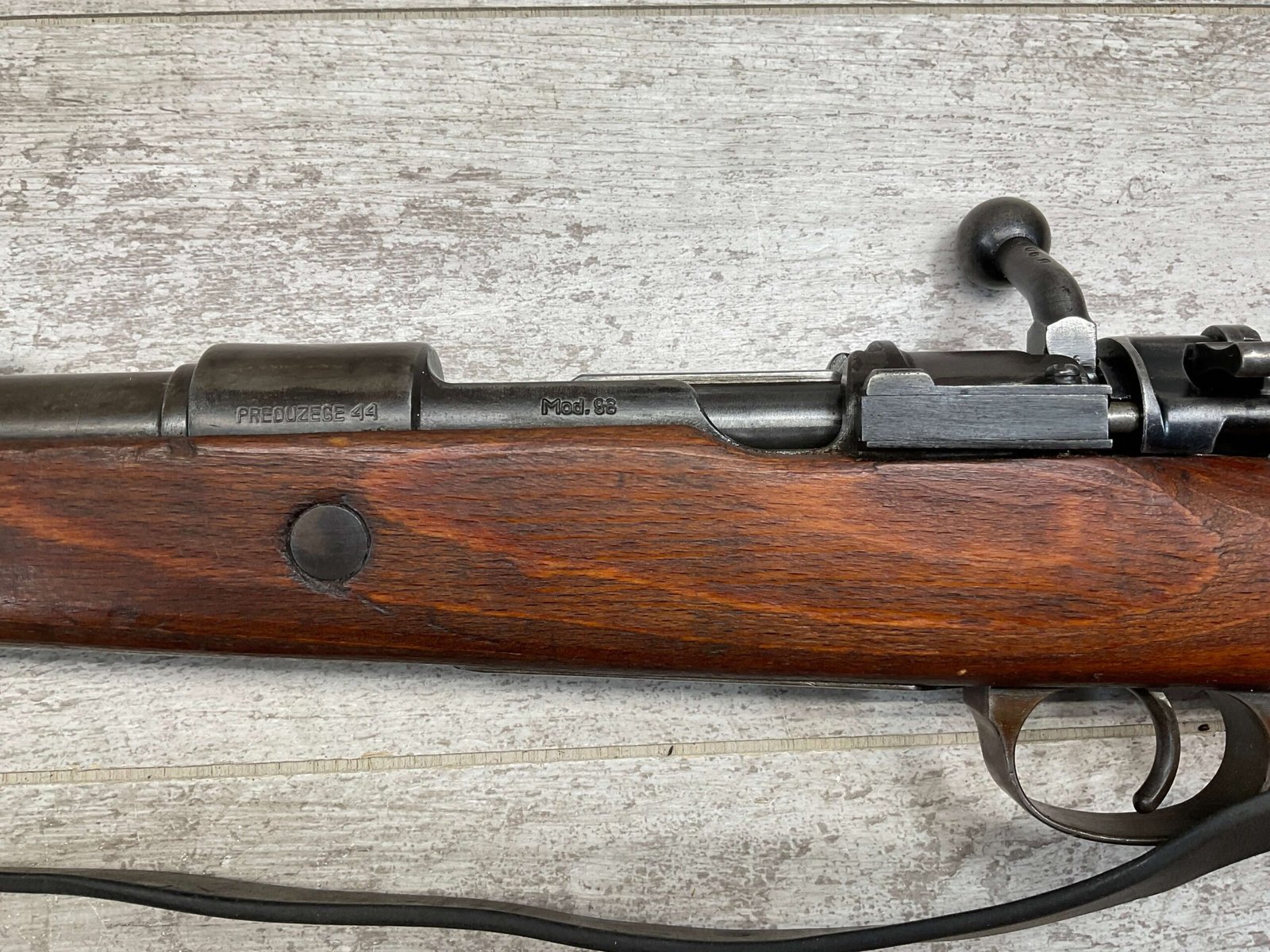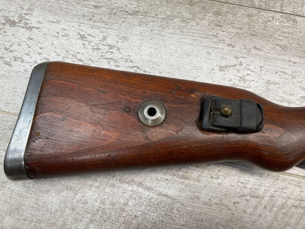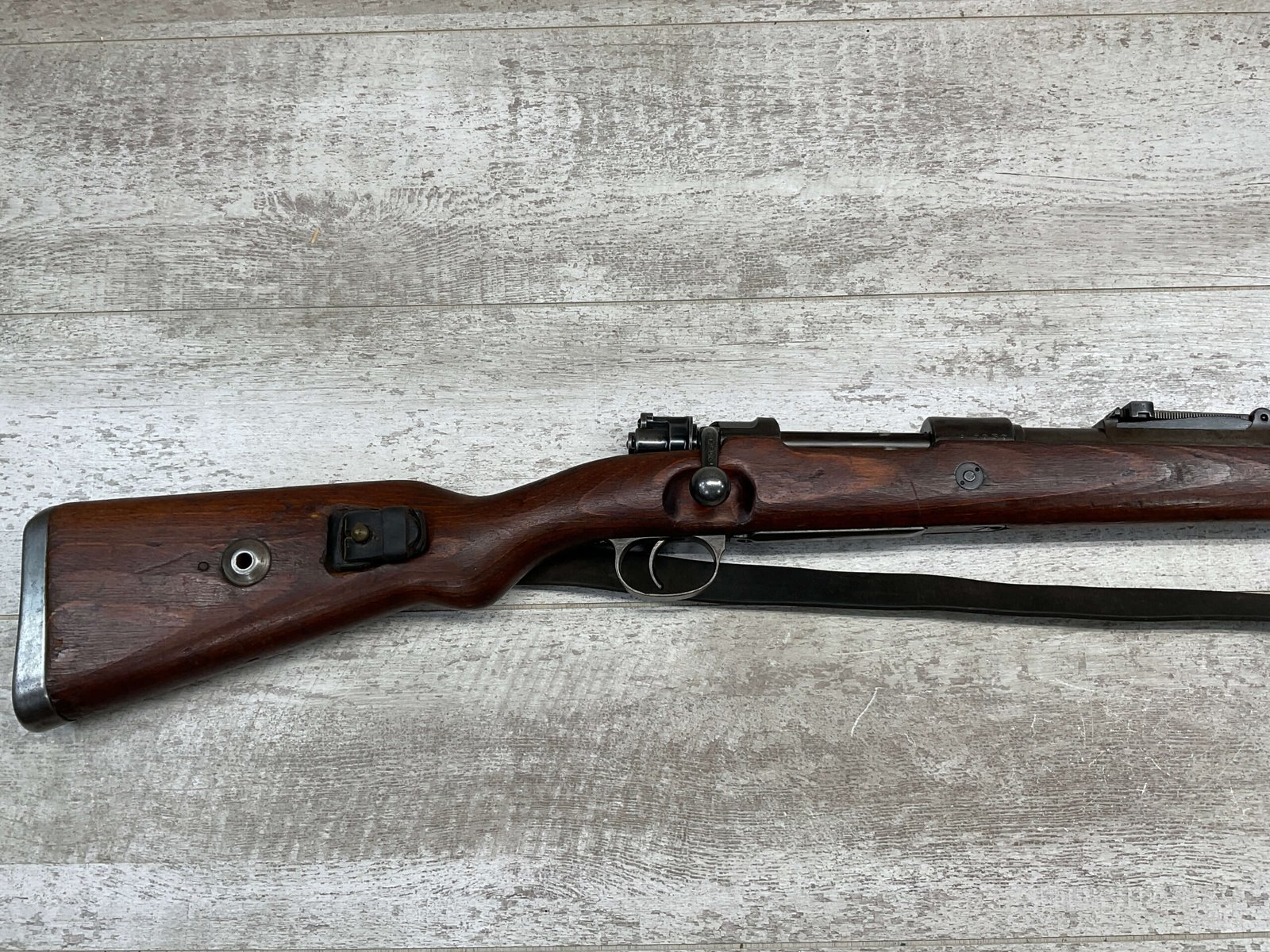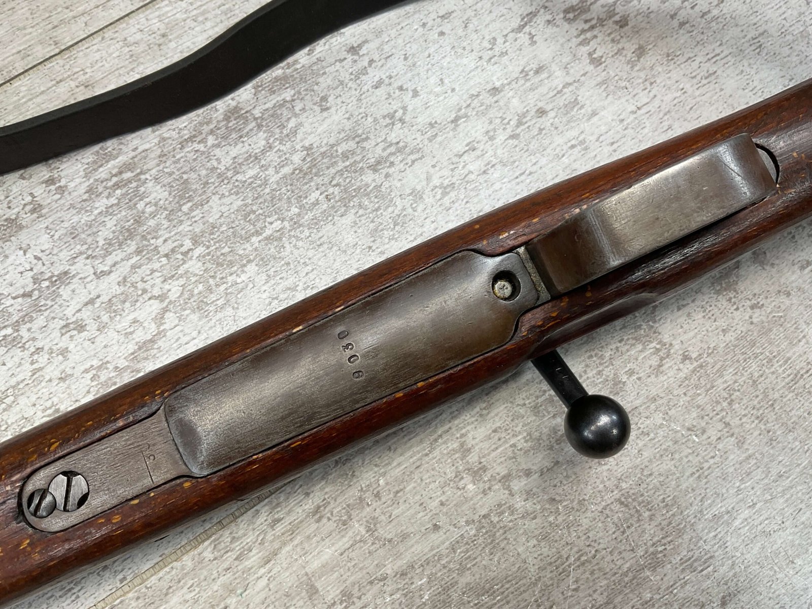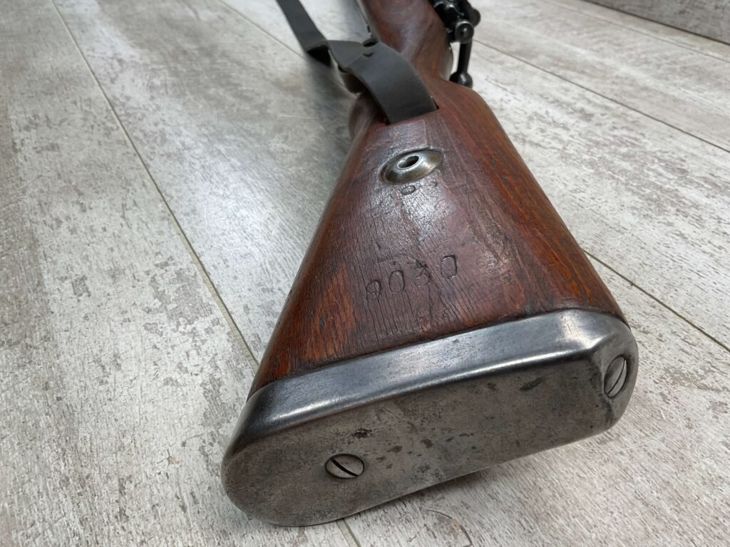 MAUSER K98 PREDUZECE 44 BOLT ACTION RIFLE #B9030, ALL MATCHING, BLUE TURNING BROWN PATINA, SMOOTH ACTION, 24″ STEPPED BARREL, VG BRIGHT BORE & RIFLING W/LIGHT FROSTING IN GROOVES, 8X57MM, NO IMPORT MARKS, NAZI E/359 ON SIGHT, WaA856 ON BARREL, EXC LAMINATED STOCK W/CUP BUTTPLATE & LEATHER SLING, FIRING PIN TAKE DOWN HOLE IN STOCK, NO CREST ON RECEIVER, SMOOTH ACTION!!