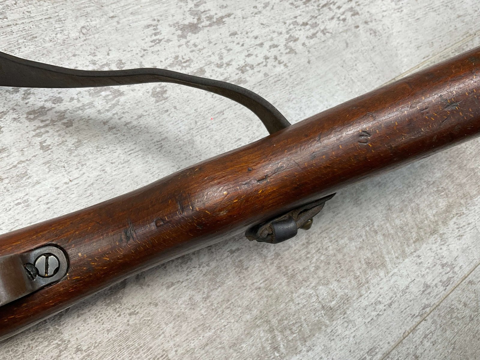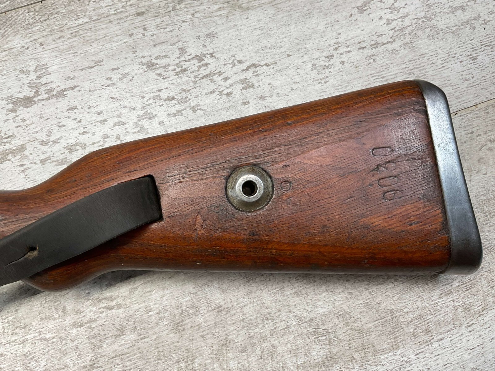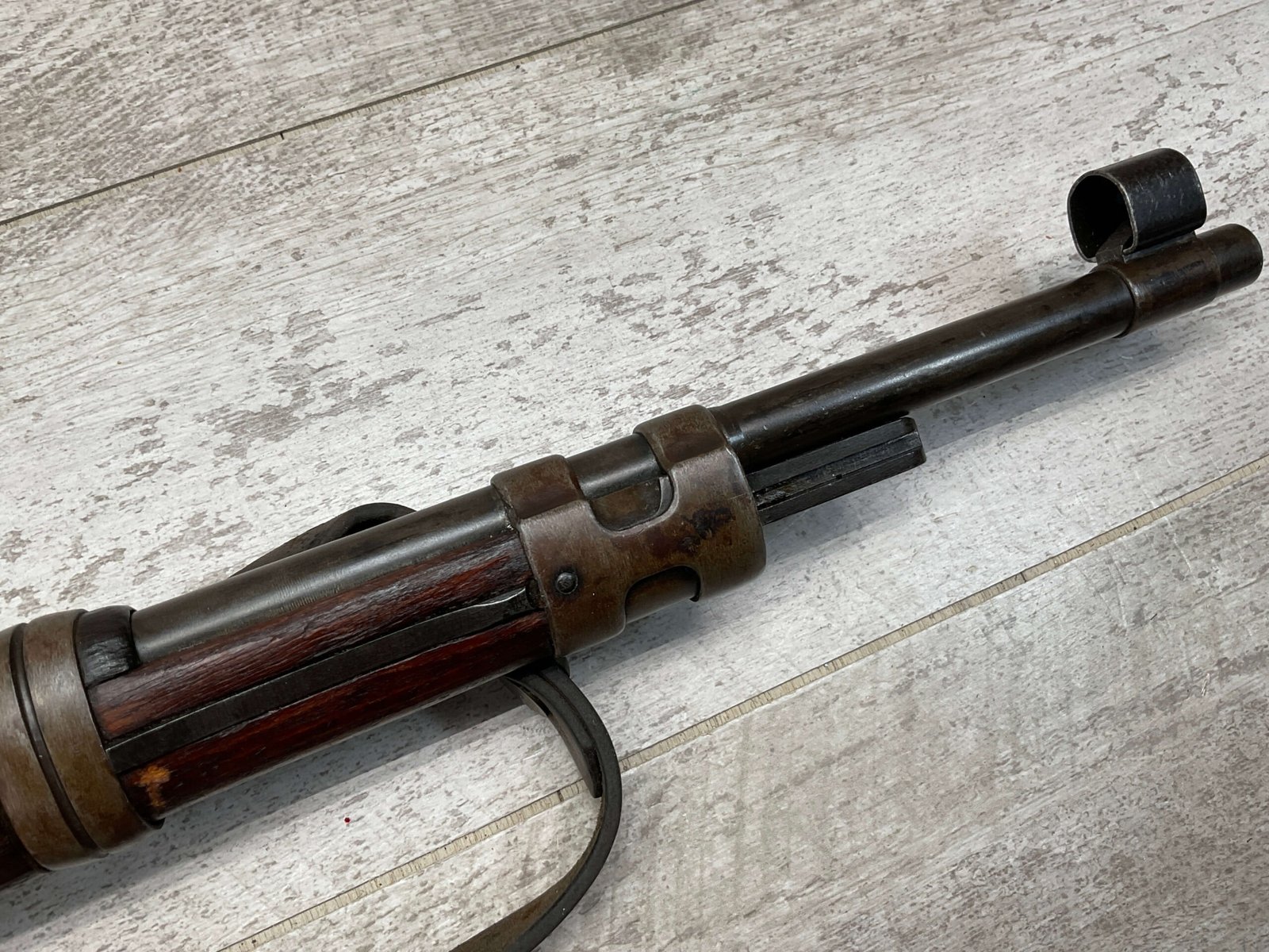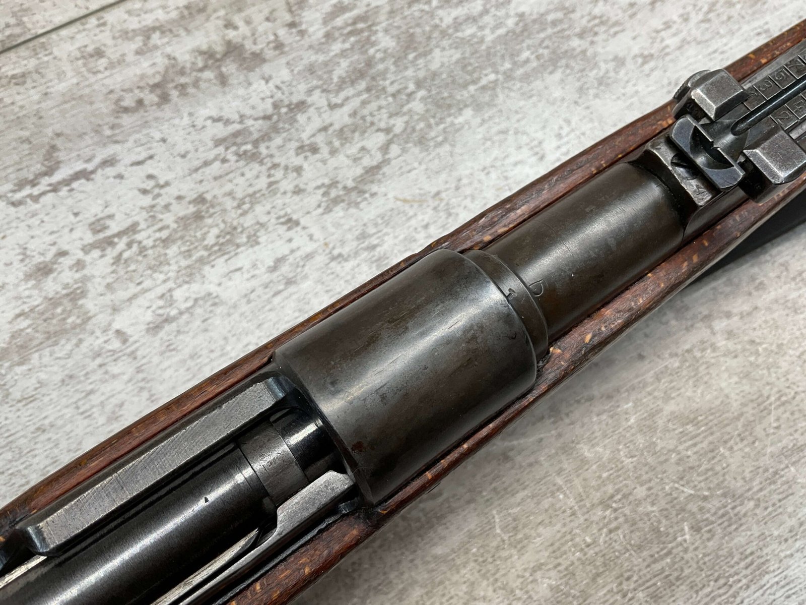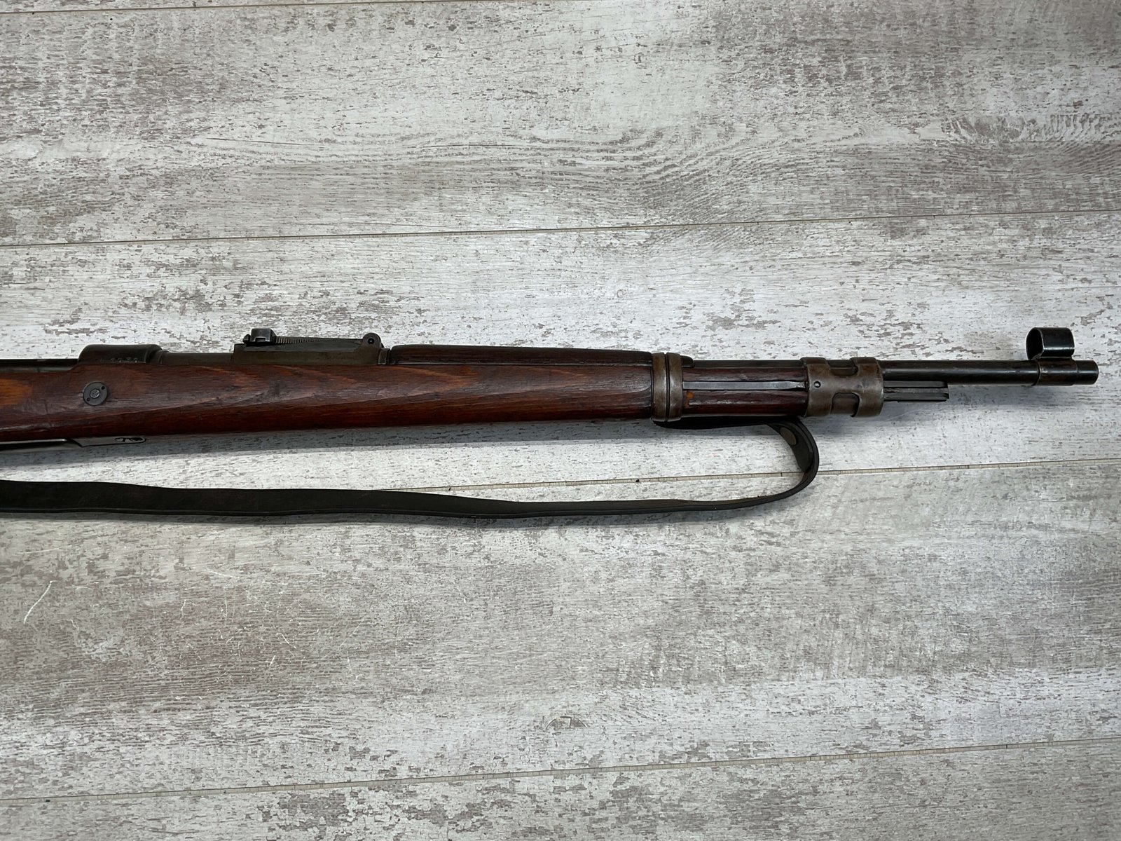 MAUSER K98 PREDUZECE 44 BOLT ACTION RIFLE #B9030, ALL MATCHING, BLUE TURNING BROWN PATINA, SMOOTH ACTION, 24″ STEPPED BARREL, VG BRIGHT BORE & RIFLING W/LIGHT FROSTING IN GROOVES, 8X57MM, NO IMPORT MARKS, NAZI E/359 ON SIGHT, WaA856 ON BARREL, EXC LAMINATED STOCK W/CUP BUTTPLATE & LEATHER SLING, FIRING PIN TAKE DOWN HOLE IN STOCK, NO CREST ON RECEIVER, SMOOTH ACTION!!