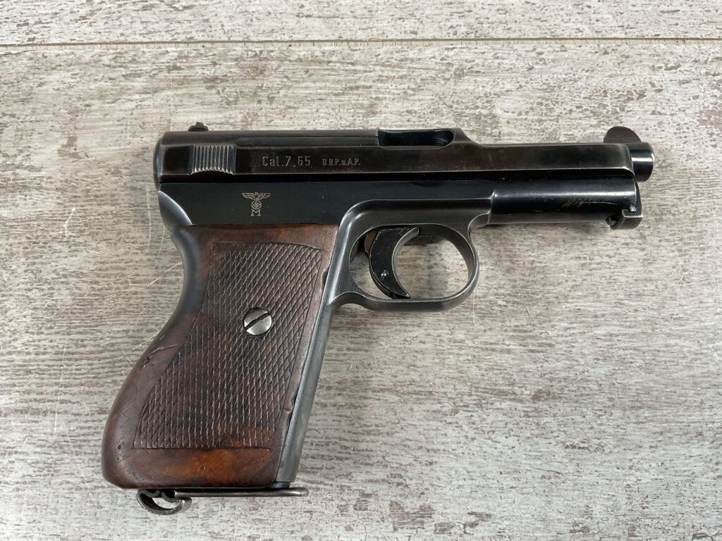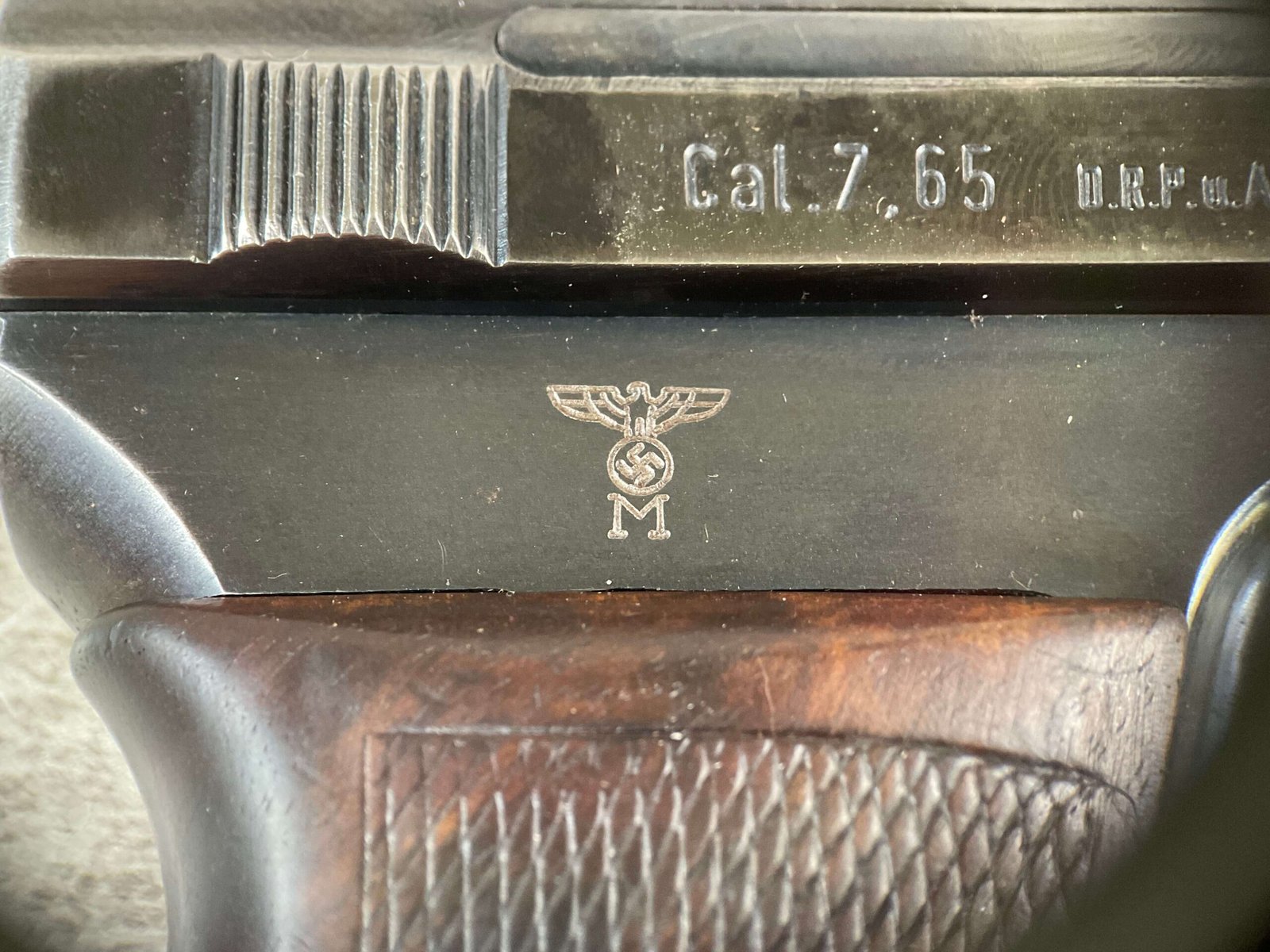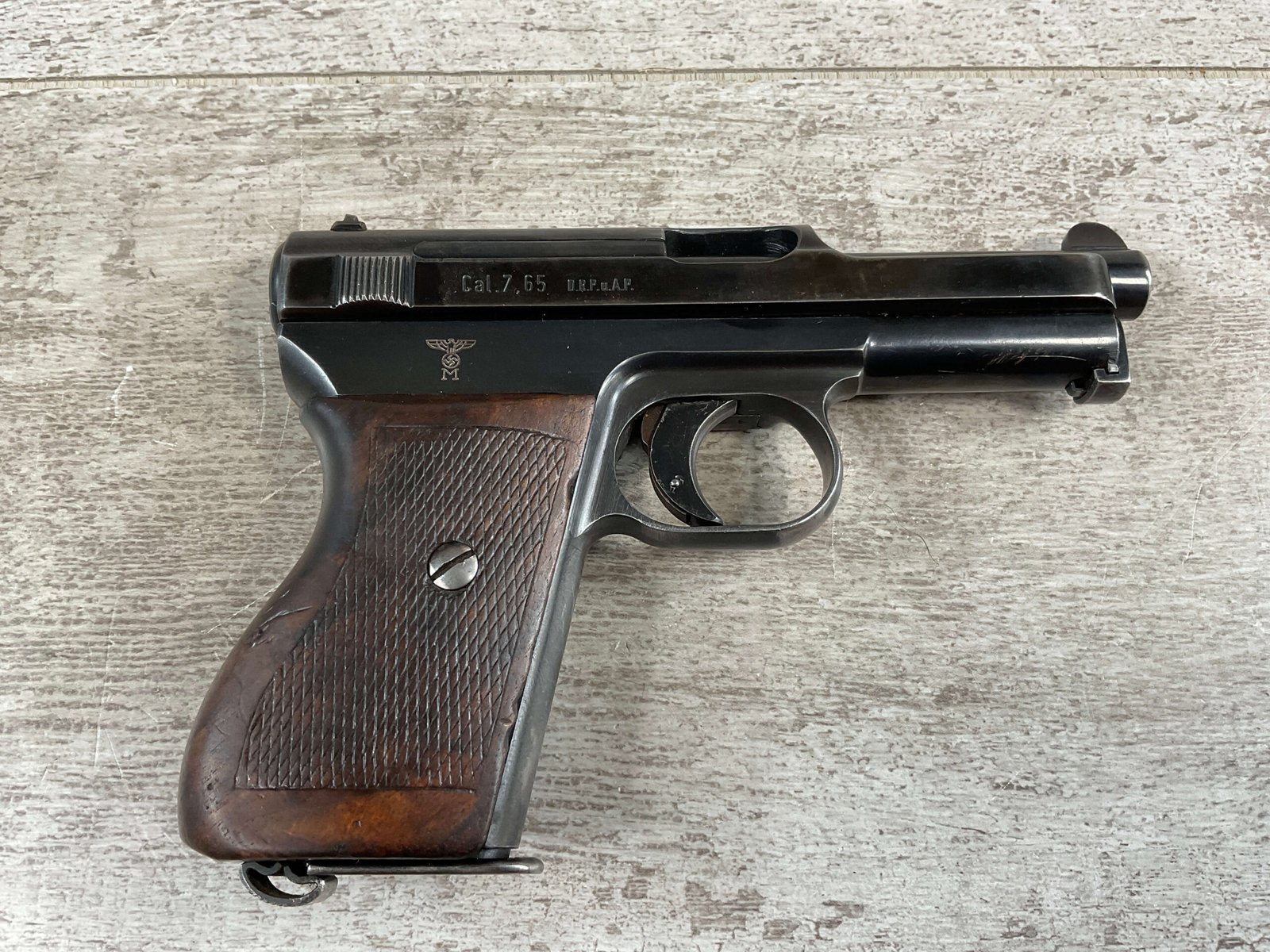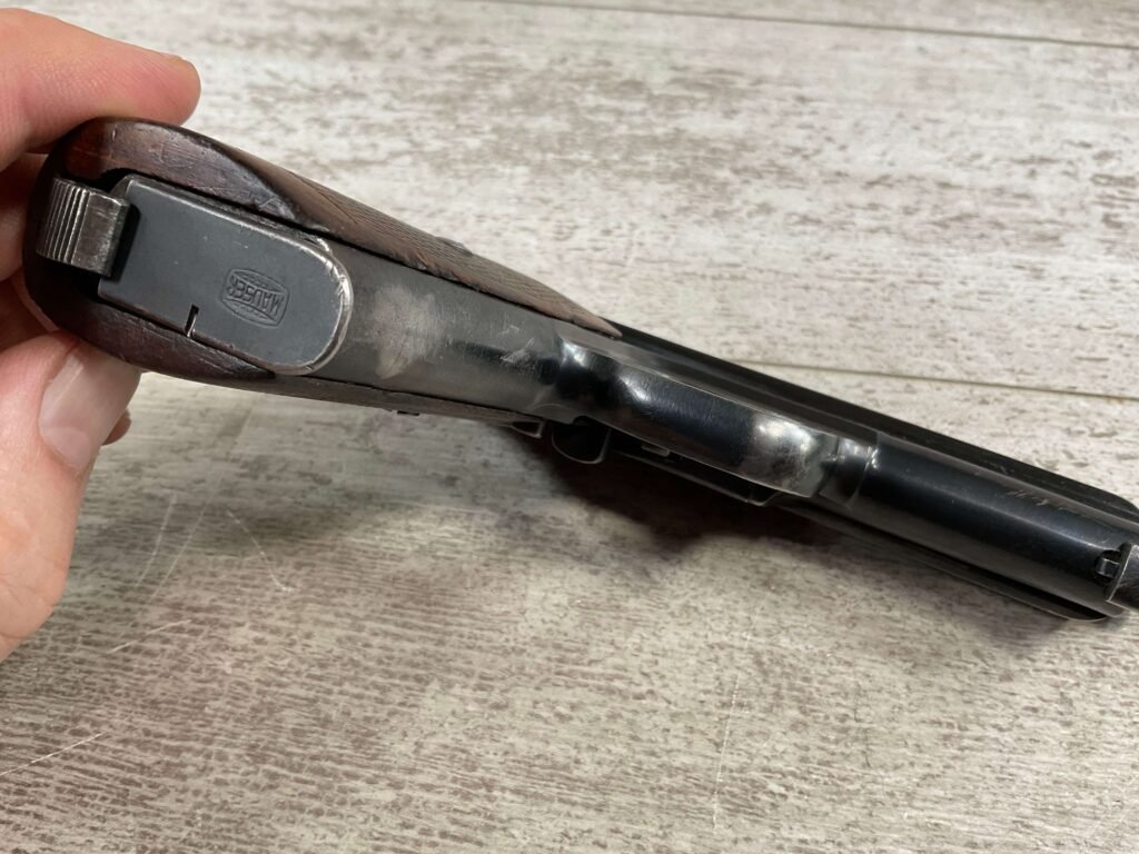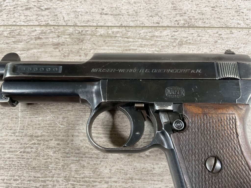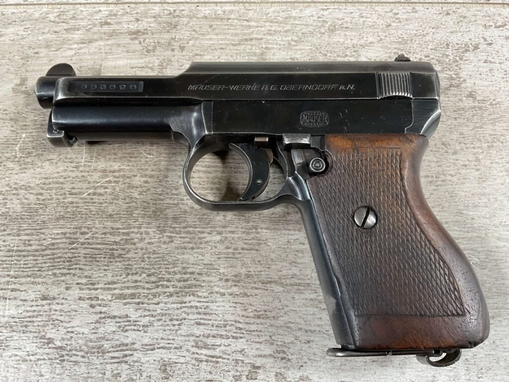 MAUSER MODEL 1934 NAZI EAGLE/M KRIEGSMARINE MARKED GERMAN NAVY PISTOL #553696, 96+% BLUE, “EAGLE/M” RIGHT SIDE OF FRAME, “CAL. 7.65 D.R.P.U.A.P.” RIGHT SIDE OF SLIDE, “553696 MAUSER-WERKE A.G. OBERNDORF A.N.” LEFT SIDE OF SLIDE, “MAUSER LOGO” LEFT SIDE OF FRAME, ONE EXC MAGAZINE, MAUSER LOGO ON BOTTOM OF MAGAZINE, EXC CHECKERED WOOD GRIPS W/LIGHT WEAR & NICKS, ALL MATCHING, EXC UNMARKED BROWN LEATHER HOLSTER, EXC BRIGHT BORE & RIFLING, 95+% OVERALL, NAVY PISTOLS ARE EXTREMELY DIFFICULT TO FIND IN THIS CONDITION!!