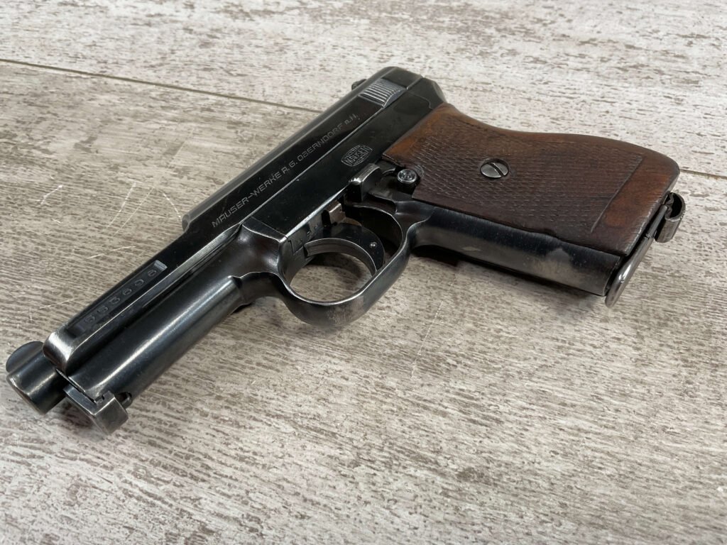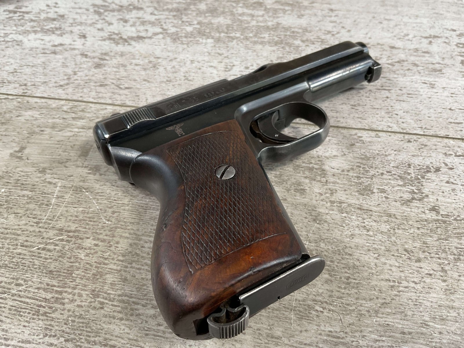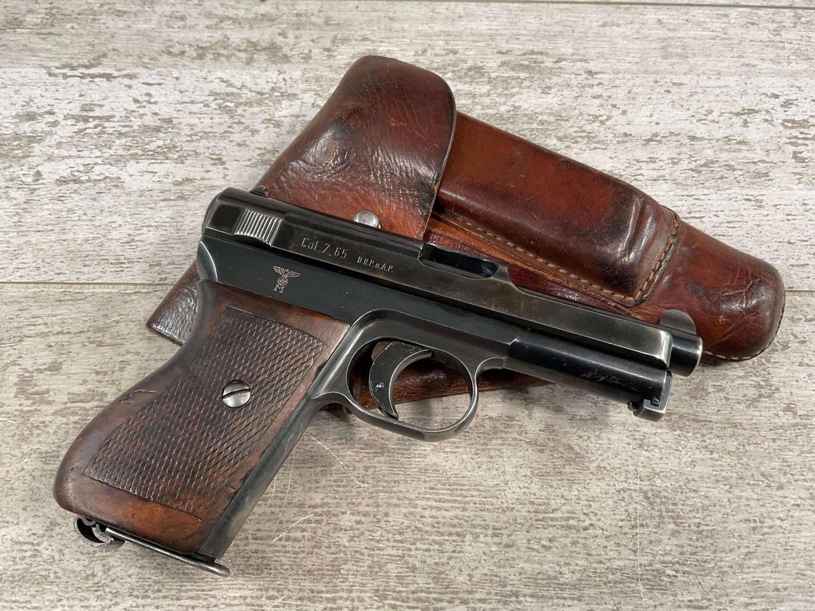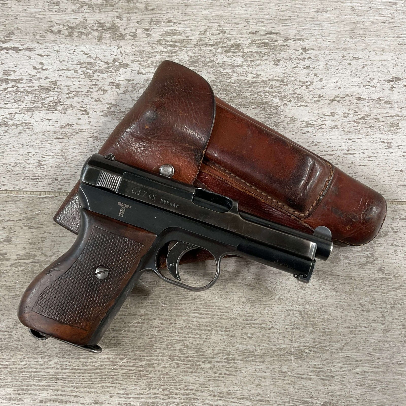 MAUSER MODEL 1934 NAZI EAGLE/M KRIEGSMARINE MARKED GERMAN NAVY PISTOL #553696, 96+% BLUE, “EAGLE/M” RIGHT SIDE OF FRAME, “CAL. 7.65 D.R.P.U.A.P.” RIGHT SIDE OF SLIDE, “553696 MAUSER-WERKE A.G. OBERNDORF A.N.” LEFT SIDE OF SLIDE, “MAUSER LOGO” LEFT SIDE OF FRAME, ONE EXC MAGAZINE, MAUSER LOGO ON BOTTOM OF MAGAZINE, EXC CHECKERED WOOD GRIPS W/LIGHT WEAR & NICKS, ALL MATCHING, EXC UNMARKED BROWN LEATHER HOLSTER, EXC BRIGHT BORE & RIFLING, 95+% OVERALL, NAVY PISTOLS ARE EXTREMELY DIFFICULT TO FIND IN THIS CONDITION!!