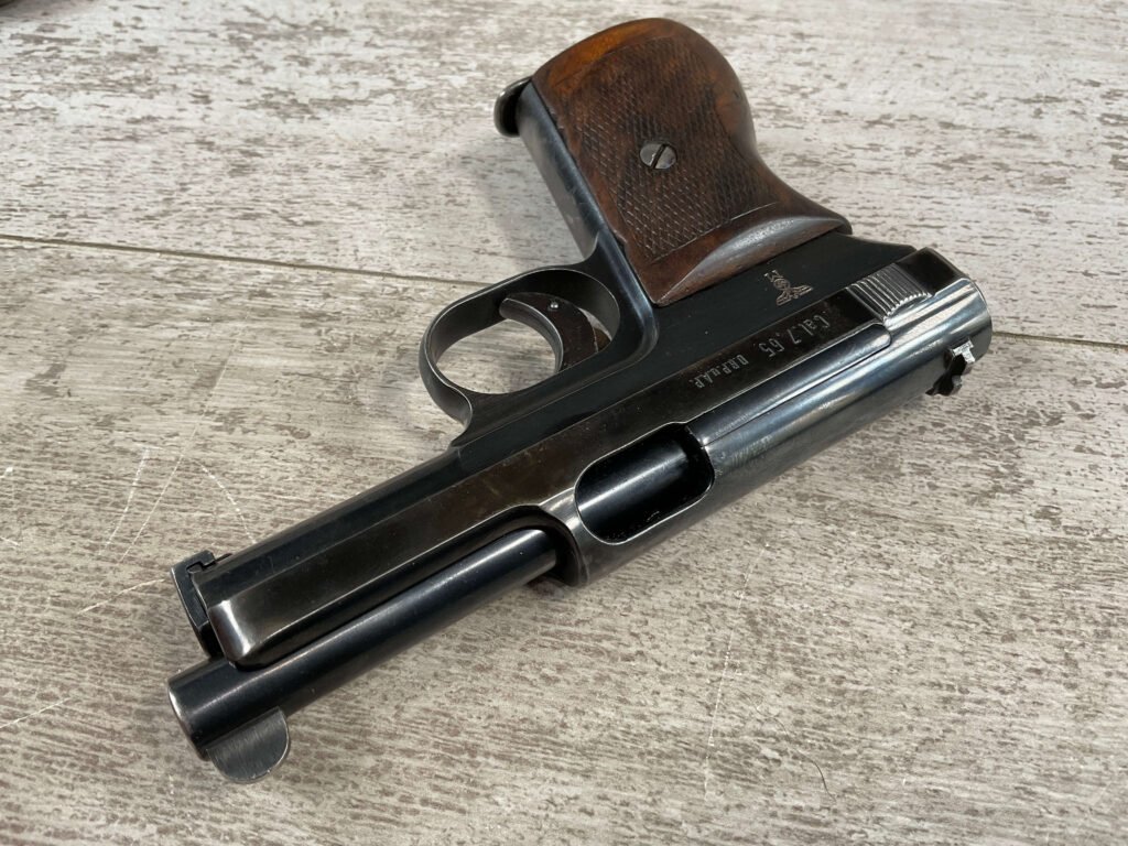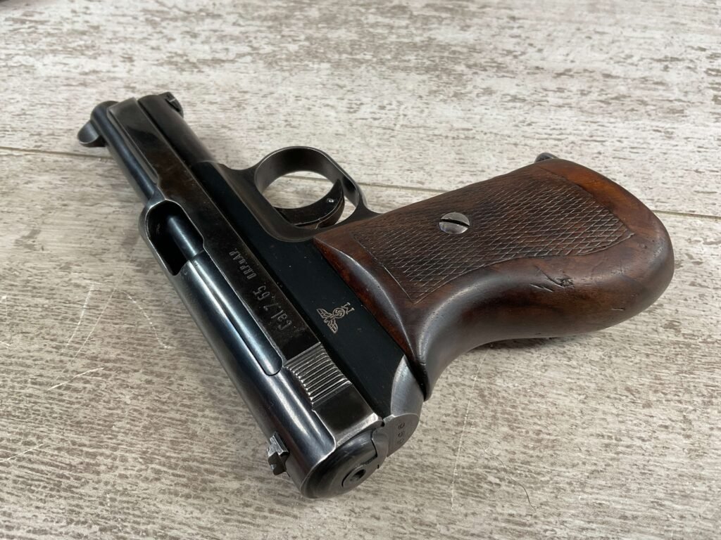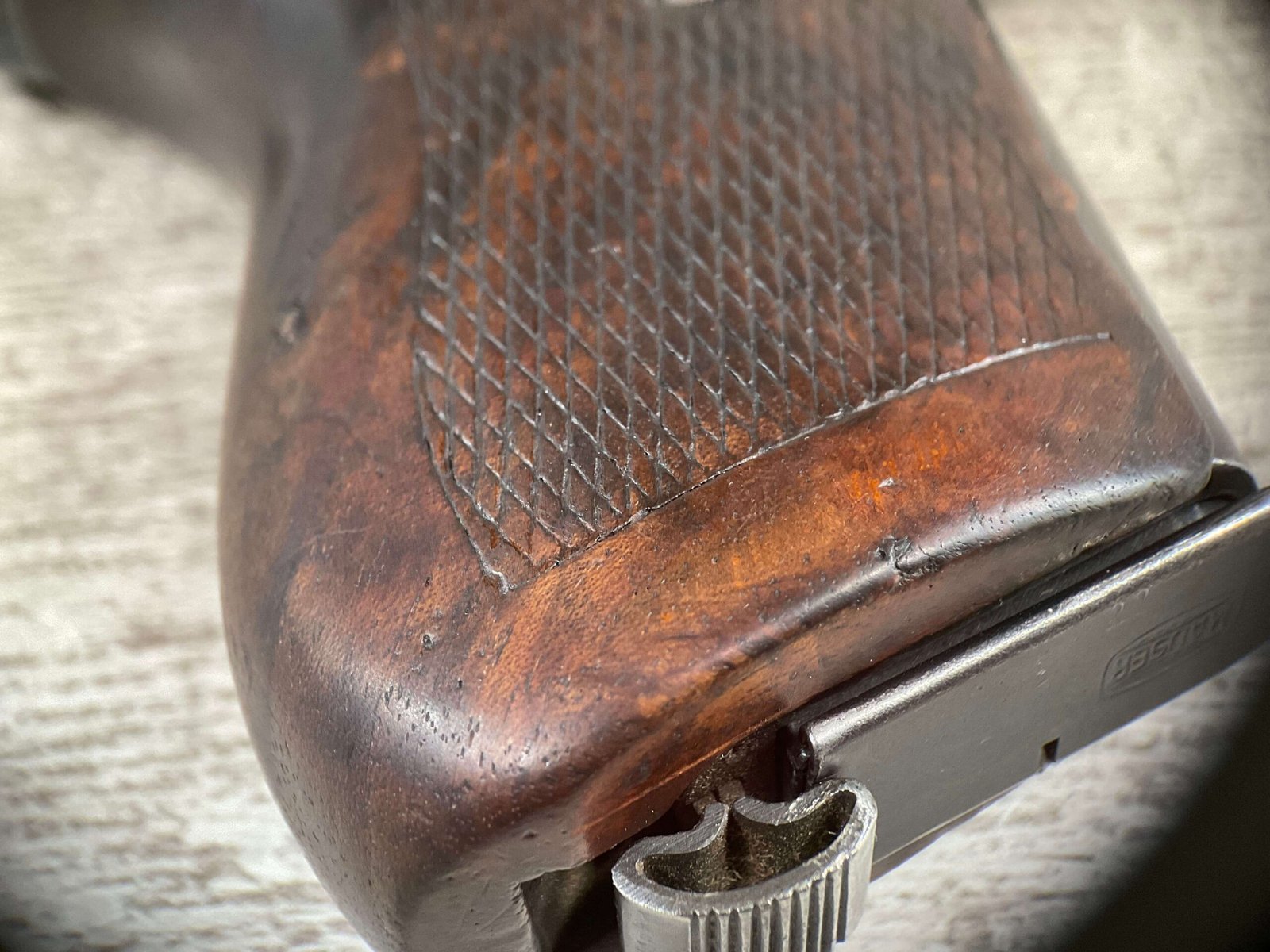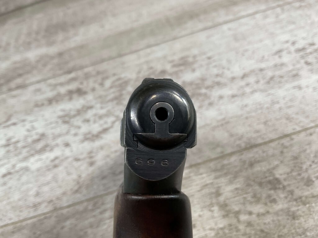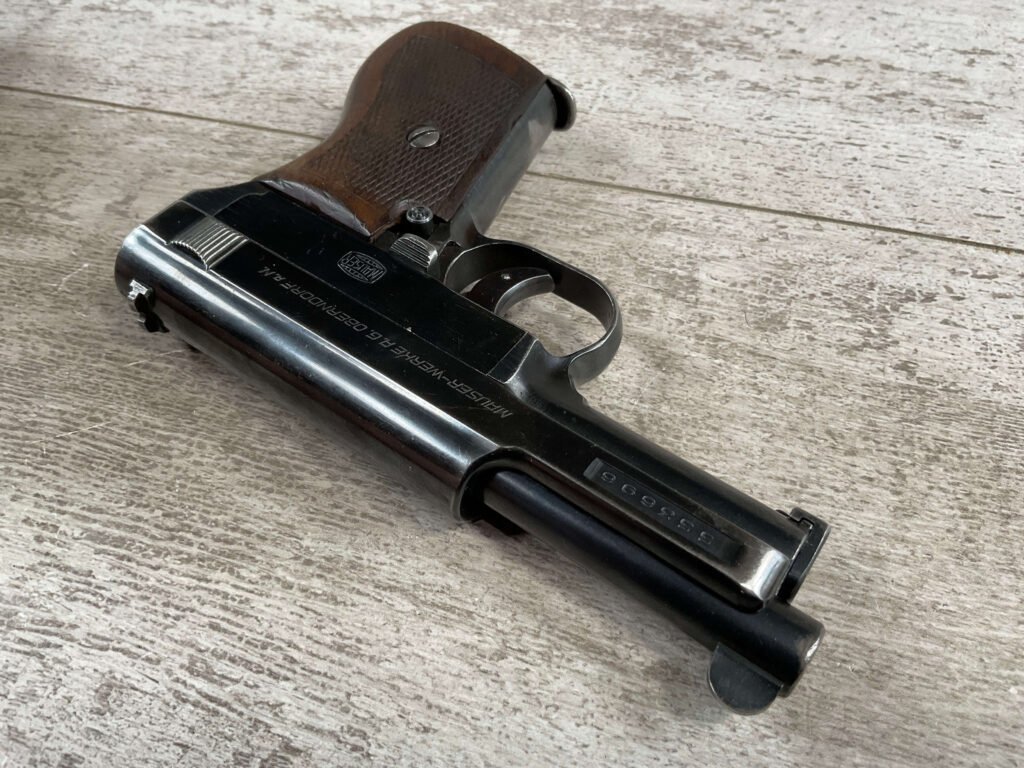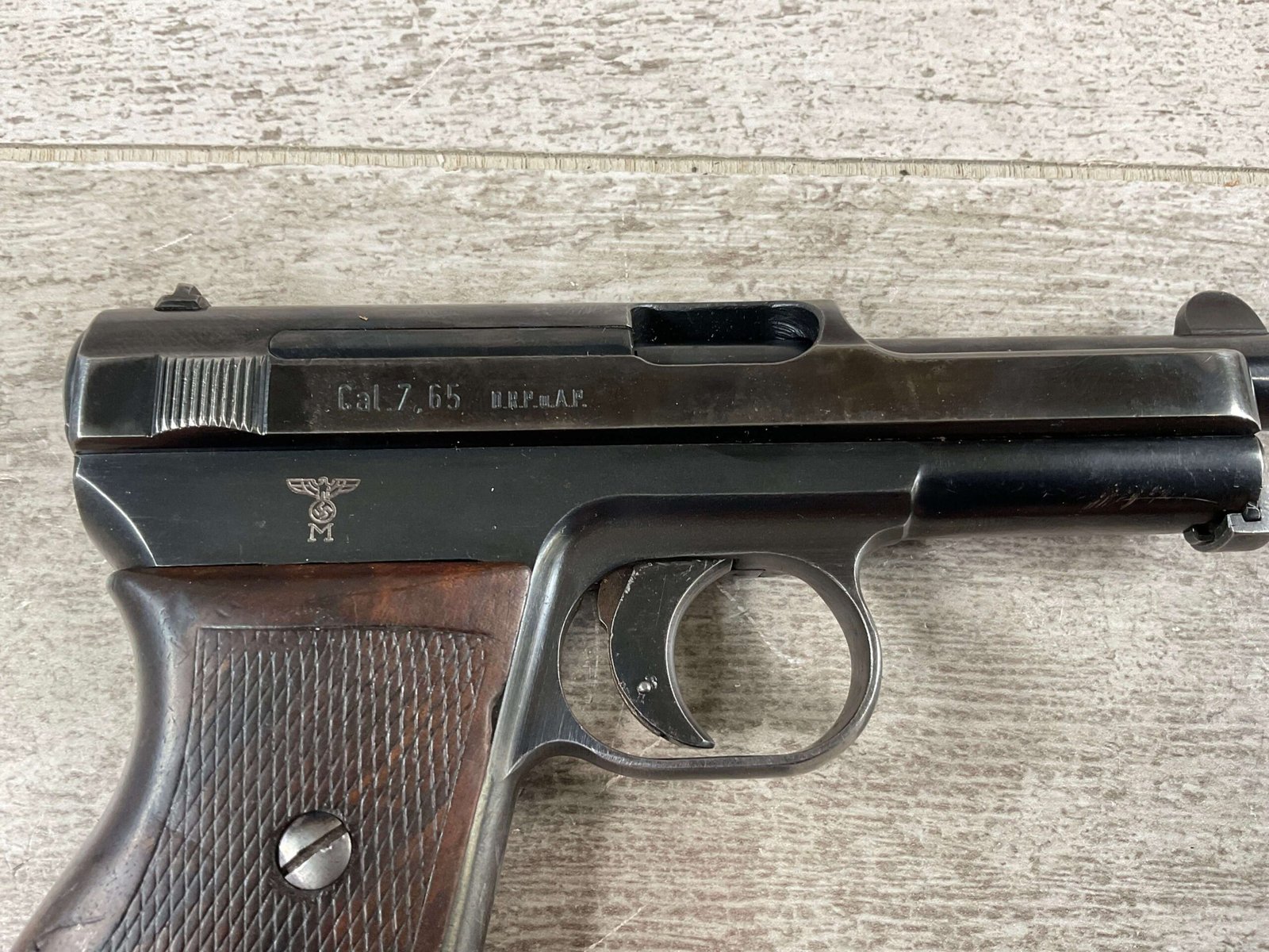 MAUSER MODEL 1934 NAZI EAGLE/M KRIEGSMARINE MARKED GERMAN NAVY PISTOL #553696, 96+% BLUE, “EAGLE/M” RIGHT SIDE OF FRAME, “CAL. 7.65 D.R.P.U.A.P.” RIGHT SIDE OF SLIDE, “553696 MAUSER-WERKE A.G. OBERNDORF A.N.” LEFT SIDE OF SLIDE, “MAUSER LOGO” LEFT SIDE OF FRAME, ONE EXC MAGAZINE, MAUSER LOGO ON BOTTOM OF MAGAZINE, EXC CHECKERED WOOD GRIPS W/LIGHT WEAR & NICKS, ALL MATCHING, EXC UNMARKED BROWN LEATHER HOLSTER, EXC BRIGHT BORE & RIFLING, 95+% OVERALL, NAVY PISTOLS ARE EXTREMELY DIFFICULT TO FIND IN THIS CONDITION!!