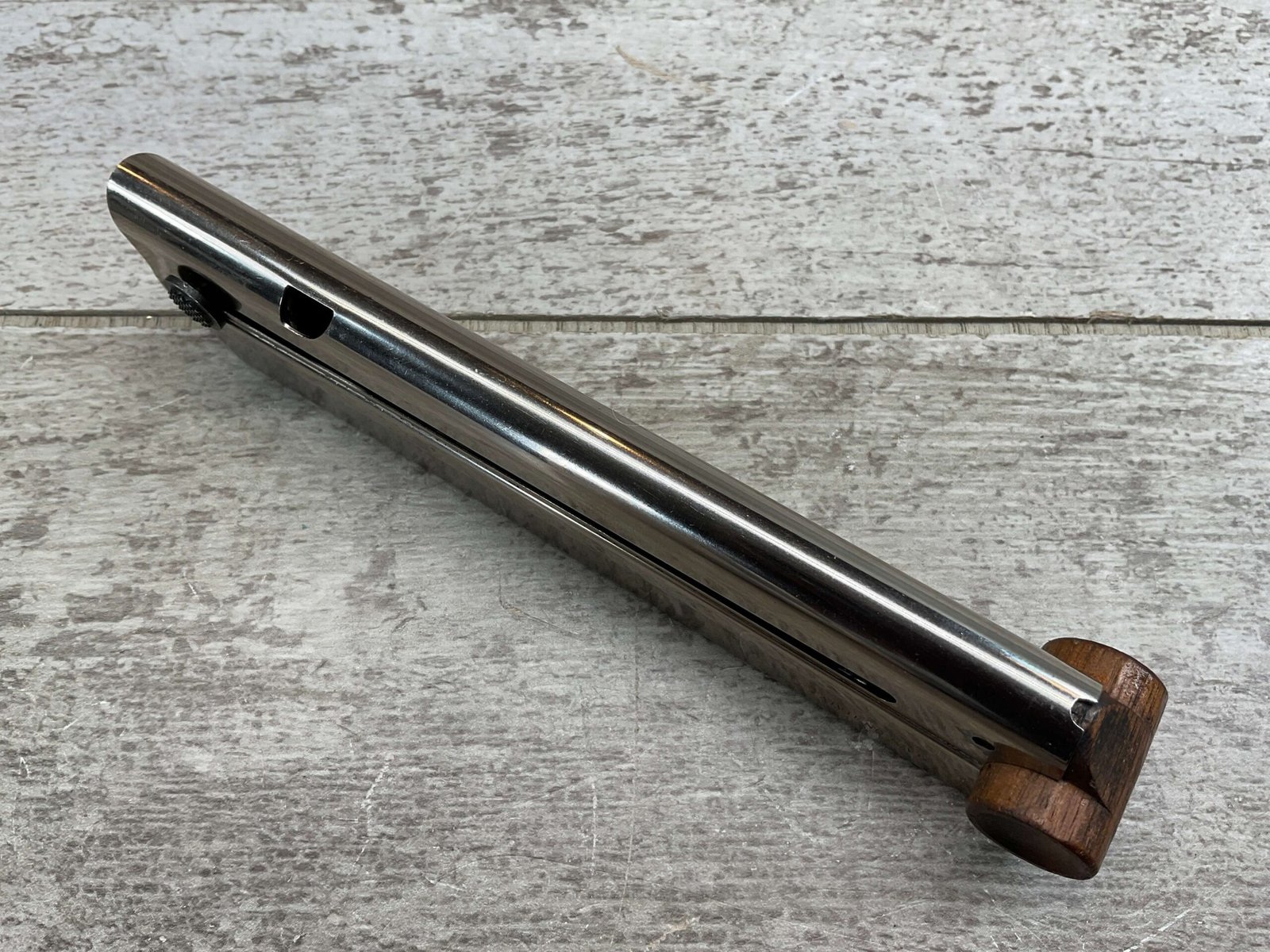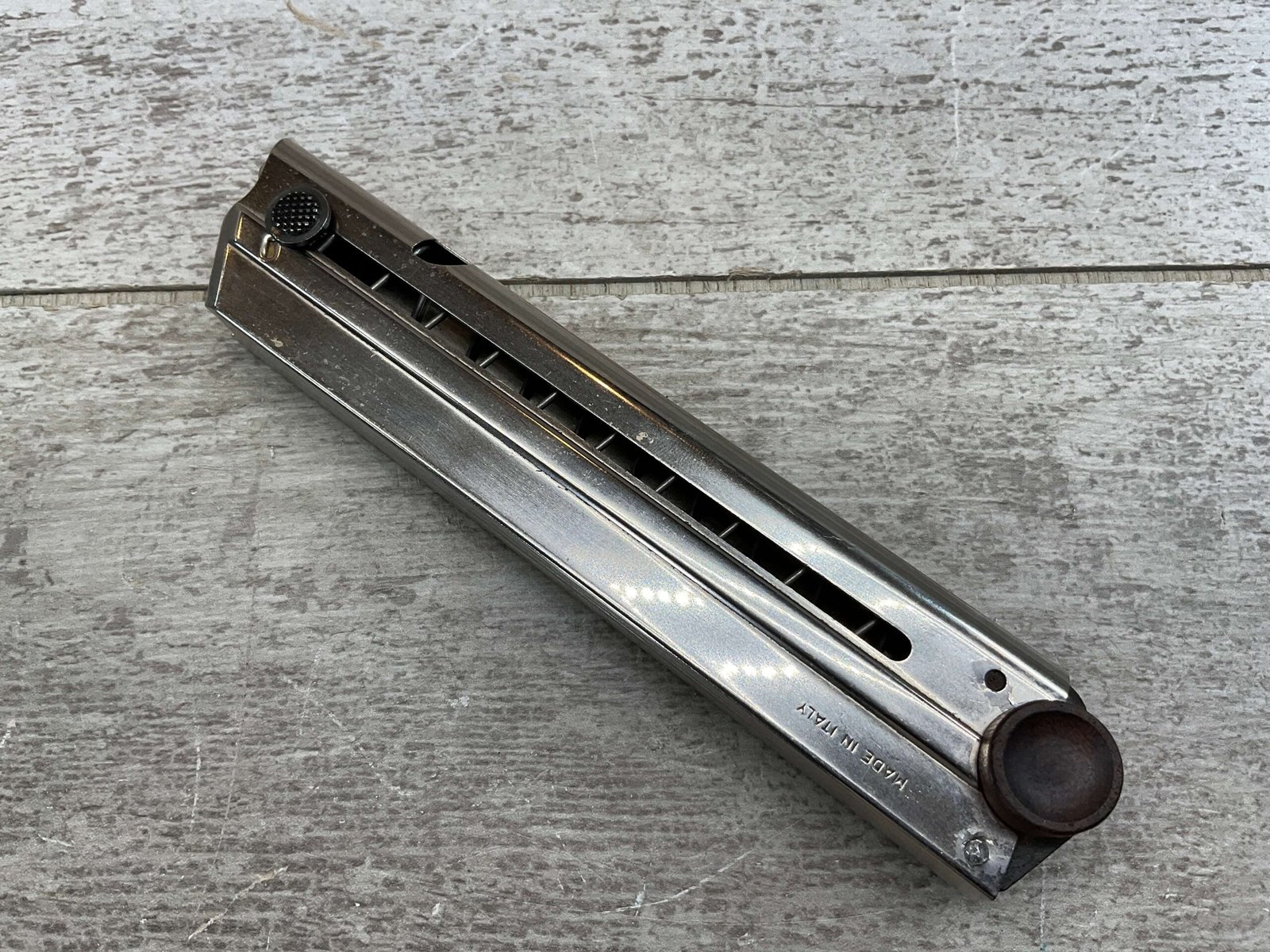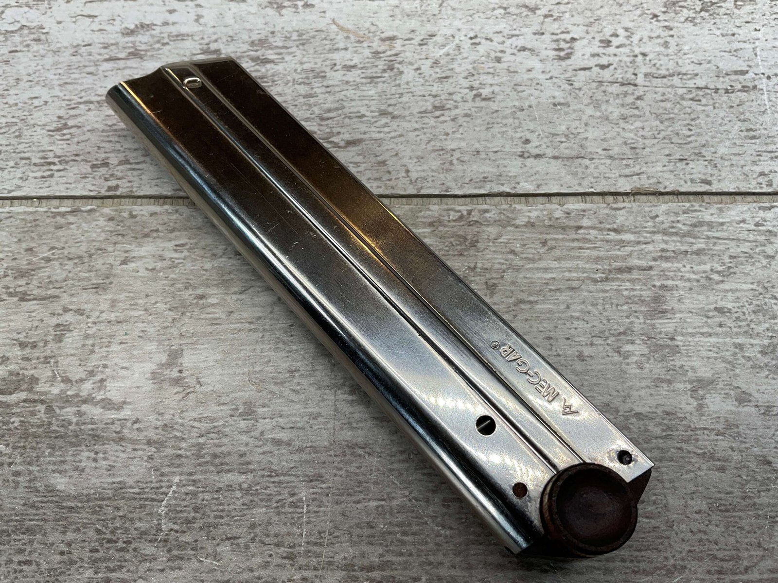MEC-GAR MAGAZINE FOR P08 LUGGER. NICKEL PLATED TUBE WITH WOOD BASE. LIKE NEW.