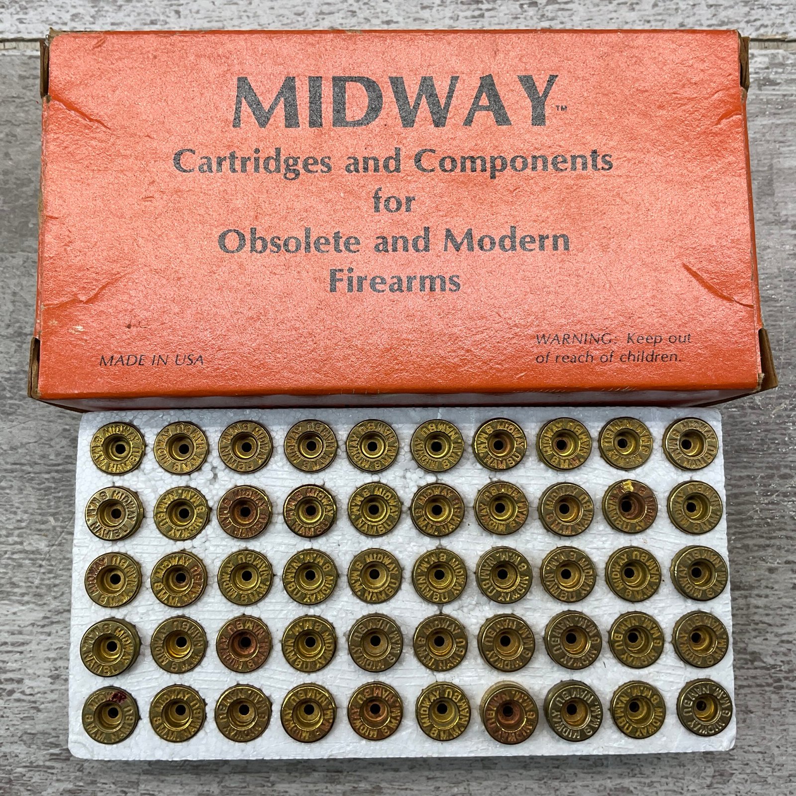 MIDWAY ARMS 8MM NAMBU AMMO SHELLS, FULL BOX, VINTAGE, BOX IS IN VG-EXC CONDITION AND FUNCTIONS WELL.
