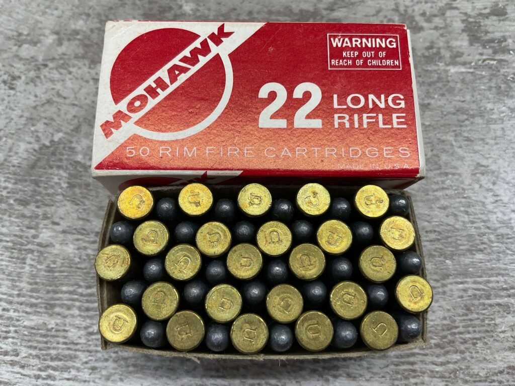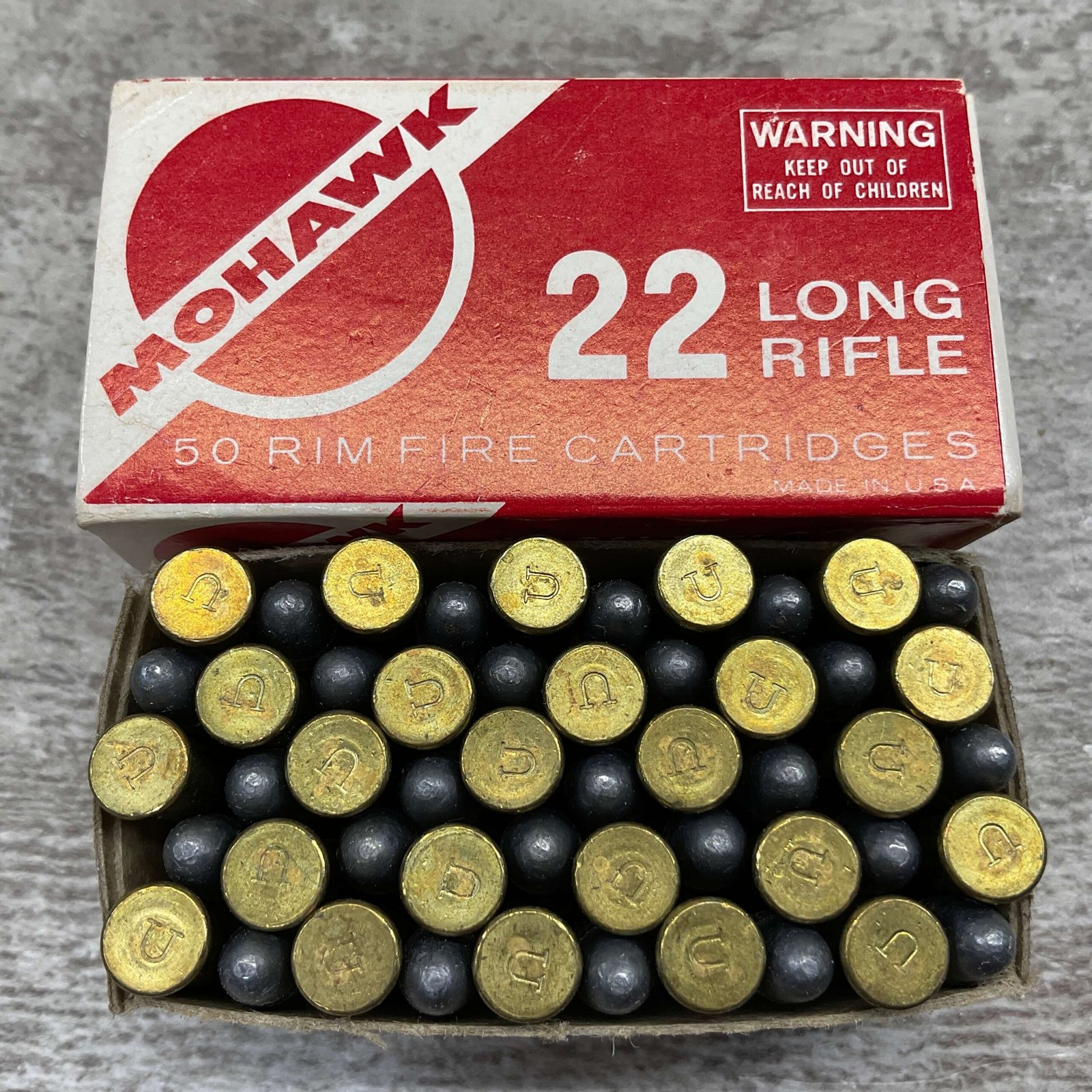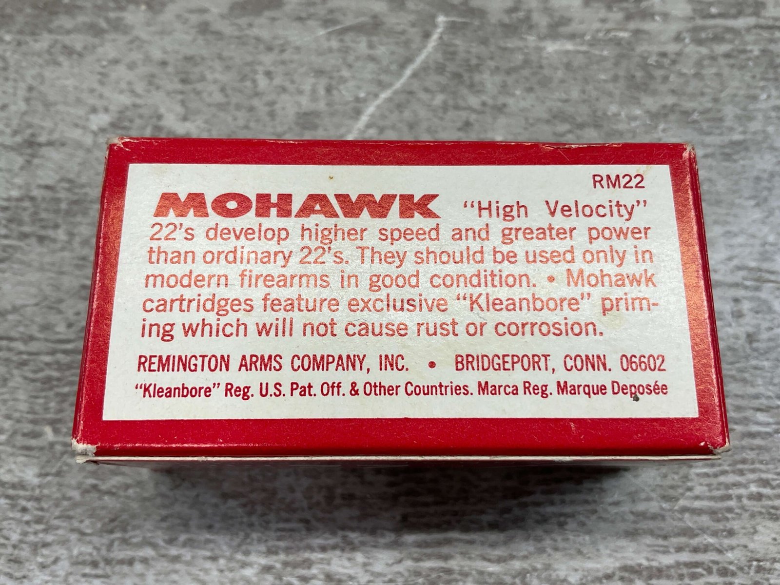 MOHAWK HIGH VELOCITY 22 LR AMMO, FULL BOX, VINTAGE, BOX IS IN EXC CONDITION AND DISPLAYS AND FUNCTIONS WELL!