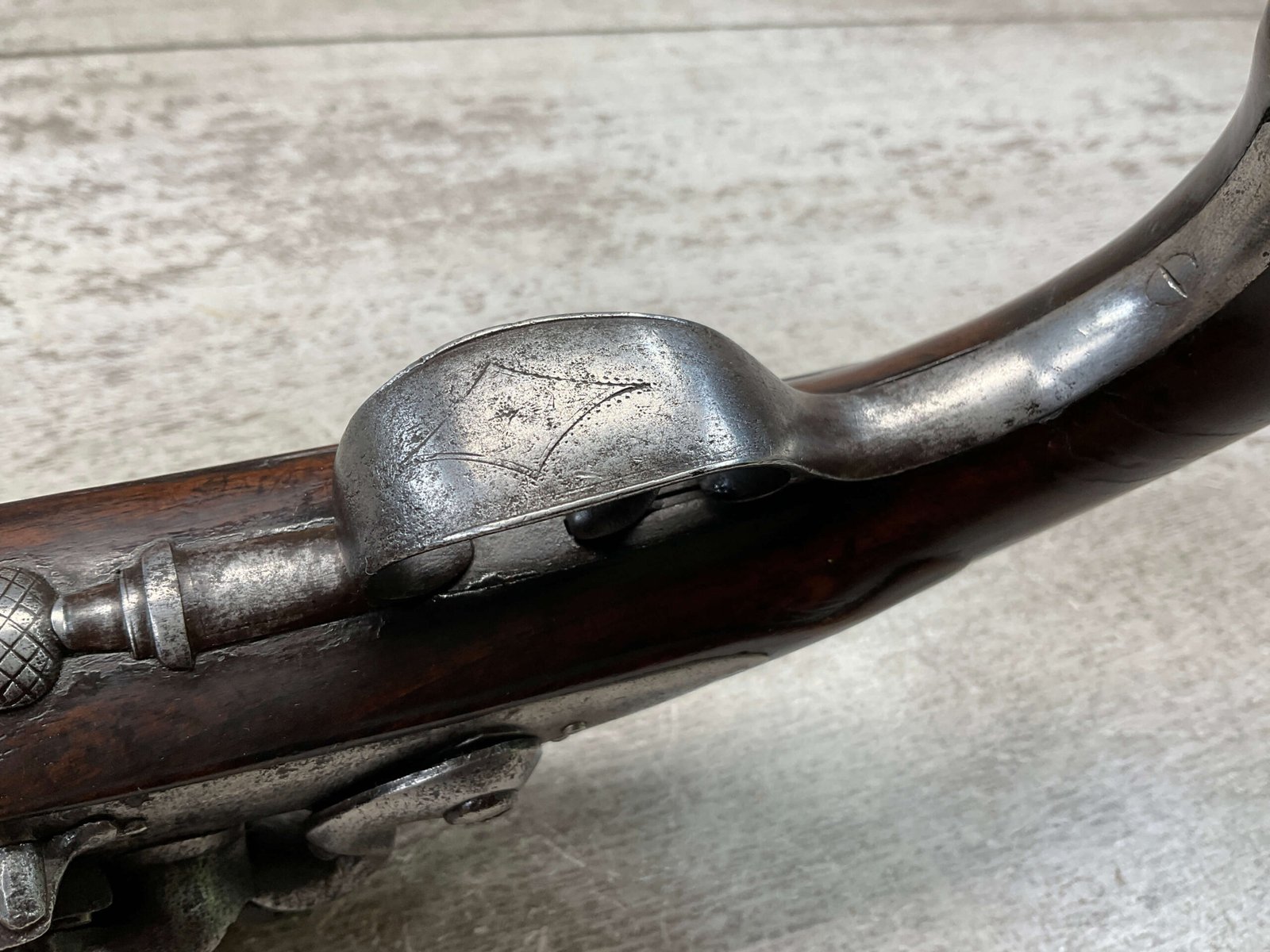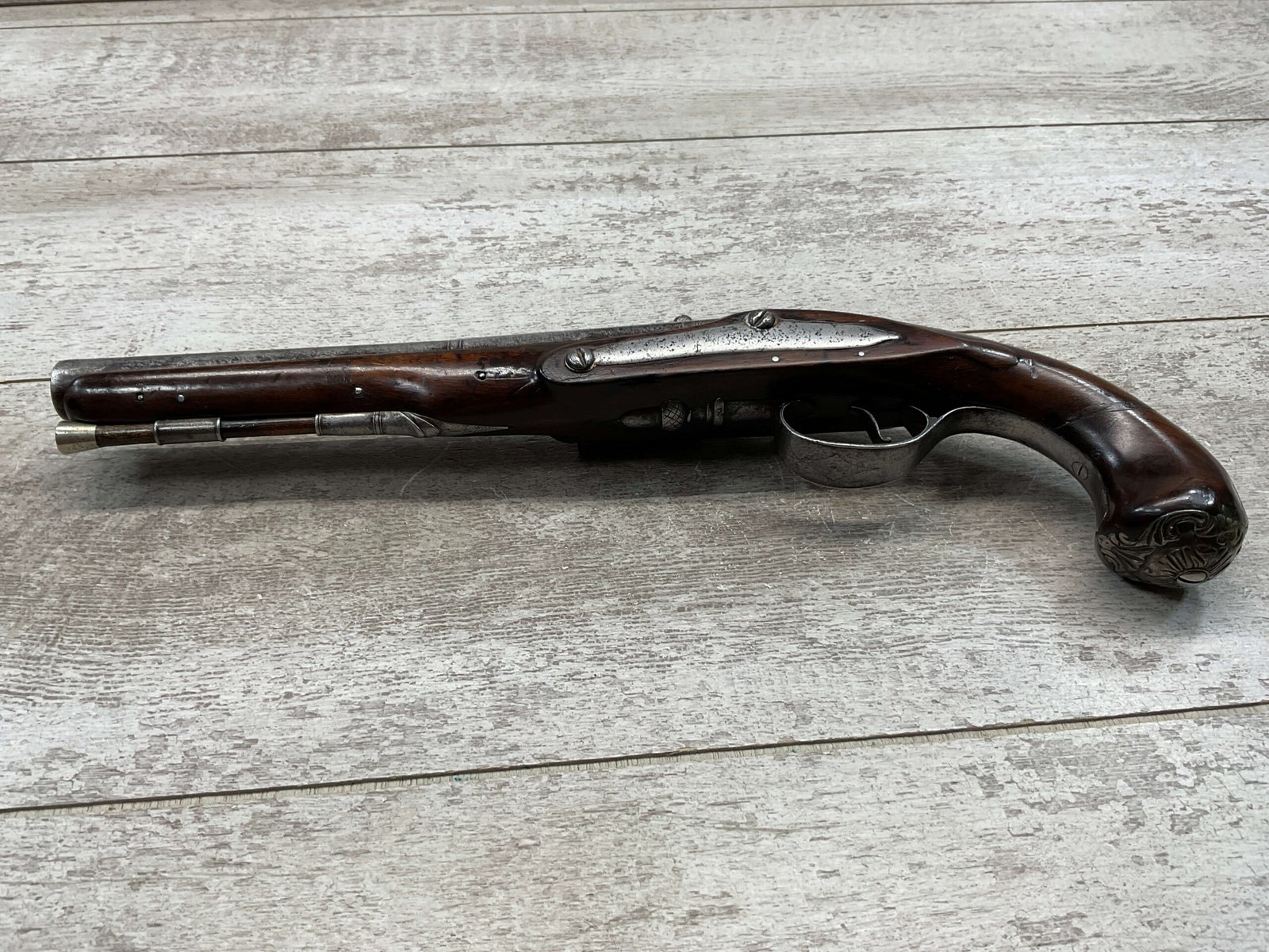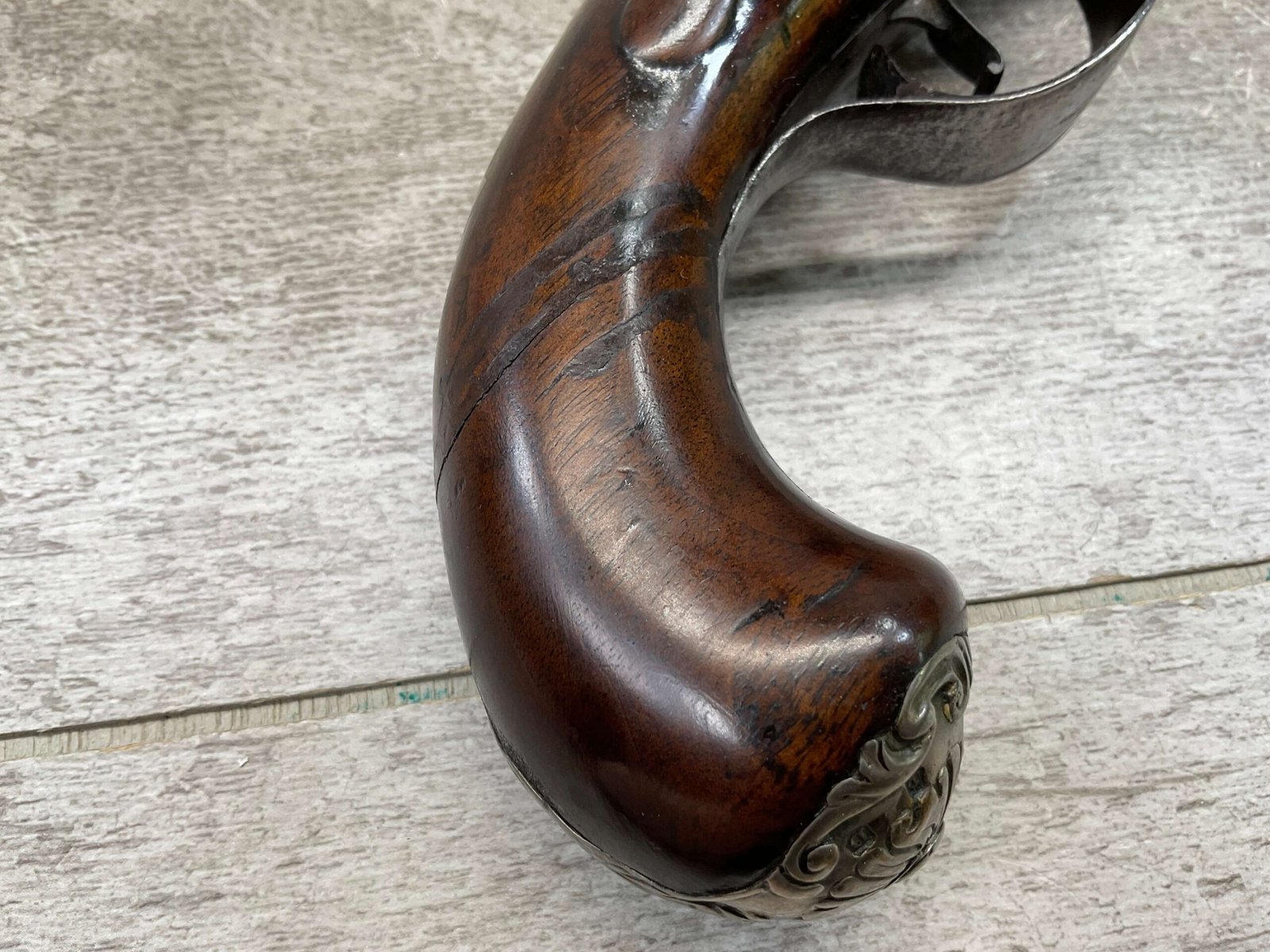 MORTIMER LONDON OVERCOAT FLINTLOCK .58 CAL PISTOL, ANTIQUE #NSN, 7″ BBL, GERMAN SILVER FURNITURE, NICE COUNTRY GENTLEMAN, REPAIRED CRACK IN GRIP, COMMERCIAL, FLINT, CONDITION AS SHOWN IN PICTURES