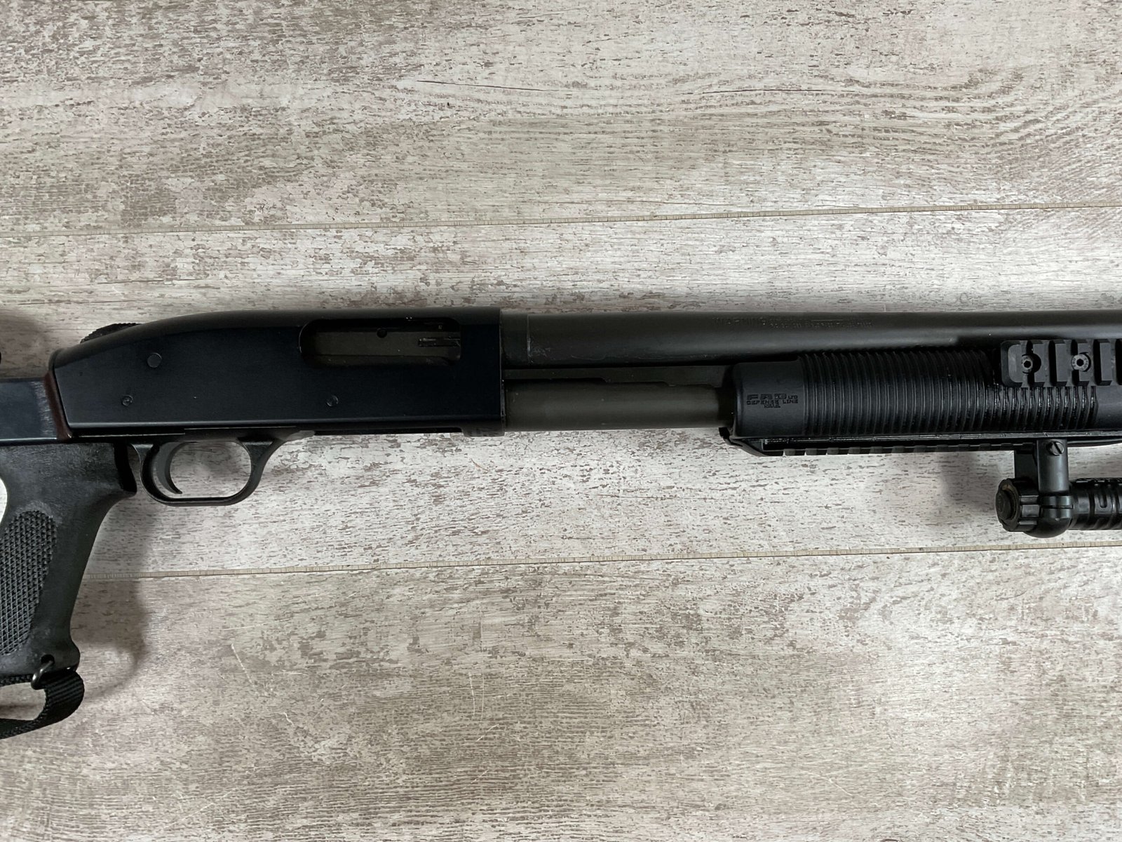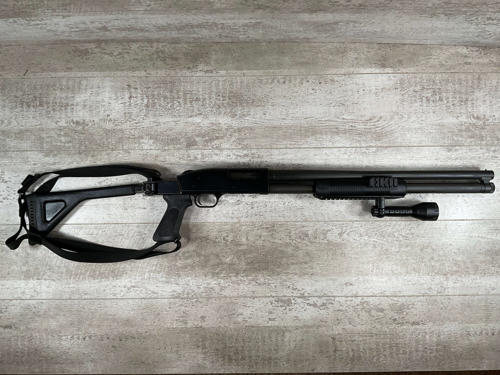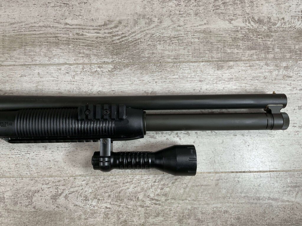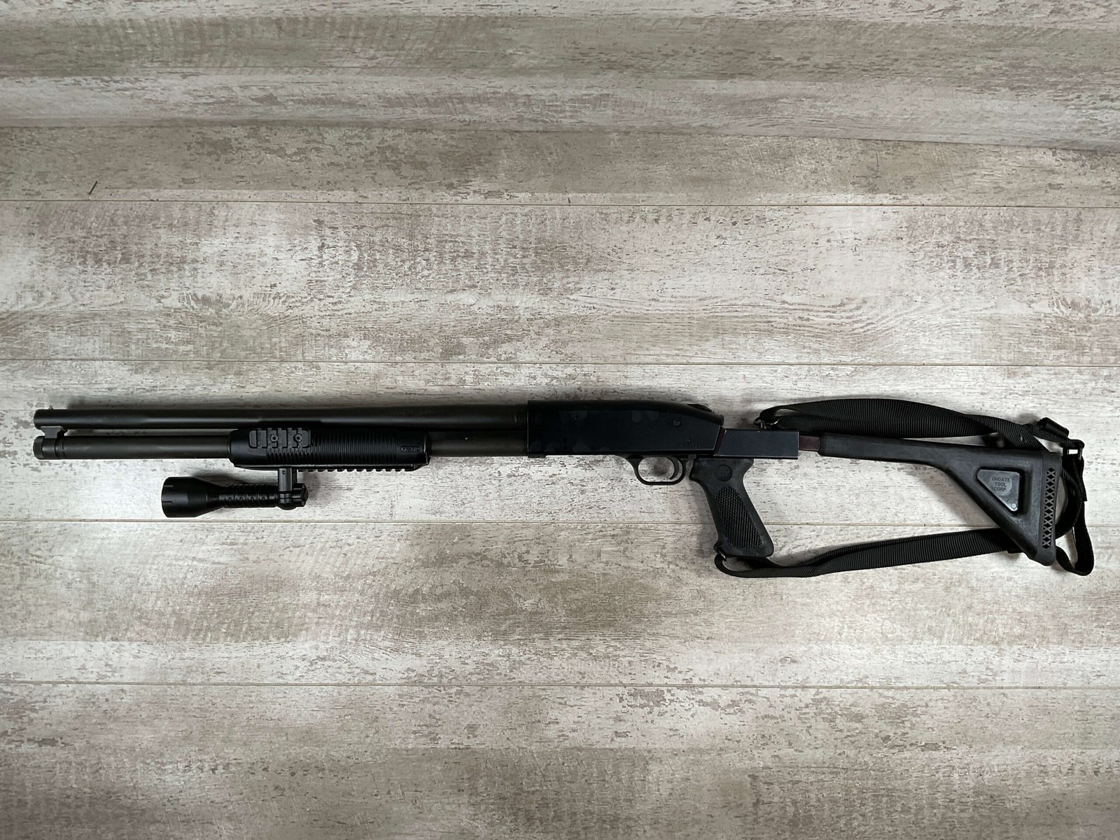 MOSSBERG 500 TACTICAL 12GA SHOTGUN W/FOLDING STOCK & STREAMLIGHT #U570145, 20″ BARREL, 3″ SHELLS, PARKERIZED FINISH BBL AND TUBE, EXC BLUE RECIEVER, CHOATE TOOL FOLDING STOCK, STREAMLIGHT POLYTAC LED ATTACHED TO FAD DEFENSE LINE FOREGRIP, PICATINNY RAILS, EXC BORE, 95+% OVERALLÂ Â **GREAT HOME DEFENSE SHOTGUN!!