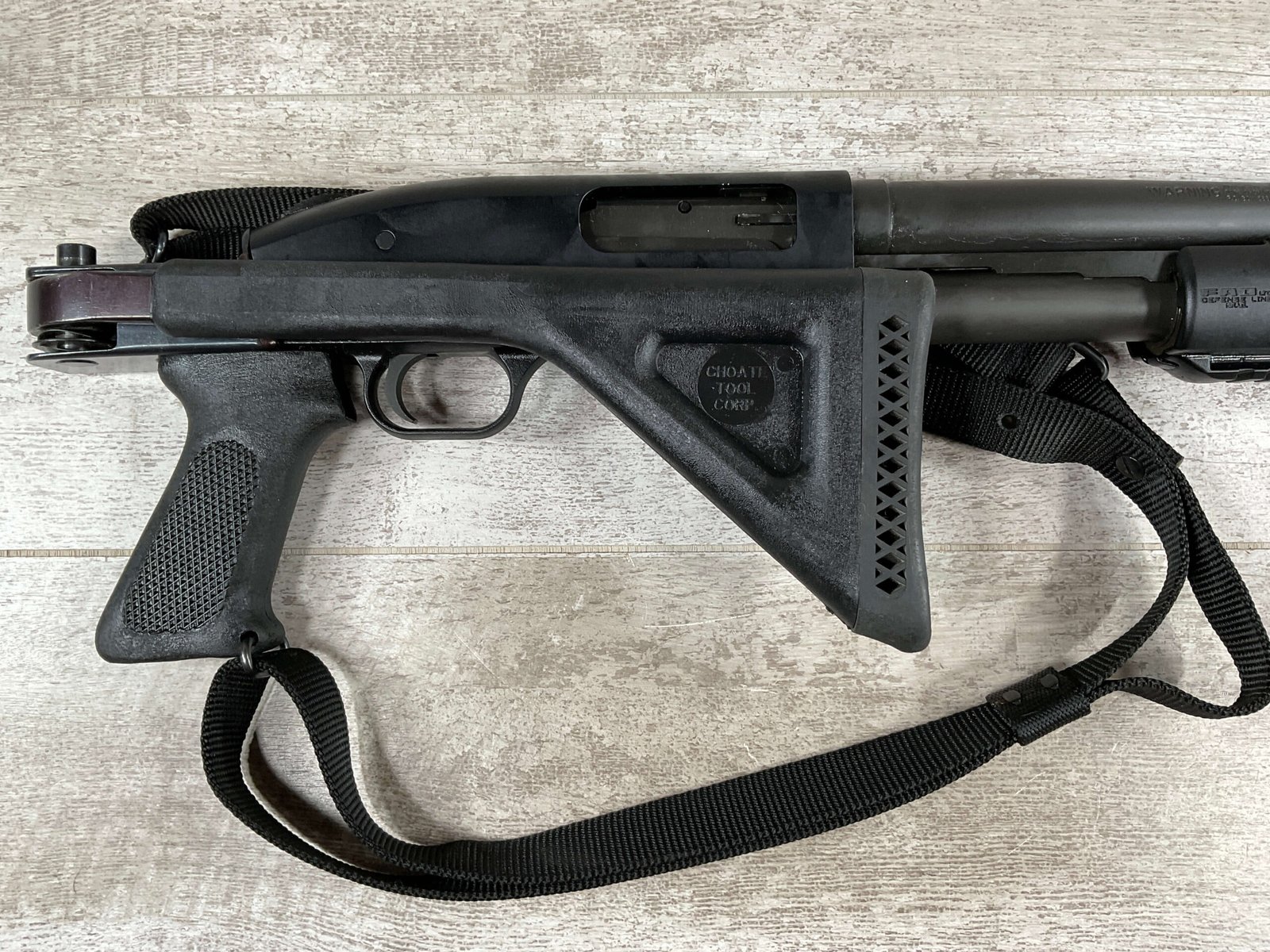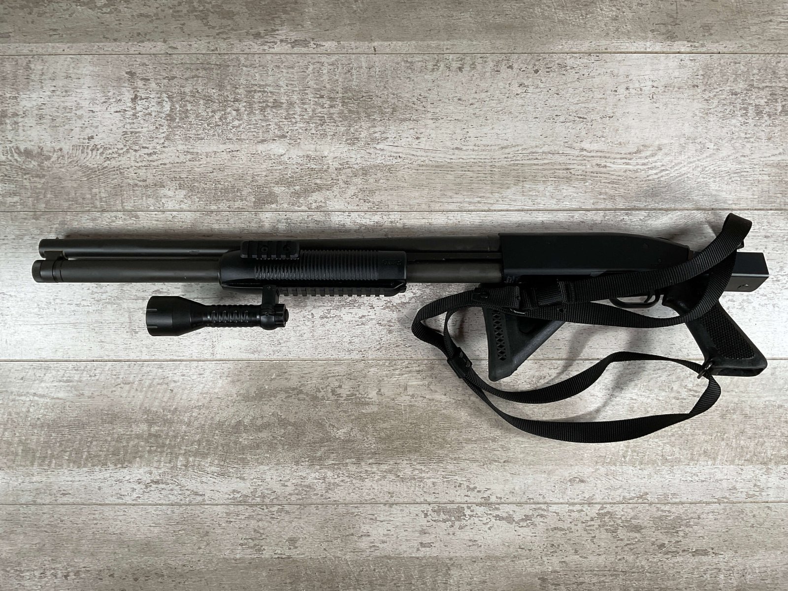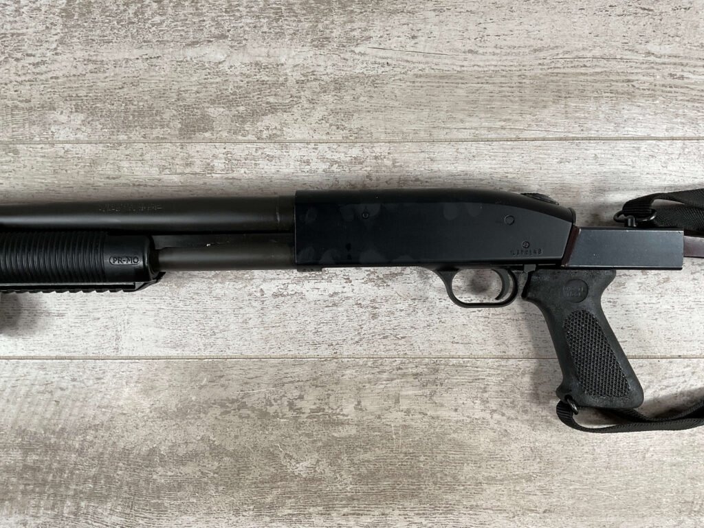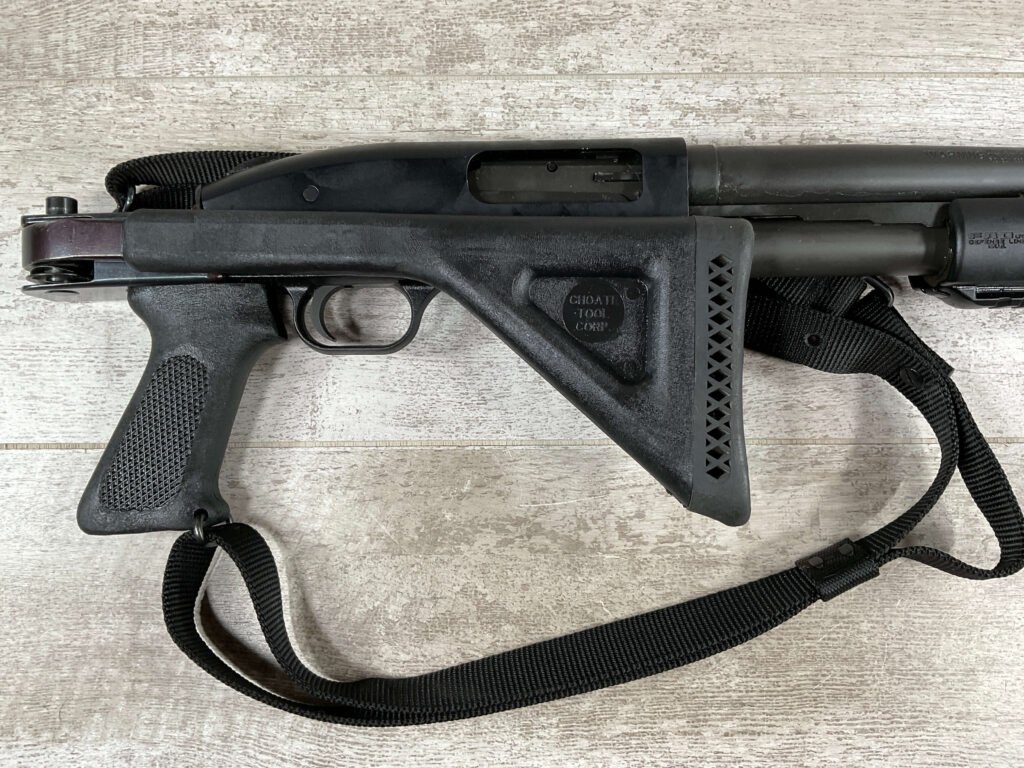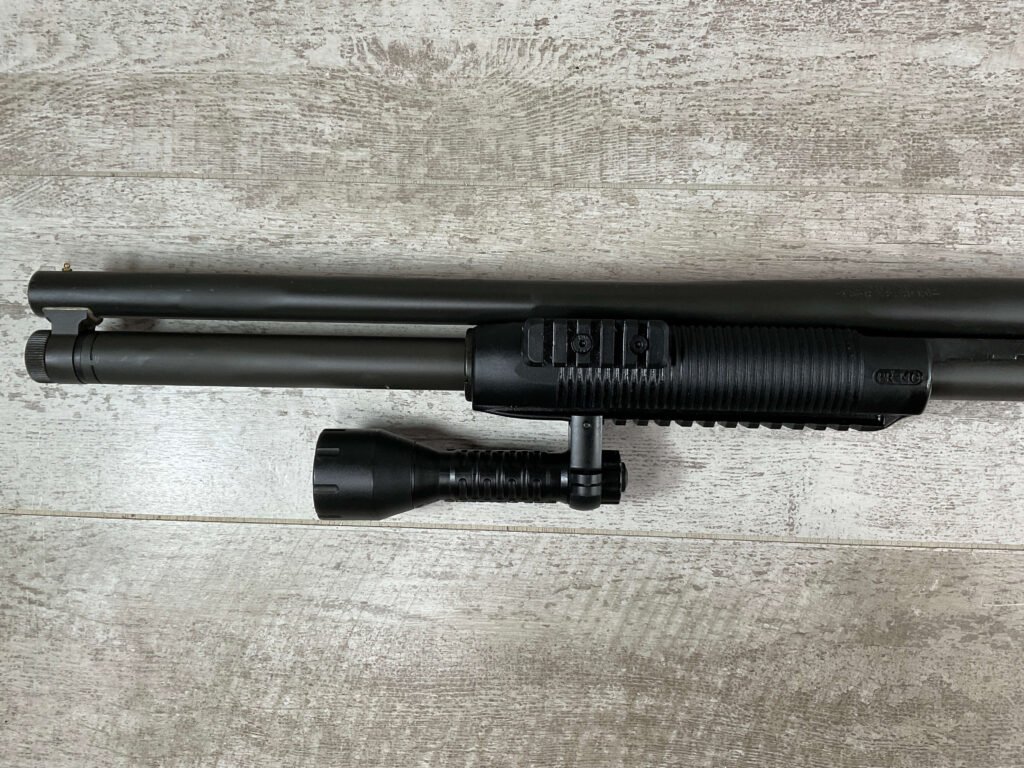 MOSSBERG 500 TACTICAL 12GA SHOTGUN W/FOLDING STOCK & STREAMLIGHT #U570145, 20″ BARREL, 3″ SHELLS, PARKERIZED FINISH BBL AND TUBE, EXC BLUE RECIEVER, CHOATE TOOL FOLDING STOCK, STREAMLIGHT POLYTAC LED ATTACHED TO FAD DEFENSE LINE FOREGRIP, PICATINNY RAILS, EXC BORE, 95+% OVERALLÂ Â **GREAT HOME DEFENSE SHOTGUN!!