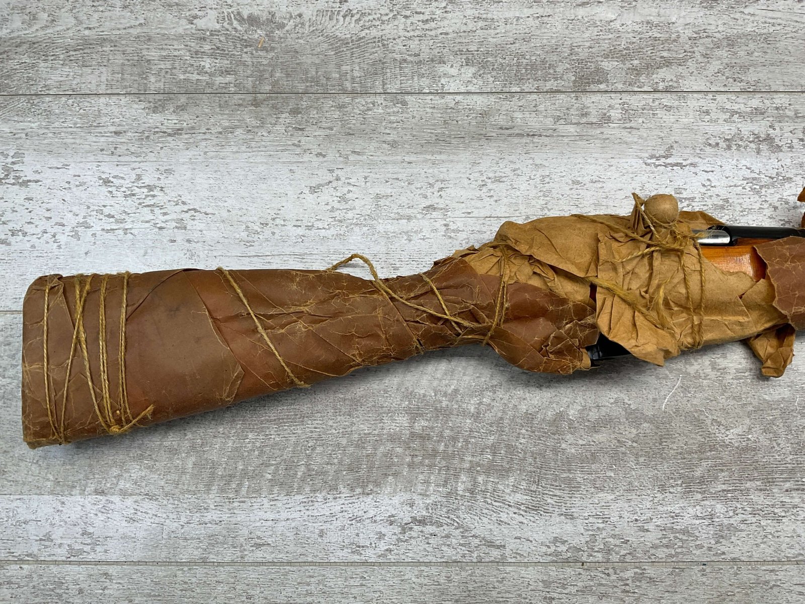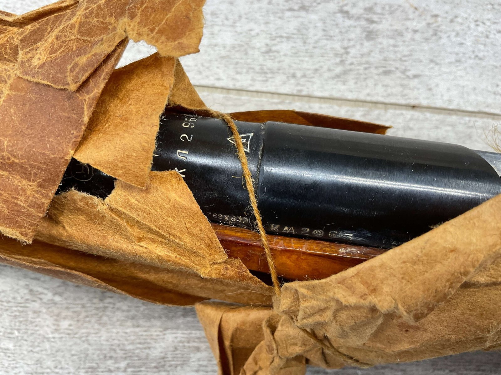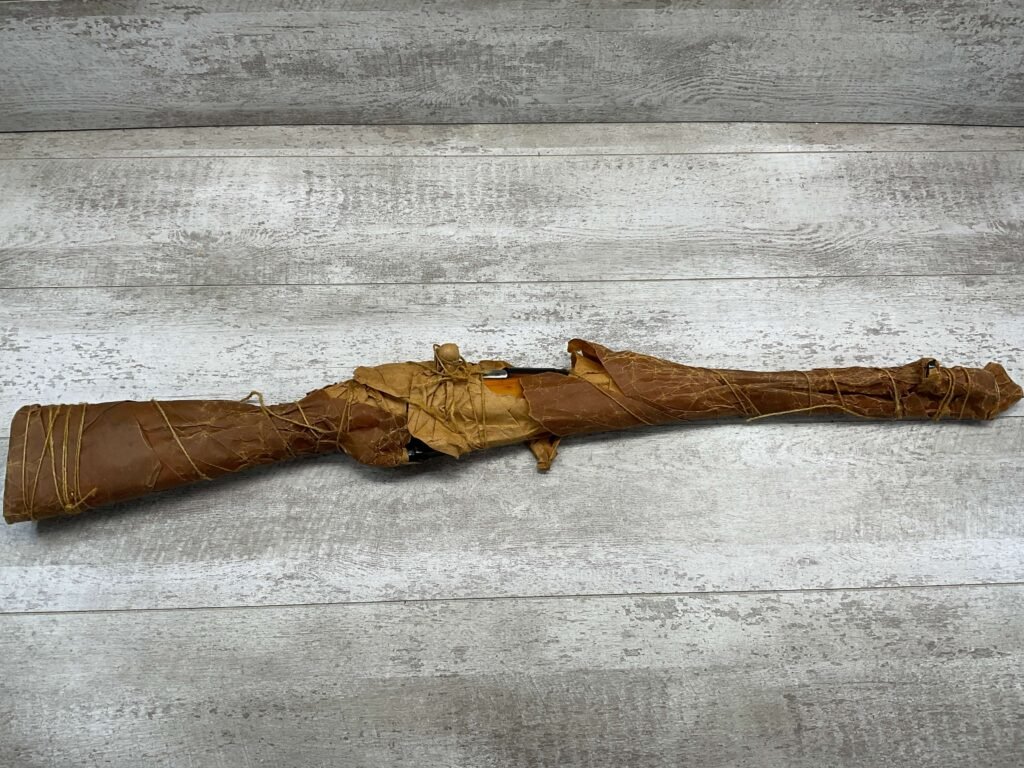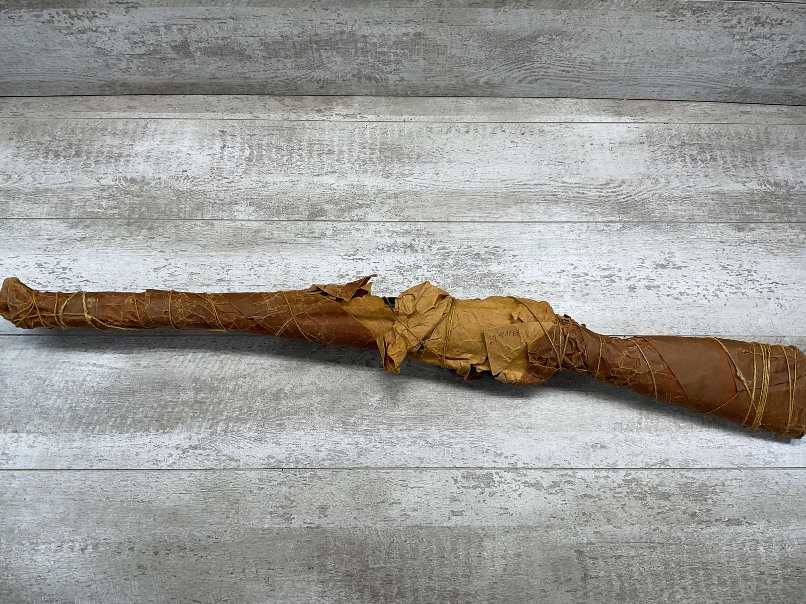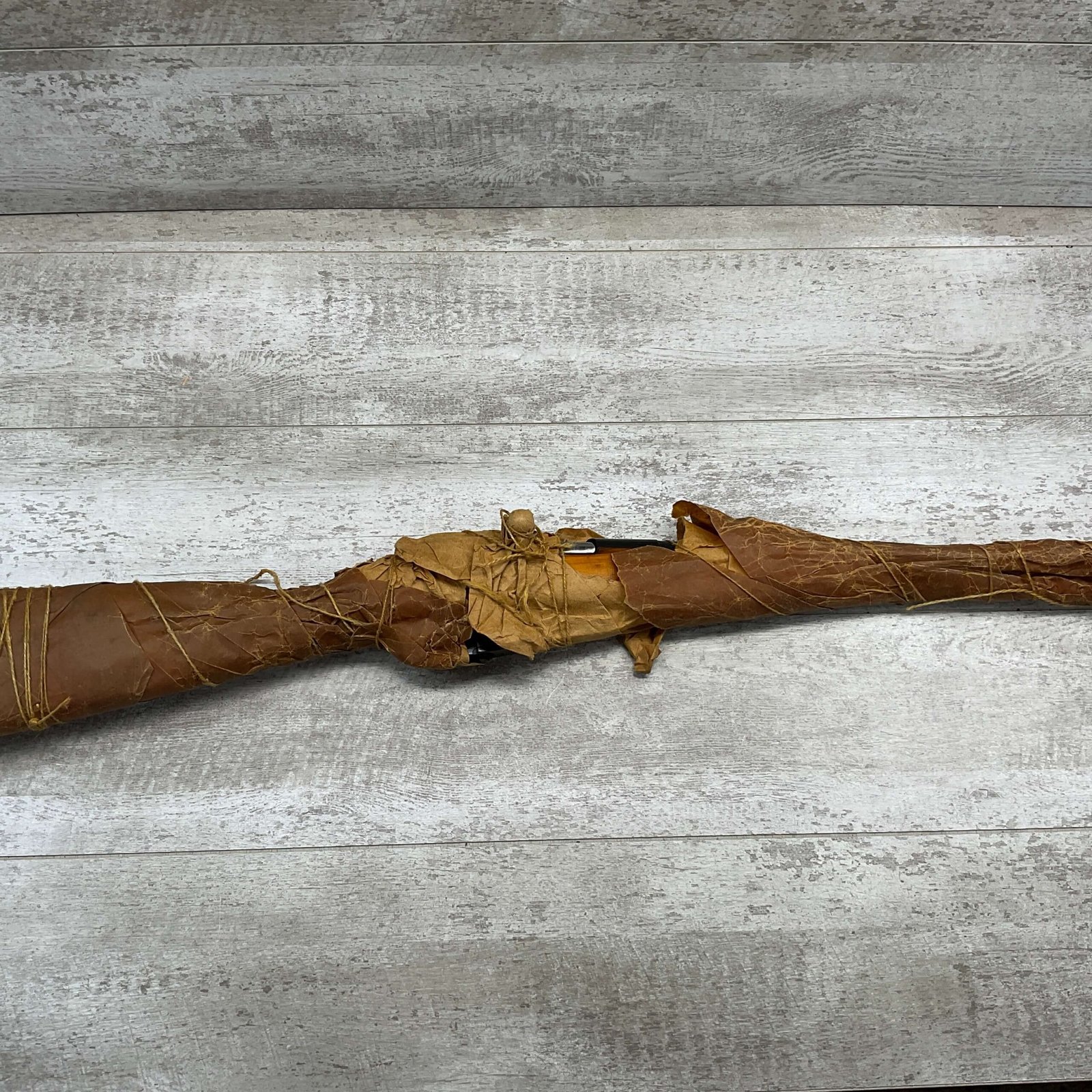 MUMMY WRAPPED MOSIN NAGANT 1944 M44 7.62X54R BOLT ACTION RIFLE #KN2963, TOP OF RECEIVER MARKED “HAMMER & SICKLE / 1947 r / KN2963 / IZHEVSK FACTORY ARROW IN TRIANGLE”, EXC BLUE, CAI VT IMPORT ON LEFT SIDE OF RECEIVER (AREA OPEN FROM WRAP), BELIEVED TO BE ORIGINAL WRAP, WAS UNWRAPPED NEAR RECEIVER TO PLACE IMPORT MARK ONLY, RARE