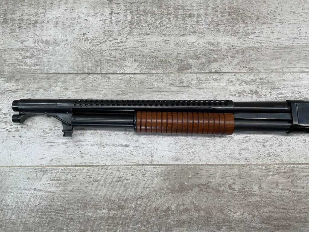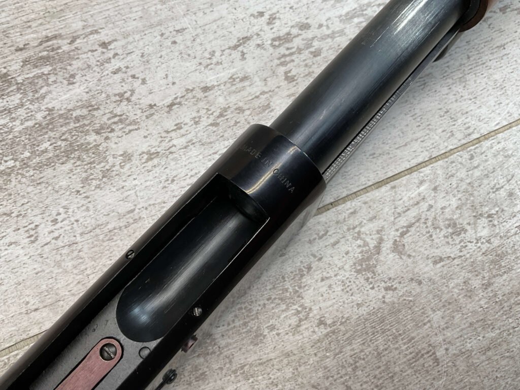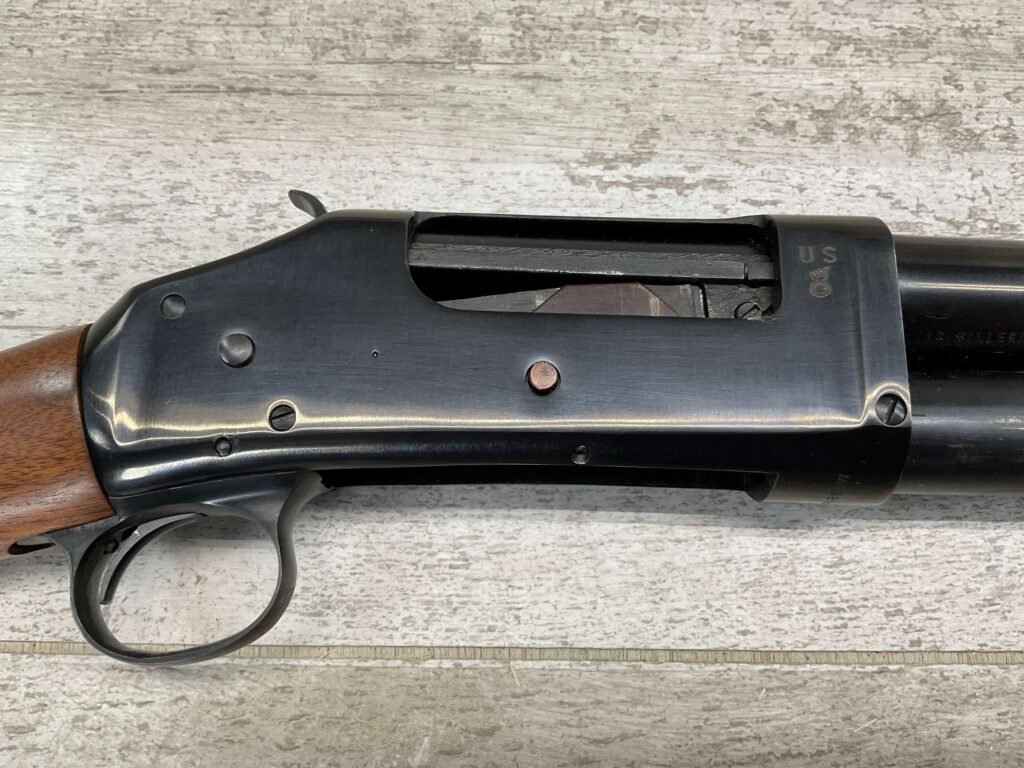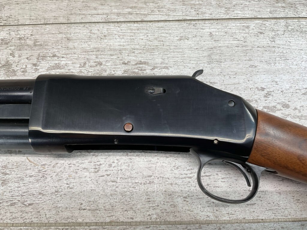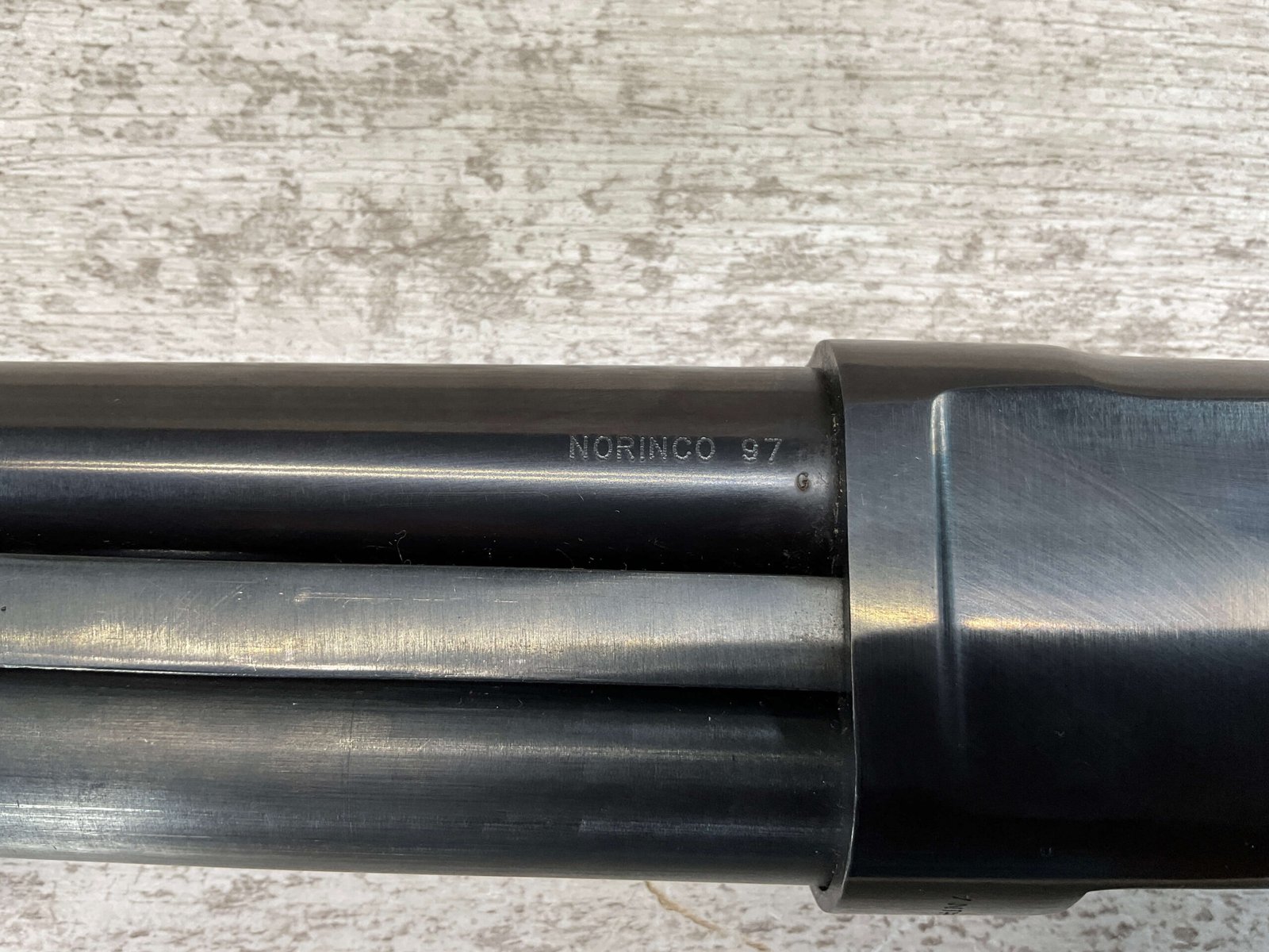 NORINCO 1897 12GA REPLICA TRENCH PUMP SHOTGUN, NIB #MIL3033, 7.62X39MM, 20″ BARREL W/HEAT SHIELD, EXC AMERICAN WALNUT WOOD STOCK, BAYONET LUG, 2 3/4″ CHAMBER, 5 ROUND CAPACITY, PUMP ACTION, “US/FIREBOMB” JUST IN FRONT OF EJECTION PORT, EXC BLUE (10/10), BOX IS LIKE NEW, NEVER FIRED, 98+% OVERALL