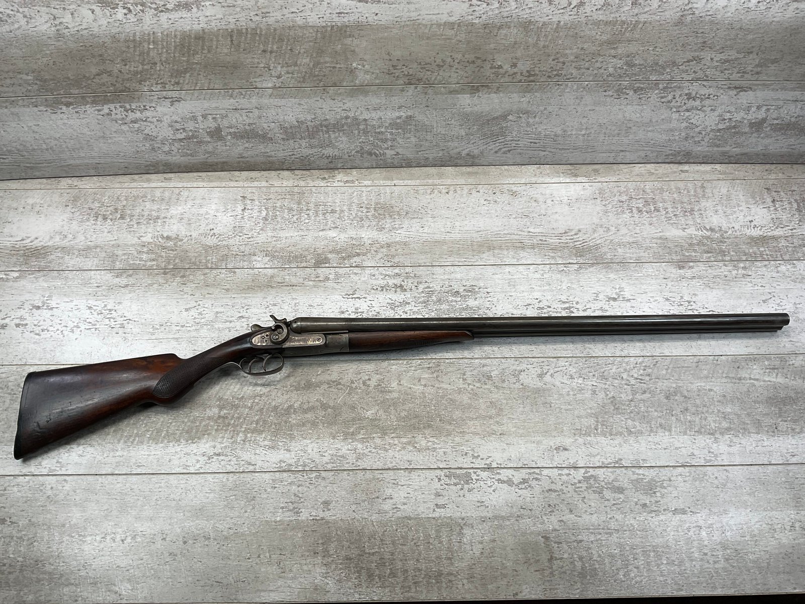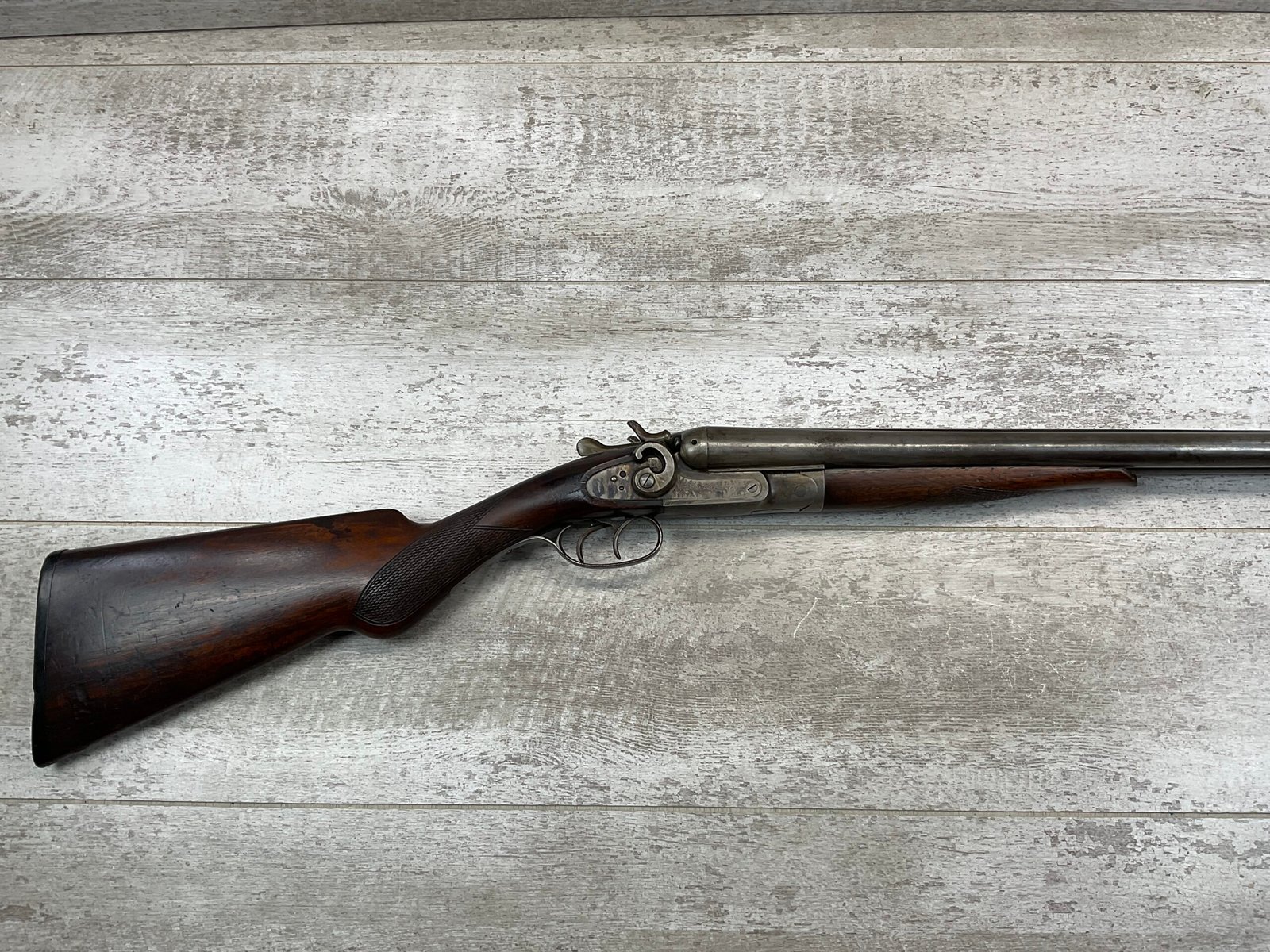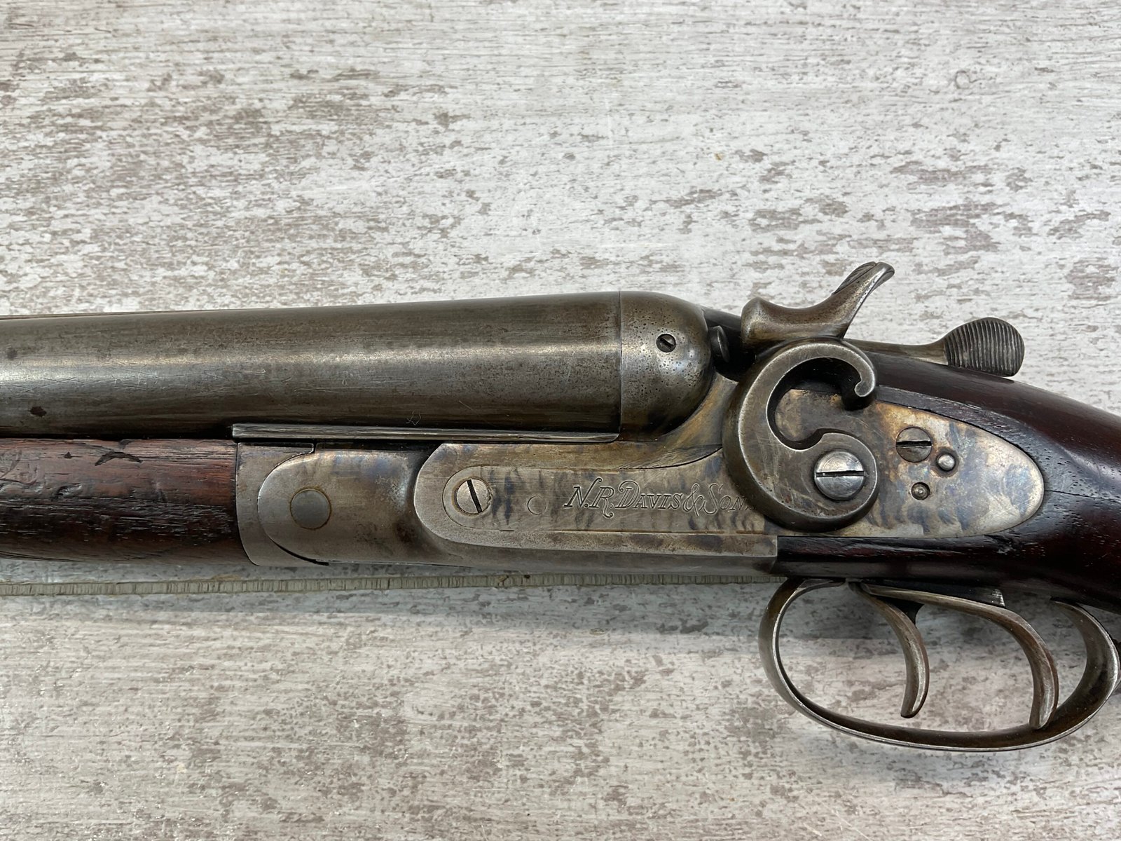 NR DAVIS & SONS 12GA SXS SHOTGUN W/EXPOSED HAMMERS, ANTIQUE #19, 30″ DAMASCUS BARRELS BOTH MEASUER FULL CHOKE, VG ORIGINAL CHECKERED WALNUT STOCK & FOREND, CASE COLOR HARDENED RECEIVER STILL SHOWING COLOR, GOES TO HALF COCK, SEEMS TO FUNCTION JUST FINE, BLACK PLASTIC BUTT PAD, 14″ LOP TO FRONT TRIGGER, ANTIQUE