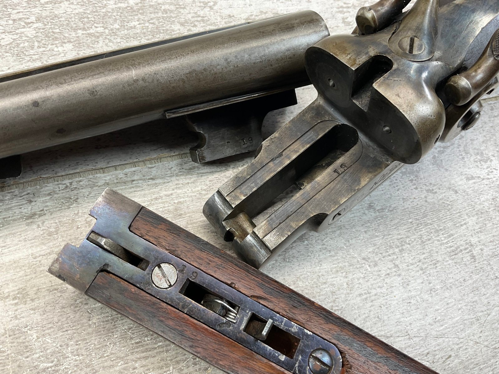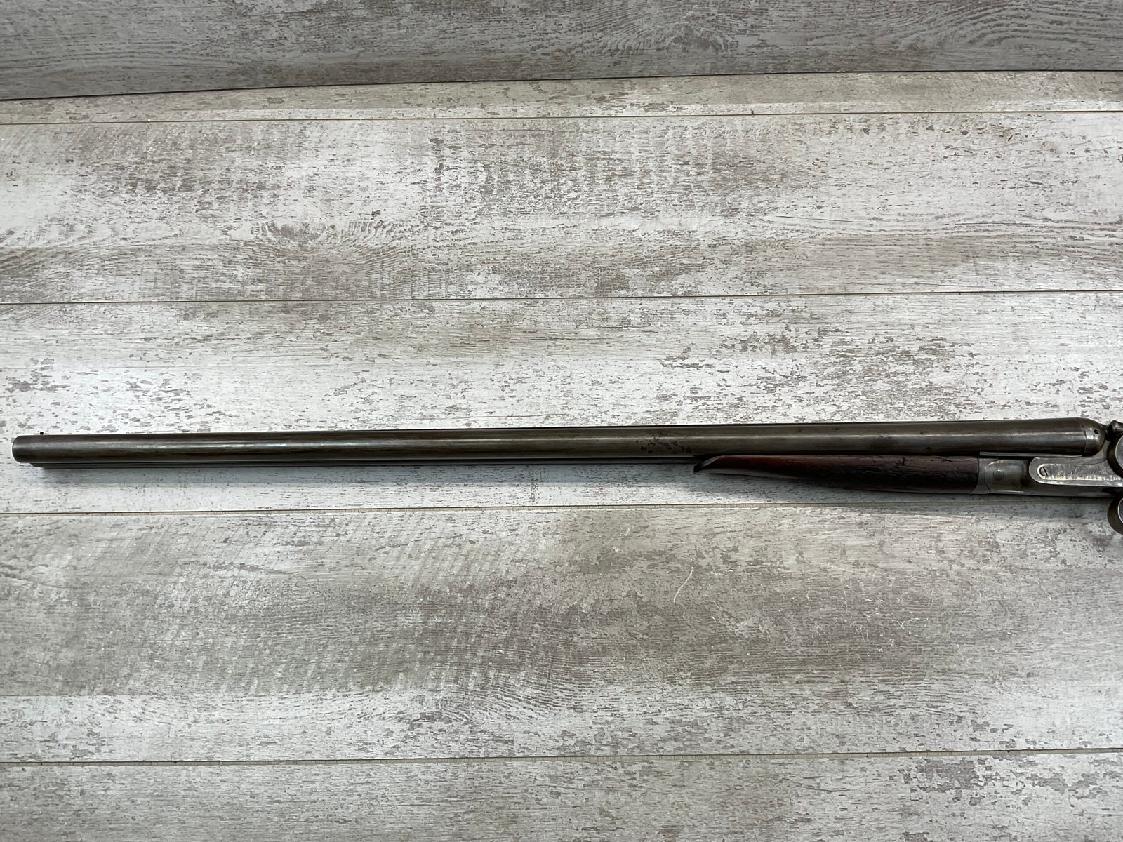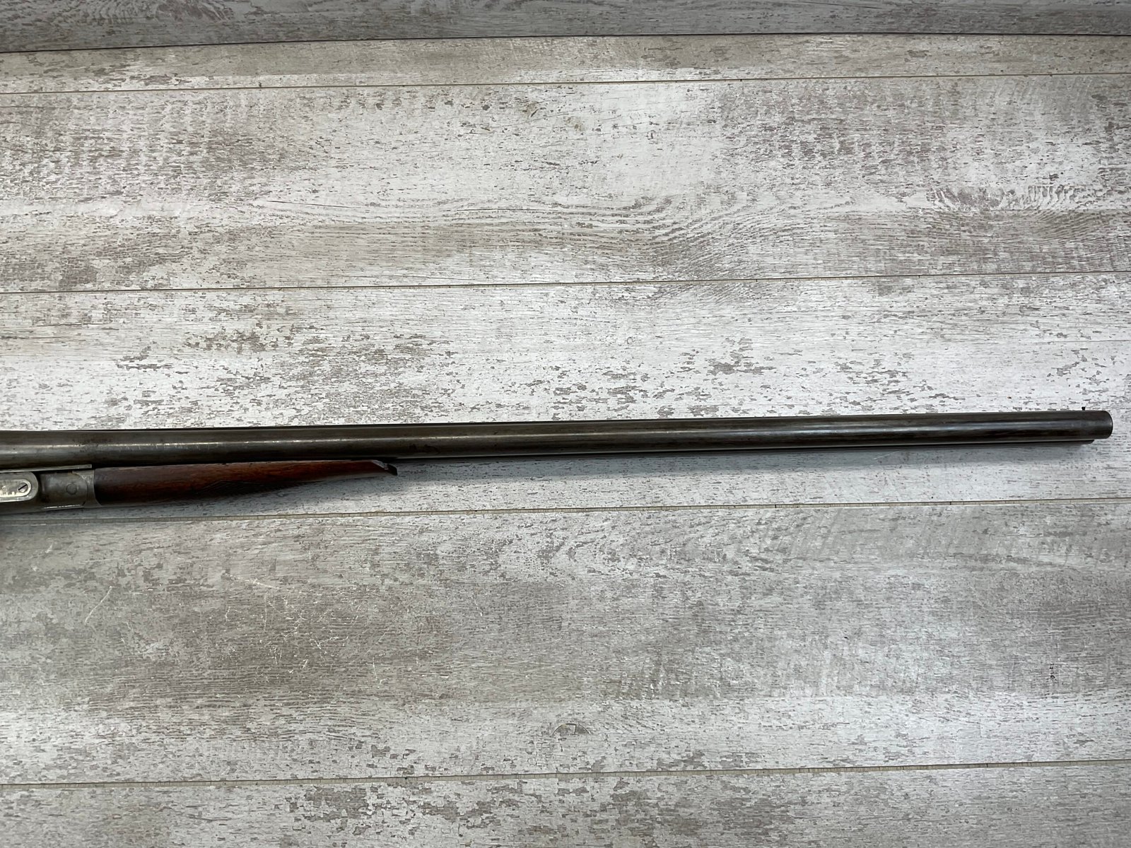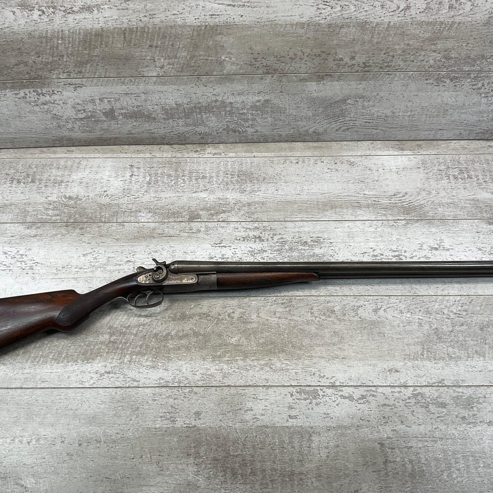 NR DAVIS & SONS 12GA SXS SHOTGUN W/EXPOSED HAMMERS, ANTIQUE #19, 30″ DAMASCUS BARRELS BOTH MEASUER FULL CHOKE, VG ORIGINAL CHECKERED WALNUT STOCK & FOREND, CASE COLOR HARDENED RECEIVER STILL SHOWING COLOR, GOES TO HALF COCK, SEEMS TO FUNCTION JUST FINE, BLACK PLASTIC BUTT PAD, 14″ LOP TO FRONT TRIGGER, ANTIQUE