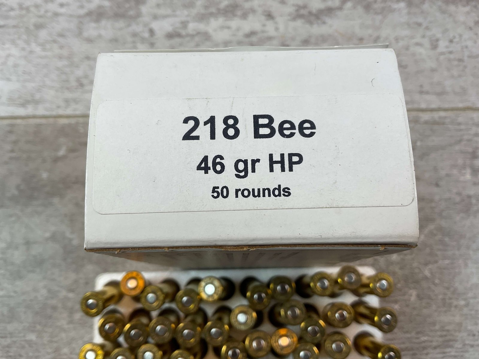 OBSOLETE AMMUNITION BOX, (WINCHESTER) 218 BEE, 46 GR. HP AMMO, FULL BOX (QTY 50), HEADSTAMP INCLUDES “W-W” WHICH LEADS US TO BELIEVE THIS IS NOT OBSOLETE BRAND, BUT RATHER WINCHESTER IN OBSOLETE BOXING. BOX IS IN EXC. CONDITION AND FUNCTIONS/DISPLAYS WELL!