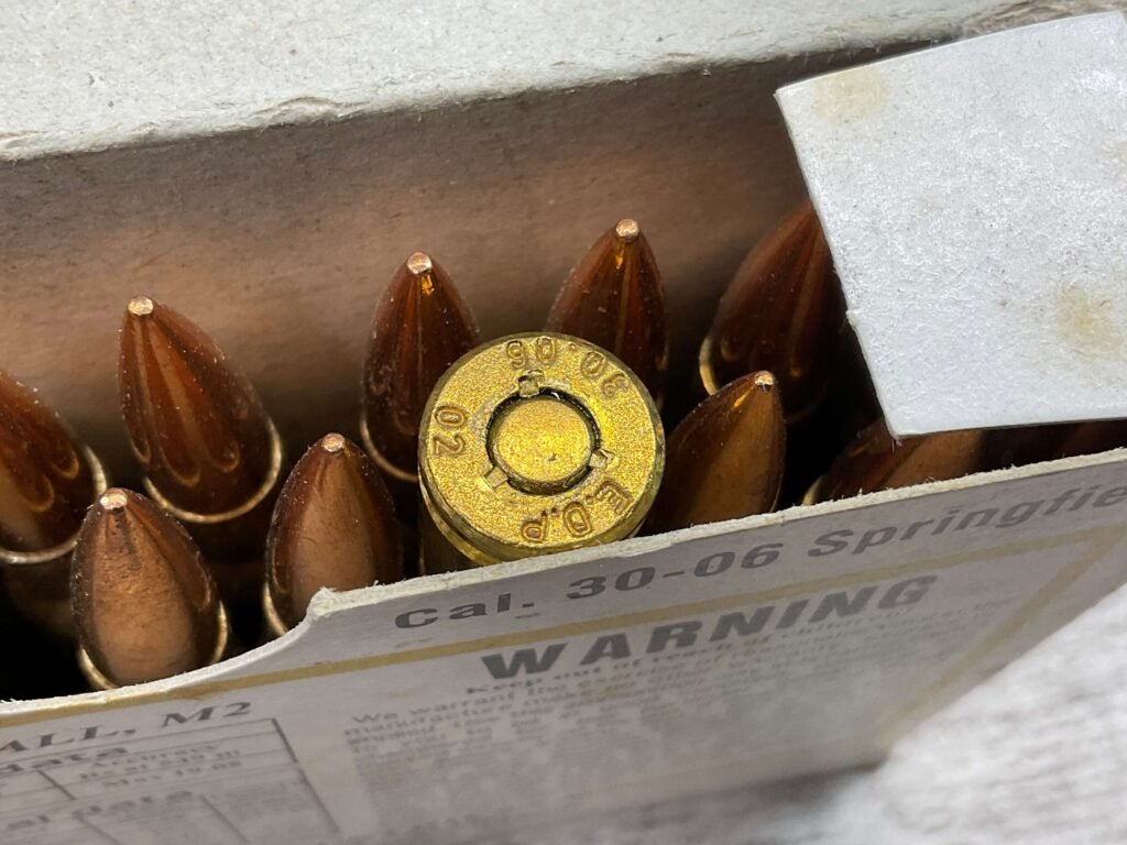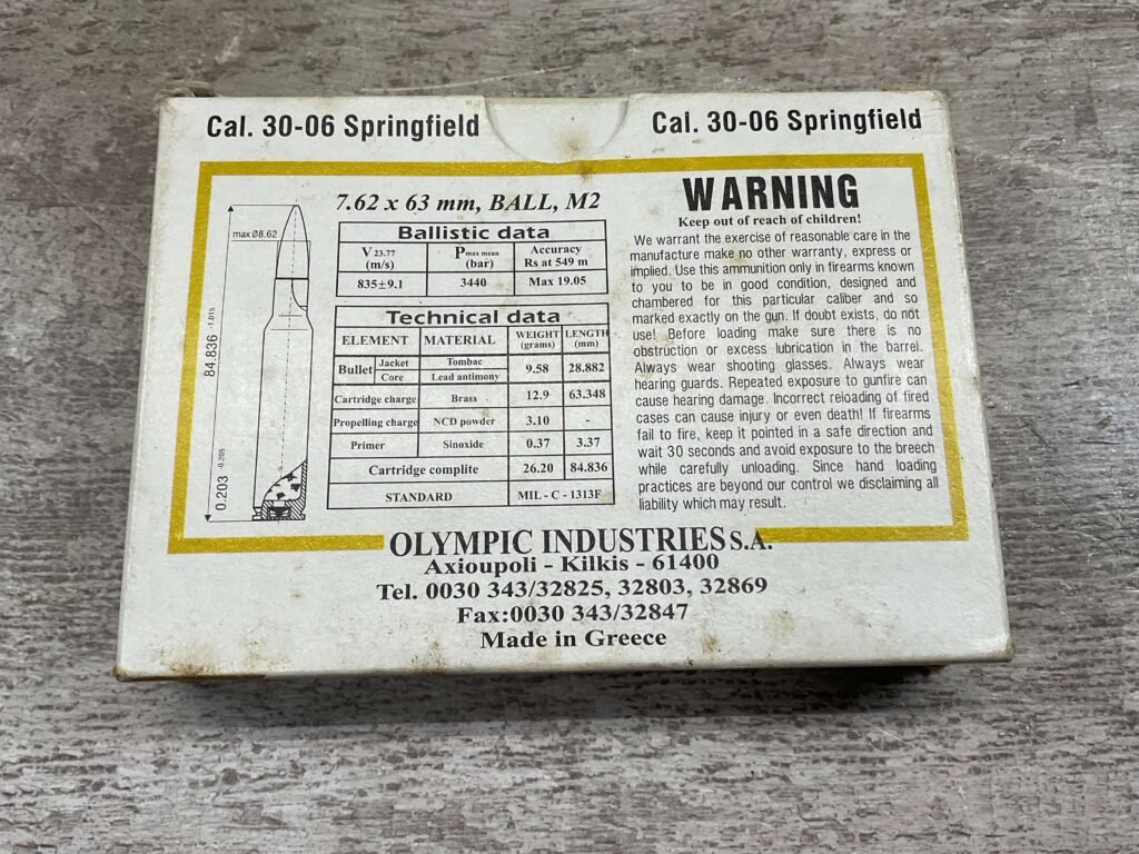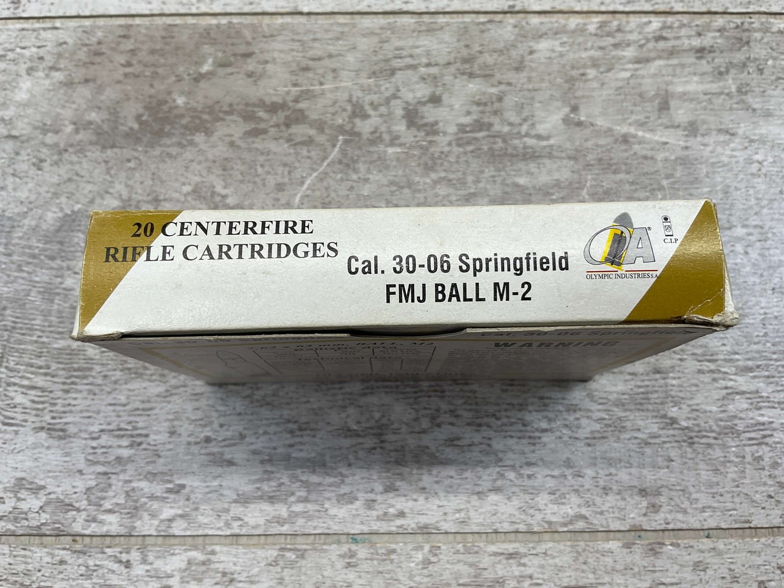 OLYMPIC 30-06 SPRING, FMJ BALL M-2 AMMUNITION, FULL BOX (QTY 20), RIFLE CARTRIDGES, BOX IS IN EXC CONDITION WITH ORIGINAL PRICE STICKER ON FRONT, MADE IN GREECE.