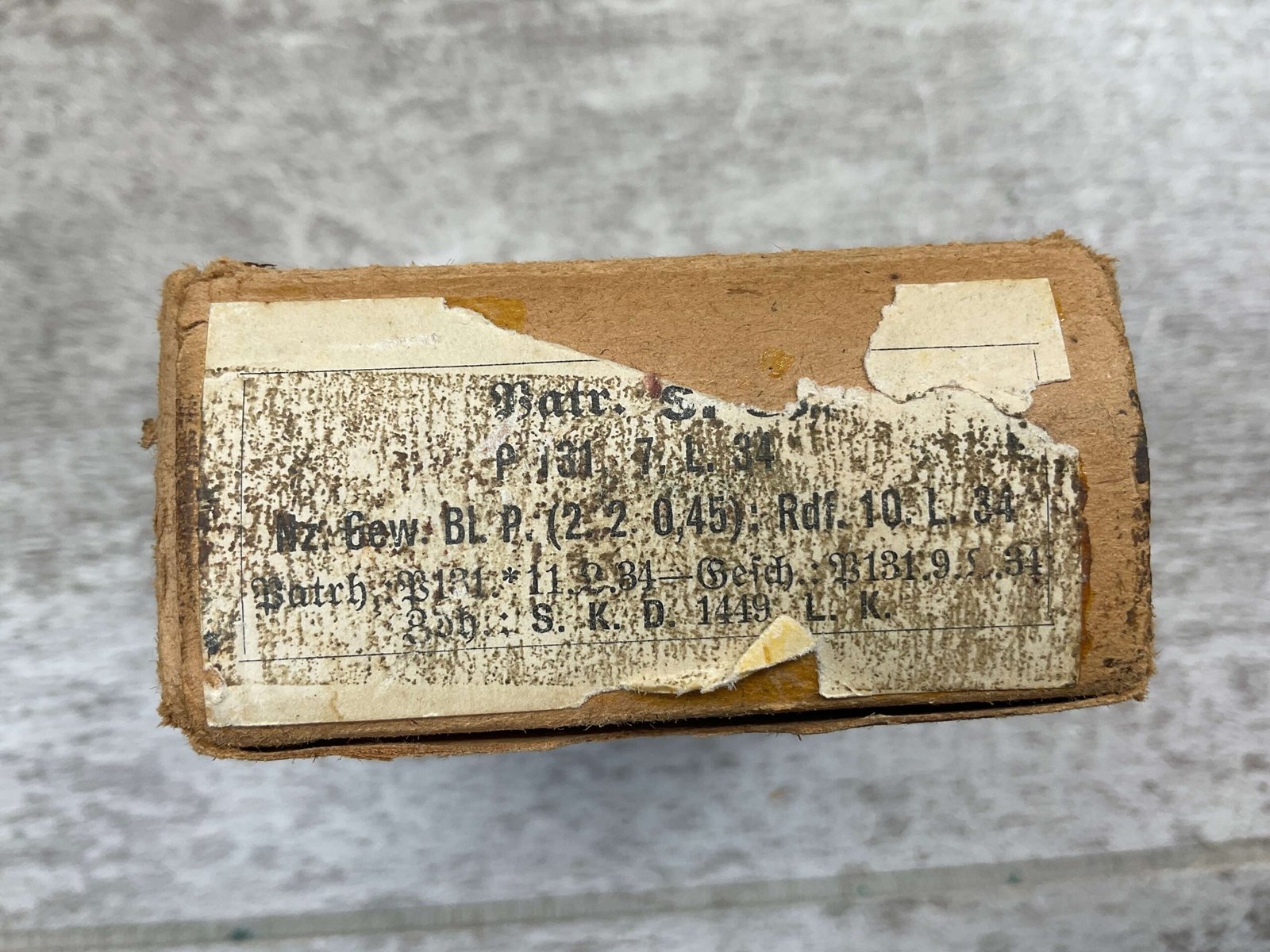 ORIGINAL BOX NAZI 8MM HEAVY BALL AMMO, MANUFACTURED IN 1934, VINTAGE, HEADSTAMP IS 34 P131 S* 11