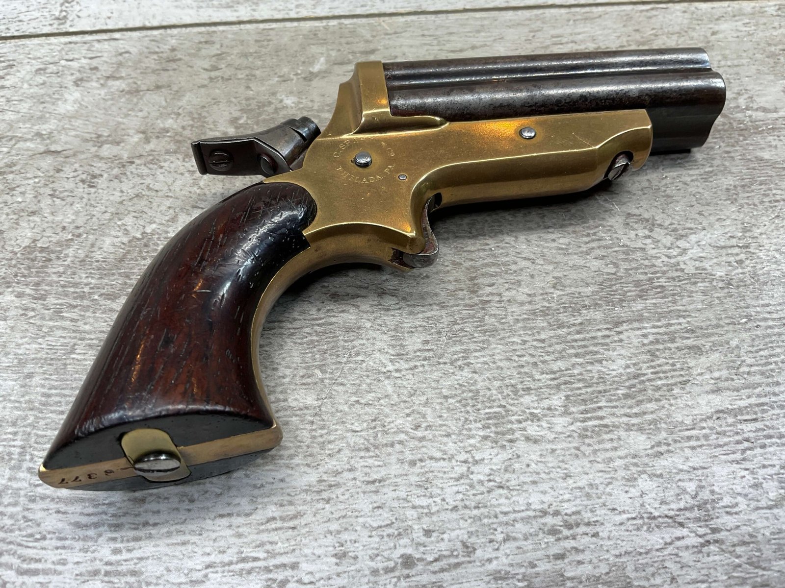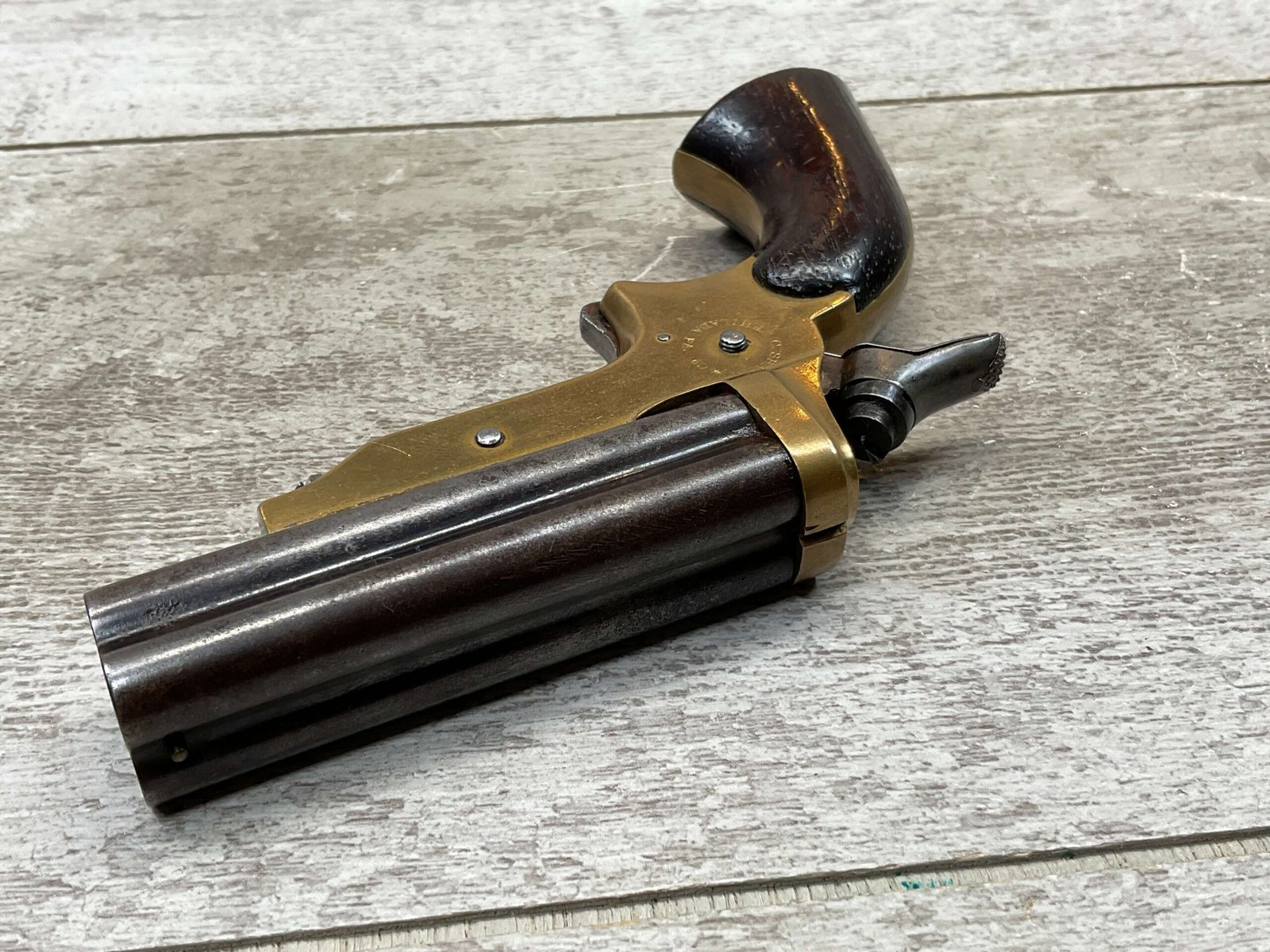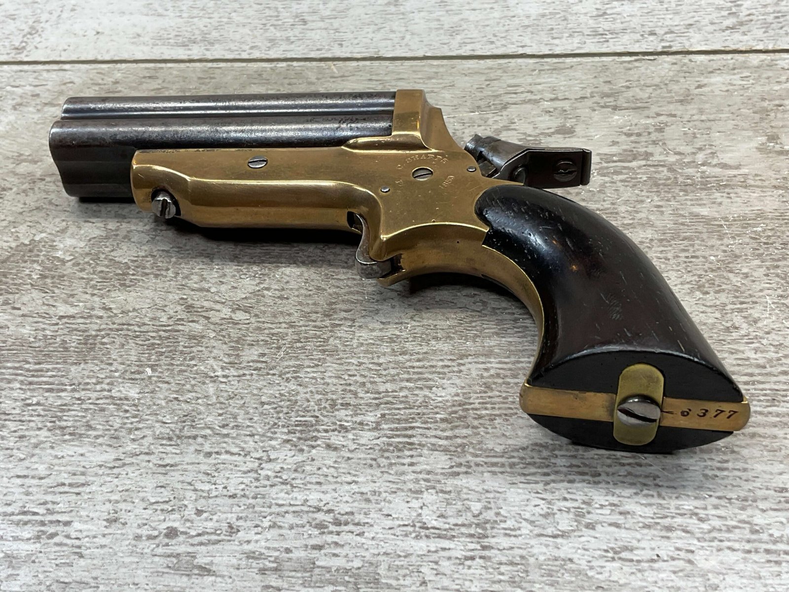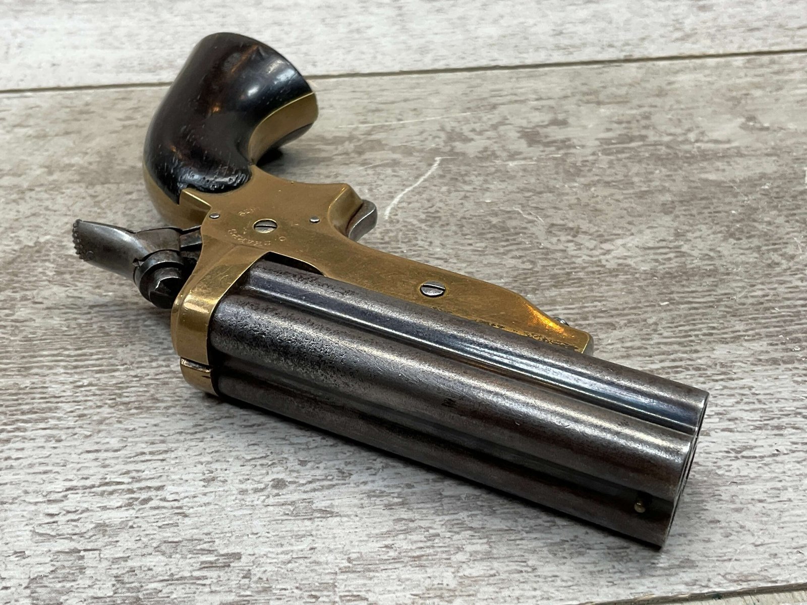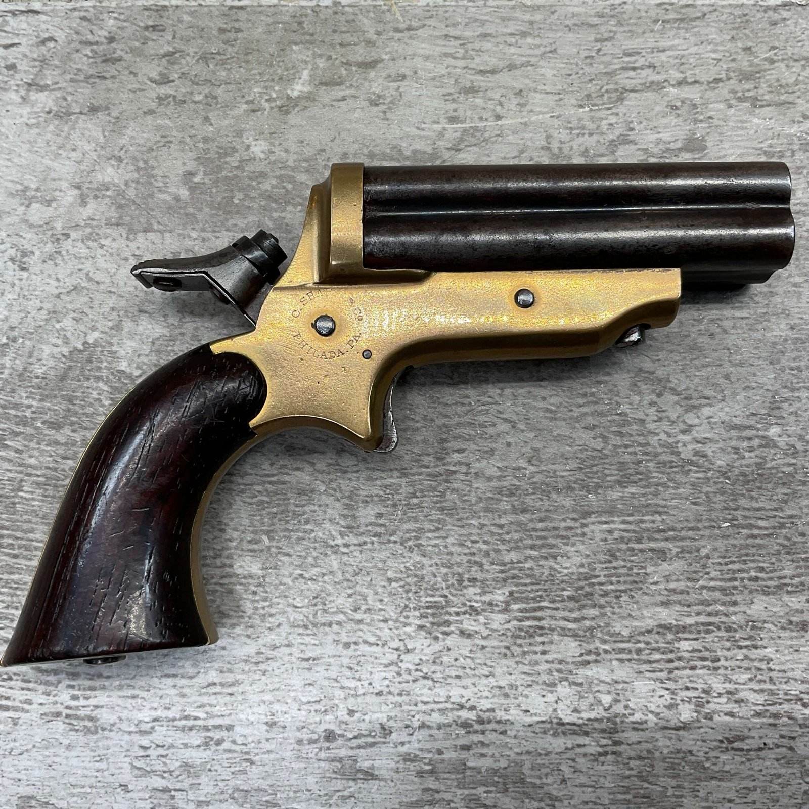 ORIGINAL U.S. 19TH CENTURY SHARPS MODEL 2C, 4 BARREL .32RF PEPPERBOX PISTOL, ANTIQUE #6377, .32 RIM FIRE, 3″ BARRELS W/ DARKER BORE & FROSTING THROUGHOUT, EXC ORIGINAL BRASS FRAME W/ LIGHT NICKS & DINGS, CURRENTLY NON FUNCTIONING (HAMMER FALLS BUT NEEDS HELP, I WOULD THING SOMETHING SIMPLE THAT A GUNSMITH CAN FIX), EXC SMOOTH WALNUT GRIPS, KNURLED HAMMER & SPUR TRIGGER, NOT A REPRODUCTION, OVERALL CONDITION AS SEEN IN PHOTOS