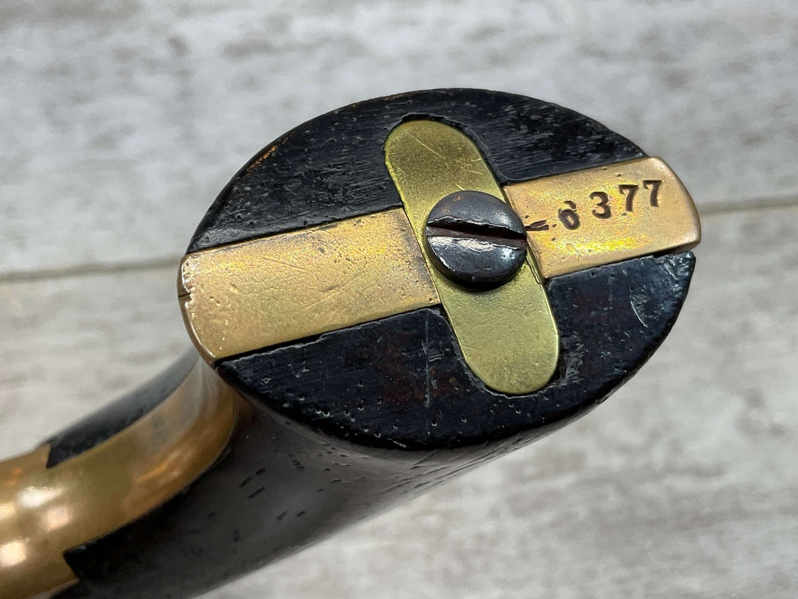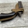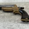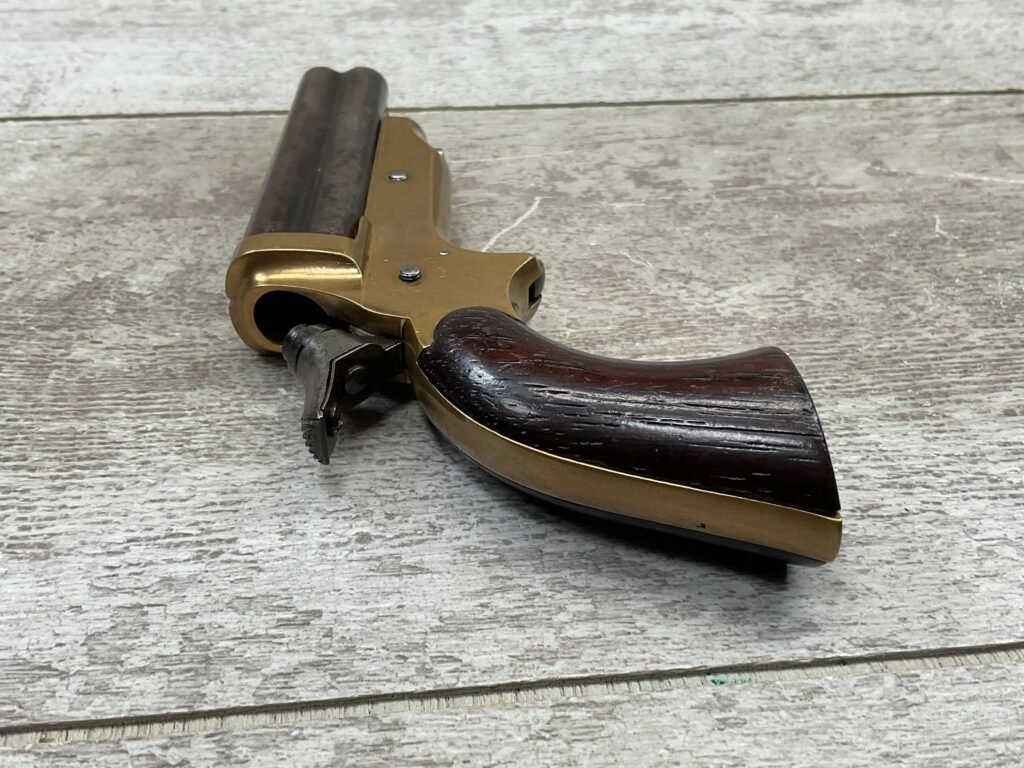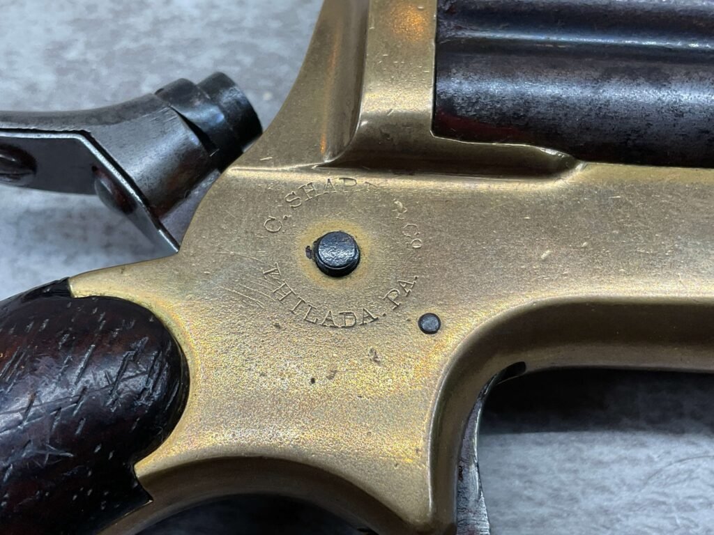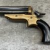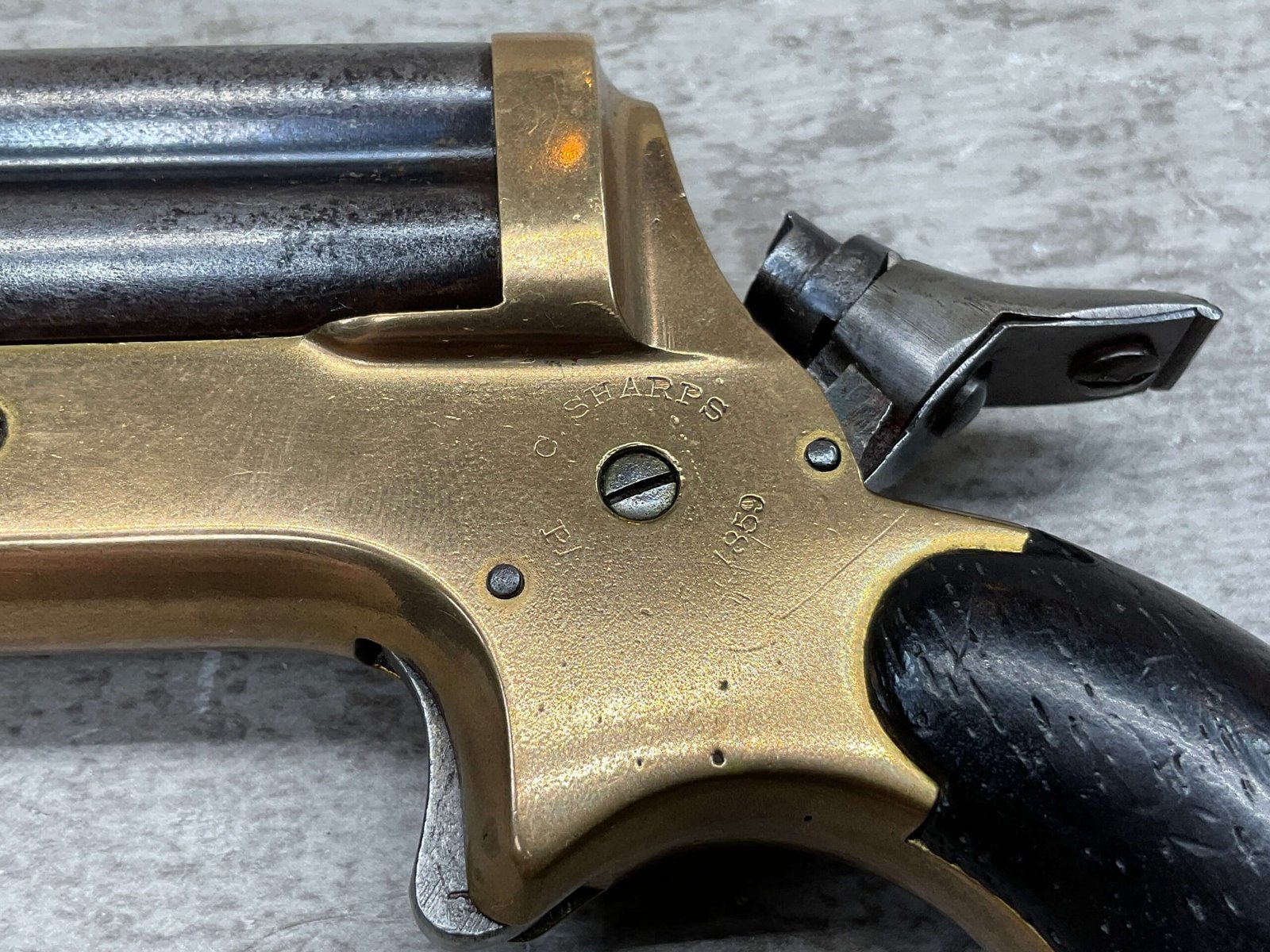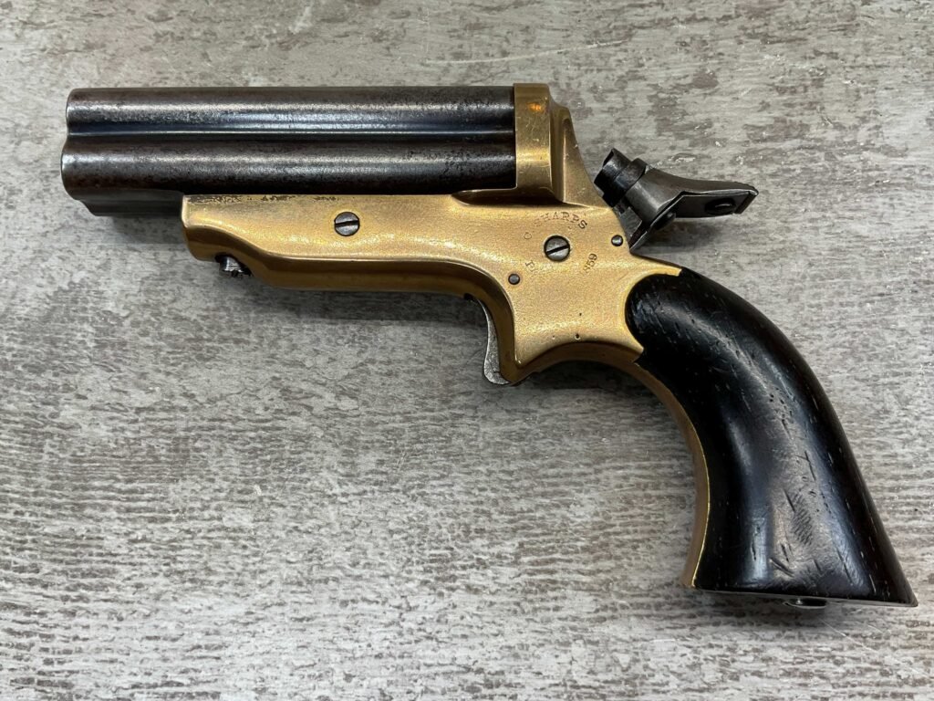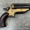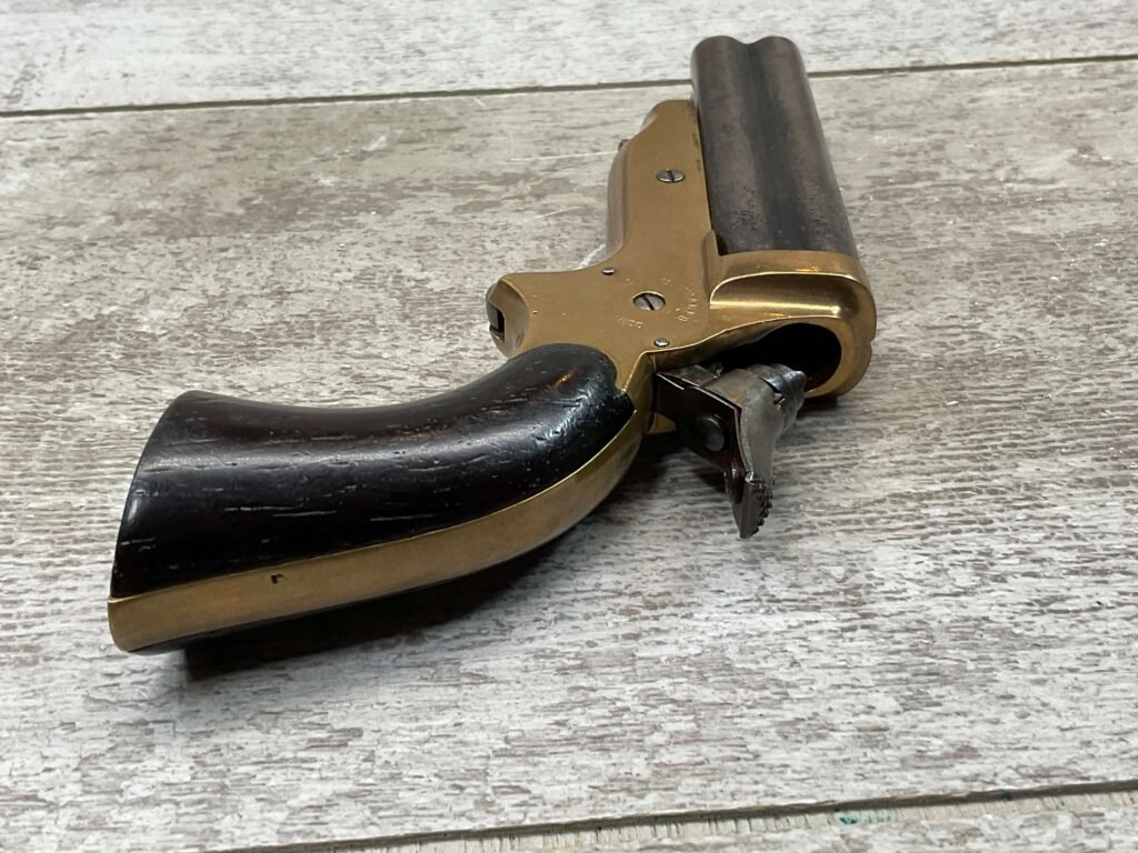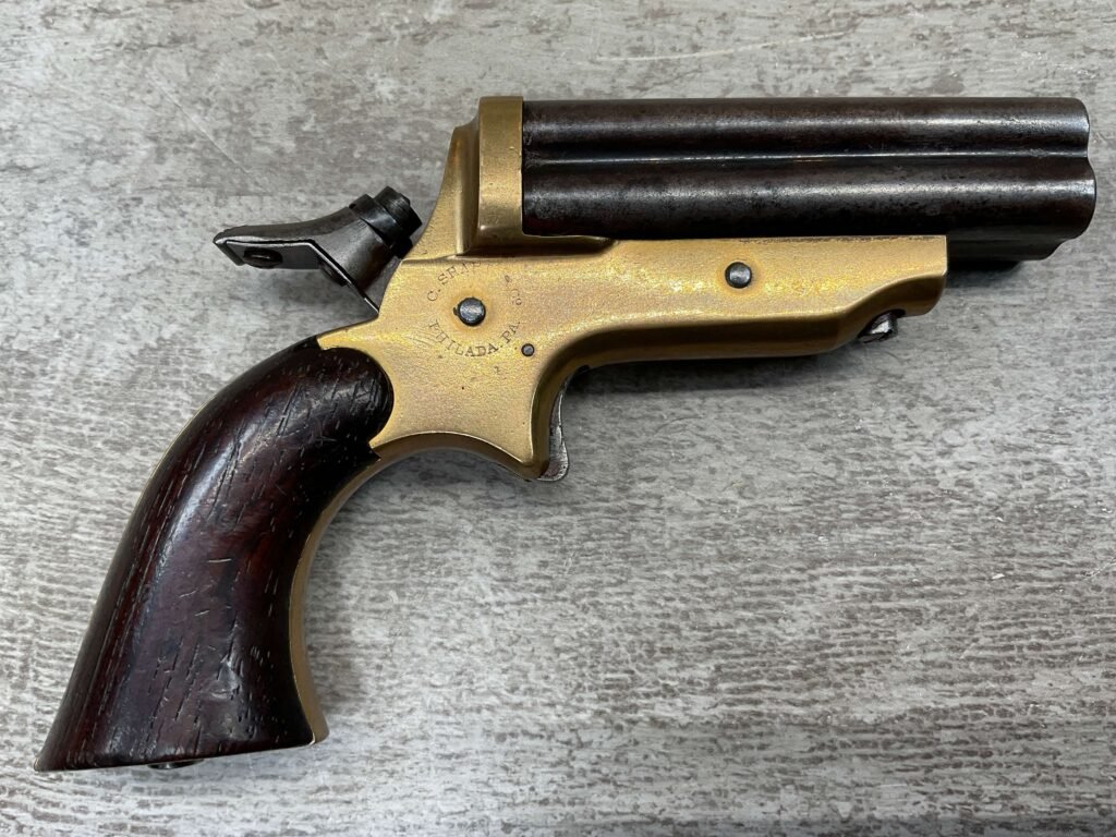 ORIGINAL U.S. 19TH CENTURY SHARPS MODEL 2C, 4 BARREL .32RF PEPPERBOX PISTOL, ANTIQUE #6377, .32 RIM FIRE, 3″ BARRELS W/ DARKER BORE & FROSTING THROUGHOUT, EXC ORIGINAL BRASS FRAME W/ LIGHT NICKS & DINGS, CURRENTLY NON FUNCTIONING (HAMMER FALLS BUT NEEDS HELP, I WOULD THING SOMETHING SIMPLE THAT A GUNSMITH CAN FIX), EXC SMOOTH WALNUT GRIPS, KNURLED HAMMER & SPUR TRIGGER, NOT A REPRODUCTION, OVERALL CONDITION AS SEEN IN PHOTOS