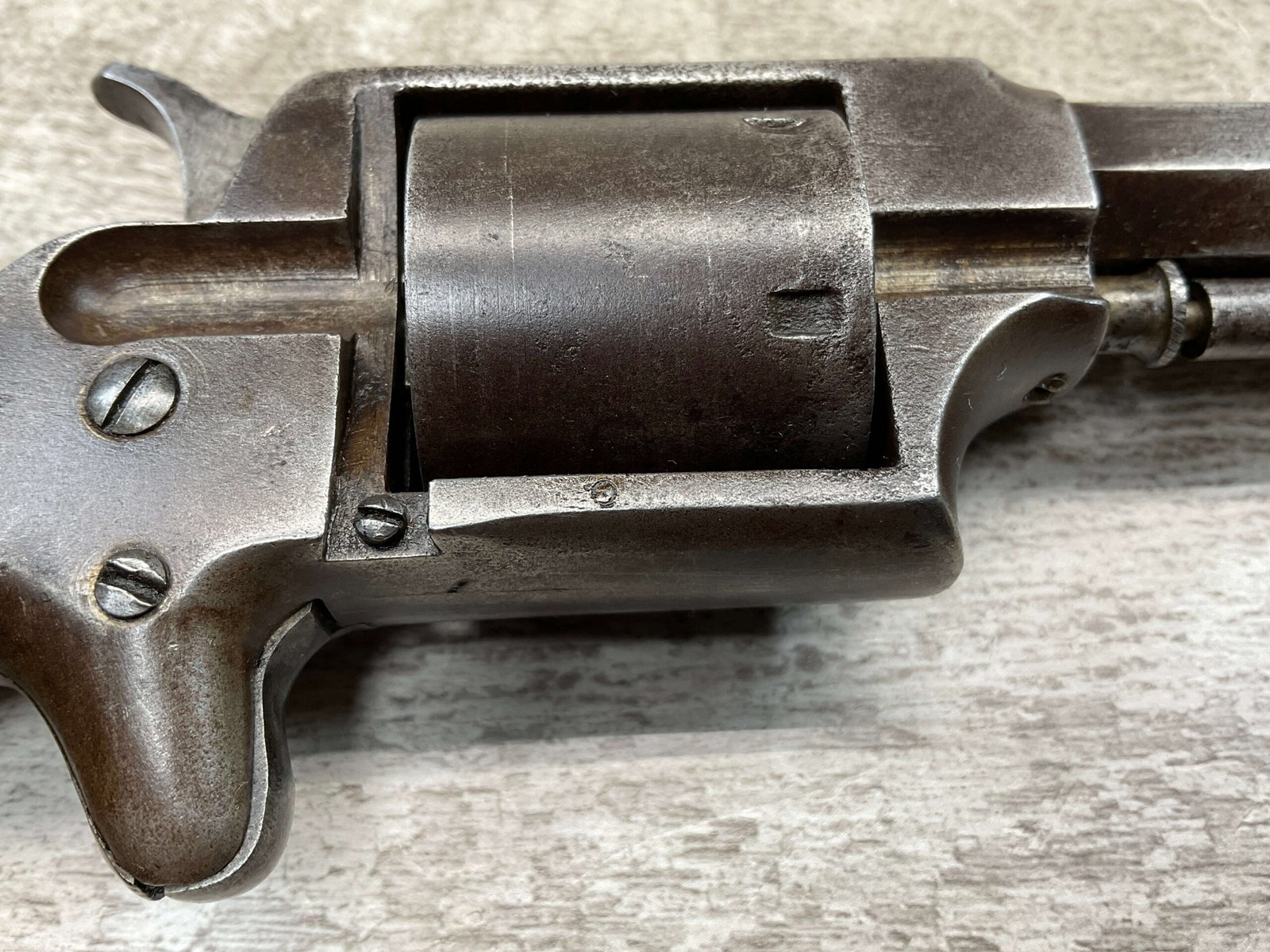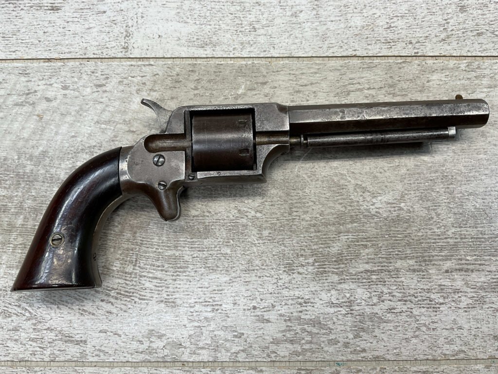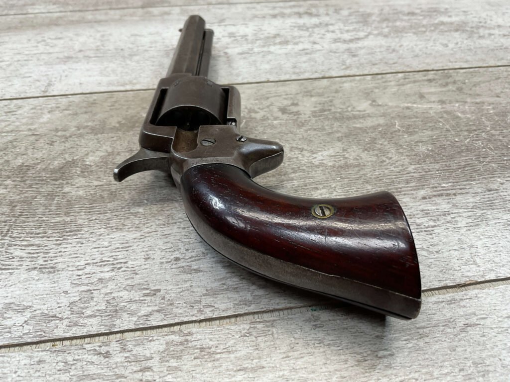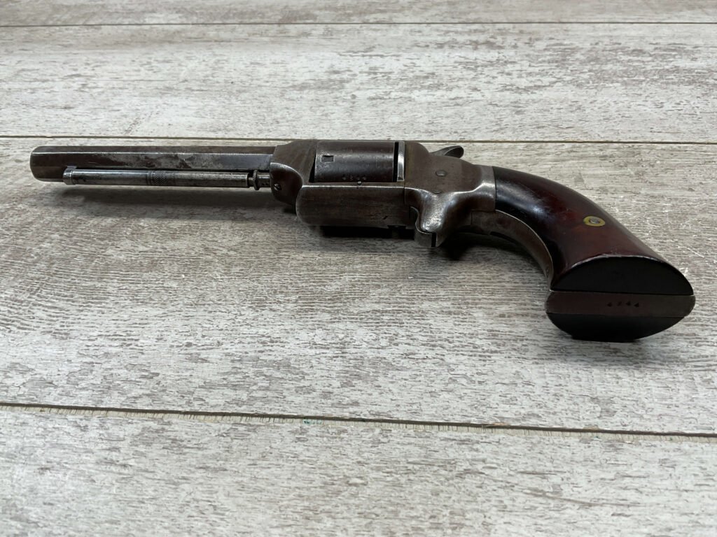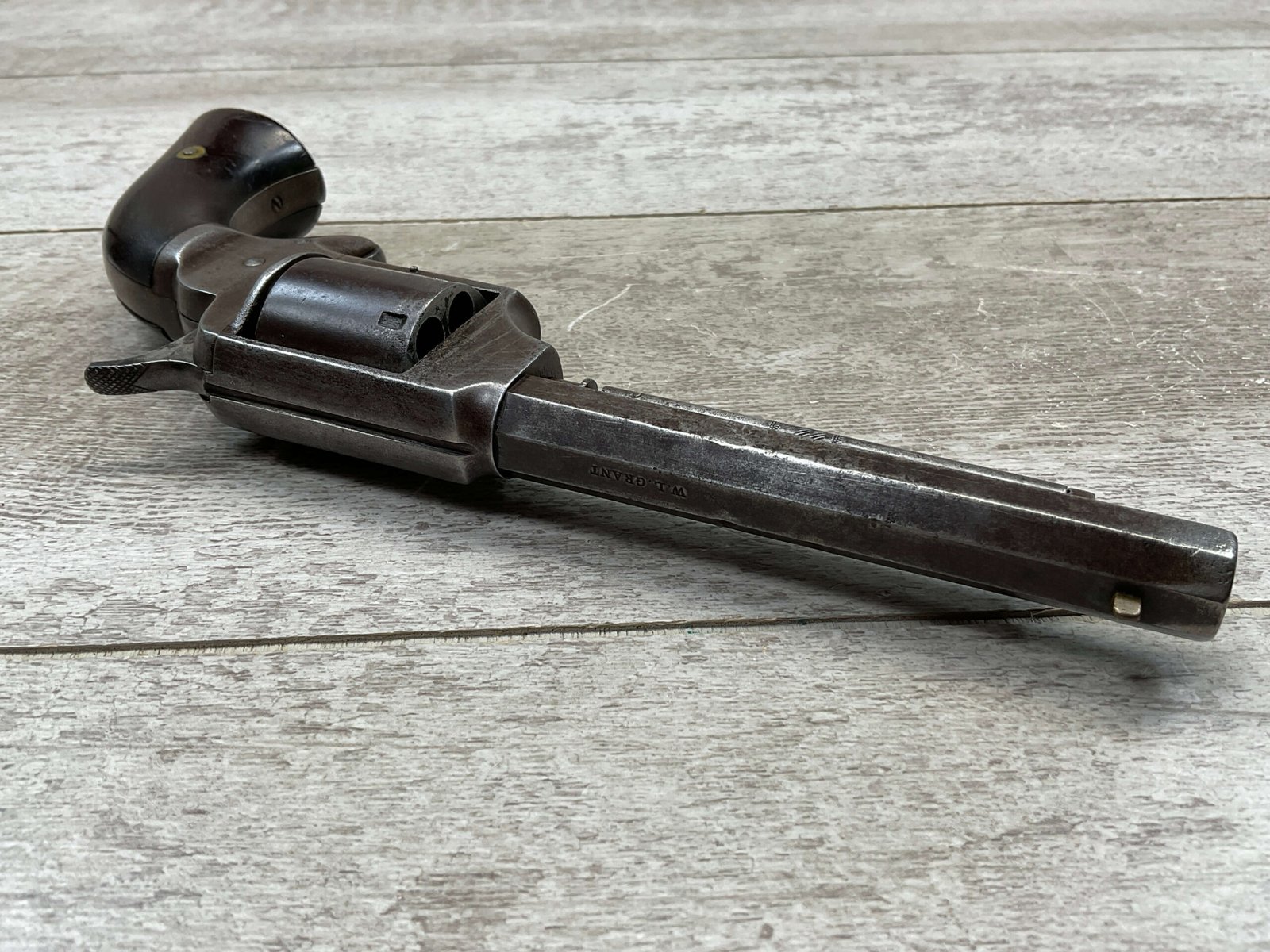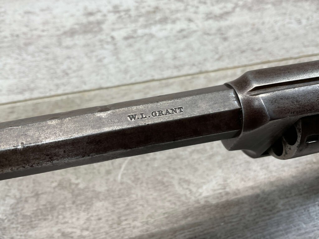 ORIGINAL U.S. CIVIL WAR “W.L. GRANT” UHLINGER .32 RF BREECH LOADING REVOLVER, ANTIQUE #4344, ALL MATCHING, 5″ OCTAGON BARREL W/ HEAVY DINGS, FINISH HAS TURNED GREY/BROWN PATINA, CYLINDER ADVANCES PROPERLY BUT IS NOT TIGHT, SPUR TRIGGER, NOT A REPRODUCTION, OVERALL CONDITION AS SEEN IN PHOTOS!!