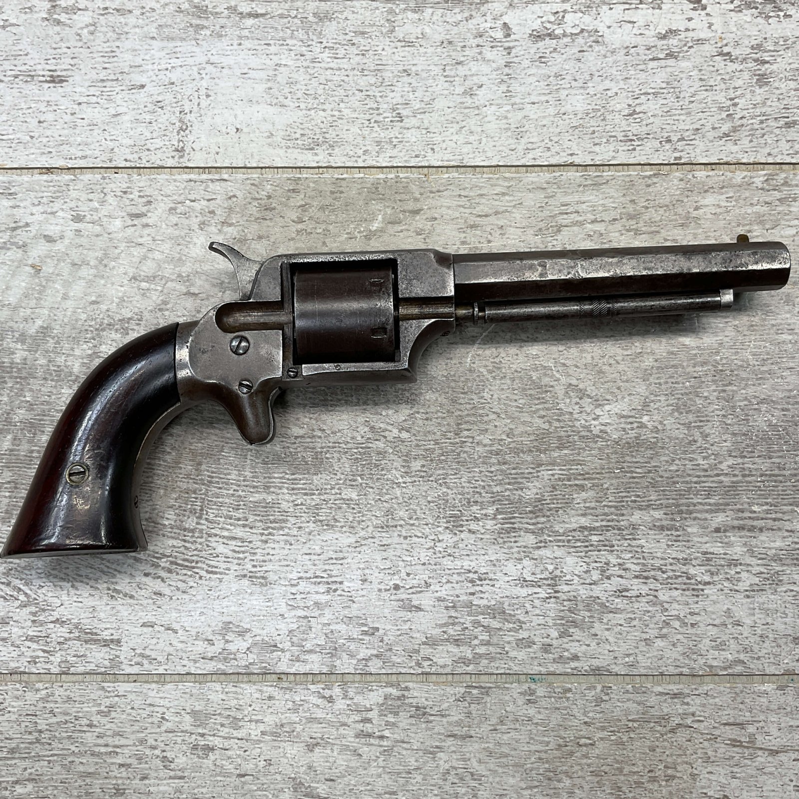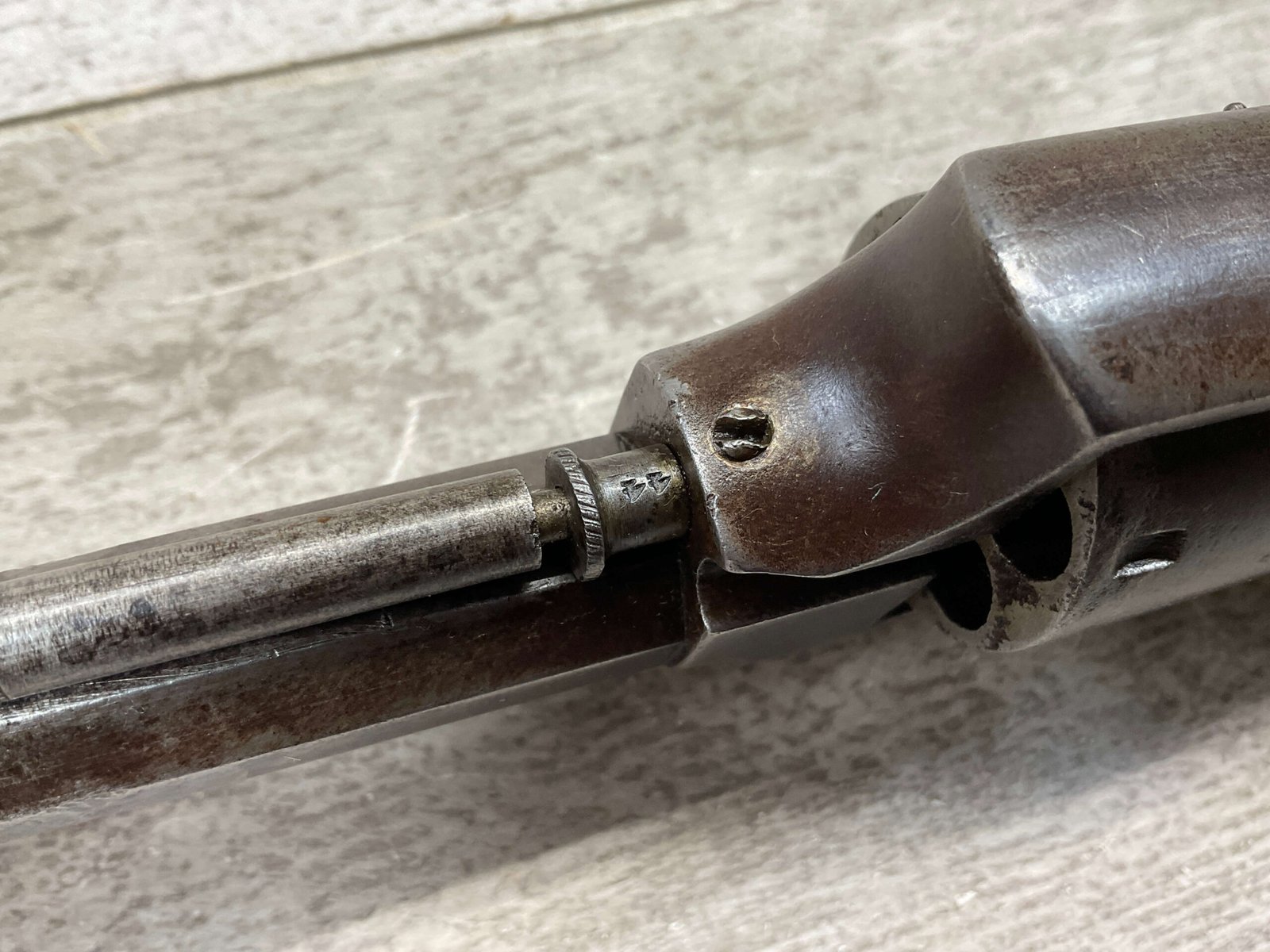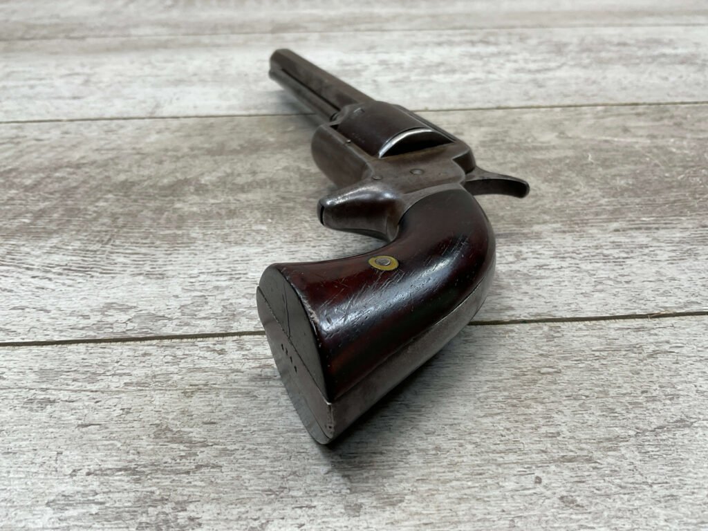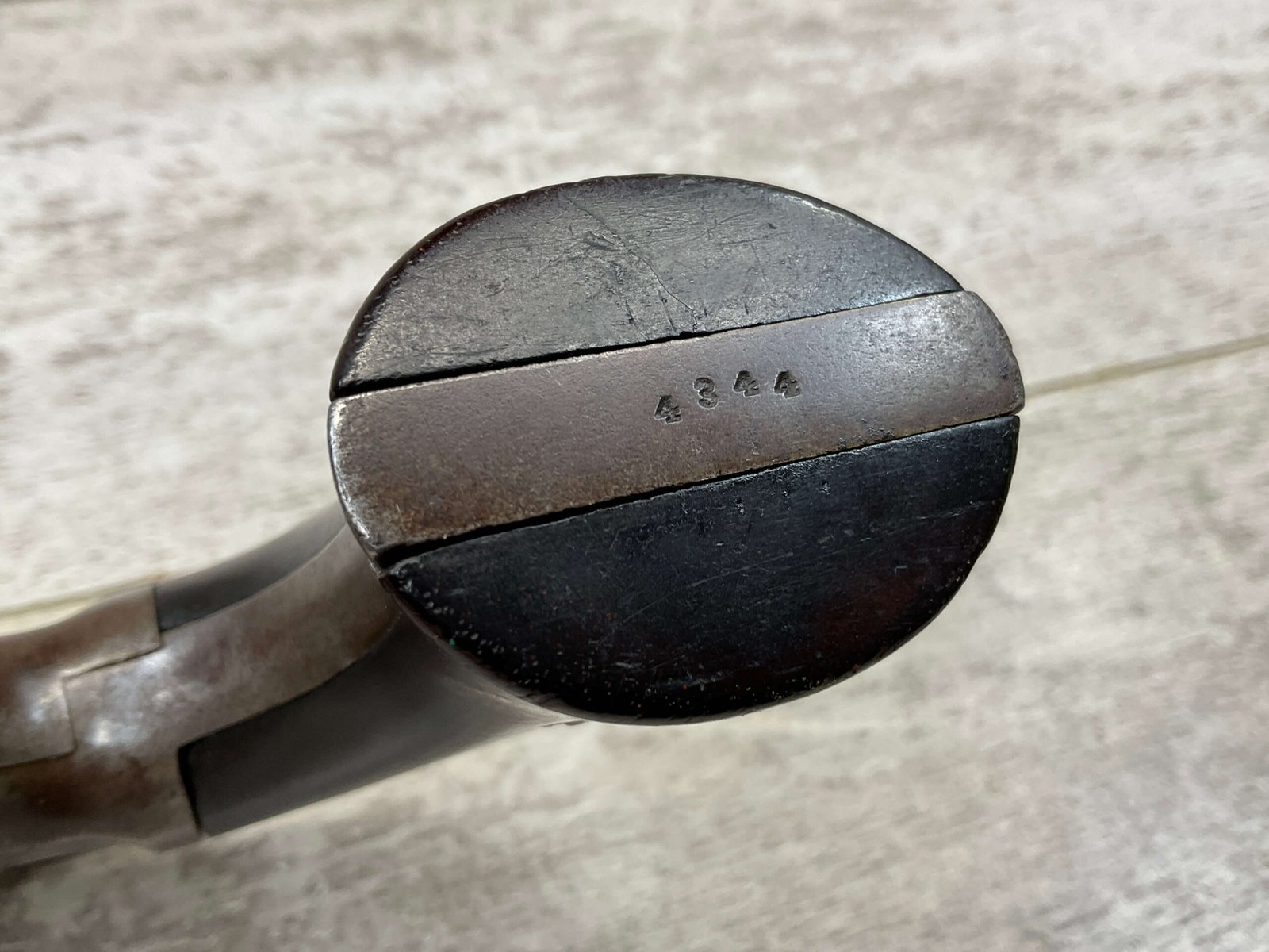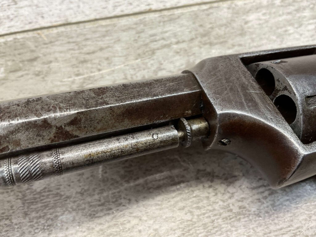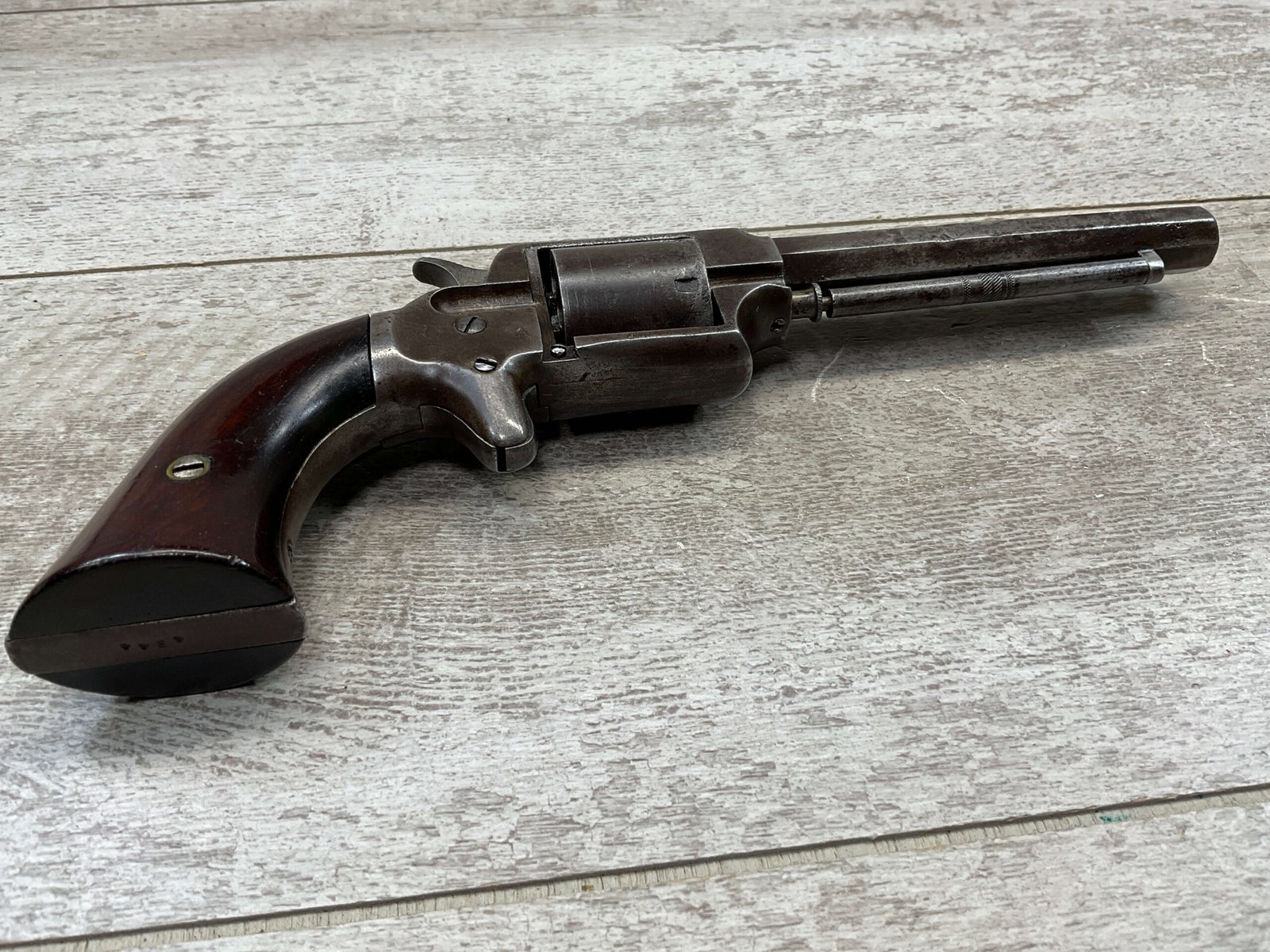 ORIGINAL U.S. CIVIL WAR “W.L. GRANT” UHLINGER .32 RF BREECH LOADING REVOLVER, ANTIQUE #4344, ALL MATCHING, 5″ OCTAGON BARREL W/ HEAVY DINGS, FINISH HAS TURNED GREY/BROWN PATINA, CYLINDER ADVANCES PROPERLY BUT IS NOT TIGHT, SPUR TRIGGER, NOT A REPRODUCTION, OVERALL CONDITION AS SEEN IN PHOTOS!!