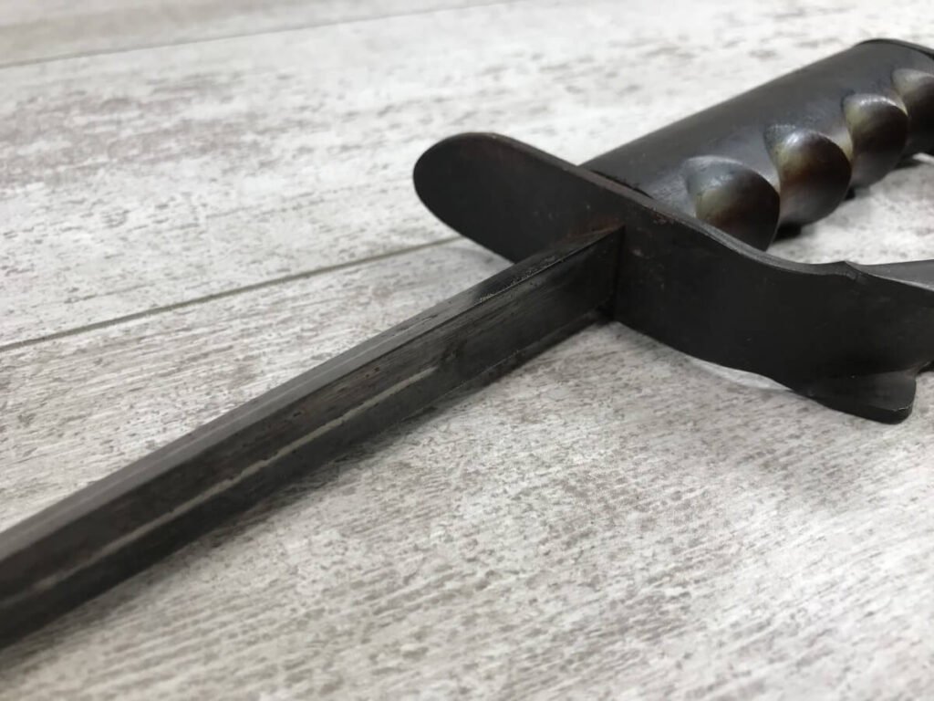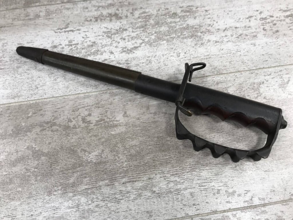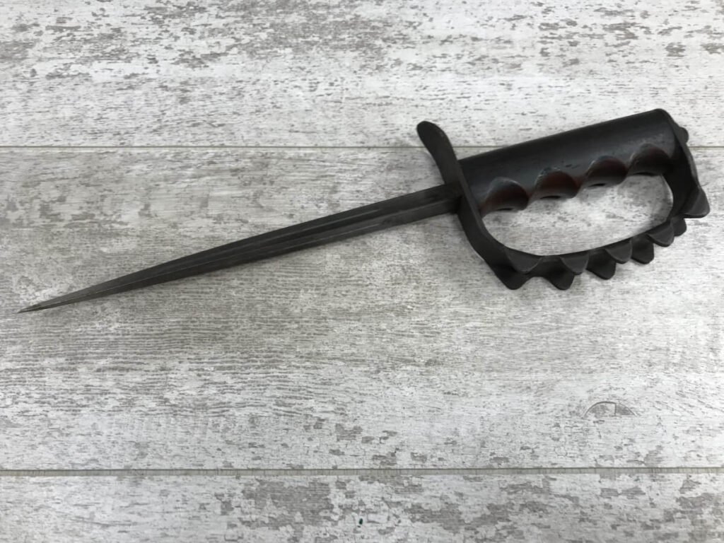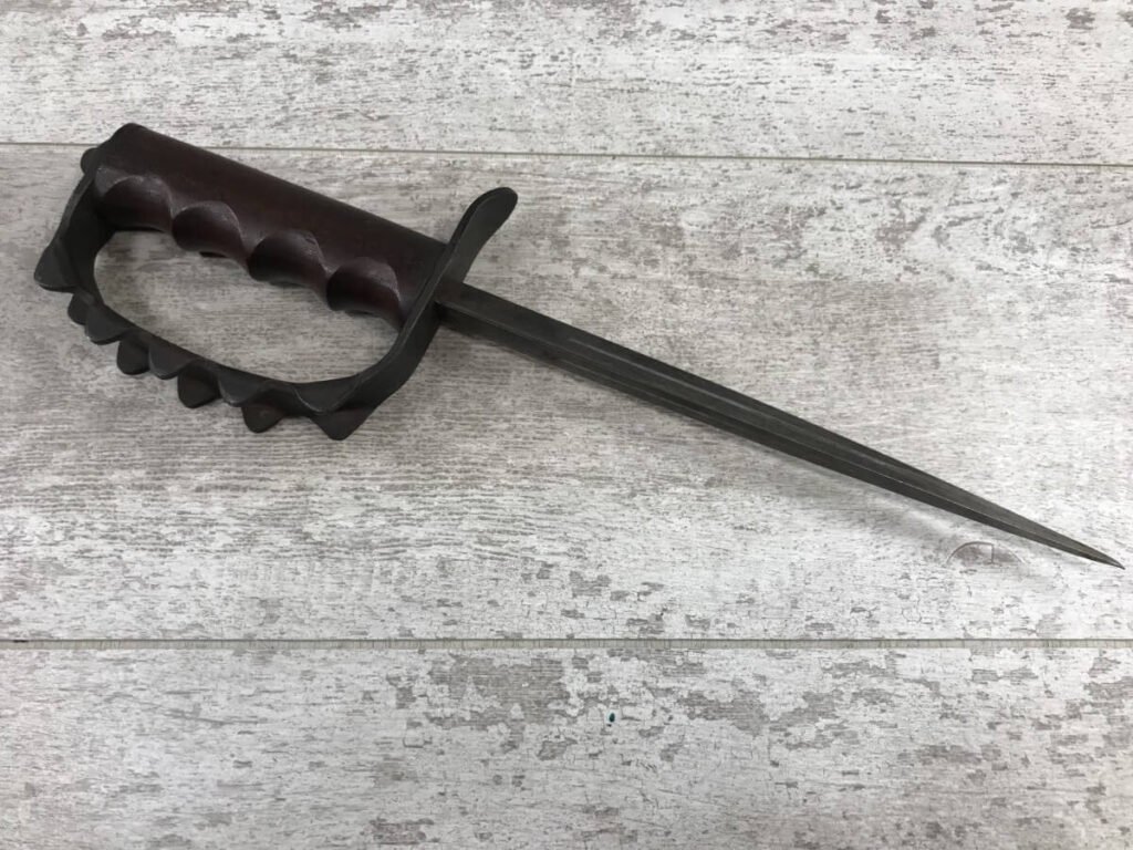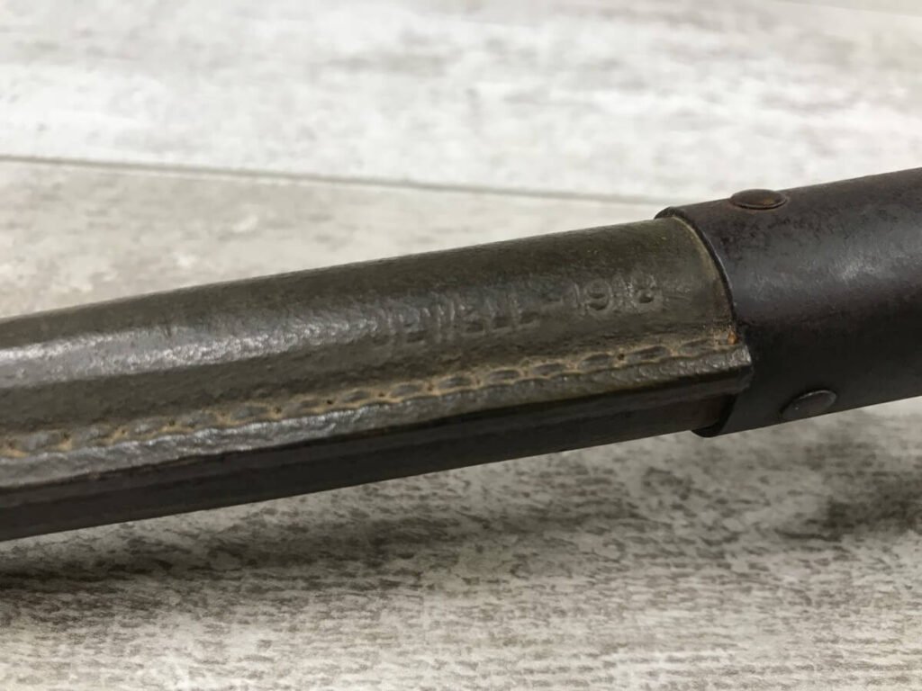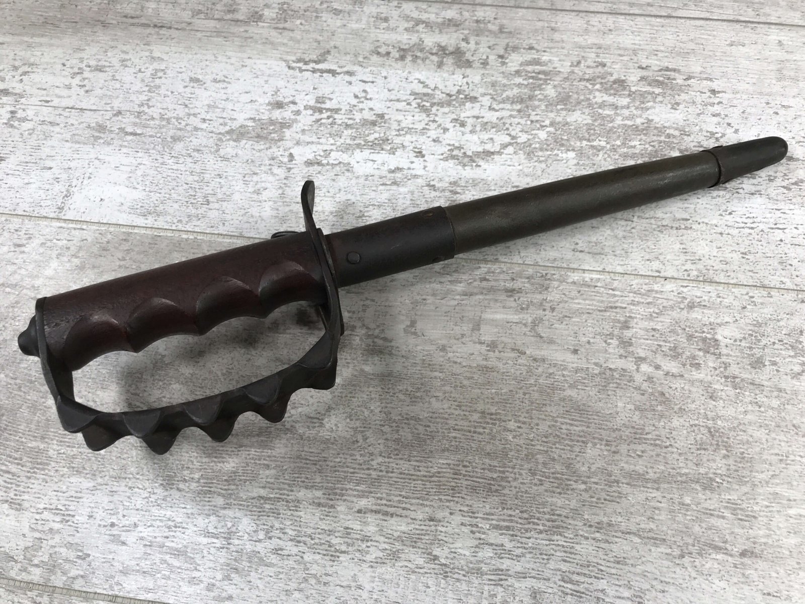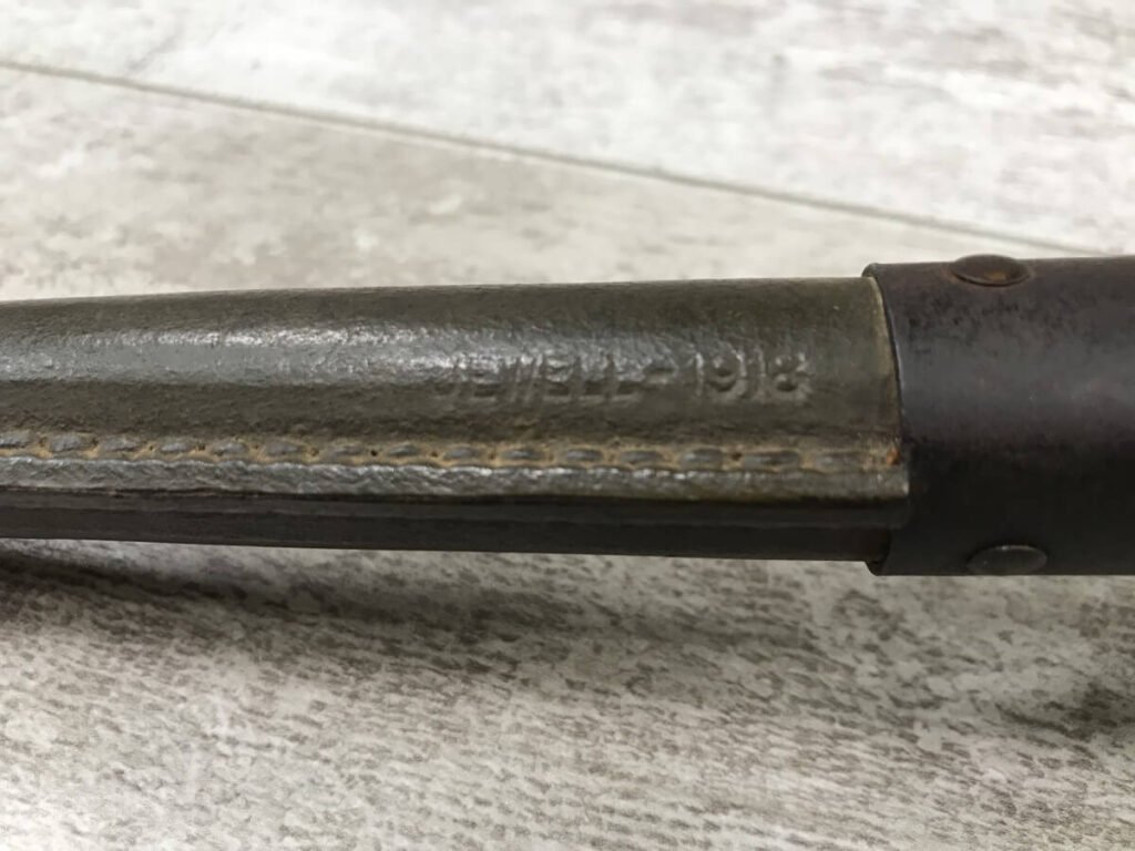 SKU#830 ORIGINAL U.S. WWI M1917 TRENCH KNIFE, JEWEL DATED 1918, TRIANGULAR 9″ STEEL BLADE, STEEL GUARD MARKED “A.C. CO USA 1917”, EXC DARK WOOD GRIP, LEATHER SCABBARD MARKED “JEWELL – 1918”, STANDARD BELT HOOK ATTACHMENT, VERY GOOD OVERALL CONDITION WITH SOME WEAR AND OXIDATION, EXC OVERALL CONDITION