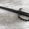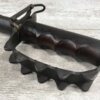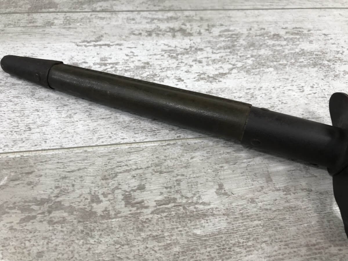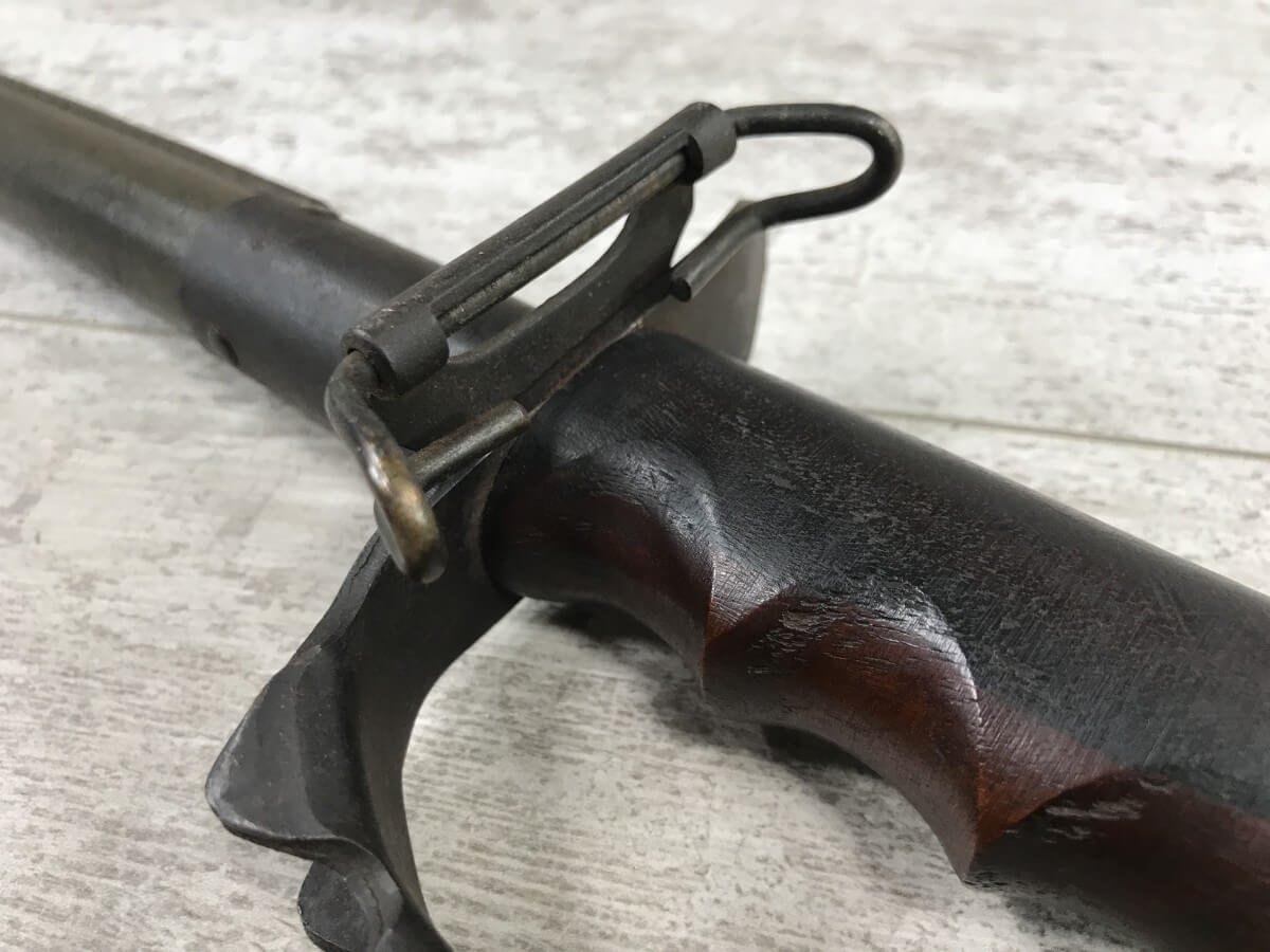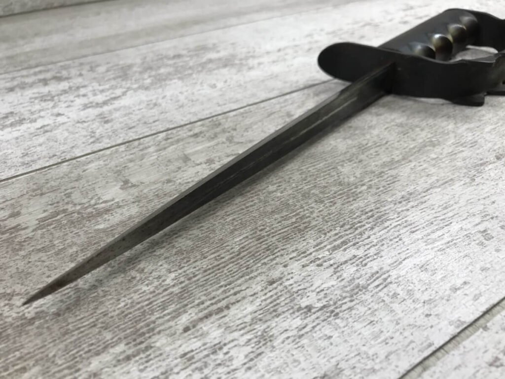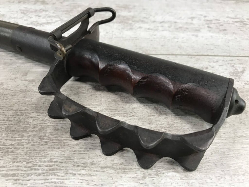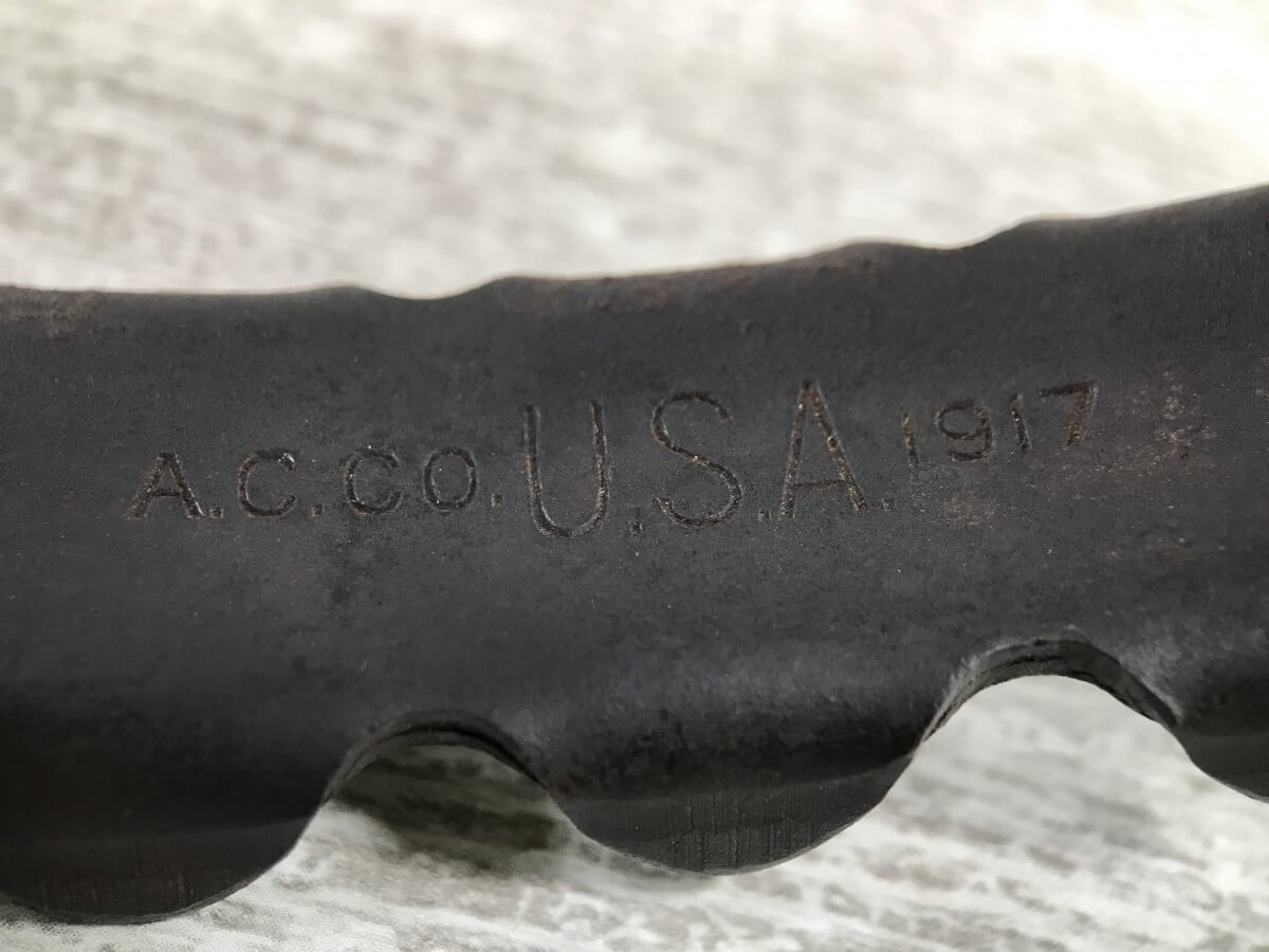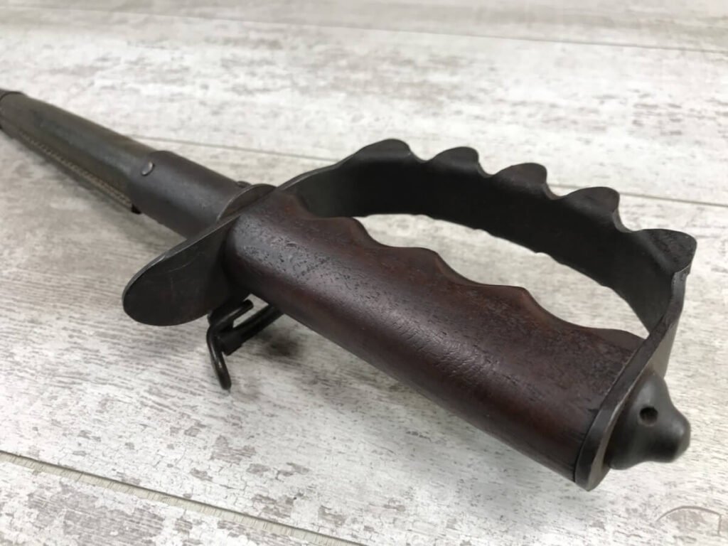 SKU#830 ORIGINAL U.S. WWI M1917 TRENCH KNIFE, JEWEL DATED 1918, TRIANGULAR 9″ STEEL BLADE, STEEL GUARD MARKED “A.C. CO USA 1917”, EXC DARK WOOD GRIP, LEATHER SCABBARD MARKED “JEWELL – 1918”, STANDARD BELT HOOK ATTACHMENT, VERY GOOD OVERALL CONDITION WITH SOME WEAR AND OXIDATION, EXC OVERALL CONDITION