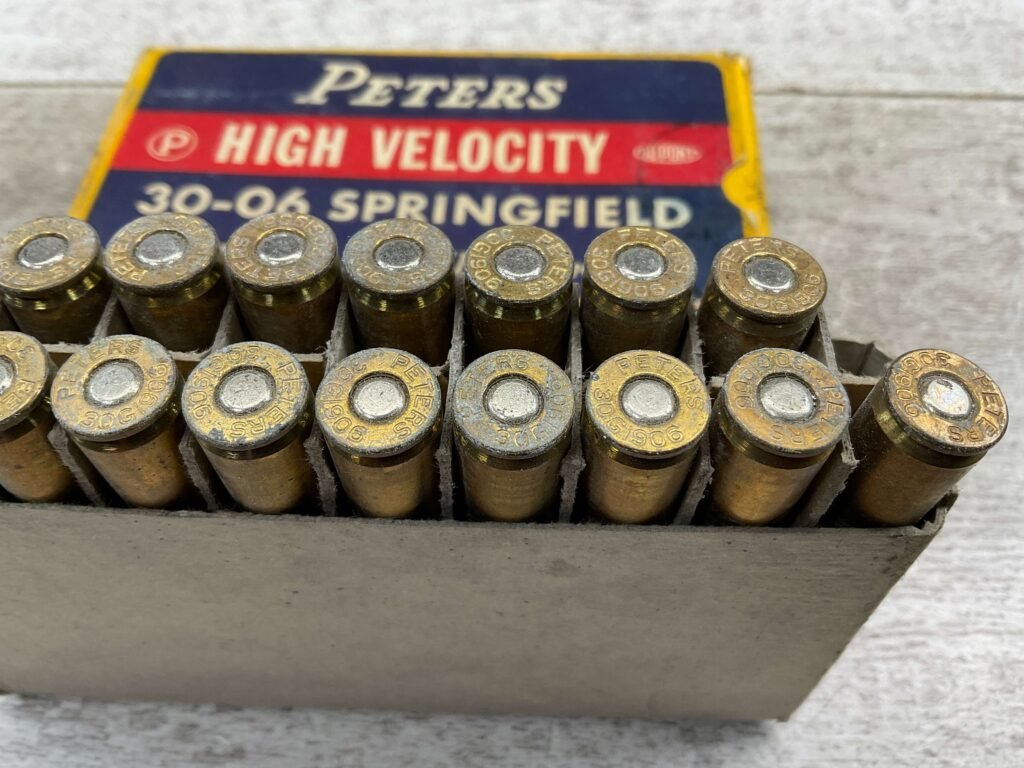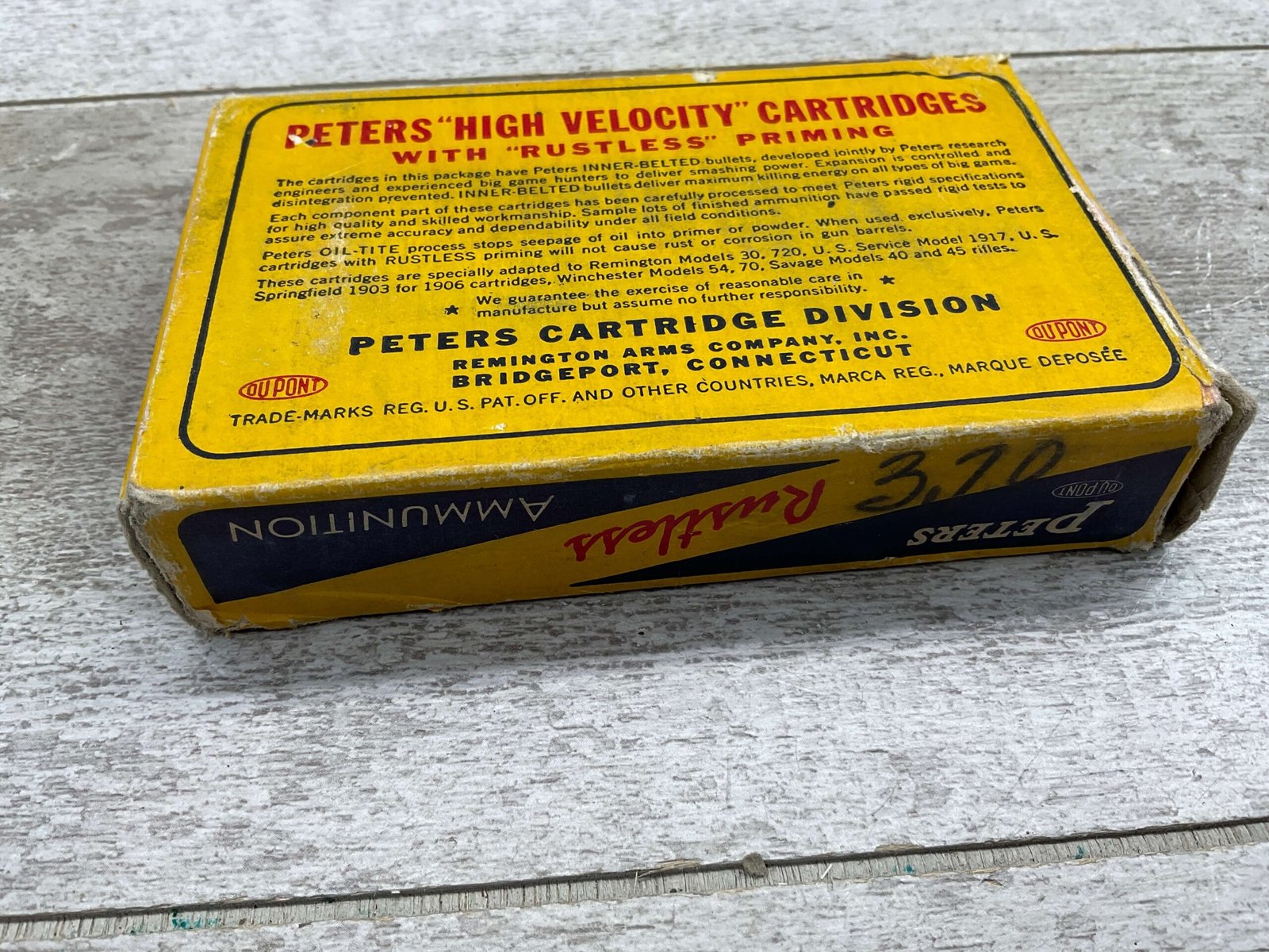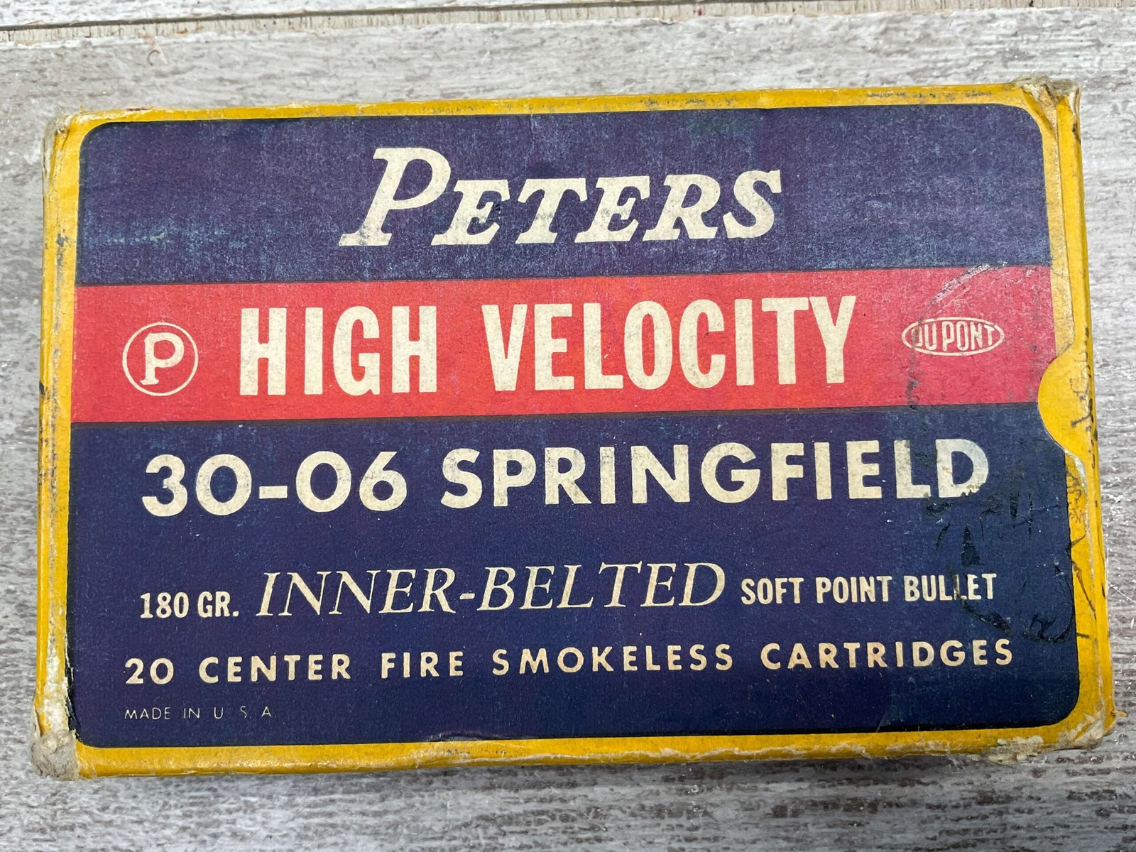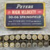 PETERS DUPONT 30-06 SPRINGFIELD, 180 GR. INNER-BELTED HIGH VELOCITY AMMO, QTY 19, VINTAGE, BOX IS IN EXCELLENT CONDITION WITH ONE PIECE OF WRITING “3.70” ON ONE SIDE OF BOX, OTHERWISE DISPLAYS WELL AND IS IN FANTASTIC CONDITION FOR AGE!