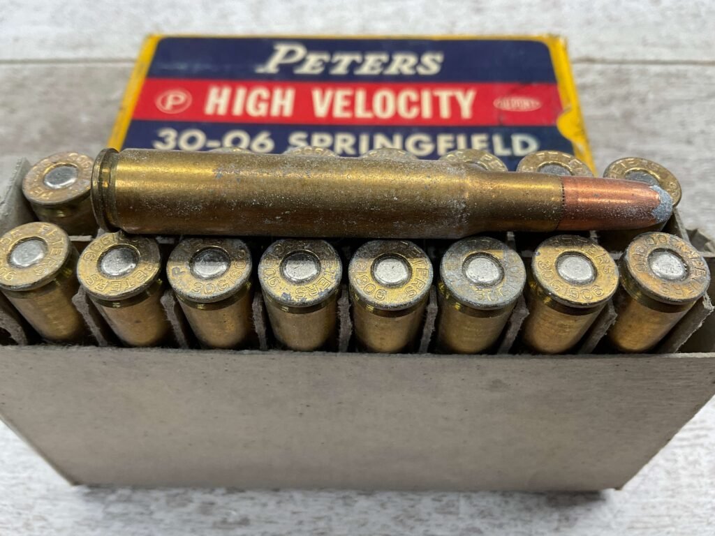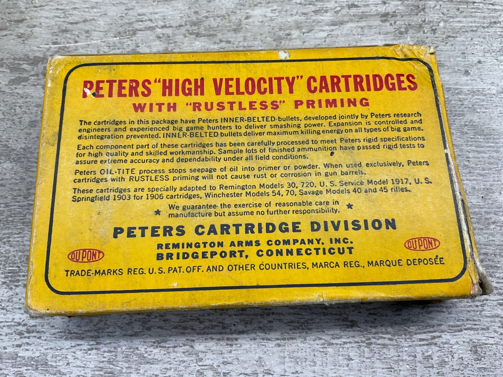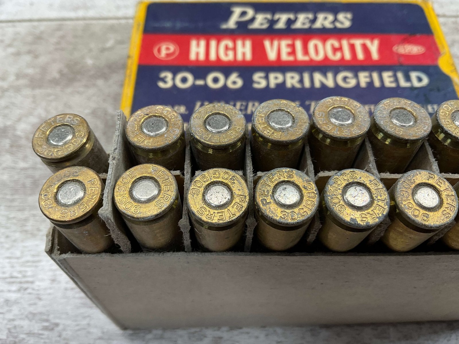 PETERS DUPONT 30-06 SPRINGFIELD, 180 GR. INNER-BELTED HIGH VELOCITY AMMO, QTY 19, VINTAGE, BOX IS IN EXCELLENT CONDITION WITH ONE PIECE OF WRITING “3.70” ON ONE SIDE OF BOX, OTHERWISE DISPLAYS WELL AND IS IN FANTASTIC CONDITION FOR AGE!