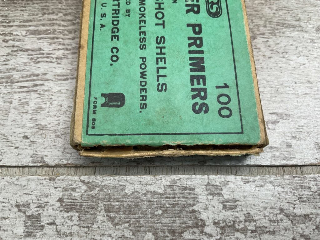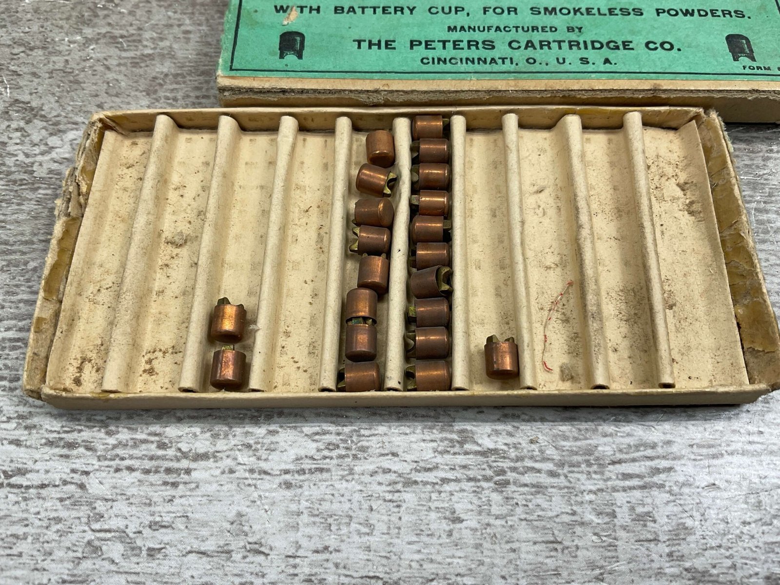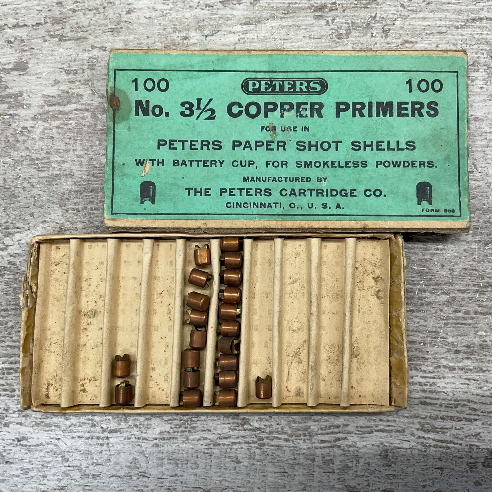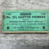PETERS NO. 3 1/2 COPPER PRIMERS, QTY 21, RARE, VINTAGE, BOX IS SLIGHTLY DAMAGED, BUT FRONT IS CLEAR AND READABLE, BOX IS IN GREAT CONDITION FOR AGE