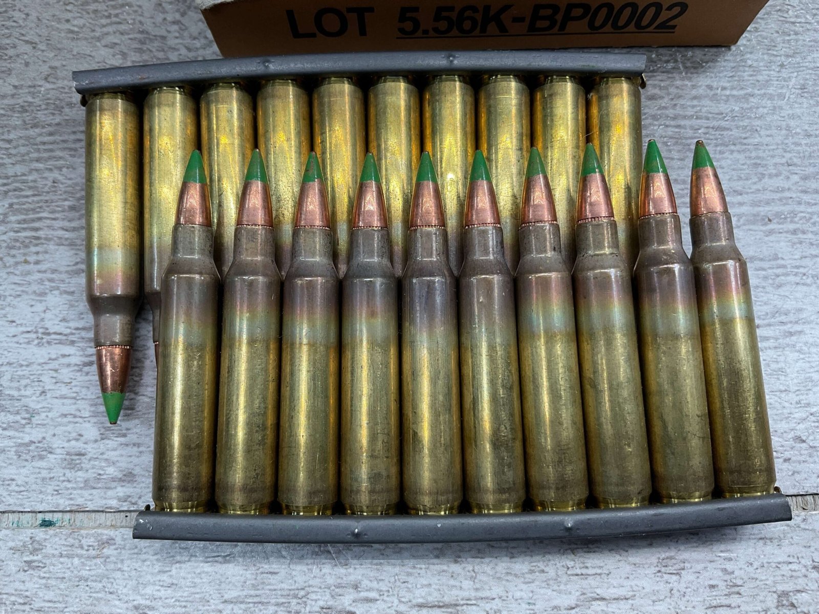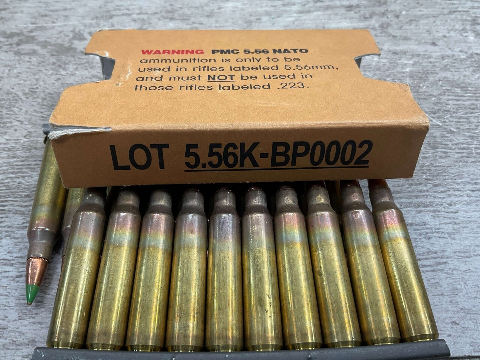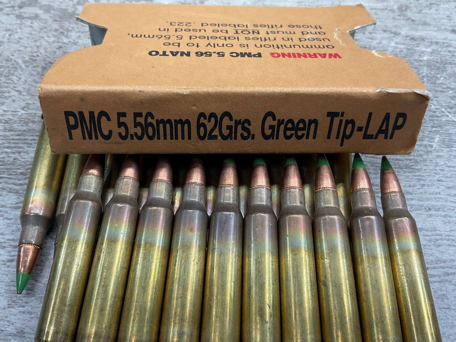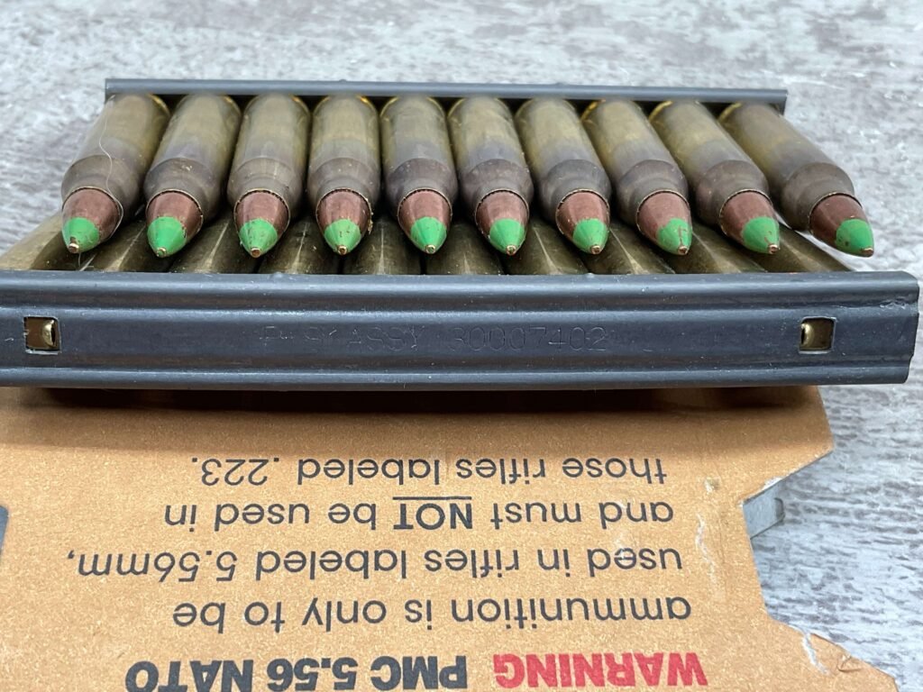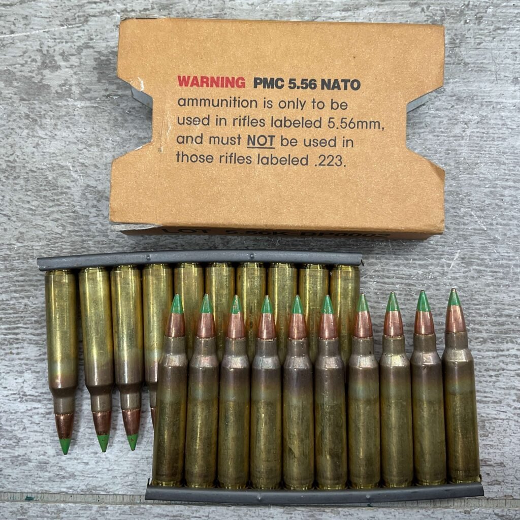 PMC 5.56MM NATO 62 GRS. GREEN TIP-LAP, 20 ROUNDS IN CLIPS, IN GREAT CONDITION