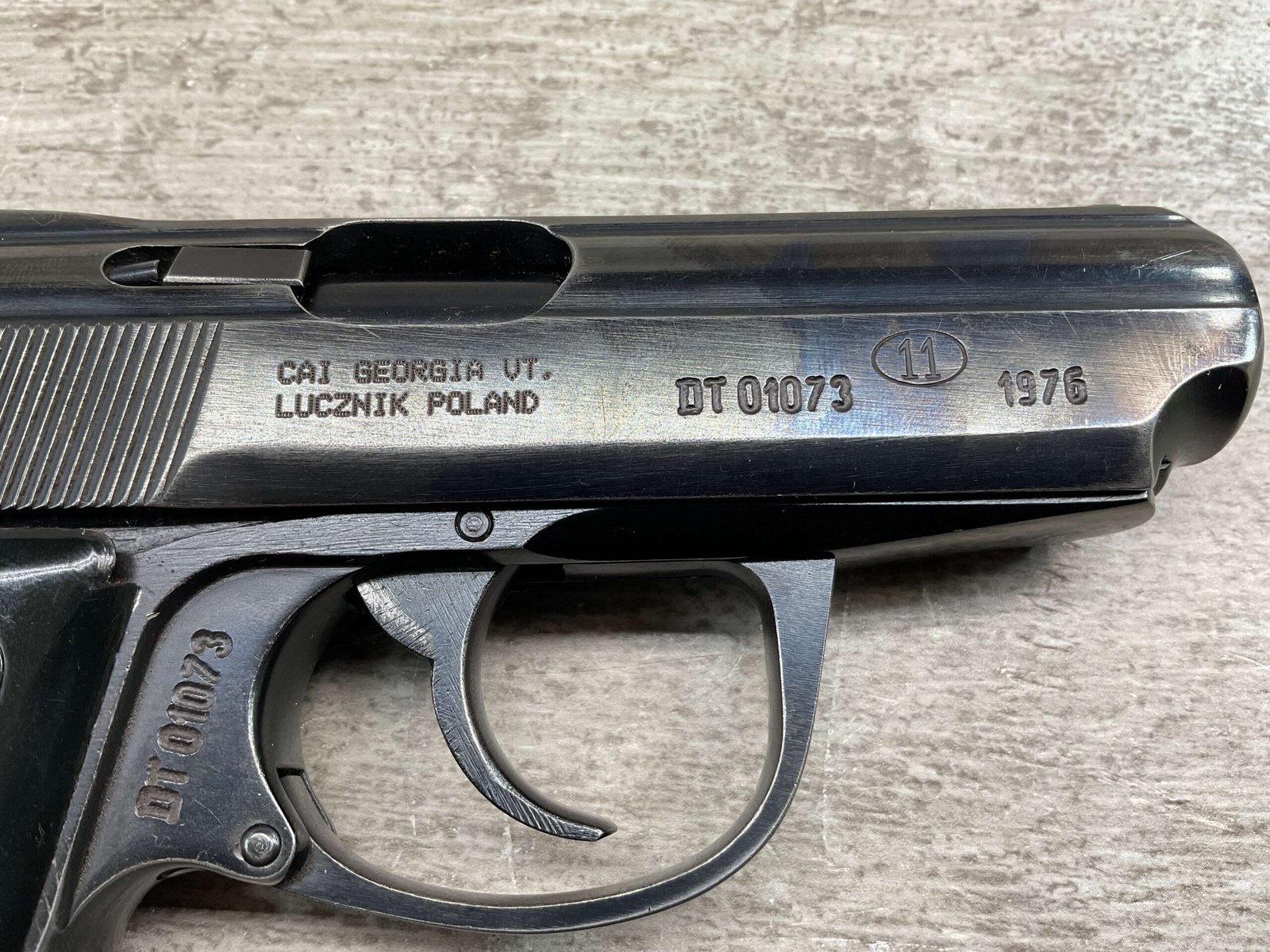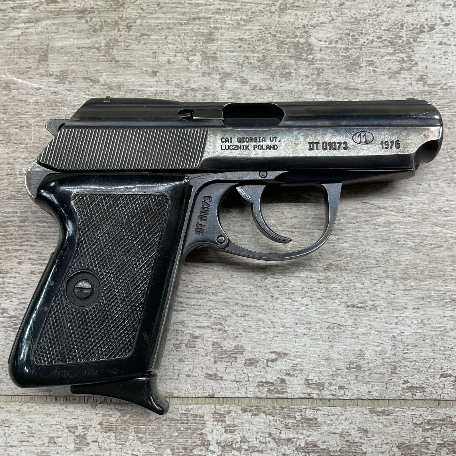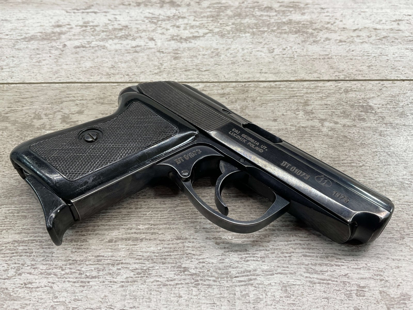 POLISH RADOM P-64, 9MM, SN#DT01073,  POLISH RADOM ARSENAL MARKED AND DATED 1976,  IMPORT MARKED ON RIGHT SIDE OF SLIDE, NUMBERS MATCHING INCLUDING MAGAZINE, MINTY BORE AND RIFLING, ORIGINAL BLUE, LIGHT HOLSTER WEAR ON HIGH EDGE, OVERALL A 95+% PISTOL.