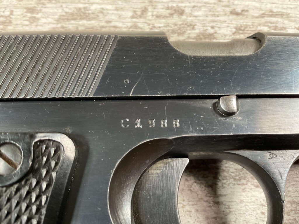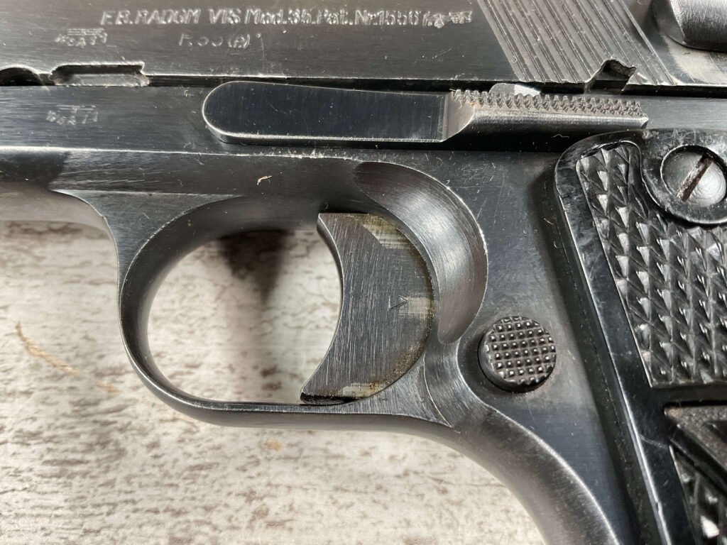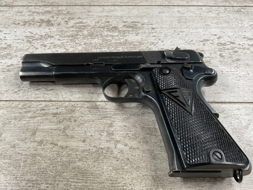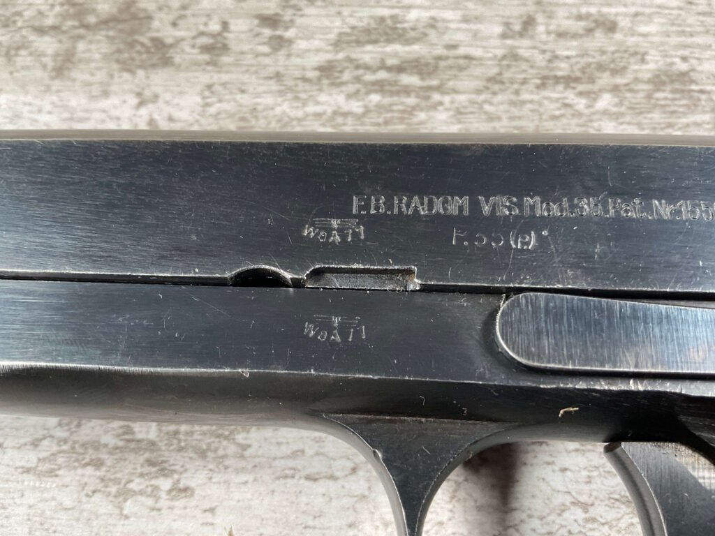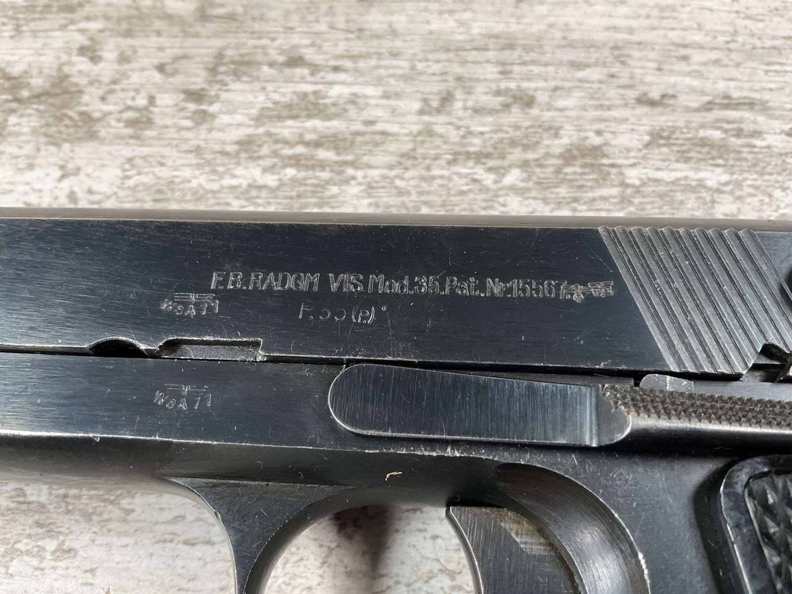 GERMAN RADOM VIS 35 9MM PISTOL #C 1588, EARLY TO 1942 MFR, GRADE I, SUB VARIATION 1, 3 LEVER, STOCK SLOT, ALL MATCHING, EXC ORIGINAL BLACK CHECKERED GRIPS “FB” ON LEFT & “VIS” ON RIGHT, “F.B. Radom Vis Mod. 35 Pat.Nr. 15567†ON LEFT SIDE OF SLIDE, “WaA/77” PROOF ON SLIDE AND FRAME “E/623” ON SLIDE AND BARREL, EXC BORE & RIFLING (9/10), 2 MAGAZINES BOTH E/188 MARKED, VERY LIGHT HIGH EDGE WEAR RETAINING APPROX 95+% OF FINISH, EXC OVERALL FUNCTIONALLY, VG BROWN HOLSTER W/EXC STITCHING, THIS IS A RARE ONE!!