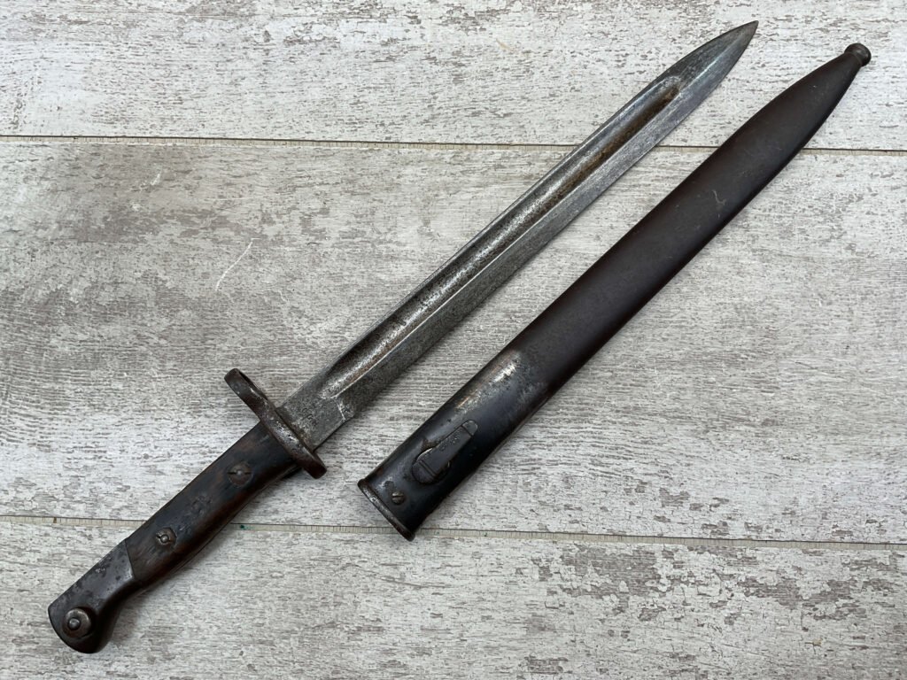 PORTUGAL M1904 BAYONET & SCABBARD BY C.G.H., 15 15/16″ OVERALL LENGTH, 11 3/8″ BLADE LENGTH, BLADE MARKED “C.G.H.”, VG OVERALL
