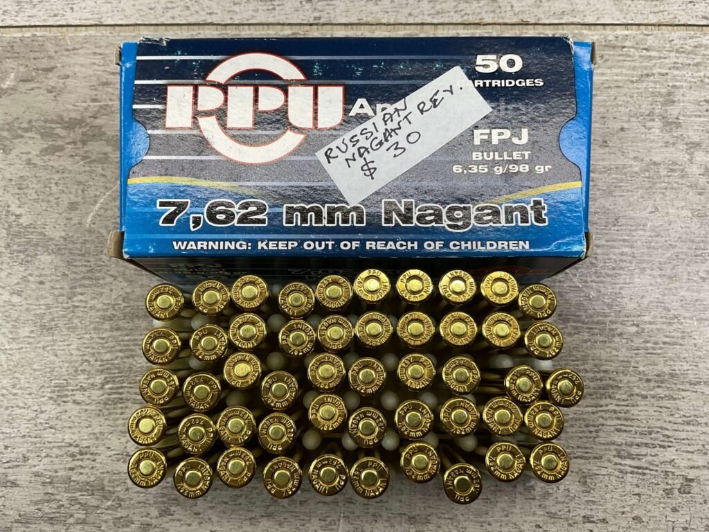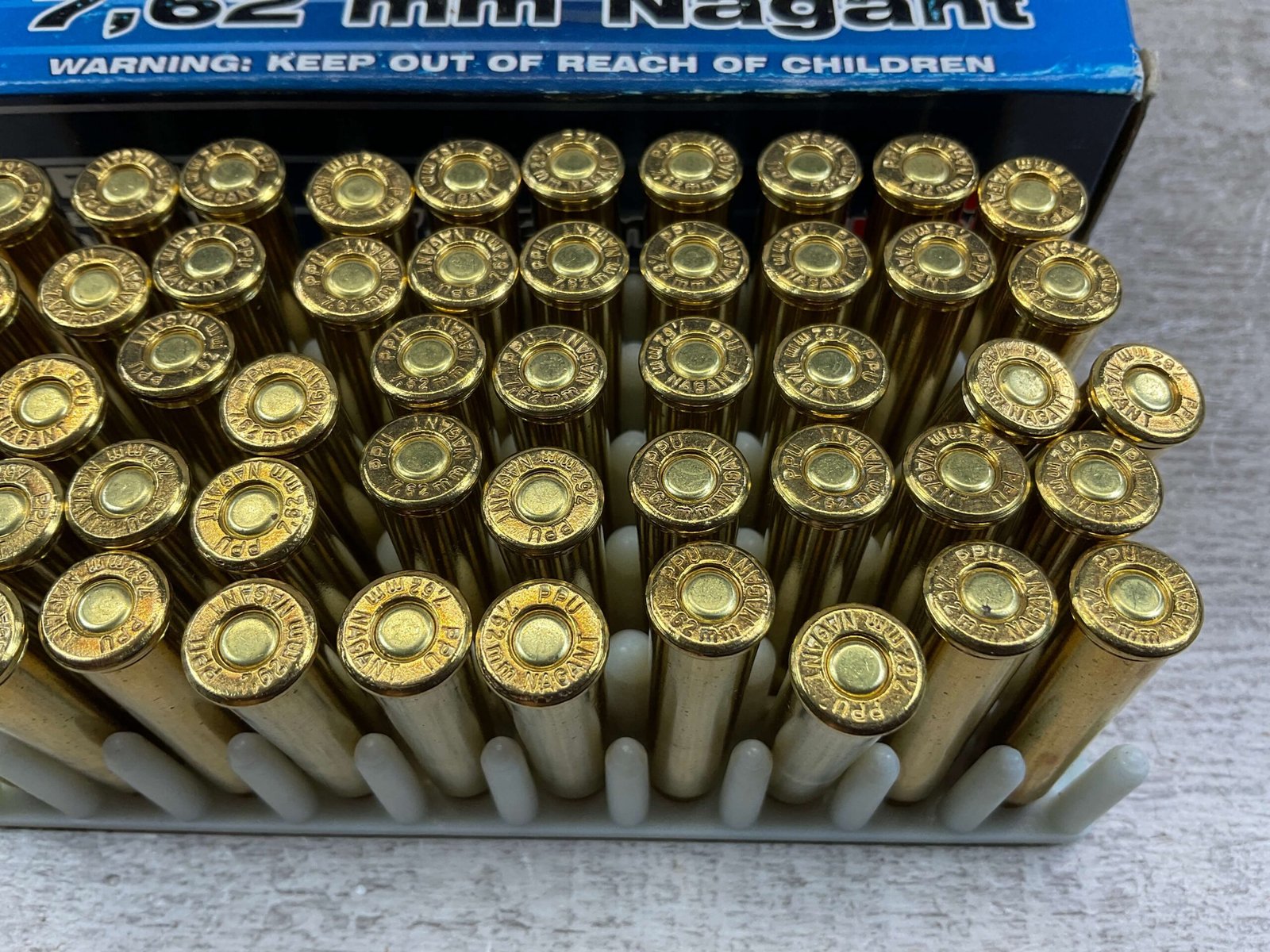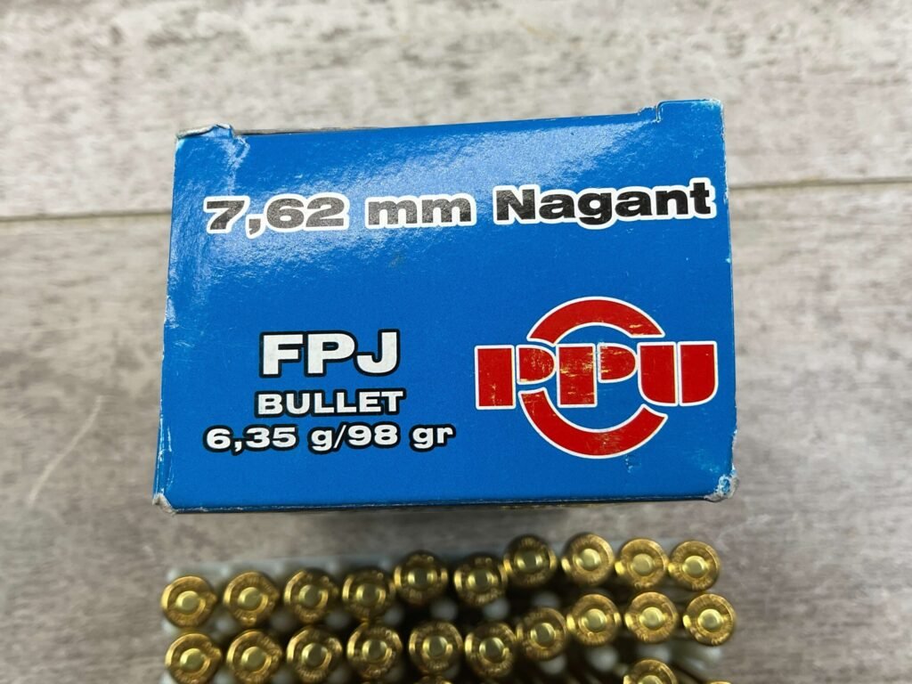 PPU 7.62 NAGANT 98 GR FPJ RUSSIAN AMMO, FULL BOX, HAS PRICE STICKER ON FRONT OF BOX OTHERWISE IN VG CONDITION!