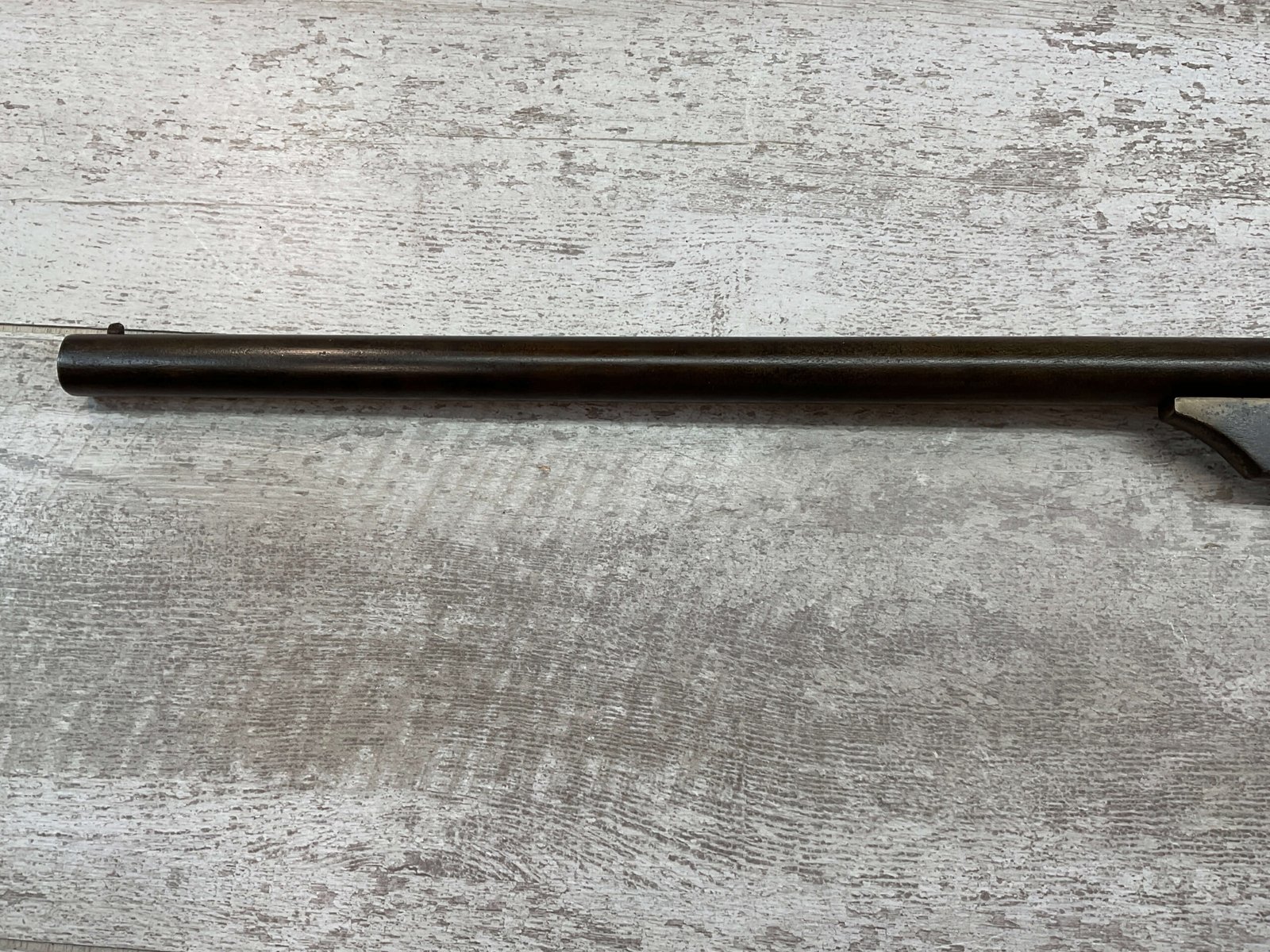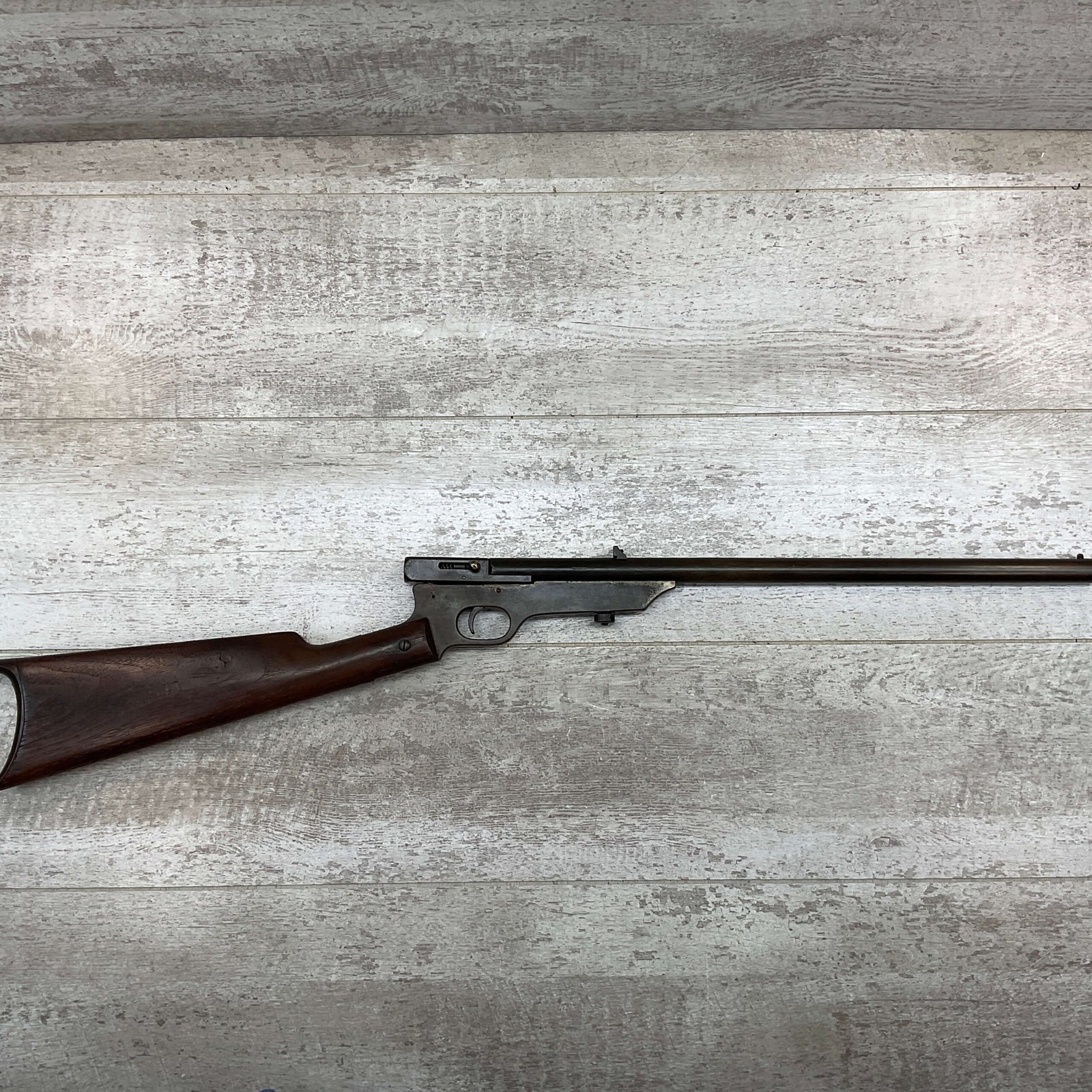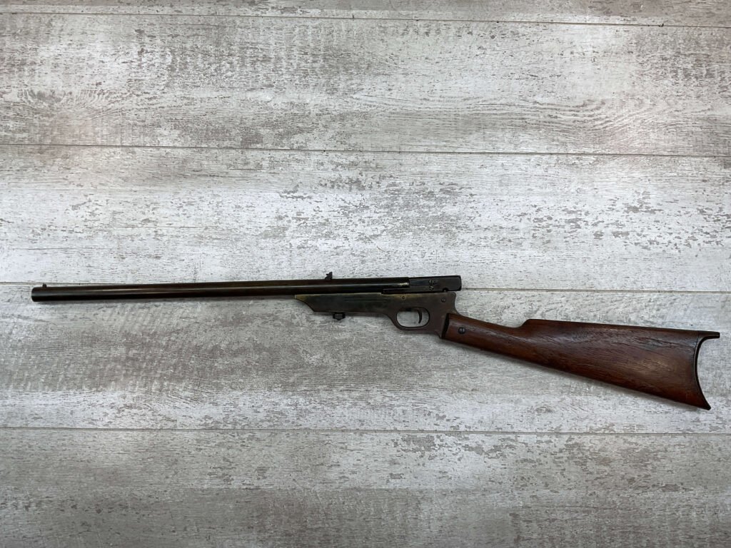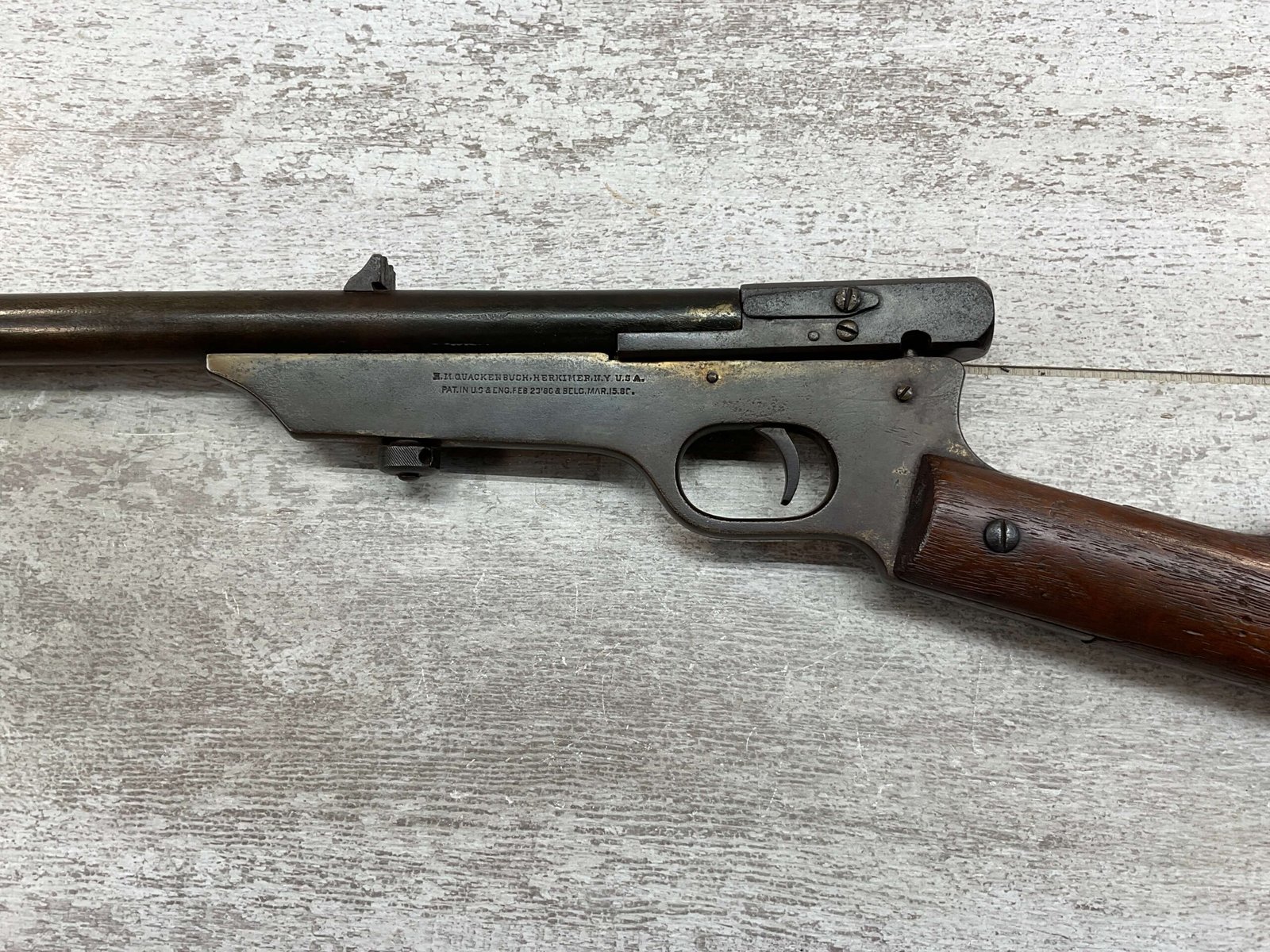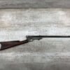 QUACKENBUSH .22 LR SINGLE SHOT SWINGING BLOCK RIFLE #NSN,18″ ROUND BULL BARREL, RECEIVER & BBL HAVE TURNED DARK BROWN PATINA, STRAIGHT WALNUT GRIP STOCK W/SMALL CRACK ON UNDERSIDE, OPEN SIGHT, METAL CRESCENT BUTT PLATE, TAKEDOWN ACTION, 1886-1922 MFR