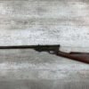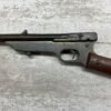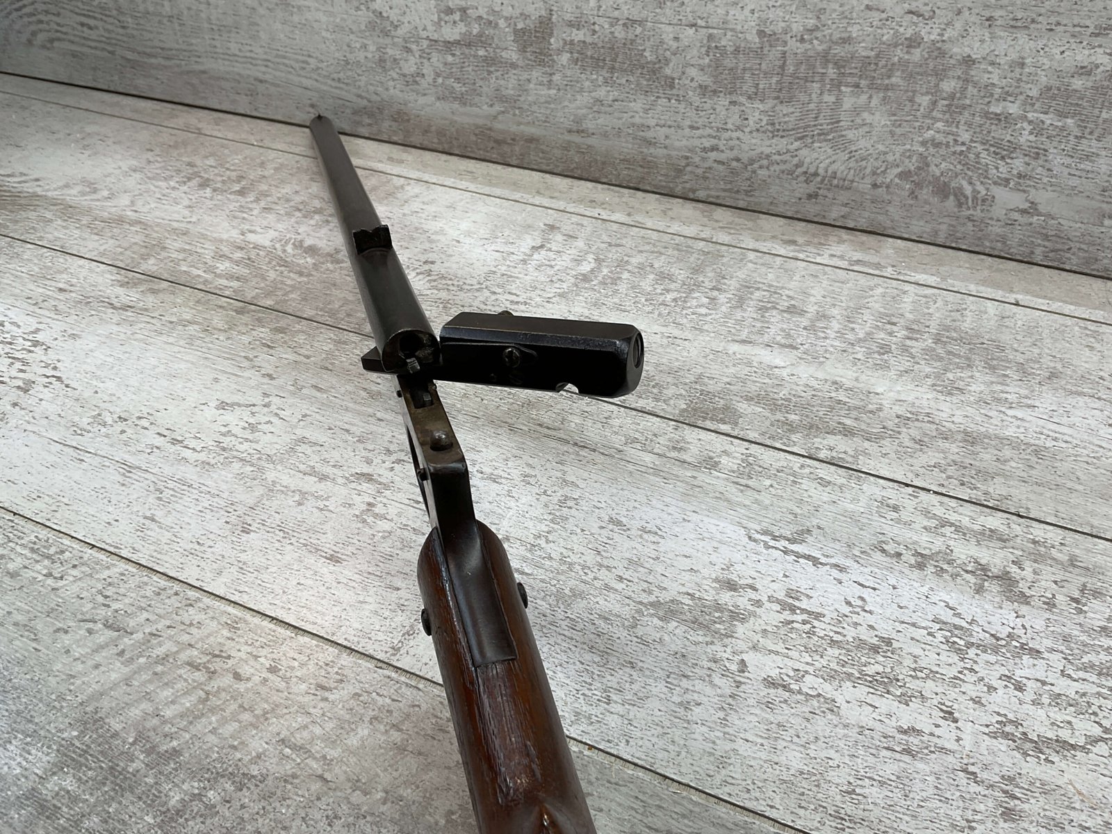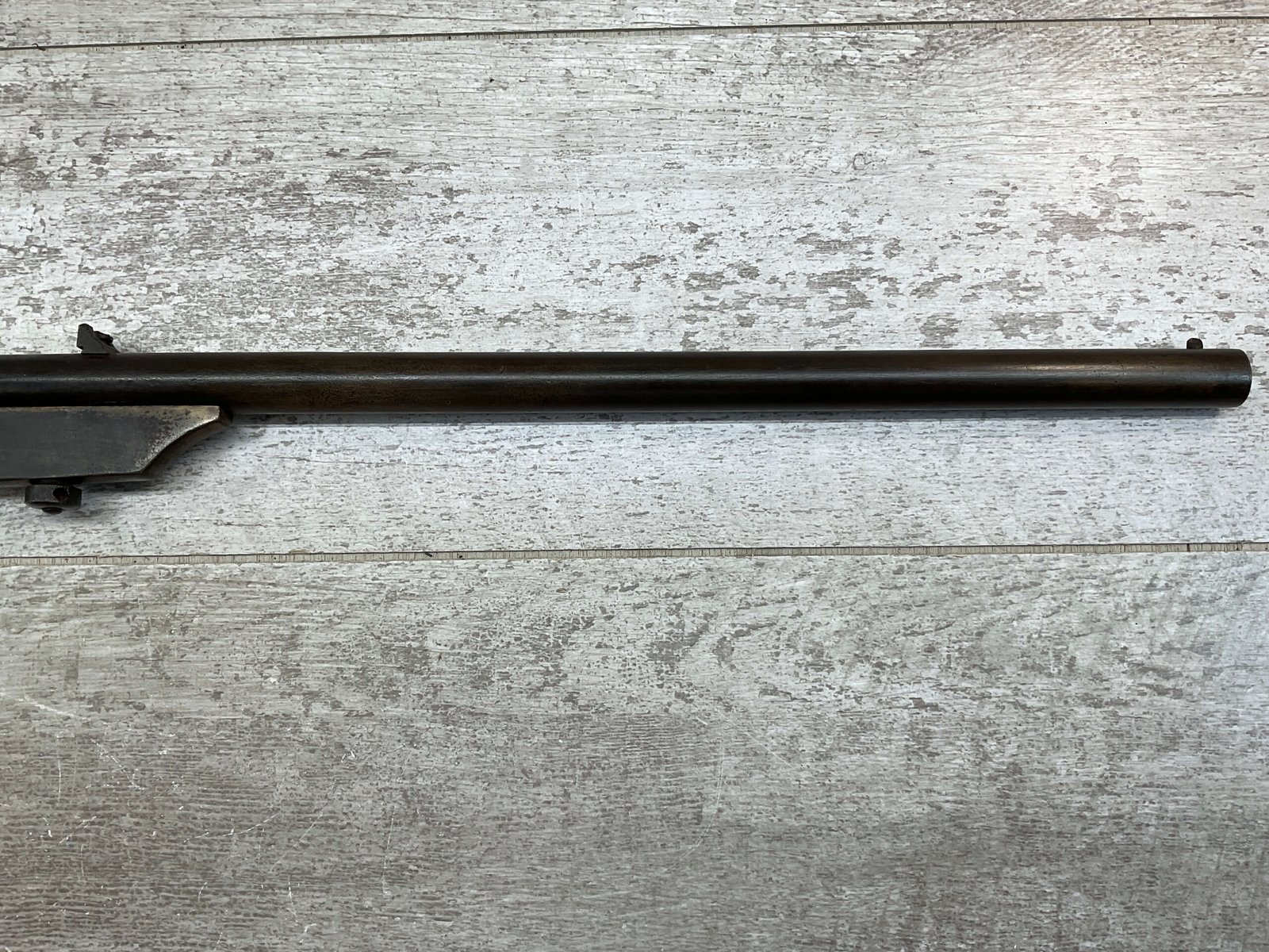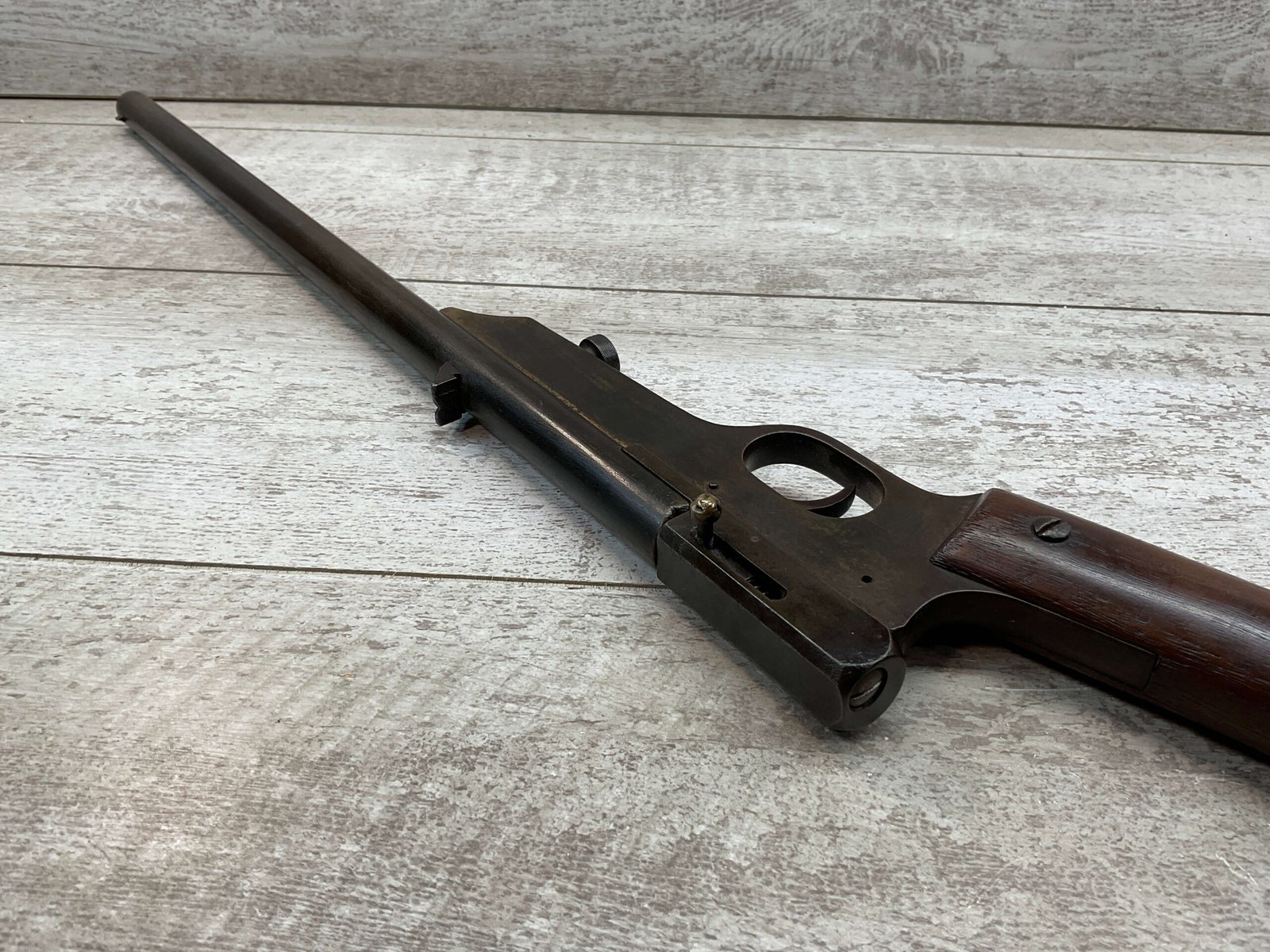 QUACKENBUSH .22 LR SINGLE SHOT SWINGING BLOCK RIFLE #NSN,18″ ROUND BULL BARREL, RECEIVER & BBL HAVE TURNED DARK BROWN PATINA, STRAIGHT WALNUT GRIP STOCK W/SMALL CRACK ON UNDERSIDE, OPEN SIGHT, METAL CRESCENT BUTT PLATE, TAKEDOWN ACTION, 1886-1922 MFR
