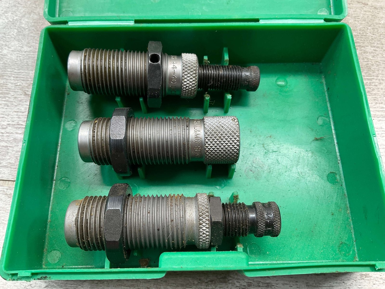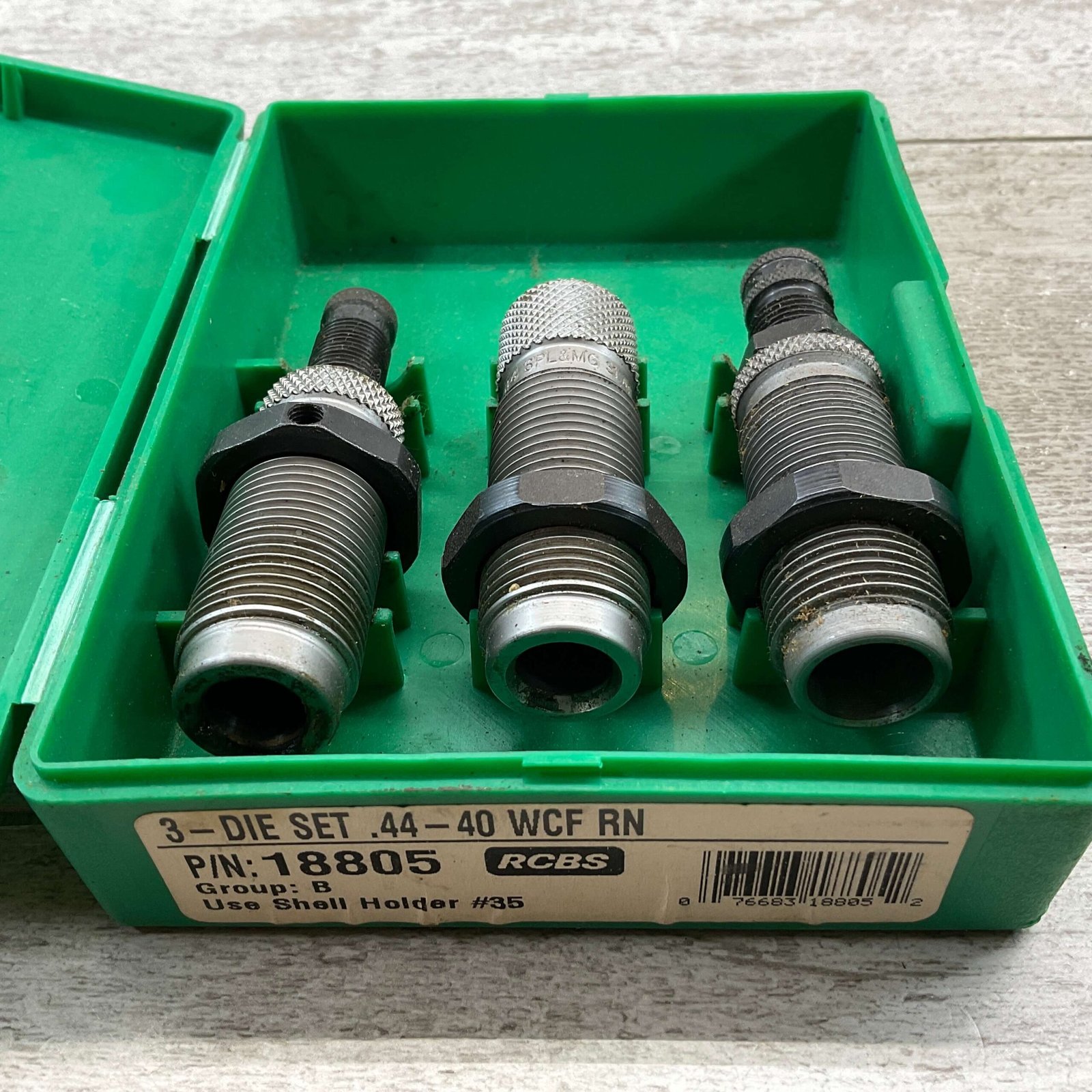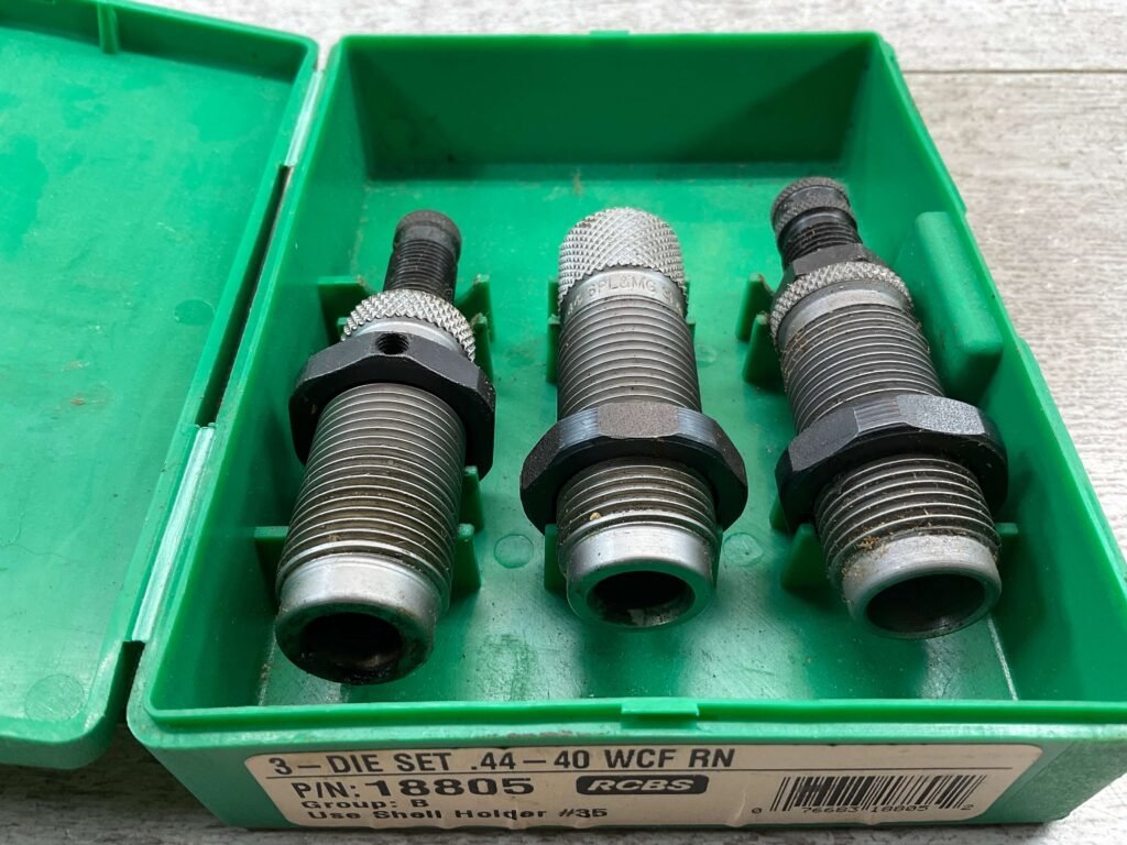 RCBS 3 DIE SET .44-40 SCF RN P/N: 18805, USED, MAY BE MISSING PARTS, PLEASE LOOK AT PICTURES