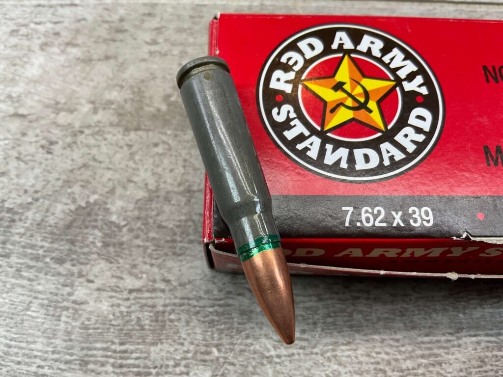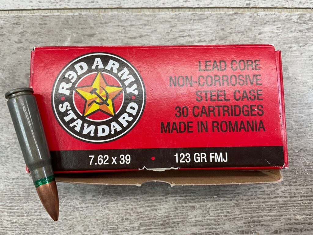RED ARMY STANDARD 7.62X39, 123 GR FMJ AMMO, FULL BOX, BOX IS IN VERY GOOD CONDITION, BUT GLUE USED TO MAKE BOX (BY COMPANY) IS NOT GREAT AND SIDES ARE NOT HELD TOGETHER.