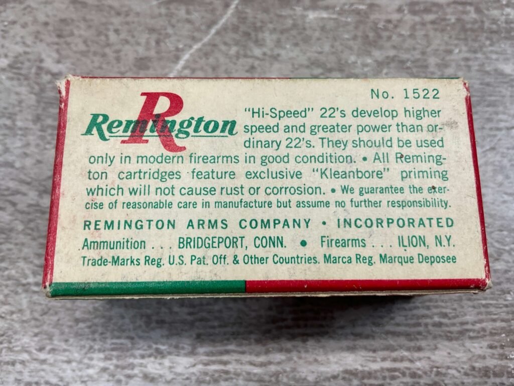 REMINGTON .22 LR HI SPEED KLEANBORE INDEX 1522, FULL BOX (QTY 50), VINTAGE, BOX IS IN EXC CONDITION BUT HAS ONE ORIGINAL PRICE STICKER ON ONE SIDE.